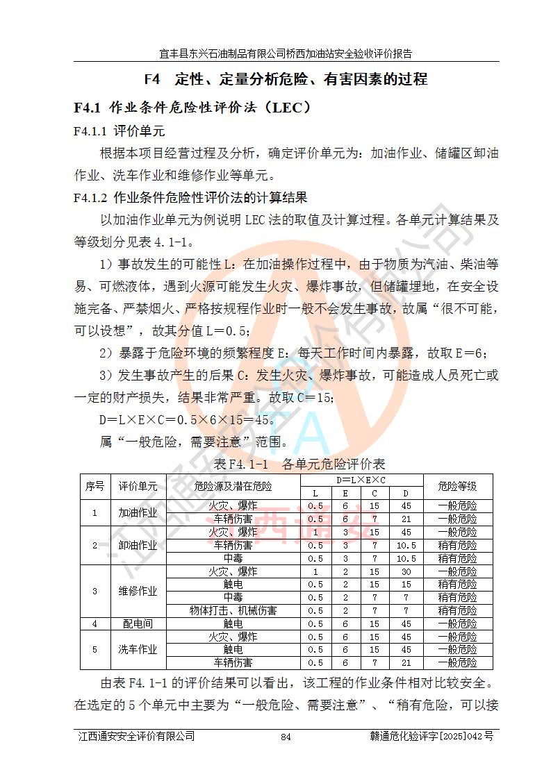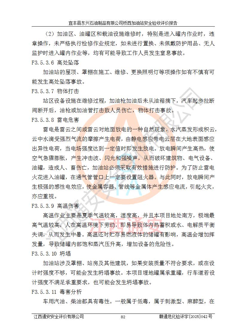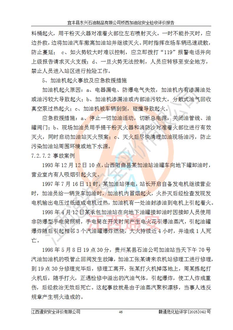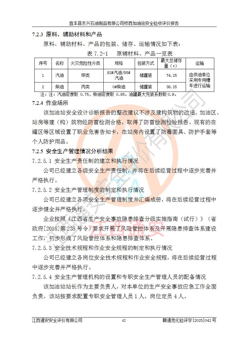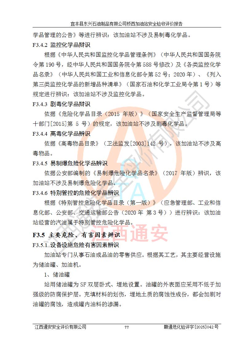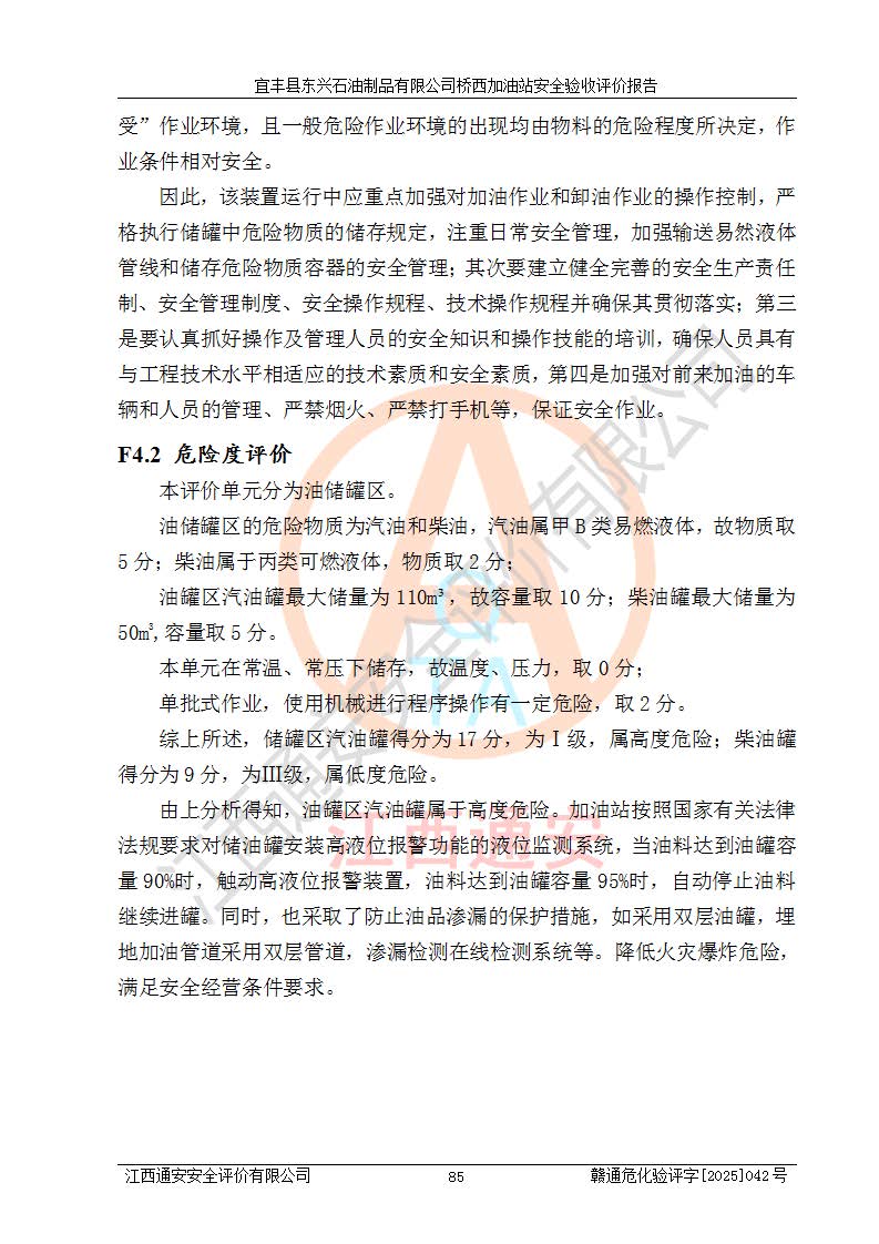 其它 | 一、安全狀況綜合評(píng)述 宜豐縣東興石油制品有限公司橋西加油站位于宜春市宜豐縣橋西鄉(xiāng),從事成品油(汽油、柴油)零售業(yè)務(wù),屬二級(jí)加油站。 通過(guò)對(duì)該加油站建設(shè)項(xiàng)目安全驗(yàn)收評(píng)價(jià),得出以下評(píng)價(jià)結(jié)論: 化學(xué)品、設(shè)備及工藝辨識(shí)結(jié)果 經(jīng)辨識(shí),該加油站經(jīng)營(yíng)、儲(chǔ)存危險(xiǎn)化學(xué)品為汽油和柴油,其中汽油屬于重點(diǎn)監(jiān)管危險(xiǎn)化學(xué)品、特別管控危險(xiǎn)化學(xué)品;該加油站不涉及劇毒化學(xué)品、高毒物品、易制毒化學(xué)品、監(jiān)控化學(xué)品、易制爆化學(xué)品。經(jīng)營(yíng)、儲(chǔ)存過(guò)程中采用的設(shè)備及工藝不屬于淘汰落后設(shè)備及工藝、不涉及危險(xiǎn)化工工藝,生產(chǎn)和儲(chǔ)存單元均不構(gòu)成危險(xiǎn)化學(xué)品重大危險(xiǎn)源。 建設(shè)項(xiàng)目所在地的安全條件和周邊的安全間距 該站東南側(cè)臨354國(guó)道,北側(cè)、西側(cè)、東側(cè)為居民建筑,加油站為二級(jí)加油站,設(shè)有油氣回收系統(tǒng),站外50米范圍內(nèi)無(wú)重要公共建筑物、明火設(shè)備和甲、乙類(lèi)生產(chǎn)及儲(chǔ)存設(shè)施,站區(qū)內(nèi)加油設(shè)施與周邊建構(gòu)筑物之間的距離能夠滿足《汽車(chē)加油加氣加氫站技術(shù)標(biāo)準(zhǔn)》GB50156-2021 和《建筑設(shè)計(jì)防火規(guī)范》GB50016-2014(2018 年版)以及相關(guān)**規(guī)范要求。本報(bào)告認(rèn)為該加油站建設(shè)項(xiàng)目周邊對(duì)加油站的影響以及建設(shè)項(xiàng)目所在地的自然條件對(duì)建設(shè)項(xiàng)目投入使用后的影響均較小,該加油站具備標(biāo)準(zhǔn)規(guī)范所要求的安全條件。 該項(xiàng)目安全設(shè)計(jì)診斷報(bào)告的采納情況 該加油站安全設(shè)計(jì)診斷報(bào)告核查的問(wèn)題(共15項(xiàng))及整改建議均已采納,經(jīng)評(píng)價(jià)組現(xiàn)場(chǎng)復(fù)核,均已整改完成。 該項(xiàng)目調(diào)試中表現(xiàn)出的技術(shù)、工藝和裝置、設(shè)備(設(shè)施)的安全、 可靠性和安全水平。 該加油站整改過(guò)程工作進(jìn)展順利,處于正常狀態(tài)。經(jīng)查閱資料和分析評(píng)價(jià),認(rèn)為本項(xiàng)目技術(shù)、工藝和裝置、設(shè)備(設(shè)施)的安全、可靠性和安全水平符合**相應(yīng)安全標(biāo)準(zhǔn)的要求。 該加油站儲(chǔ)存經(jīng)營(yíng)的汽油屬于重點(diǎn)監(jiān)管的危險(xiǎn)化學(xué)品和特別管控危險(xiǎn)化學(xué)品,該加油站在后續(xù)的經(jīng)營(yíng)中應(yīng)按照相關(guān)規(guī)范和要求加強(qiáng)安全管理,要求油品運(yùn)輸單位強(qiáng)化運(yùn)輸管理、自身加強(qiáng)儲(chǔ)存定制化管理。 該加油站經(jīng)營(yíng)過(guò)程中存在的危險(xiǎn)有害因素為:①火災(zāi)、爆炸;② 中毒和窒息;③**傷害;④觸電;⑤高處墜落;⑥物體打擊、⑦其他傷害。 其中火災(zāi)、爆炸是主要的危險(xiǎn)、有害因素,加油站埋地儲(chǔ)罐區(qū)、加油區(qū)、卸 油區(qū)是主要的危險(xiǎn)源。 (7)經(jīng)采用作業(yè)條件危險(xiǎn)性評(píng)價(jià)法(LEC)進(jìn)行分析,該加油站的作業(yè)條件相對(duì)比較安全。在選定的加油作業(yè)、卸油作業(yè)、維修作業(yè)、配電作業(yè)等4個(gè)單元中均為“一般危險(xiǎn)、需要注意”作業(yè)環(huán)境,且一般危險(xiǎn)作業(yè)環(huán)境的出現(xiàn)均由物料的危險(xiǎn)程度所決定,作業(yè)條件相對(duì)安全。 (8)采用危險(xiǎn)度評(píng)價(jià)法分析,油罐區(qū)主要危險(xiǎn)物質(zhì)為汽油和柴油,常溫、常壓下儲(chǔ)存。儲(chǔ)罐區(qū)汽油罐為Ⅰ級(jí),屬**危險(xiǎn);柴油罐得分為為Ⅲ級(jí),屬低度危險(xiǎn)。油罐采用雙層罐埋地設(shè)置,按要求設(shè)置了通氣管,并裝設(shè)了阻火器;設(shè)置了液位監(jiān)測(cè)報(bào)警系統(tǒng)和緊急切斷系統(tǒng),埋地加油管道設(shè)置雙層管道,其安全風(fēng)險(xiǎn)可控。 (9)采用檢查表評(píng)價(jià)法對(duì)該加油站站址選擇、總平面布置、加油工藝及設(shè)施、消防設(shè)施和給排水、電氣與報(bào)警和緊急切斷系統(tǒng)等進(jìn)行檢查分析,經(jīng)整改后,該加油站涉及的強(qiáng)制條款和其他項(xiàng)均符合要求。該加油站設(shè)置了消防安全設(shè)施、防雷防靜電設(shè)施、液位監(jiān)測(cè)措施、油罐泄漏檢測(cè)措施、電氣防爆措施等安全防護(hù)設(shè)施,取得了消防驗(yàn)收意見(jiàn)書(shū)和防雷檢測(cè)合格報(bào)告,符合**法律法規(guī)、標(biāo)準(zhǔn)規(guī)范的要求。該加油站公用工程能夠滿足安全經(jīng)營(yíng)的基本需要,符合安全經(jīng)營(yíng)的條件。 (10)該加油站相關(guān)證照齊全,成立了安全生產(chǎn)**小組,配備了安全管理人員,制定了安全管理制度、操作規(guī)程和事故應(yīng)急預(yù)案,加油站的安全管理機(jī)構(gòu)工作有力,加油站安全經(jīng)營(yíng)管理處于正常有序開(kāi)展范圍。 (11)對(duì)宜豐縣東興石油制品有限公司橋西加油站存在重大生產(chǎn)安全事故隱患進(jìn)行判定,檢查結(jié)果為該加油站不存在重大生產(chǎn)安全事故隱患。 總體評(píng)價(jià)結(jié)論: