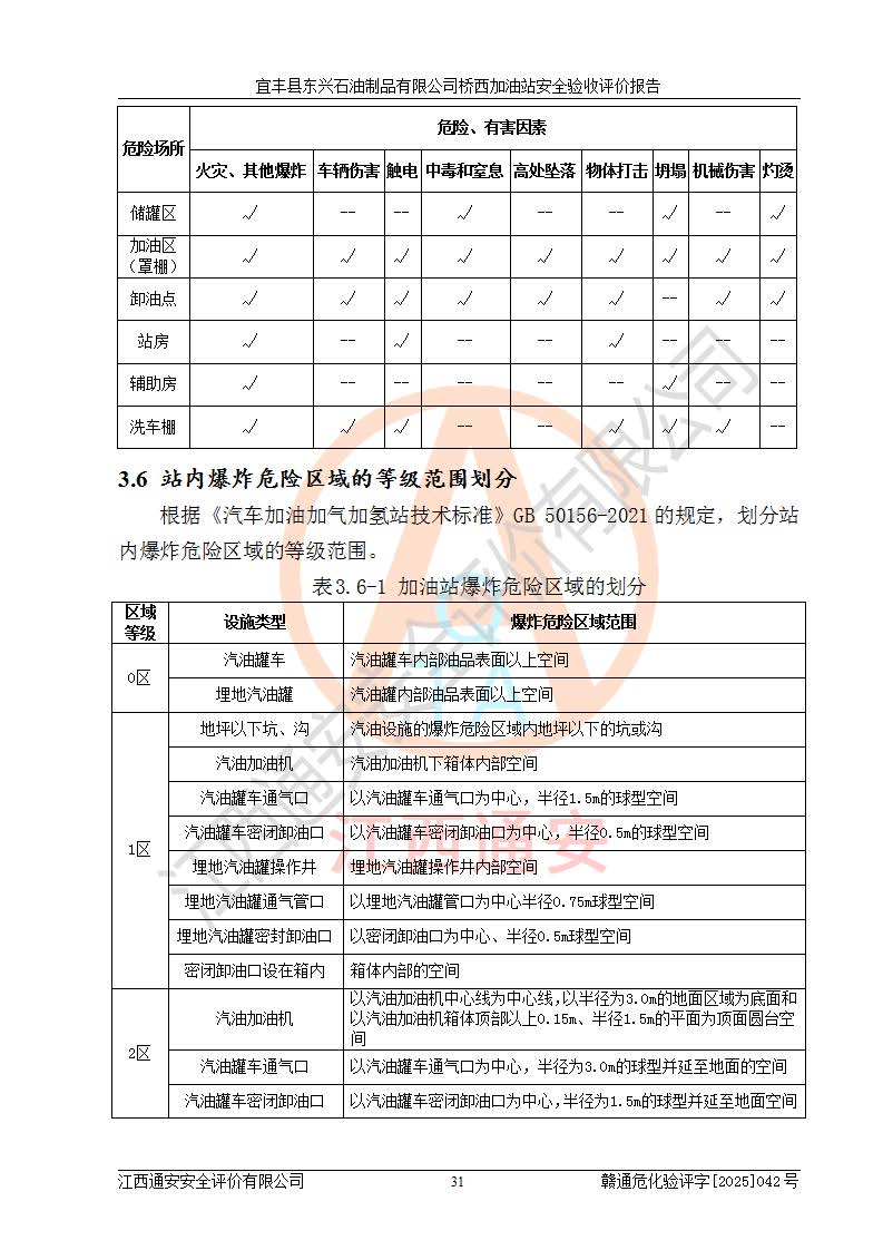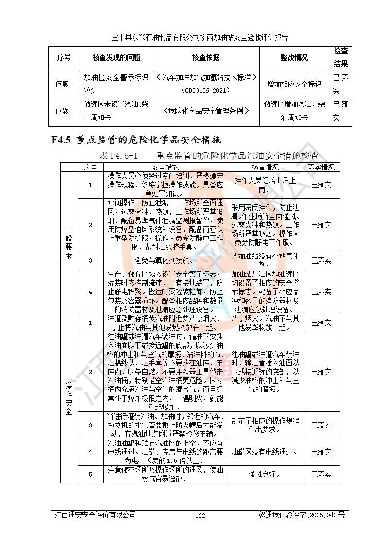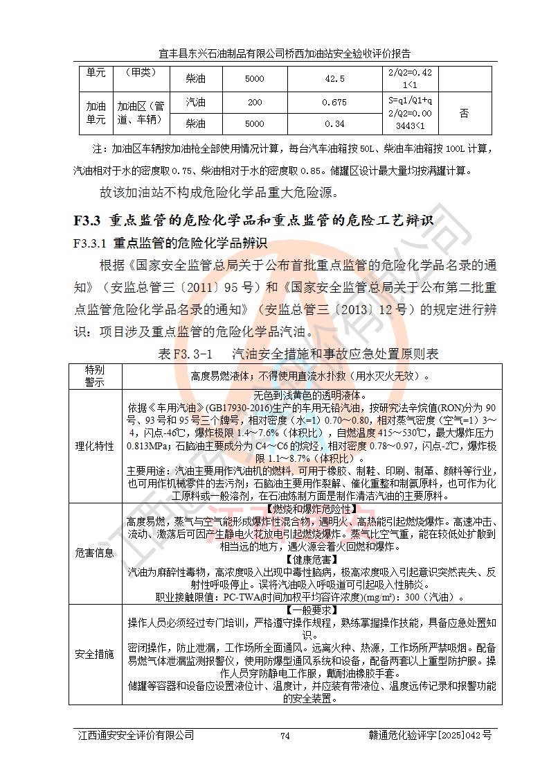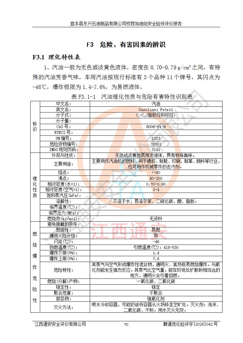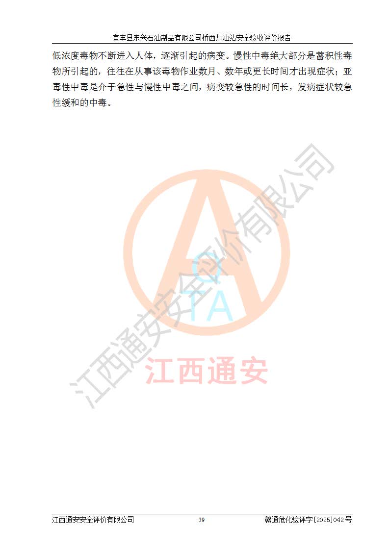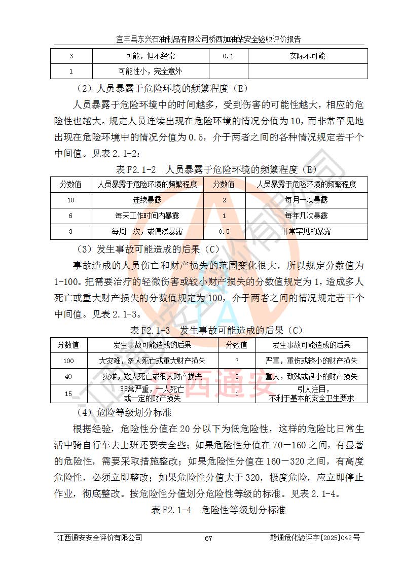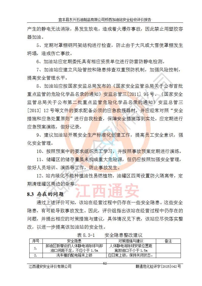 其它 | 一、安全狀況綜合評(píng)述 宜豐縣東興石油制品有限公司橋西加油站位于宜春市宜豐縣橋西鄉(xiāng),從事成品油(汽油、柴油)零售業(yè)務(wù),屬二級(jí)加油站。 通過(guò)對(duì)該加油站建設(shè)項(xiàng)目安全驗(yàn)收評(píng)價(jià),得出以下評(píng)價(jià)結(jié)論: 化學(xué)品、設(shè)備及工藝辨識(shí)結(jié)果 經(jīng)辨識(shí),該加油站經(jīng)營(yíng)、儲(chǔ)存危險(xiǎn)化學(xué)品為汽油和柴油,其中汽油屬于重點(diǎn)監(jiān)管危險(xiǎn)化學(xué)品、特別管控危險(xiǎn)化學(xué)品;該加油站不涉及劇毒化學(xué)品、高毒物品、易制毒化學(xué)品、監(jiān)控化學(xué)品、易制爆化學(xué)品。經(jīng)營(yíng)、儲(chǔ)存過(guò)程中采用的設(shè)備及工藝不屬于淘汰落后設(shè)備及工藝、不涉及危險(xiǎn)化工工藝,生產(chǎn)和儲(chǔ)存單元均不構(gòu)成危險(xiǎn)化學(xué)品重大危險(xiǎn)源。 建設(shè)項(xiàng)目所在地的安全條件和周邊的安全間距 該站東南側(cè)臨354國(guó)道,北側(cè)、西側(cè)、東側(cè)為居民建筑,加油站為二級(jí)加油站,設(shè)有油氣回收系統(tǒng),站外50米范圍內(nèi)無(wú)重要公共建筑物、明火設(shè)備和甲、乙類(lèi)生產(chǎn)及儲(chǔ)存設(shè)施,站區(qū)內(nèi)加油設(shè)施與周邊建構(gòu)筑物之間的距離能夠滿足《汽車(chē)加油加氣加氫站技術(shù)標(biāo)準(zhǔn)》GB50156-2021 和《建筑設(shè)計(jì)防火規(guī)范》GB50016-2014(2018 年版)以及相關(guān)**規(guī)范要求。本報(bào)告認(rèn)為該加油站建設(shè)項(xiàng)目周邊對(duì)加油站的影響以及建設(shè)項(xiàng)目所在地的自然條件對(duì)建設(shè)項(xiàng)目投入使用后的影響均較小,該加油站具備標(biāo)準(zhǔn)規(guī)范所要求的安全條件。 該項(xiàng)目安全設(shè)計(jì)診斷報(bào)告的采納情況 該加油站安全設(shè)計(jì)診斷報(bào)告核查的問(wèn)題(共15項(xiàng))及整改建議均已采納,經(jīng)評(píng)價(jià)組現(xiàn)場(chǎng)復(fù)核,均已整改完成。 該項(xiàng)目調(diào)試中表現(xiàn)出的技術(shù)、工藝和裝置、設(shè)備(設(shè)施)的安全、 可靠性和安全水平。 該加油站整改過(guò)程工作進(jìn)展順利,處于正常狀態(tài)。經(jīng)查閱資料和分析評(píng)價(jià),認(rèn)為本項(xiàng)目技術(shù)、工藝和裝置、設(shè)備(設(shè)施)的安全、可靠性和安全水平符合**相應(yīng)安全標(biāo)準(zhǔn)的要求。 該加油站儲(chǔ)存經(jīng)營(yíng)的汽油屬于重點(diǎn)監(jiān)管的危險(xiǎn)化學(xué)品和特別管控危險(xiǎn)化學(xué)品,該加油站在后續(xù)的經(jīng)營(yíng)中應(yīng)按照相關(guān)規(guī)范和要求加強(qiáng)安全管理,要求油品運(yùn)輸單位強(qiáng)化運(yùn)輸管理、自身加強(qiáng)儲(chǔ)存定制化管理。 該加油站經(jīng)營(yíng)過(guò)程中存在的危險(xiǎn)有害因素為:①火災(zāi)、爆炸;② 中毒和窒息;③**傷害;④觸電;⑤高處墜落;⑥物體打擊、⑦其他傷害。 其中火災(zāi)、爆炸是主要的危險(xiǎn)、有害因素,加油站埋地儲(chǔ)罐區(qū)、加油區(qū)、卸 油區(qū)是主要的危險(xiǎn)源。 (7)經(jīng)采用作業(yè)條件危險(xiǎn)性評(píng)價(jià)法(LEC)進(jìn)行分析,該加油站的作業(yè)條件相對(duì)比較安全。在選定的加油作業(yè)、卸油作業(yè)、維修作業(yè)、配電作業(yè)等4個(gè)單元中均為“一般危險(xiǎn)、需要注意”作業(yè)環(huán)境,且一般危險(xiǎn)作業(yè)環(huán)境的出現(xiàn)均由物料的危險(xiǎn)程度所決定,作業(yè)條件相對(duì)安全。 (8)采用危險(xiǎn)度評(píng)價(jià)法分析,油罐區(qū)主要危險(xiǎn)物質(zhì)為汽油和柴油,常溫、常壓下儲(chǔ)存。儲(chǔ)罐區(qū)汽油罐為Ⅰ級(jí),屬**危險(xiǎn);柴油罐得分為為Ⅲ級(jí),屬低度危險(xiǎn)。油罐采用雙層罐埋地設(shè)置,按要求設(shè)置了通氣管,并裝設(shè)了阻火器;設(shè)置了液位監(jiān)測(cè)報(bào)警系統(tǒng)和緊急切斷系統(tǒng),埋地加油管道設(shè)置雙層管道,其安全風(fēng)險(xiǎn)可控。 (9)采用檢查表評(píng)價(jià)法對(duì)該加油站站址選擇、總平面布置、加油工藝及設(shè)施、消防設(shè)施和給排水、電氣與報(bào)警和緊急切斷系統(tǒng)等進(jìn)行檢查分析,經(jīng)整改后,該加油站涉及的強(qiáng)制條款和其他項(xiàng)均符合要求。該加油站設(shè)置了消防安全設(shè)施、防雷防靜電設(shè)施、液位監(jiān)測(cè)措施、油罐泄漏檢測(cè)措施、電氣防爆措施等安全防護(hù)設(shè)施,取得了消防驗(yàn)收意見(jiàn)書(shū)和防雷檢測(cè)合格報(bào)告,符合**法律法規(guī)、標(biāo)準(zhǔn)規(guī)范的要求。該加油站公用工程能夠滿足安全經(jīng)營(yíng)的基本需要,符合安全經(jīng)營(yíng)的條件。 (10)該加油站相關(guān)證照齊全,成立了安全生產(chǎn)**小組,配備了安全管理人員,制定了安全管理制度、操作規(guī)程和事故應(yīng)急預(yù)案,加油站的安全管理機(jī)構(gòu)工作有力,加油站安全經(jīng)營(yíng)管理處于正常有序開(kāi)展范圍。 (11)對(duì)宜豐縣東興石油制品有限公司橋西加油站存在重大生產(chǎn)安全事故隱患進(jìn)行判定,檢查結(jié)果為該加油站不存在重大生產(chǎn)安全事故隱患。 總體評(píng)價(jià)結(jié)論: