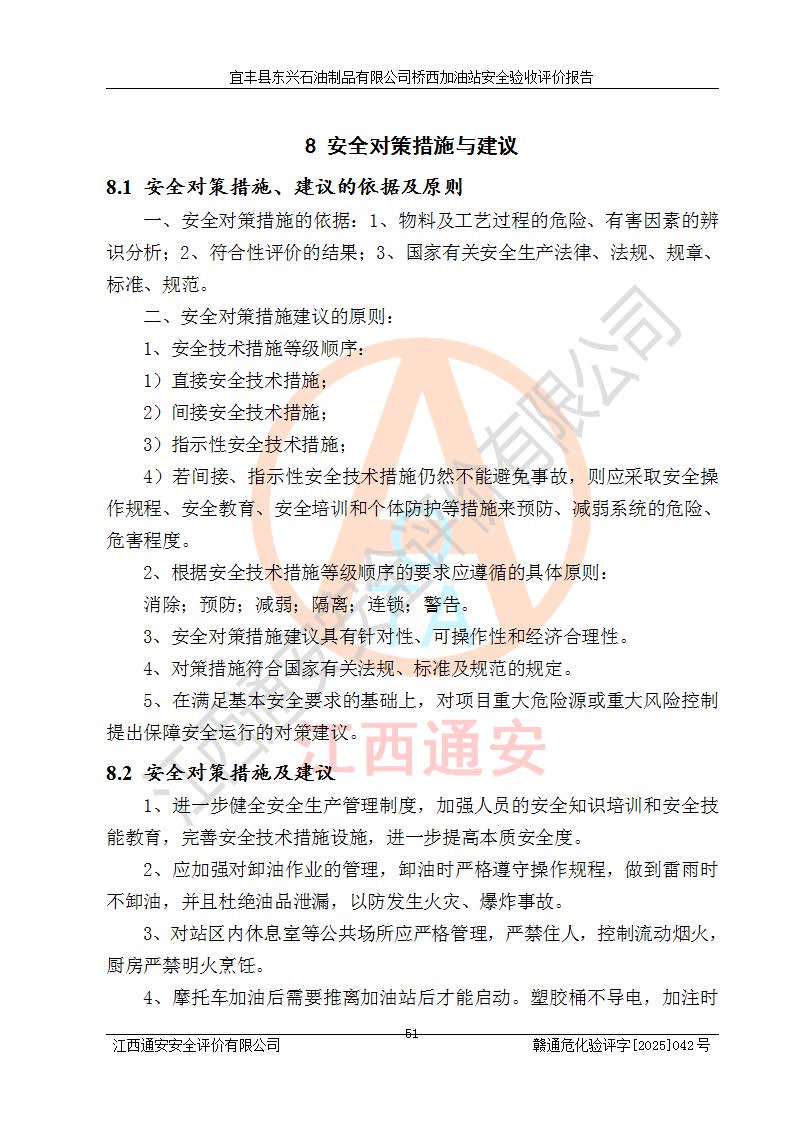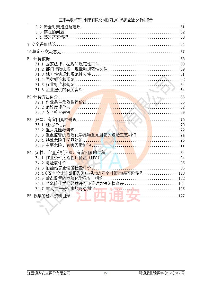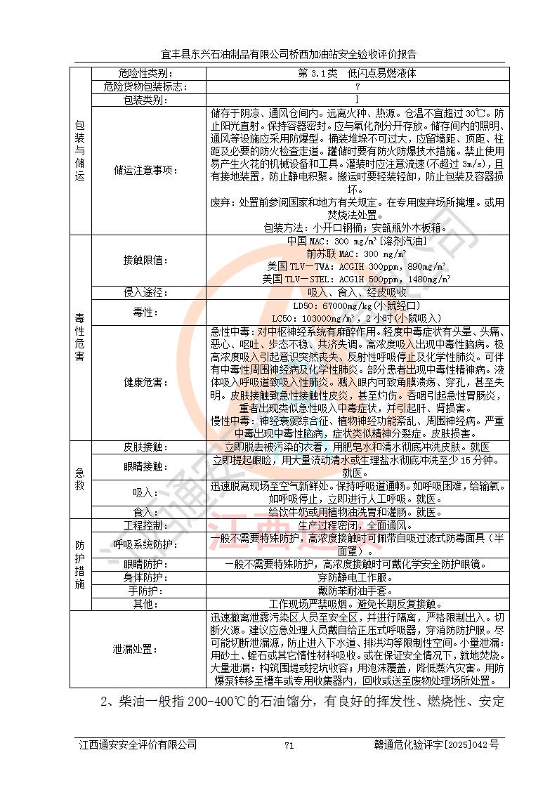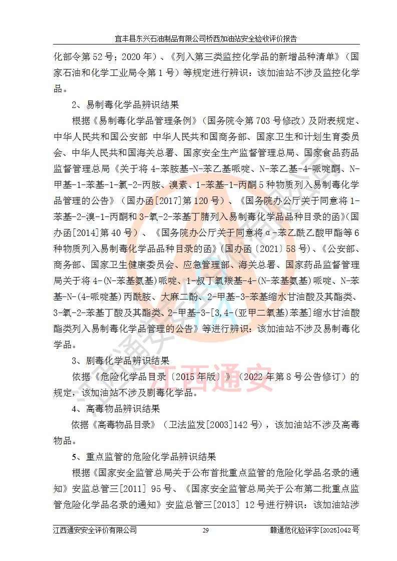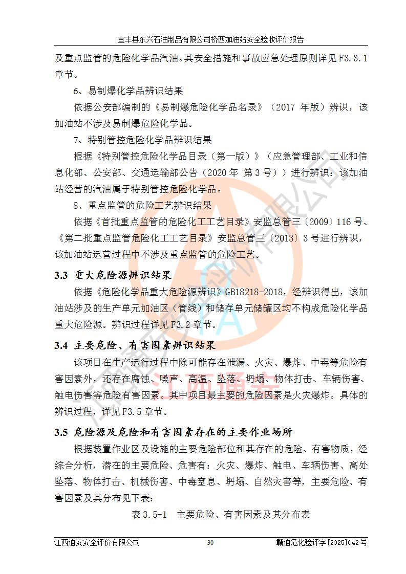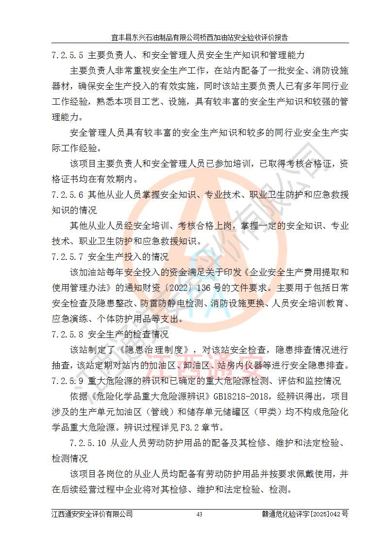 其它 | 一、安全狀況綜合評(píng)述 宜豐縣東興石油制品有限公司橋西加油站位于宜春市宜豐縣橋西鄉(xiāng),從事成品油(汽油、柴油)零售業(yè)務(wù),屬二級(jí)加油站。 通過(guò)對(duì)該加油站建設(shè)項(xiàng)目安全驗(yàn)收評(píng)價(jià),得出以下評(píng)價(jià)結(jié)論: 化學(xué)品、設(shè)備及工藝辨識(shí)結(jié)果 經(jīng)辨識(shí),該加油站經(jīng)營(yíng)、儲(chǔ)存危險(xiǎn)化學(xué)品為汽油和柴油,其中汽油屬于重點(diǎn)監(jiān)管危險(xiǎn)化學(xué)品、特別管控危險(xiǎn)化學(xué)品;該加油站不涉及劇毒化學(xué)品、高毒物品、易制毒化學(xué)品、監(jiān)控化學(xué)品、易制爆化學(xué)品。經(jīng)營(yíng)、儲(chǔ)存過(guò)程中采用的設(shè)備及工藝不屬于淘汰落后設(shè)備及工藝、不涉及危險(xiǎn)化工工藝,生產(chǎn)和儲(chǔ)存單元均不構(gòu)成危險(xiǎn)化學(xué)品重大危險(xiǎn)源。 建設(shè)項(xiàng)目所在地的安全條件和周邊的安全間距 該站東南側(cè)臨354國(guó)道,北側(cè)、西側(cè)、東側(cè)為居民建筑,加油站為二級(jí)加油站,設(shè)有油氣回收系統(tǒng),站外50米范圍內(nèi)無(wú)重要公共建筑物、明火設(shè)備和甲、乙類(lèi)生產(chǎn)及儲(chǔ)存設(shè)施,站區(qū)內(nèi)加油設(shè)施與周邊建構(gòu)筑物之間的距離能夠滿足《汽車(chē)加油加氣加氫站技術(shù)標(biāo)準(zhǔn)》GB50156-2021 和《建筑設(shè)計(jì)防火規(guī)范》GB50016-2014(2018 年版)以及相關(guān)**規(guī)范要求。本報(bào)告認(rèn)為該加油站建設(shè)項(xiàng)目周邊對(duì)加油站的影響以及建設(shè)項(xiàng)目所在地的自然條件對(duì)建設(shè)項(xiàng)目投入使用后的影響均較小,該加油站具備標(biāo)準(zhǔn)規(guī)范所要求的安全條件。 該項(xiàng)目安全設(shè)計(jì)診斷報(bào)告的采納情況 該加油站安全設(shè)計(jì)診斷報(bào)告核查的問(wèn)題(共15項(xiàng))及整改建議均已采納,經(jīng)評(píng)價(jià)組現(xiàn)場(chǎng)復(fù)核,均已整改完成。 該項(xiàng)目調(diào)試中表現(xiàn)出的技術(shù)、工藝和裝置、設(shè)備(設(shè)施)的安全、 可靠性和安全水平。 該加油站整改過(guò)程工作進(jìn)展順利,處于正常狀態(tài)。經(jīng)查閱資料和分析評(píng)價(jià),認(rèn)為本項(xiàng)目技術(shù)、工藝和裝置、設(shè)備(設(shè)施)的安全、可靠性和安全水平符合**相應(yīng)安全標(biāo)準(zhǔn)的要求。 該加油站儲(chǔ)存經(jīng)營(yíng)的汽油屬于重點(diǎn)監(jiān)管的危險(xiǎn)化學(xué)品和特別管控危險(xiǎn)化學(xué)品,該加油站在后續(xù)的經(jīng)營(yíng)中應(yīng)按照相關(guān)規(guī)范和要求加強(qiáng)安全管理,要求油品運(yùn)輸單位強(qiáng)化運(yùn)輸管理、自身加強(qiáng)儲(chǔ)存定制化管理。 該加油站經(jīng)營(yíng)過(guò)程中存在的危險(xiǎn)有害因素為:①火災(zāi)、爆炸;② 中毒和窒息;③**傷害;④觸電;⑤高處墜落;⑥物體打擊、⑦其他傷害。 其中火災(zāi)、爆炸是主要的危險(xiǎn)、有害因素,加油站埋地儲(chǔ)罐區(qū)、加油區(qū)、卸 油區(qū)是主要的危險(xiǎn)源。 (7)經(jīng)采用作業(yè)條件危險(xiǎn)性評(píng)價(jià)法(LEC)進(jìn)行分析,該加油站的作業(yè)條件相對(duì)比較安全。在選定的加油作業(yè)、卸油作業(yè)、維修作業(yè)、配電作業(yè)等4個(gè)單元中均為“一般危險(xiǎn)、需要注意”作業(yè)環(huán)境,且一般危險(xiǎn)作業(yè)環(huán)境的出現(xiàn)均由物料的危險(xiǎn)程度所決定,作業(yè)條件相對(duì)安全。 (8)采用危險(xiǎn)度評(píng)價(jià)法分析,油罐區(qū)主要危險(xiǎn)物質(zhì)為汽油和柴油,常溫、常壓下儲(chǔ)存。儲(chǔ)罐區(qū)汽油罐為Ⅰ級(jí),屬**危險(xiǎn);柴油罐得分為為Ⅲ級(jí),屬低度危險(xiǎn)。油罐采用雙層罐埋地設(shè)置,按要求設(shè)置了通氣管,并裝設(shè)了阻火器;設(shè)置了液位監(jiān)測(cè)報(bào)警系統(tǒng)和緊急切斷系統(tǒng),埋地加油管道設(shè)置雙層管道,其安全風(fēng)險(xiǎn)可控。 (9)采用檢查表評(píng)價(jià)法對(duì)該加油站站址選擇、總平面布置、加油工藝及設(shè)施、消防設(shè)施和給排水、電氣與報(bào)警和緊急切斷系統(tǒng)等進(jìn)行檢查分析,經(jīng)整改后,該加油站涉及的強(qiáng)制條款和其他項(xiàng)均符合要求。該加油站設(shè)置了消防安全設(shè)施、防雷防靜電設(shè)施、液位監(jiān)測(cè)措施、油罐泄漏檢測(cè)措施、電氣防爆措施等安全防護(hù)設(shè)施,取得了消防驗(yàn)收意見(jiàn)書(shū)和防雷檢測(cè)合格報(bào)告,符合**法律法規(guī)、標(biāo)準(zhǔn)規(guī)范的要求。該加油站公用工程能夠滿足安全經(jīng)營(yíng)的基本需要,符合安全經(jīng)營(yíng)的條件。 (10)該加油站相關(guān)證照齊全,成立了安全生產(chǎn)**小組,配備了安全管理人員,制定了安全管理制度、操作規(guī)程和事故應(yīng)急預(yù)案,加油站的安全管理機(jī)構(gòu)工作有力,加油站安全經(jīng)營(yíng)管理處于正常有序開(kāi)展范圍。 (11)對(duì)宜豐縣東興石油制品有限公司橋西加油站存在重大生產(chǎn)安全事故隱患進(jìn)行判定,檢查結(jié)果為該加油站不存在重大生產(chǎn)安全事故隱患。 總體評(píng)價(jià)結(jié)論: