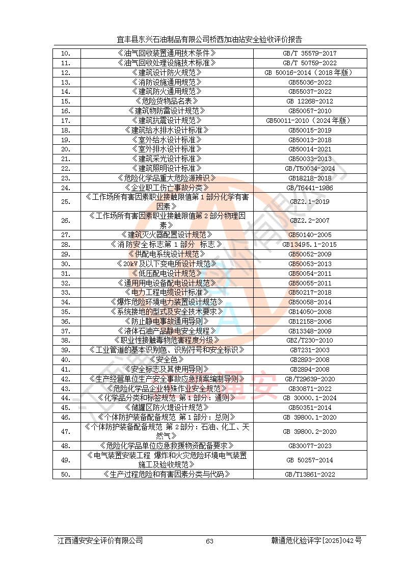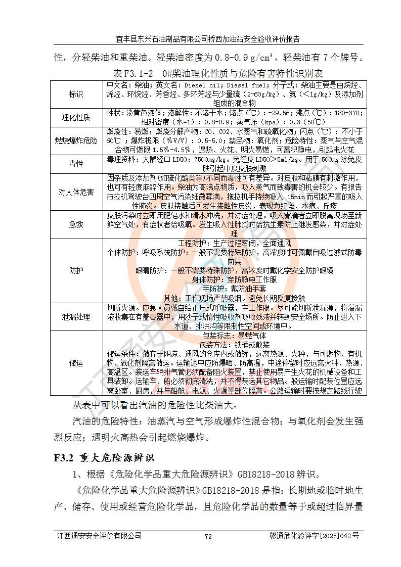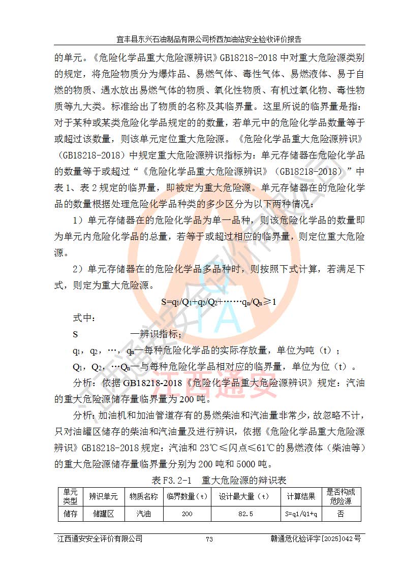 主要任務(wù) | 本評(píng)價(jià)報(bào)告主要針對(duì)評(píng)價(jià)范圍內(nèi)汽油、柴油儲(chǔ)存經(jīng)營(yíng)過(guò)程所涉及的危險(xiǎn)、有害因素及重大危險(xiǎn)源等進(jìn)行辨識(shí)與分析,根據(jù)相應(yīng)法律、法規(guī)、標(biāo)準(zhǔn)的要求檢查安全設(shè)施的配置及相關(guān)檢測(cè)檢驗(yàn)情況及其符合性,檢查公用工程及輔助設(shè)施的配套性,審核安全生產(chǎn)管理機(jī)構(gòu)、制度、人員培訓(xùn)、設(shè)備管理、操作規(guī)程、應(yīng)急預(yù)案及勞動(dòng)防護(hù)用品的配備等,對(duì)該項(xiàng)目安全設(shè)施及安全措施進(jìn)行符合性評(píng)價(jià),并在此基礎(chǔ)上提出相應(yīng)的安全對(duì)策措施及建議。 | ||||