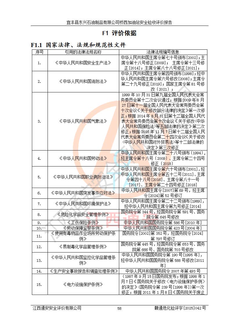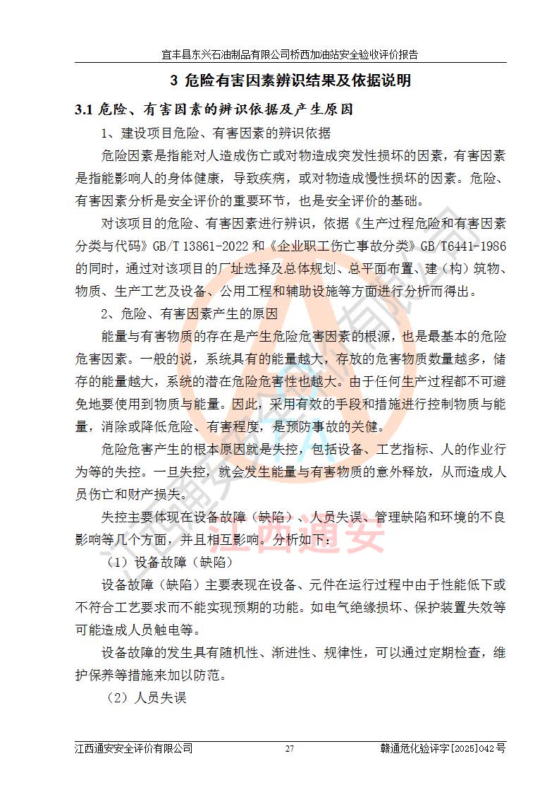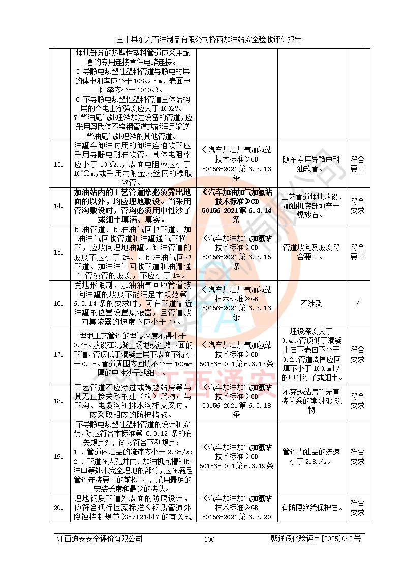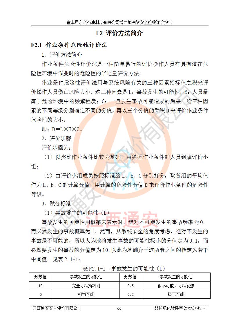 主要任務(wù) | 本評(píng)價(jià)報(bào)告主要針對(duì)評(píng)價(jià)范圍內(nèi)汽油、柴油儲(chǔ)存經(jīng)營(yíng)過(guò)程所涉及的危險(xiǎn)、有害因素及重大危險(xiǎn)源等進(jìn)行辨識(shí)與分析,根據(jù)相應(yīng)法律、法規(guī)、標(biāo)準(zhǔn)的要求檢查安全設(shè)施的配置及相關(guān)檢測(cè)檢驗(yàn)情況及其符合性,檢查公用工程及輔助設(shè)施的配套性,審核安全生產(chǎn)管理機(jī)構(gòu)、制度、人員培訓(xùn)、設(shè)備管理、操作規(guī)程、應(yīng)急預(yù)案及勞動(dòng)防護(hù)用品的配備等,對(duì)該項(xiàng)目安全設(shè)施及安全措施進(jìn)行符合性評(píng)價(jià),并在此基礎(chǔ)上提出相應(yīng)的安全對(duì)策措施及建議。 | ||||