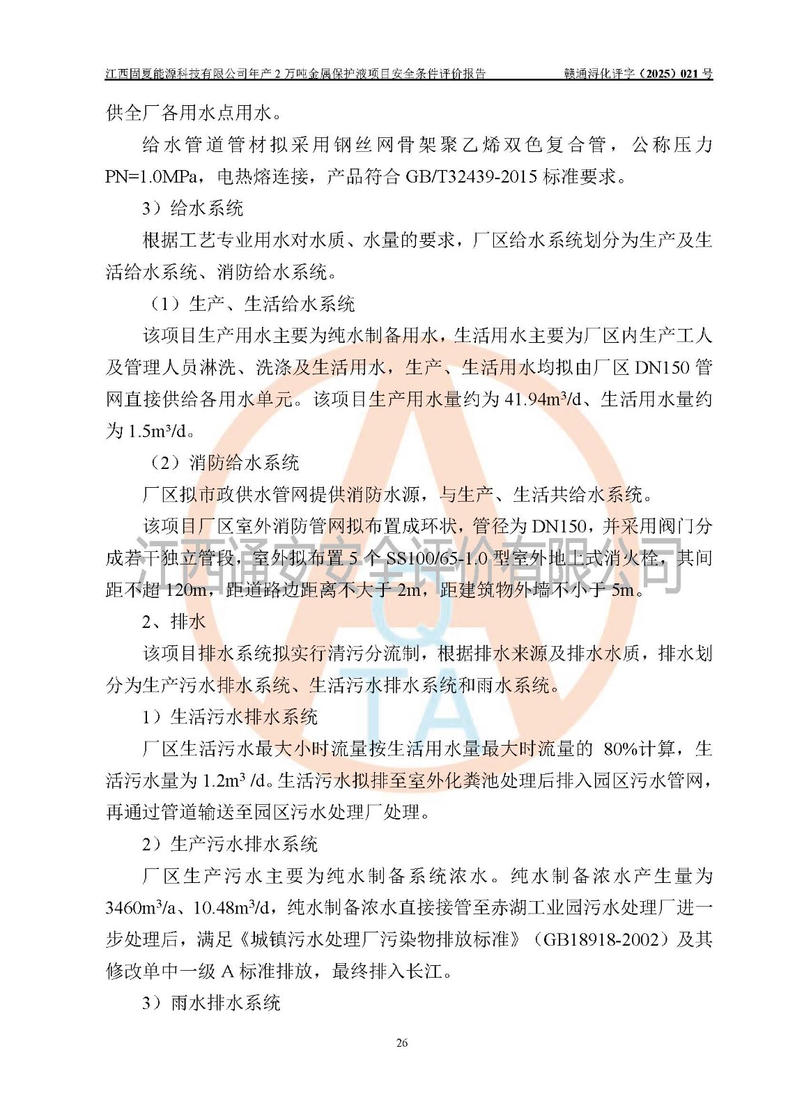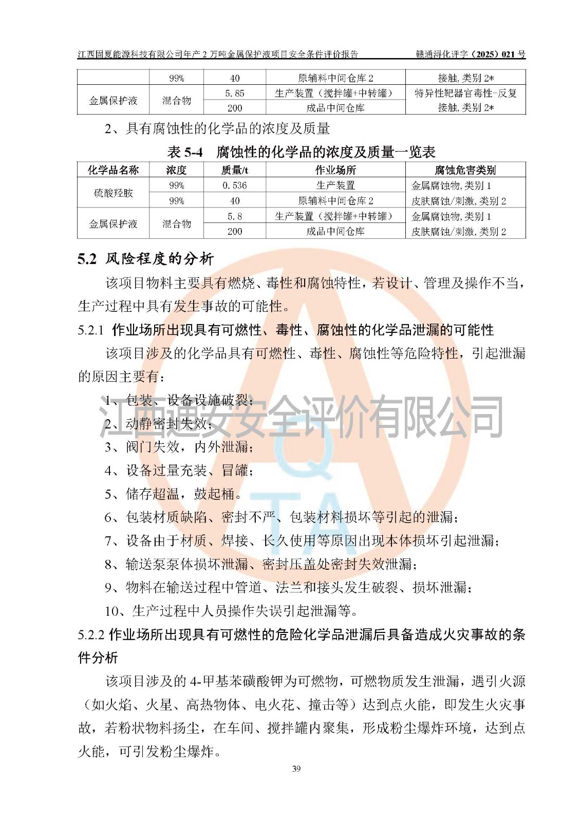 項目簡介 | 江西固夏能源科技有限公司(以下簡稱“該公司”)是一家2024年11月成立的有限責任公司(自然人獨資),注冊地址為江西省九江市柴桑區(qū)赤湖工業(yè)園通江東大道6號,法定**人周金龍,注冊資本500萬元,主要從事**化工產(chǎn)品的生產(chǎn)、銷售。 為滿足市場需求,企業(yè)擬投資10000萬元新建年產(chǎn)2萬噸金屬保護液項目,該項目廠區(qū)占地面積6773.00㎡(合約10.16畝)。該項目生產(chǎn)過程涉及列入目錄的危險化學品:硫酸羥胺;產(chǎn)品金屬保護液混合物中硫酸羥胺含量為12%,且依據(jù)企業(yè)提供的化學品危險性分類報告,屬于危險化學品,該項目不涉及監(jiān)控化學品、劇毒化學品、重點監(jiān)管的危險化學品、易制毒化學品、特別管控危險化學品、高毒物品。 該項目生產(chǎn)工藝不涉及任何化學反應,僅為物理攪拌混合稀釋,不涉及重點監(jiān)管的典型危險化工工藝,生產(chǎn)單元和儲存單元均不構(gòu)成危險化學品重大危險源。 | |||