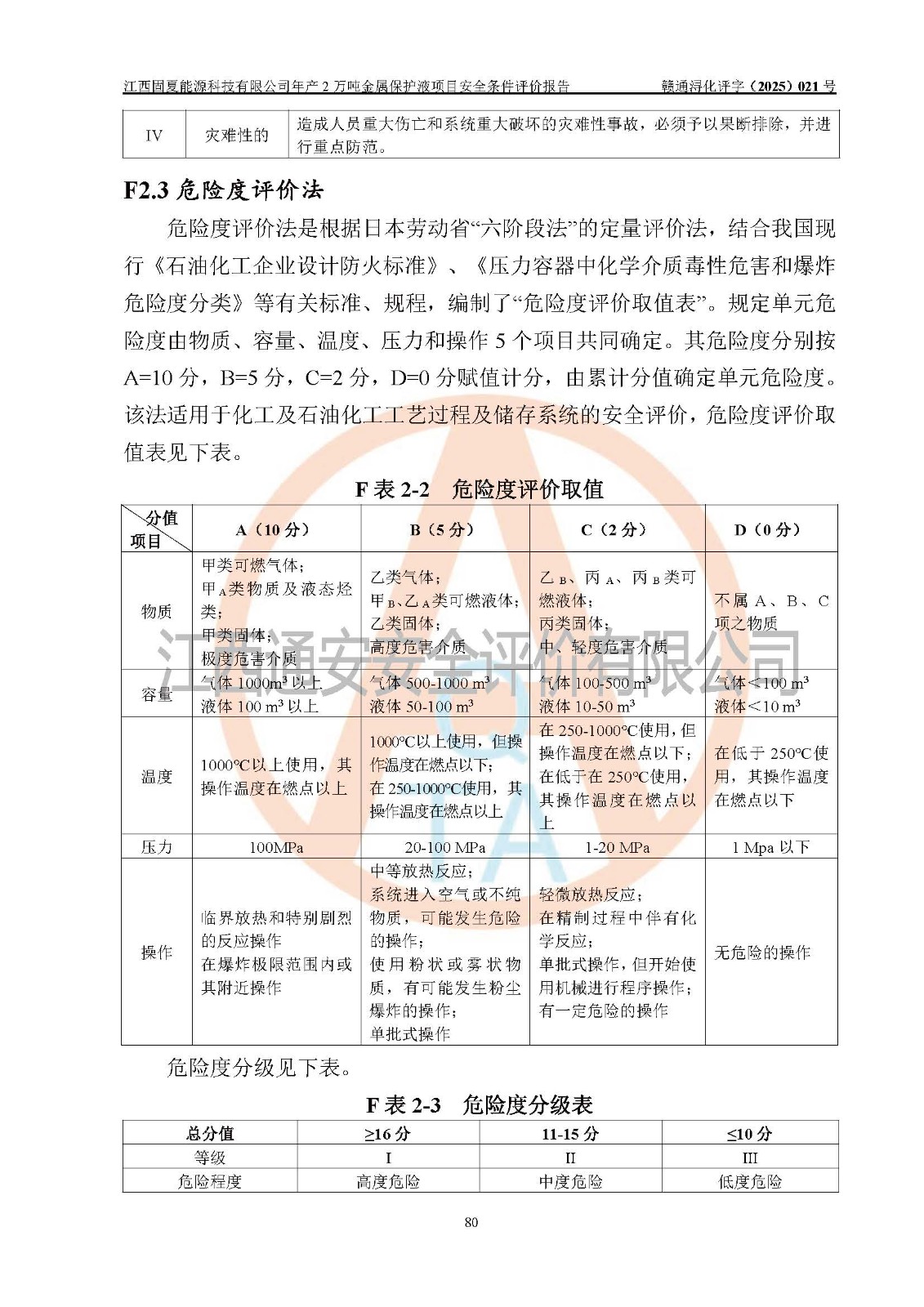 評價結(jié)論 | 江西固夏能源科技有限公司年產(chǎn)2萬噸金屬保護液項目的選址、總體布局、周邊環(huán)境、自然環(huán)境能滿足建設安全條件;項目選擇的工藝過程及設備設施的安全可靠性能達到**法規(guī)、標準規(guī)定要求;項目存在的危險有害因素可控,在落實本評價報告提出的有關(guān)安全對策措施后,其危險有害程度能達到可以接受的程度,項目建設能夠?qū)崿F(xiàn)安全運行的目標。 | |||