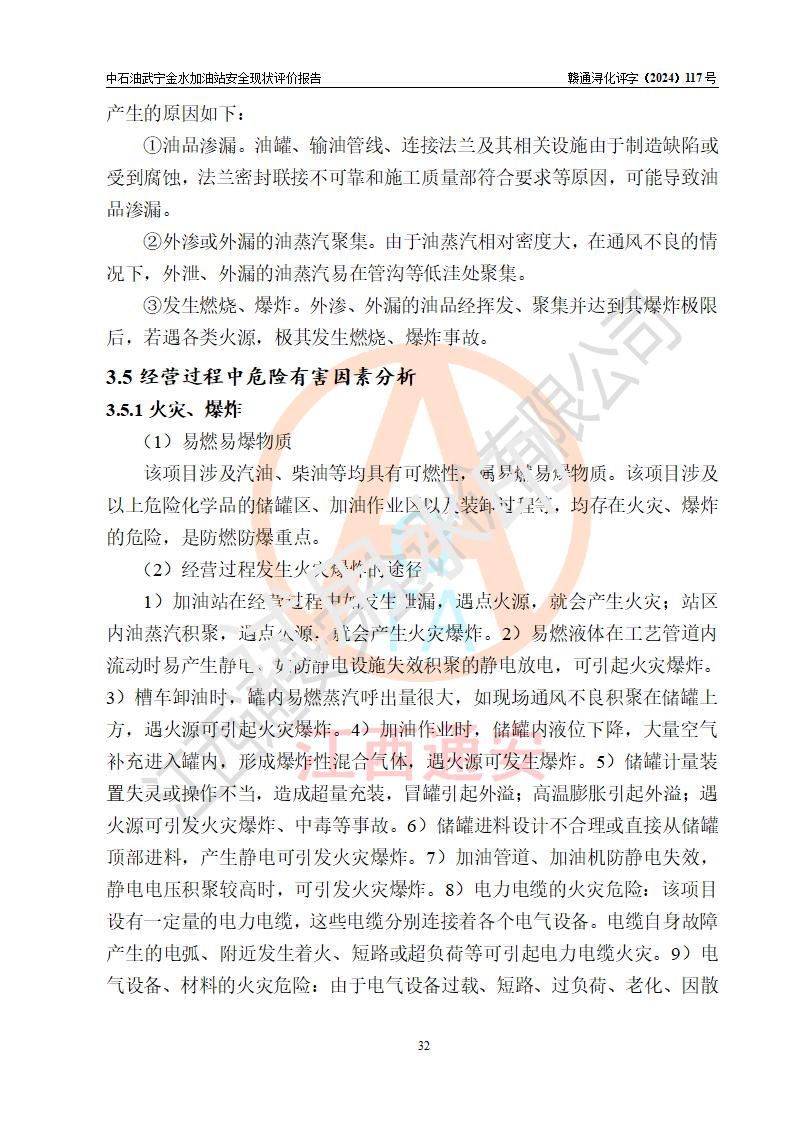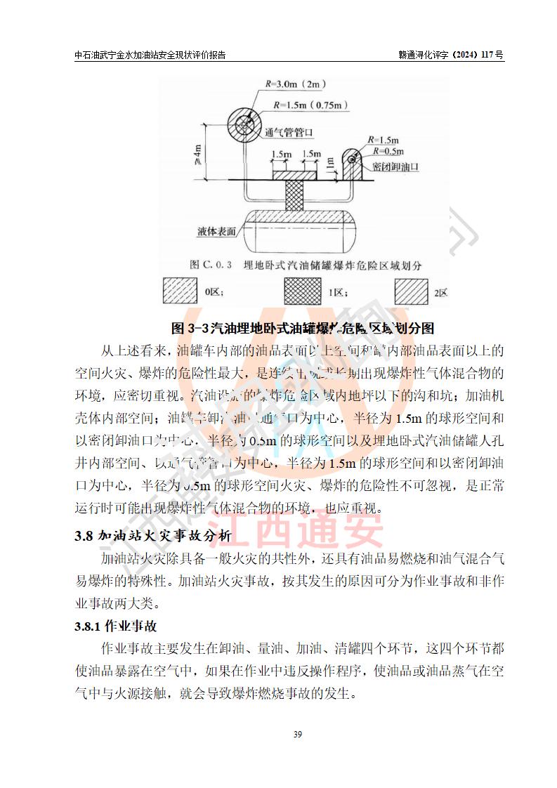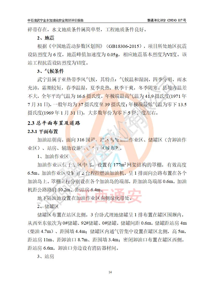 項目簡介 | 中國石油天然氣股份有限公司江西九江武寧金水加油站是一家專門從事成品油零售經(jīng)營的股份有限公司分公司(上市、國有控股),經(jīng)營場所位于江西省九江市武寧縣泉口鎮(zhèn)金水村?,F(xiàn)有從業(yè)人員4名,其中安全管理人員1人,加油站負責(zé)人楊全榮。 該加油站占地面積1170m2,站區(qū)內(nèi)設(shè)置有2臺雙槍稅控燃油加油機及配套的工藝管線,設(shè)有SF雙層儲罐3臺,其中30m3的92#汽油儲罐1臺、30m3的0#柴油儲罐2臺,油品儲罐總?cè)莘e為90m3(折算成汽油為60m3),按現(xiàn)行《汽車加油加氣加氫站技術(shù)標(biāo)準(zhǔn)》對加油站的等級劃分原則,屬三級加油站。 該站由九江市行政審批局換發(fā)《危險化學(xué)品經(jīng)營許可證》(證號:贛九行審經(jīng)(甲)字[2022]000007號),**期限2021年12月31日至2024年12月30日。 | |||