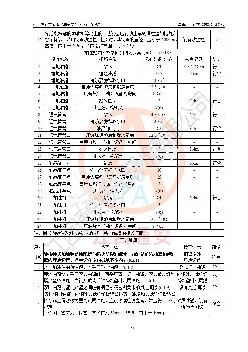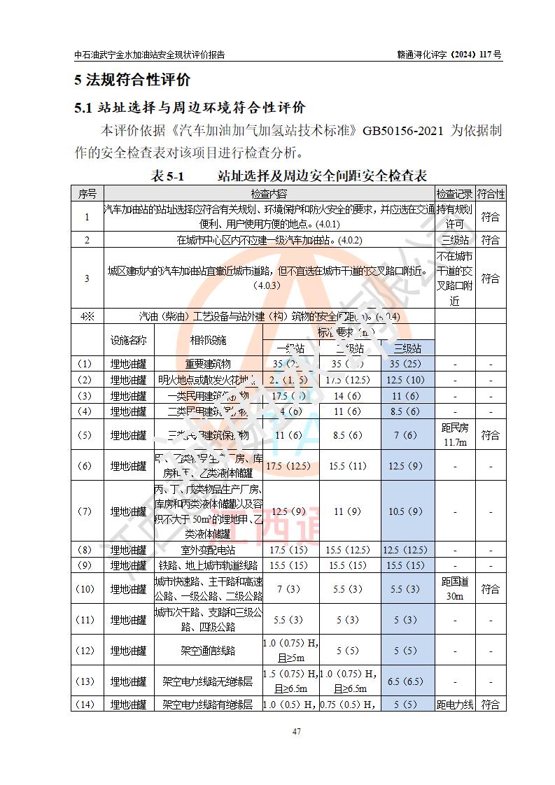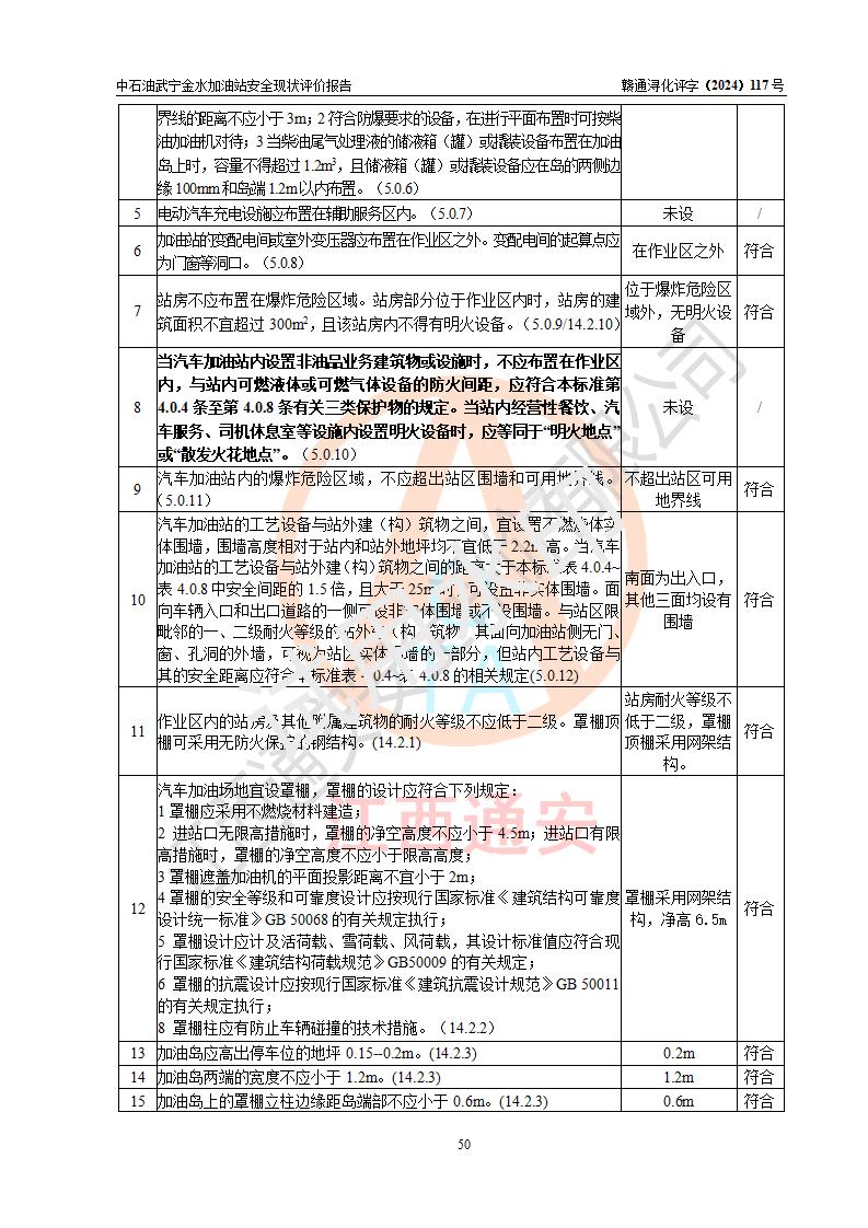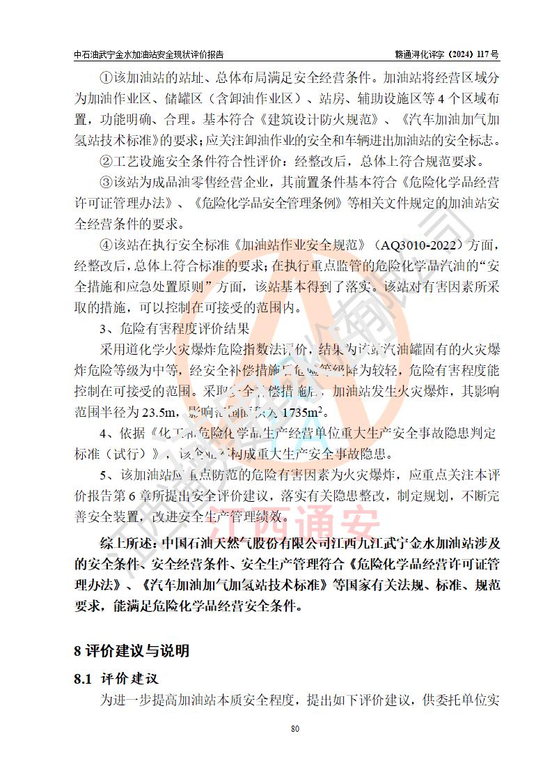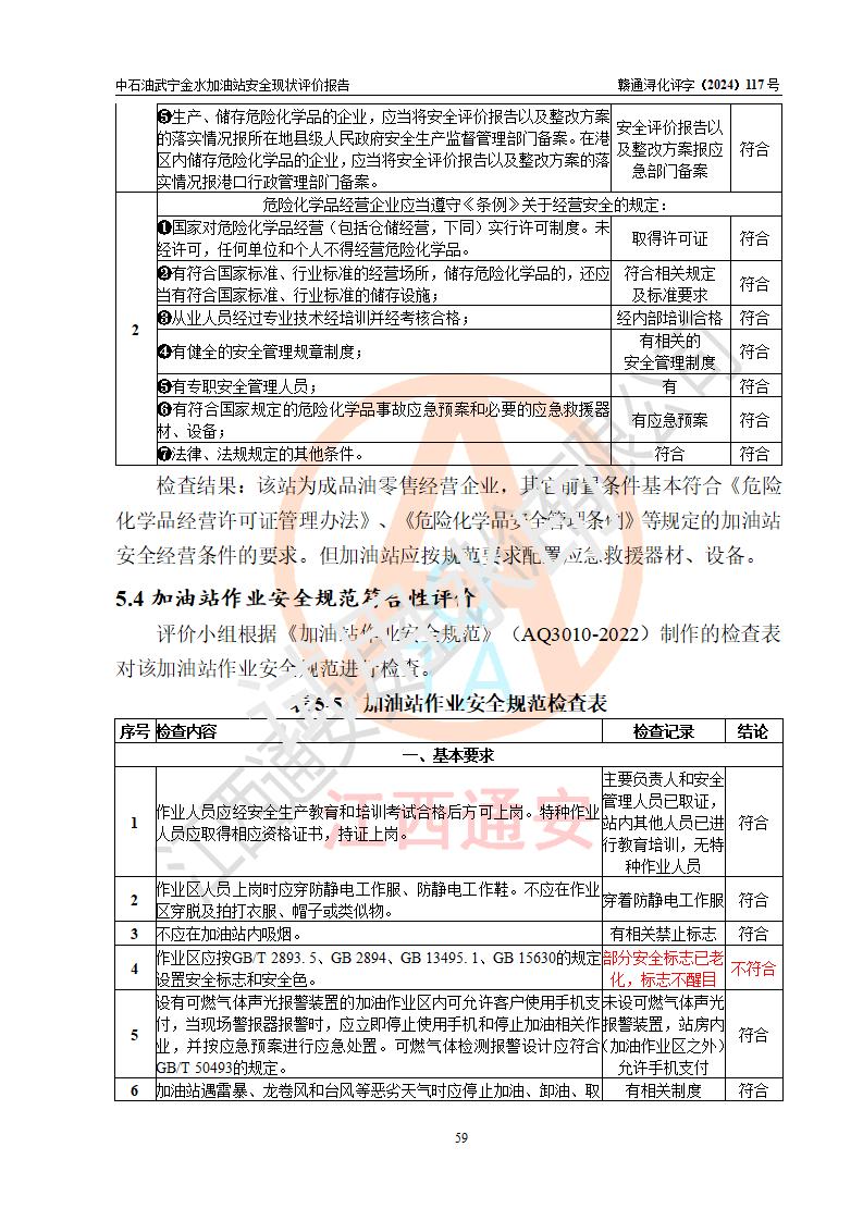 評價結(jié)論 | 中國石油天然氣股份有限公司江西九江武寧金水加油站涉及的安全條件、安全經(jīng)營條件、安全生產(chǎn)管理符合《危險化學(xué)品經(jīng)營許可證管理辦法》、《汽車加油加氣加氫站技術(shù)標(biāo)準(zhǔn)》等**有關(guān)法規(guī)、標(biāo)準(zhǔn)、規(guī)范要求,能滿足危險化學(xué)品經(jīng)營安全條件。 | |||