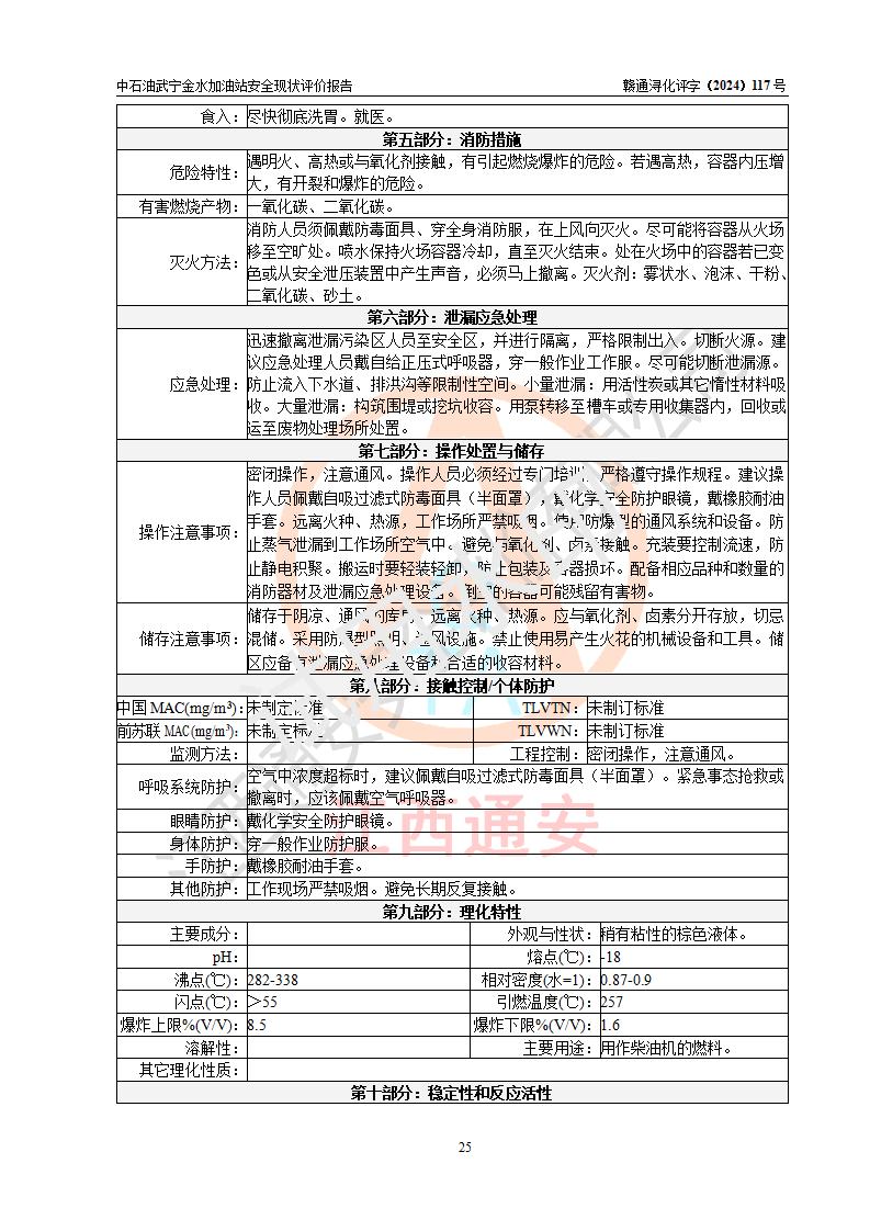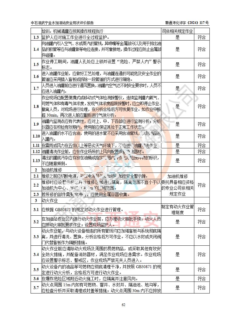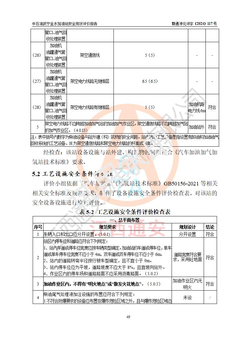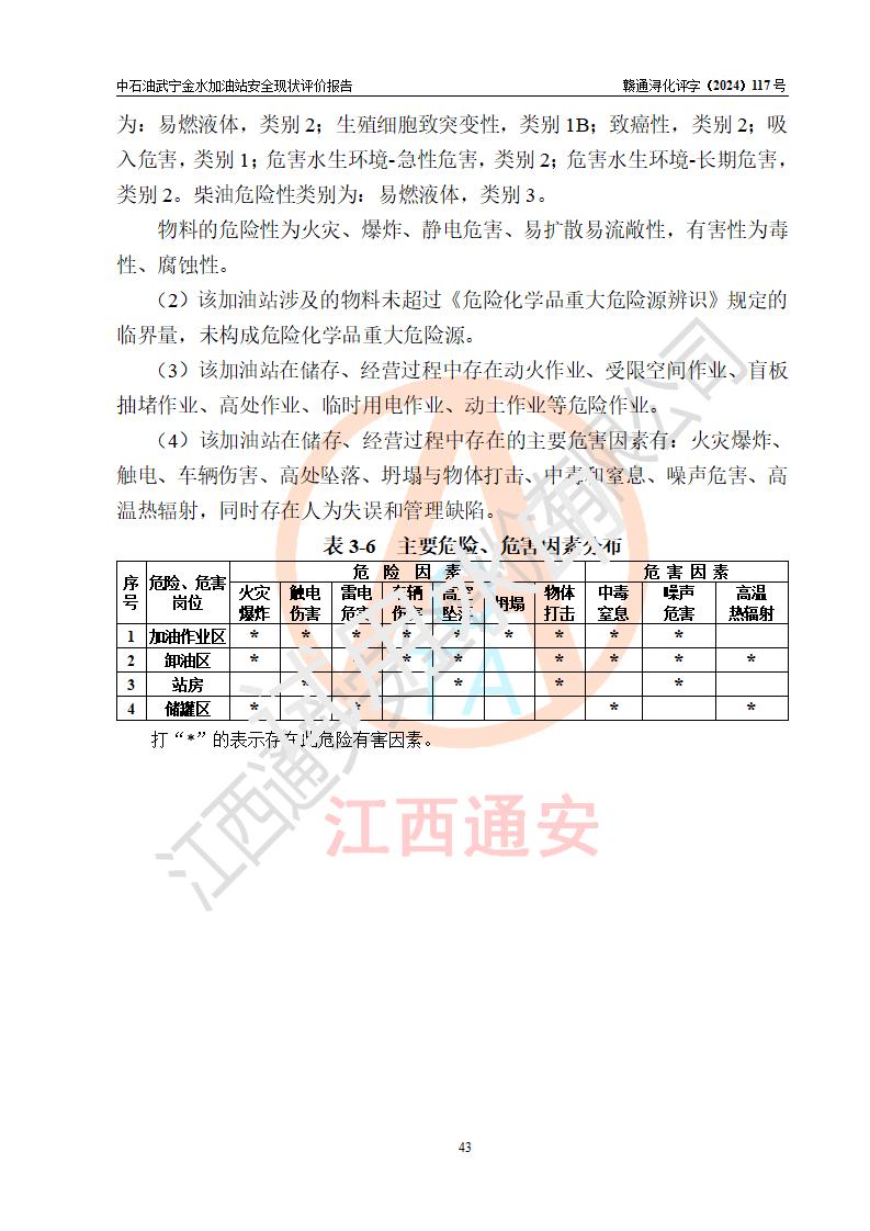 評價結(jié)論 | 中國石油天然氣股份有限公司江西九江武寧金水加油站涉及的安全條件、安全經(jīng)營條件、安全生產(chǎn)管理符合《危險化學(xué)品經(jīng)營許可證管理辦法》、《汽車加油加氣加氫站技術(shù)標(biāo)準(zhǔn)》等**有關(guān)法規(guī)、標(biāo)準(zhǔn)、規(guī)范要求,能滿足危險化學(xué)品經(jīng)營安全條件。 | |||