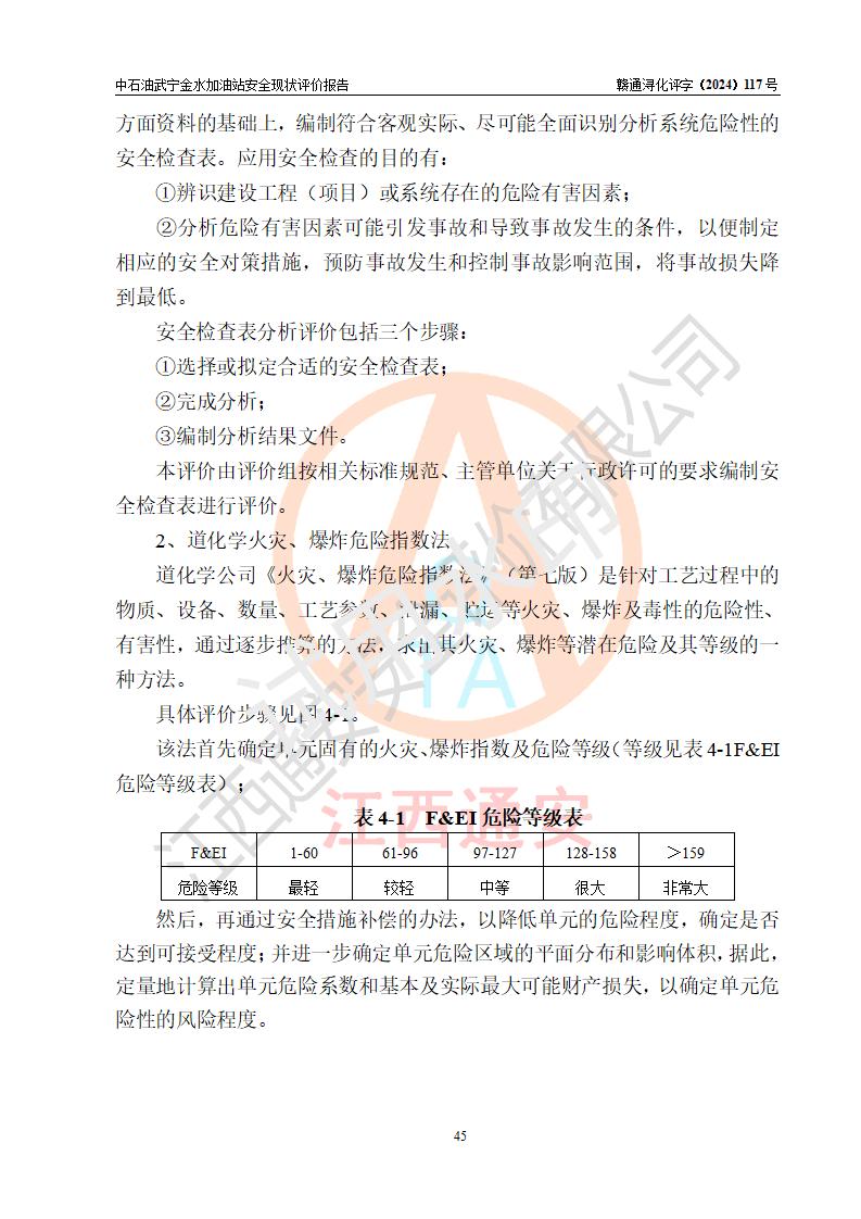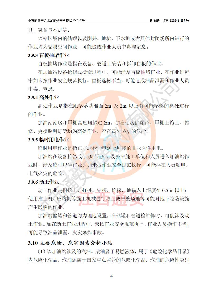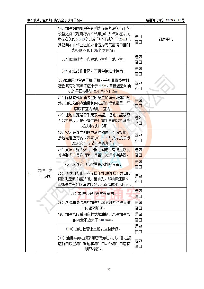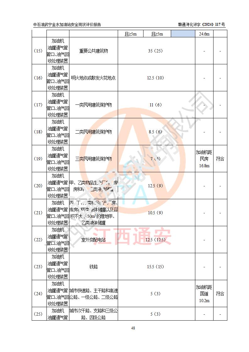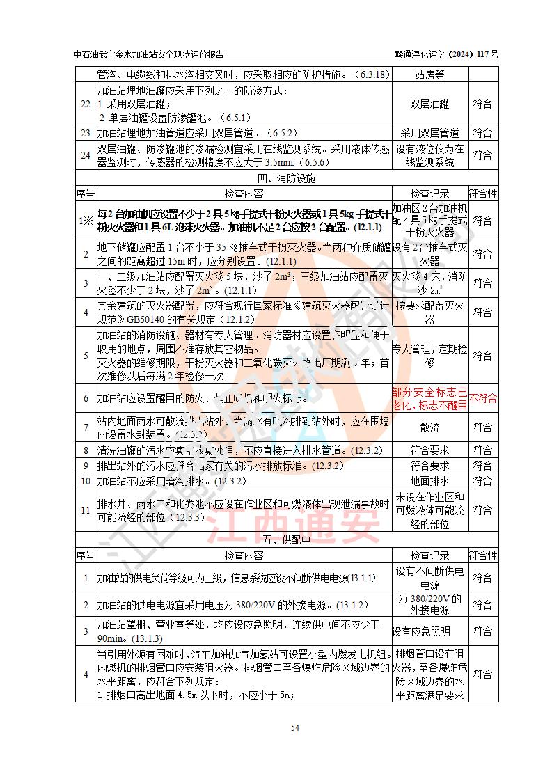 評價結(jié)論 | 中國石油天然氣股份有限公司江西九江武寧金水加油站涉及的安全條件、安全經(jīng)營條件、安全生產(chǎn)管理符合《危險化學(xué)品經(jīng)營許可證管理辦法》、《汽車加油加氣加氫站技術(shù)標(biāo)準(zhǔn)》等**有關(guān)法規(guī)、標(biāo)準(zhǔn)、規(guī)范要求,能滿足危險化學(xué)品經(jīng)營安全條件。 | |||