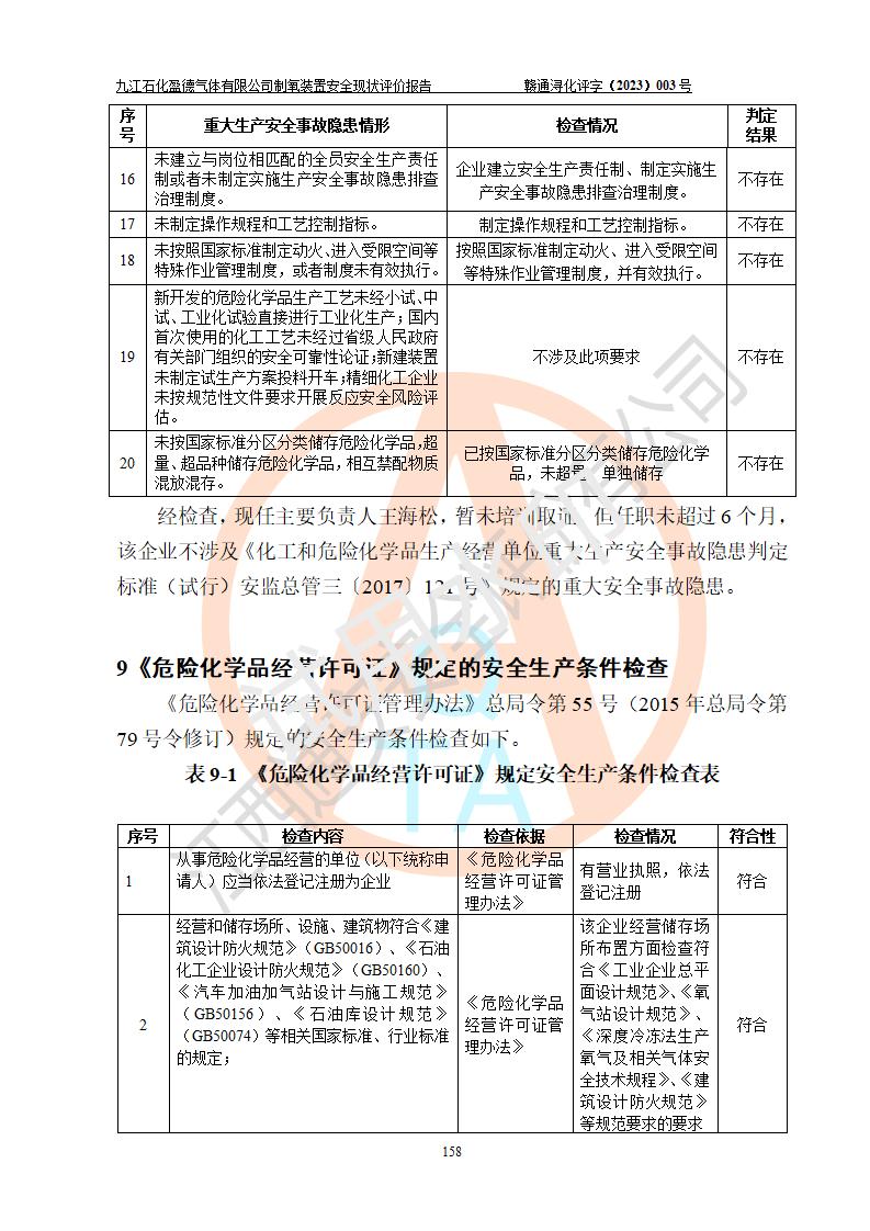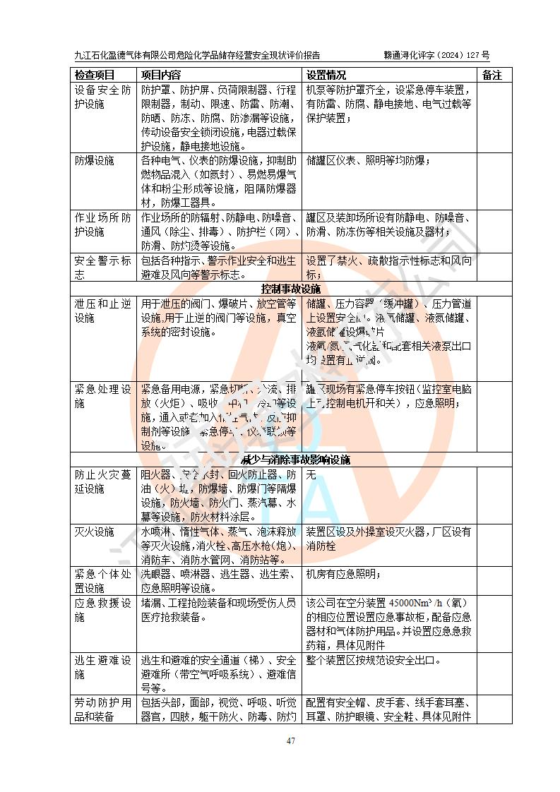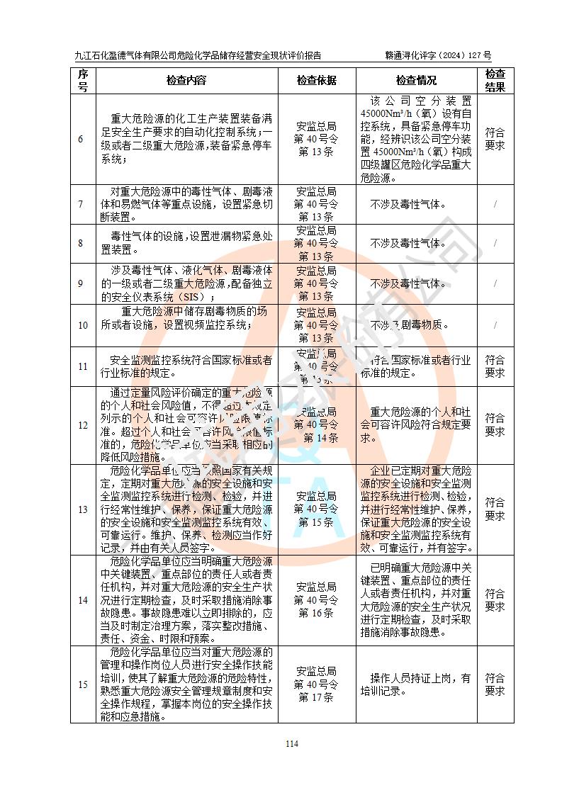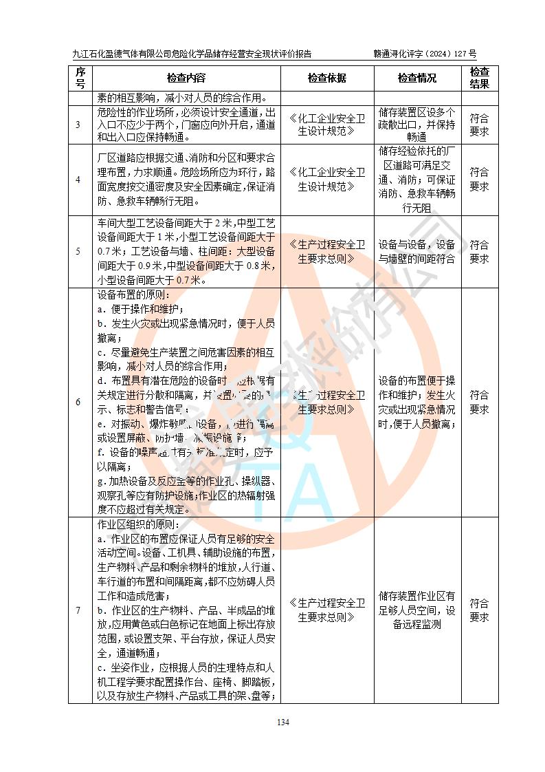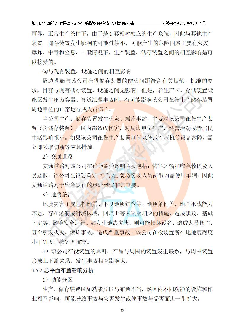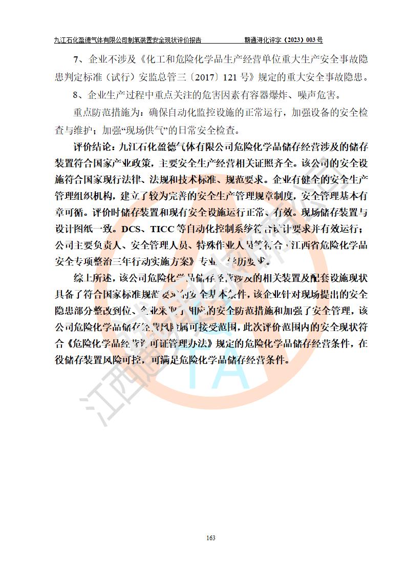 評價結(jié)論 | 九江石化盈德氣體有限公司危險化學(xué)品儲存經(jīng)營涉及的儲存裝置符合**產(chǎn)業(yè)政策,主要安全生產(chǎn)經(jīng)營相關(guān)證照齊全。該公司的安全設(shè)施符合**現(xiàn)行法律、法規(guī)和技術(shù)標(biāo)準(zhǔn)、規(guī)范要求。企業(yè)有健全的安全生產(chǎn)管理組織機(jī)構(gòu),建立了較為完善的安全生產(chǎn)管理規(guī)章制度,安全管理基本有章可循。評價時儲存裝置和現(xiàn)有安全設(shè)施運(yùn)行正常、**。現(xiàn)場儲存裝置與設(shè)計圖紙一致。DCS、TICC等自動化控制系統(tǒng)符合設(shè)計要求并**運(yùn)行;公司主要負(fù)責(zé)人、安全管理人員、特殊作業(yè)人員等符合《江西省危險化學(xué)品安全專項整治三年行動實施方案》專業(yè)、學(xué)歷要求。 綜上所述,該公司危險化學(xué)品儲存經(jīng)營涉及的相關(guān)裝置及配套設(shè)施現(xiàn)狀具備了符合**標(biāo)準(zhǔn)規(guī)范要求的安全基本條件,該企業(yè)針對現(xiàn)場提出的安全隱患部分整改到位、企業(yè)采取了相應(yīng)的安全防范措施和加強(qiáng)了安全管理,該公司危險化學(xué)品儲存經(jīng)營風(fēng)險屬可接受范圍,此次評價范圍內(nèi)的安全現(xiàn)狀符合《危險化學(xué)品經(jīng)營許可證管理辦法》規(guī)定的危險化學(xué)品儲存經(jīng)營條件,在役儲存裝置風(fēng)險可控,可滿足危險化學(xué)品儲存經(jīng)營條件。 | |||