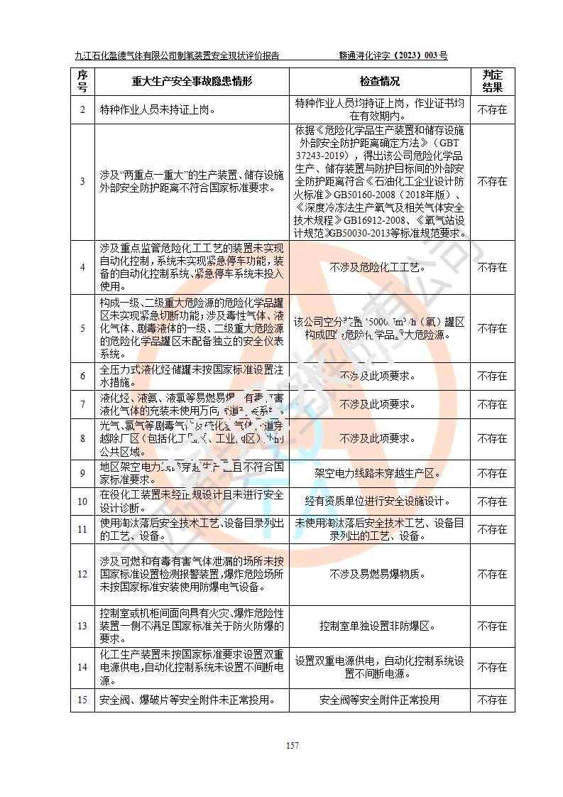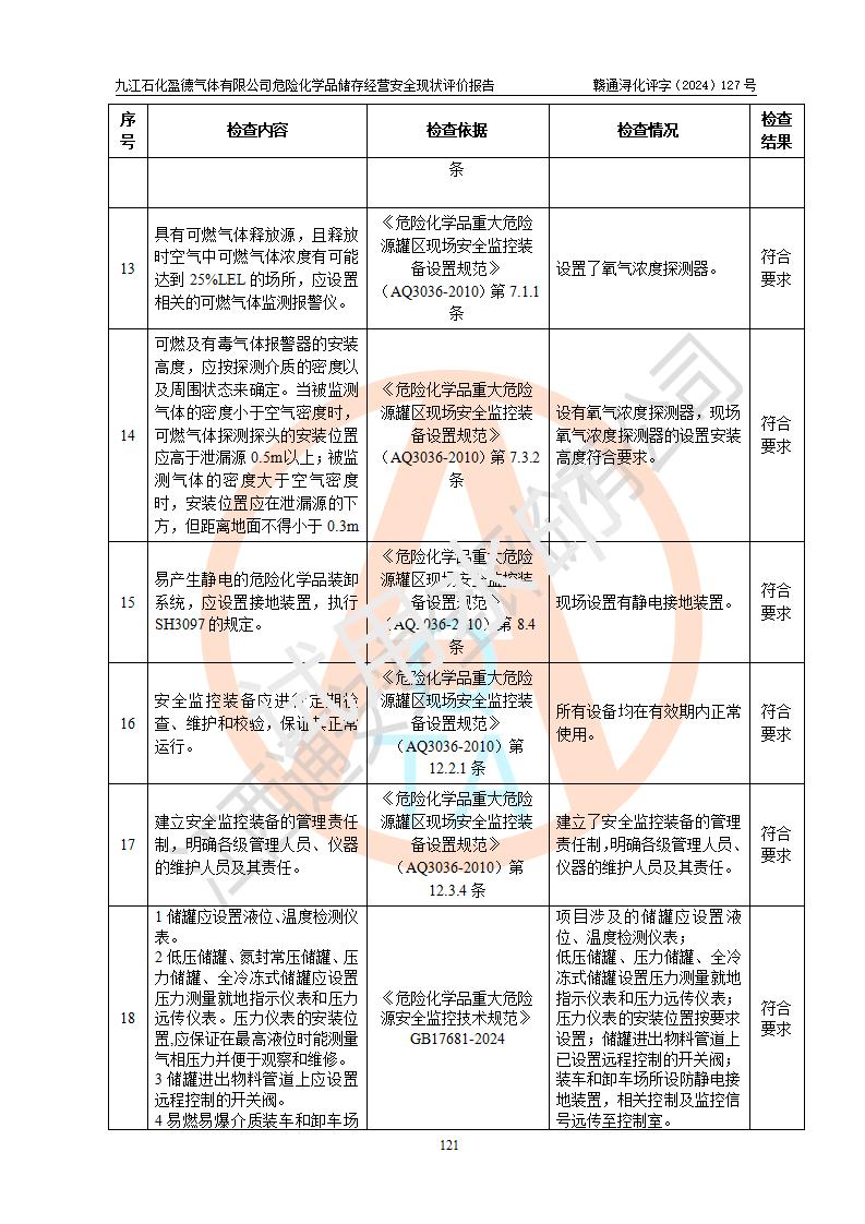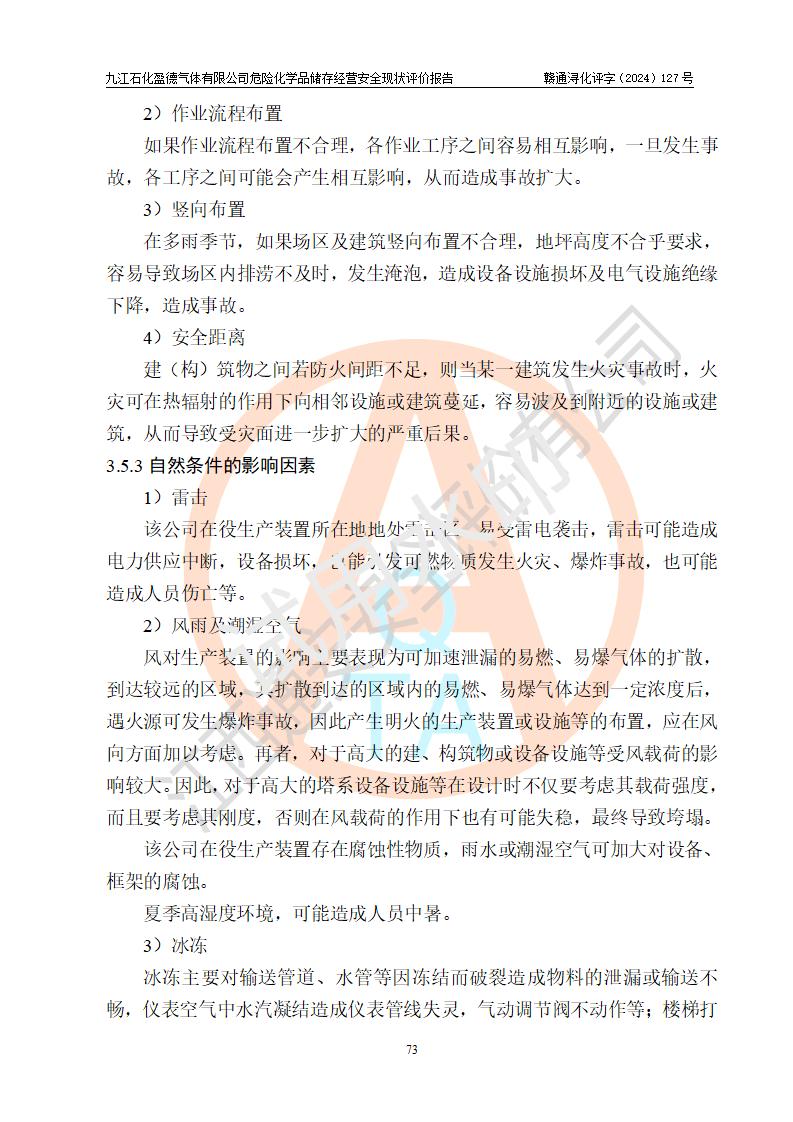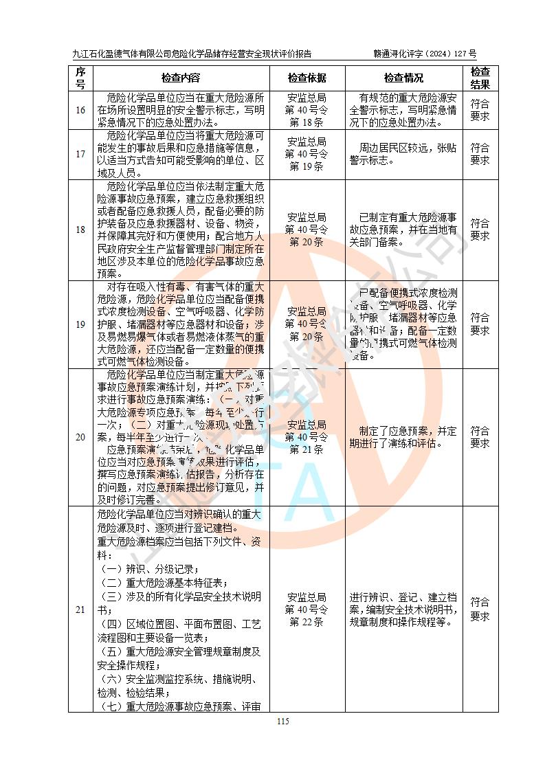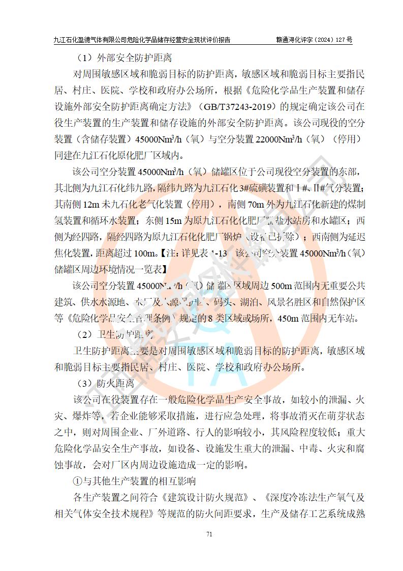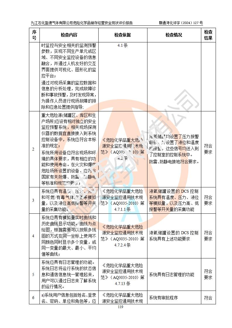 評價結(jié)論 | 九江石化盈德氣體有限公司危險化學(xué)品儲存經(jīng)營涉及的儲存裝置符合**產(chǎn)業(yè)政策,主要安全生產(chǎn)經(jīng)營相關(guān)證照齊全。該公司的安全設(shè)施符合**現(xiàn)行法律、法規(guī)和技術(shù)標(biāo)準(zhǔn)、規(guī)范要求。企業(yè)有健全的安全生產(chǎn)管理組織機(jī)構(gòu),建立了較為完善的安全生產(chǎn)管理規(guī)章制度,安全管理基本有章可循。評價時儲存裝置和現(xiàn)有安全設(shè)施運(yùn)行正常、**。現(xiàn)場儲存裝置與設(shè)計圖紙一致。DCS、TICC等自動化控制系統(tǒng)符合設(shè)計要求并**運(yùn)行;公司主要負(fù)責(zé)人、安全管理人員、特殊作業(yè)人員等符合《江西省危險化學(xué)品安全專項整治三年行動實施方案》專業(yè)、學(xué)歷要求。 綜上所述,該公司危險化學(xué)品儲存經(jīng)營涉及的相關(guān)裝置及配套設(shè)施現(xiàn)狀具備了符合**標(biāo)準(zhǔn)規(guī)范要求的安全基本條件,該企業(yè)針對現(xiàn)場提出的安全隱患部分整改到位、企業(yè)采取了相應(yīng)的安全防范措施和加強(qiáng)了安全管理,該公司危險化學(xué)品儲存經(jīng)營風(fēng)險屬可接受范圍,此次評價范圍內(nèi)的安全現(xiàn)狀符合《危險化學(xué)品經(jīng)營許可證管理辦法》規(guī)定的危險化學(xué)品儲存經(jīng)營條件,在役儲存裝置風(fēng)險可控,可滿足危險化學(xué)品儲存經(jīng)營條件。 | |||