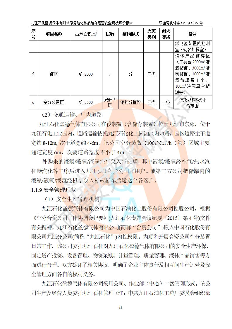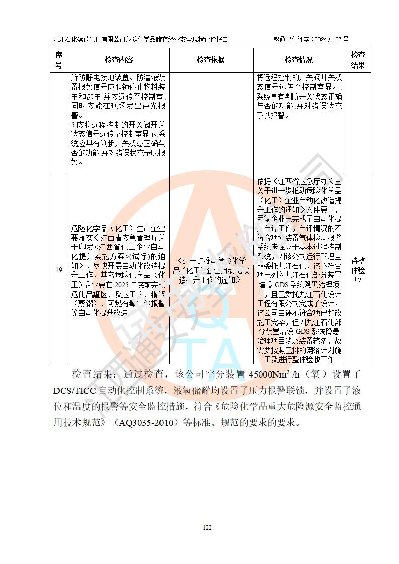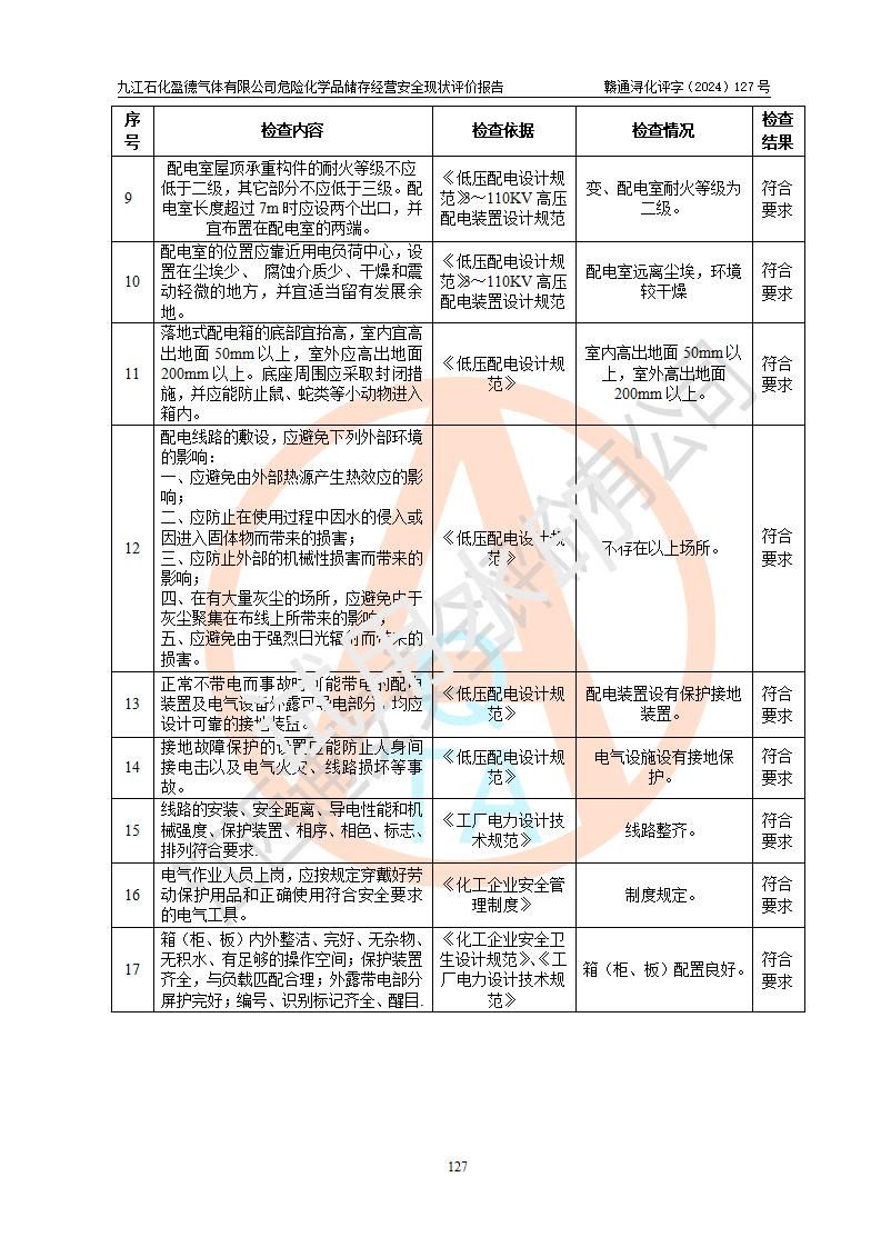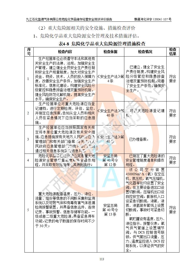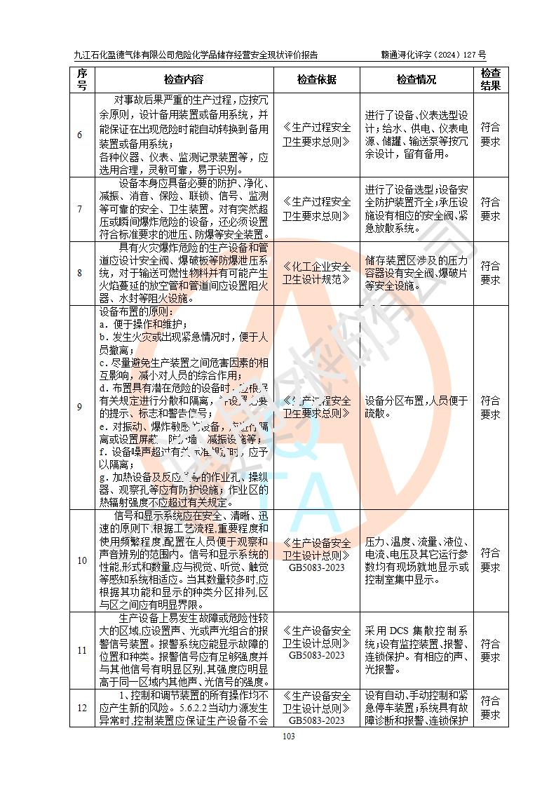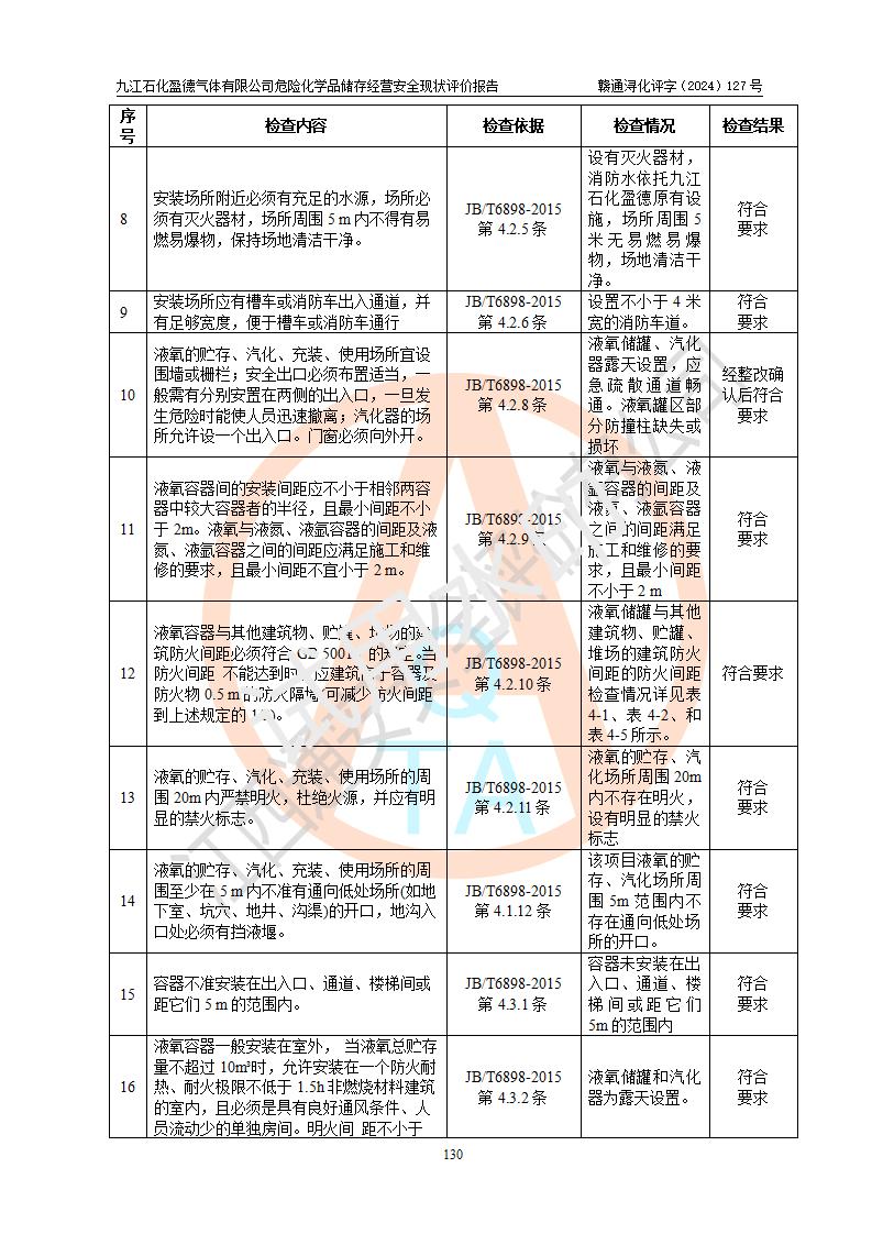 評價結(jié)論 | 九江石化盈德氣體有限公司危險化學(xué)品儲存經(jīng)營涉及的儲存裝置符合**產(chǎn)業(yè)政策,主要安全生產(chǎn)經(jīng)營相關(guān)證照齊全。該公司的安全設(shè)施符合**現(xiàn)行法律、法規(guī)和技術(shù)標(biāo)準(zhǔn)、規(guī)范要求。企業(yè)有健全的安全生產(chǎn)管理組織機(jī)構(gòu),建立了較為完善的安全生產(chǎn)管理規(guī)章制度,安全管理基本有章可循。評價時儲存裝置和現(xiàn)有安全設(shè)施運(yùn)行正常、**。現(xiàn)場儲存裝置與設(shè)計圖紙一致。DCS、TICC等自動化控制系統(tǒng)符合設(shè)計要求并**運(yùn)行;公司主要負(fù)責(zé)人、安全管理人員、特殊作業(yè)人員等符合《江西省危險化學(xué)品安全專項整治三年行動實施方案》專業(yè)、學(xué)歷要求。 綜上所述,該公司危險化學(xué)品儲存經(jīng)營涉及的相關(guān)裝置及配套設(shè)施現(xiàn)狀具備了符合**標(biāo)準(zhǔn)規(guī)范要求的安全基本條件,該企業(yè)針對現(xiàn)場提出的安全隱患部分整改到位、企業(yè)采取了相應(yīng)的安全防范措施和加強(qiáng)了安全管理,該公司危險化學(xué)品儲存經(jīng)營風(fēng)險屬可接受范圍,此次評價范圍內(nèi)的安全現(xiàn)狀符合《危險化學(xué)品經(jīng)營許可證管理辦法》規(guī)定的危險化學(xué)品儲存經(jīng)營條件,在役儲存裝置風(fēng)險可控,可滿足危險化學(xué)品儲存經(jīng)營條件。 | |||
