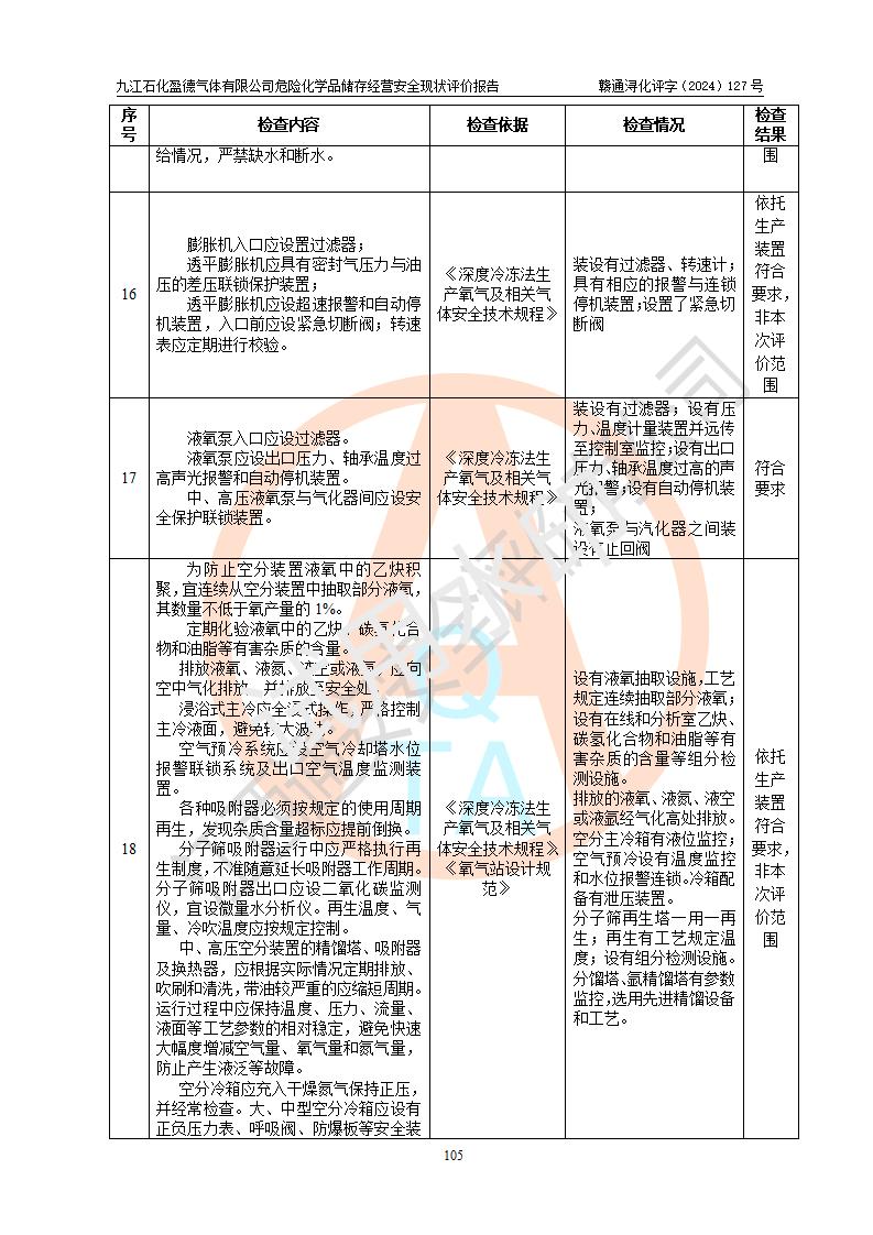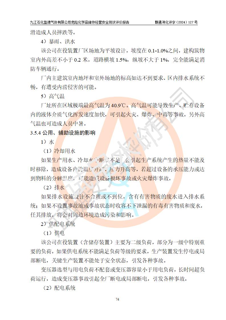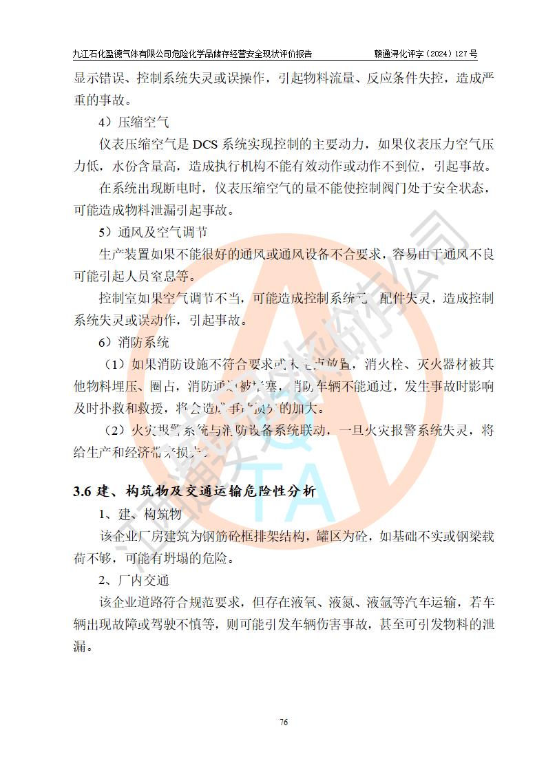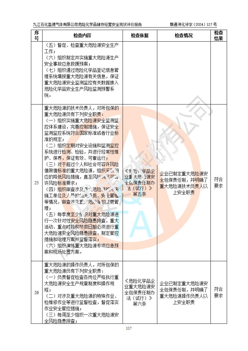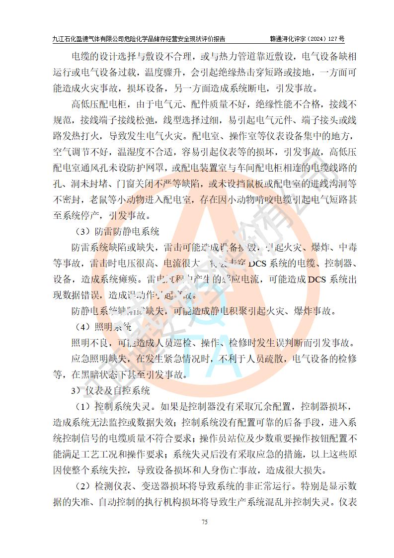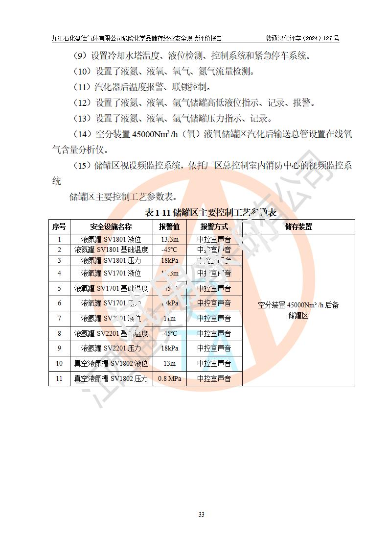 評價結(jié)論 | 九江石化盈德氣體有限公司危險化學(xué)品儲存經(jīng)營涉及的儲存裝置符合**產(chǎn)業(yè)政策,主要安全生產(chǎn)經(jīng)營相關(guān)證照齊全。該公司的安全設(shè)施符合**現(xiàn)行法律、法規(guī)和技術(shù)標(biāo)準(zhǔn)、規(guī)范要求。企業(yè)有健全的安全生產(chǎn)管理組織機(jī)構(gòu),建立了較為完善的安全生產(chǎn)管理規(guī)章制度,安全管理基本有章可循。評價時儲存裝置和現(xiàn)有安全設(shè)施運(yùn)行正常、**。現(xiàn)場儲存裝置與設(shè)計圖紙一致。DCS、TICC等自動化控制系統(tǒng)符合設(shè)計要求并**運(yùn)行;公司主要負(fù)責(zé)人、安全管理人員、特殊作業(yè)人員等符合《江西省危險化學(xué)品安全專項整治三年行動實施方案》專業(yè)、學(xué)歷要求。 綜上所述,該公司危險化學(xué)品儲存經(jīng)營涉及的相關(guān)裝置及配套設(shè)施現(xiàn)狀具備了符合**標(biāo)準(zhǔn)規(guī)范要求的安全基本條件,該企業(yè)針對現(xiàn)場提出的安全隱患部分整改到位、企業(yè)采取了相應(yīng)的安全防范措施和加強(qiáng)了安全管理,該公司危險化學(xué)品儲存經(jīng)營風(fēng)險屬可接受范圍,此次評價范圍內(nèi)的安全現(xiàn)狀符合《危險化學(xué)品經(jīng)營許可證管理辦法》規(guī)定的危險化學(xué)品儲存經(jīng)營條件,在役儲存裝置風(fēng)險可控,可滿足危險化學(xué)品儲存經(jīng)營條件。 | |||