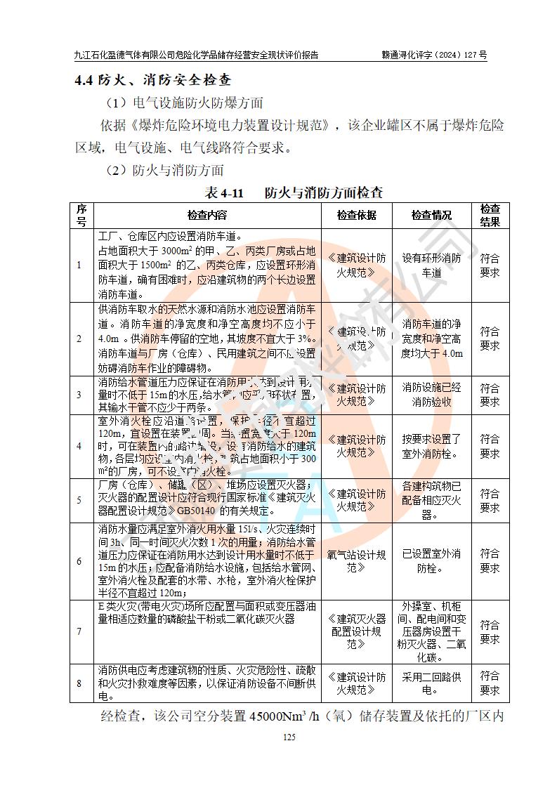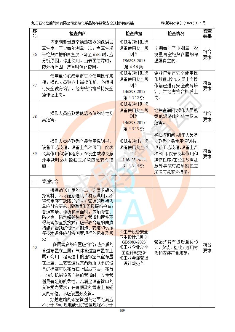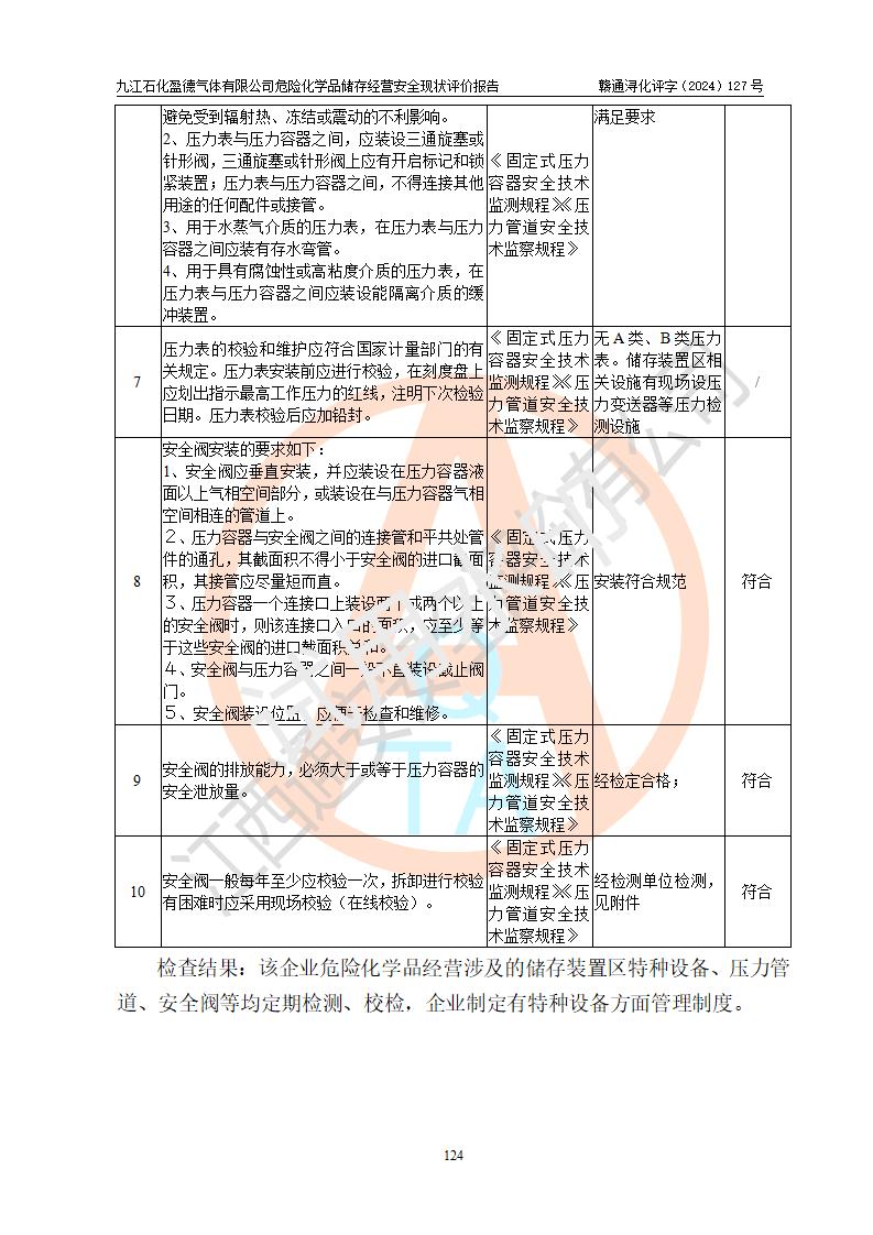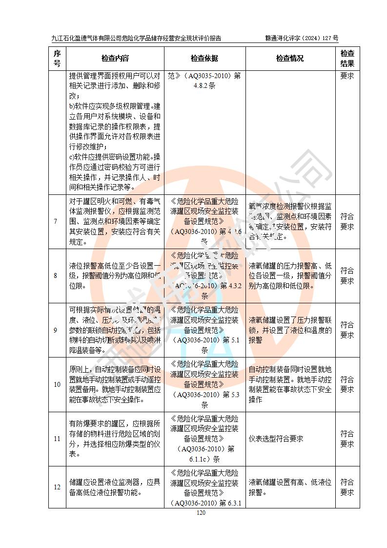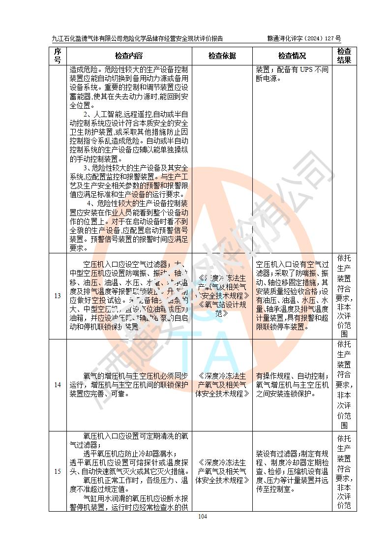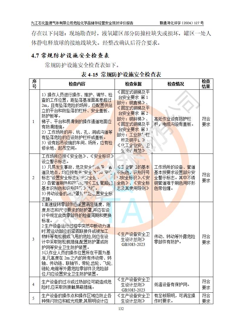 評價結(jié)論 | 九江石化盈德氣體有限公司危險化學(xué)品儲存經(jīng)營涉及的儲存裝置符合**產(chǎn)業(yè)政策,主要安全生產(chǎn)經(jīng)營相關(guān)證照齊全。該公司的安全設(shè)施符合**現(xiàn)行法律、法規(guī)和技術(shù)標(biāo)準(zhǔn)、規(guī)范要求。企業(yè)有健全的安全生產(chǎn)管理組織機(jī)構(gòu),建立了較為完善的安全生產(chǎn)管理規(guī)章制度,安全管理基本有章可循。評價時儲存裝置和現(xiàn)有安全設(shè)施運(yùn)行正常、**。現(xiàn)場儲存裝置與設(shè)計圖紙一致。DCS、TICC等自動化控制系統(tǒng)符合設(shè)計要求并**運(yùn)行;公司主要負(fù)責(zé)人、安全管理人員、特殊作業(yè)人員等符合《江西省危險化學(xué)品安全專項整治三年行動實施方案》專業(yè)、學(xué)歷要求。 綜上所述,該公司危險化學(xué)品儲存經(jīng)營涉及的相關(guān)裝置及配套設(shè)施現(xiàn)狀具備了符合**標(biāo)準(zhǔn)規(guī)范要求的安全基本條件,該企業(yè)針對現(xiàn)場提出的安全隱患部分整改到位、企業(yè)采取了相應(yīng)的安全防范措施和加強(qiáng)了安全管理,該公司危險化學(xué)品儲存經(jīng)營風(fēng)險屬可接受范圍,此次評價范圍內(nèi)的安全現(xiàn)狀符合《危險化學(xué)品經(jīng)營許可證管理辦法》規(guī)定的危險化學(xué)品儲存經(jīng)營條件,在役儲存裝置風(fēng)險可控,可滿足危險化學(xué)品儲存經(jīng)營條件。 | |||