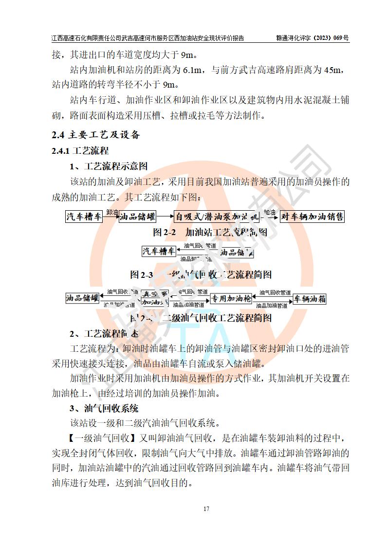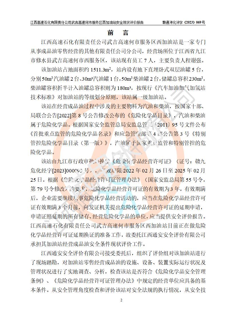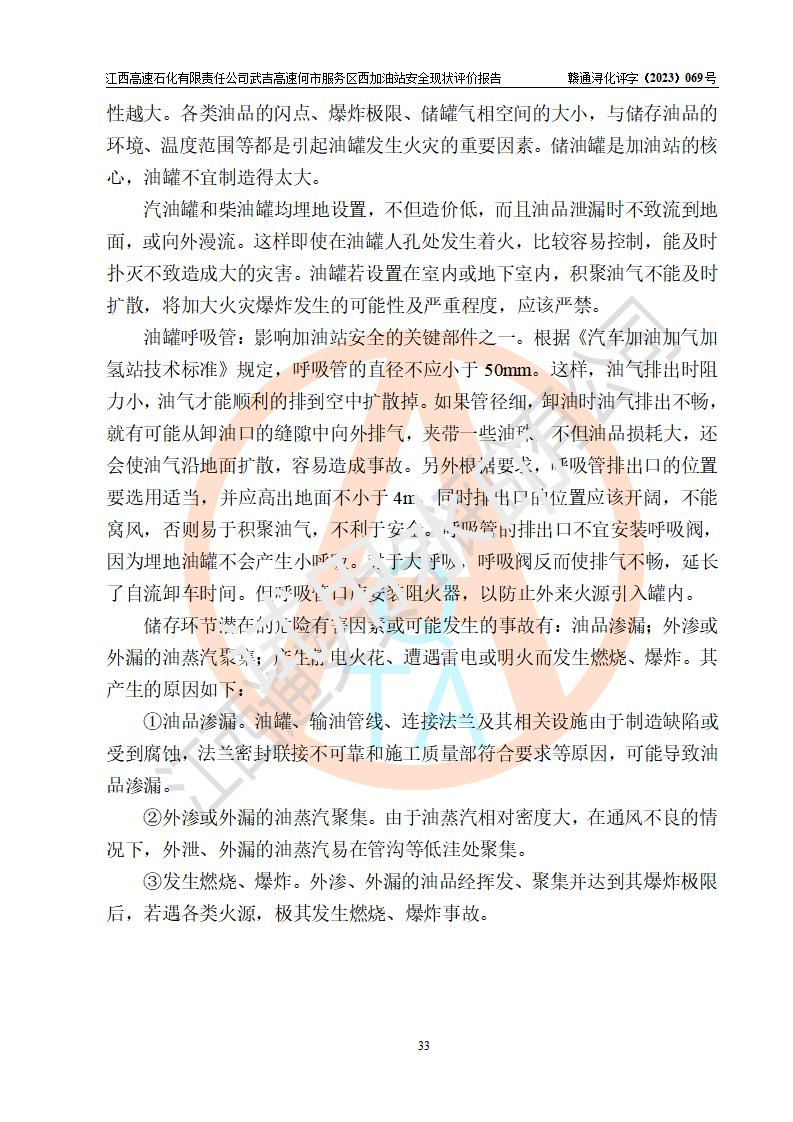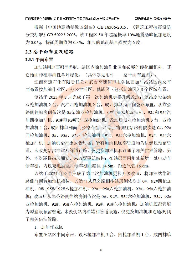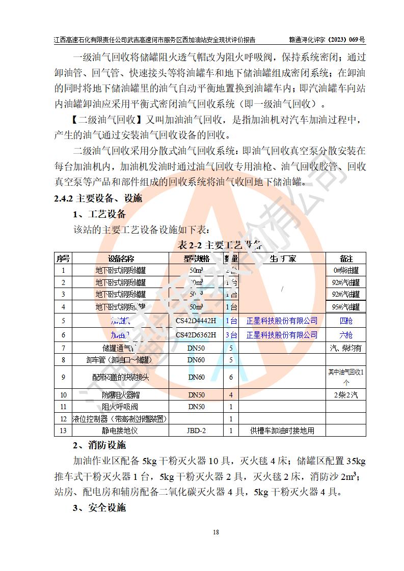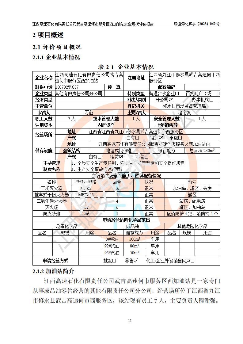 項(xiàng)目簡(jiǎn)介 | 江西高速石化有限責(zé)任公司武吉高速何市服務(wù)區(qū)西加油站是一家專門從事成品油零售經(jīng)營(yíng)的其他有限責(zé)任公司分公司,經(jīng)營(yíng)場(chǎng)所位于江西省九江市修水縣武吉高速何市西服務(wù)區(qū),該站現(xiàn)有員工7人,主要負(fù)責(zé)人程謝強(qiáng)。 該加油站占地面積約1511.3m2,站內(nèi)設(shè)有地下直埋臥式雙層油罐5臺(tái),分別50m3汽油罐2臺(tái)、30m3汽油罐1臺(tái),50m3柴油罐2臺(tái),儲(chǔ)罐總?cè)莘e230m3,柴油罐容積折半計(jì)入油罐總?cè)莘e則為180m3,按現(xiàn)行《汽車加油加氣加氫站技術(shù)標(biāo)準(zhǔn)》對(duì)加油站的等級(jí)劃分原則,該站屬一級(jí)加油站。 該站由九江市行政審批局換發(fā)《危險(xiǎn)化學(xué)品經(jīng)營(yíng)許可證》(證號(hào):贛九危化經(jīng)字[2023]000093號(hào)),**期限2022年02月26日至2025年02月25日。 | |||