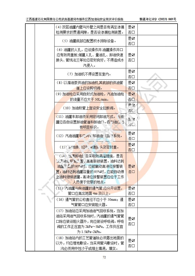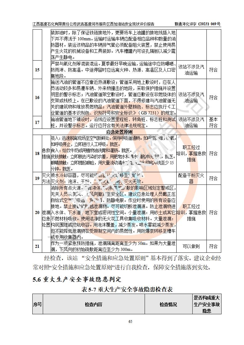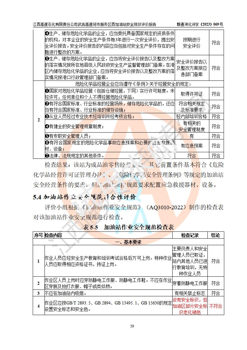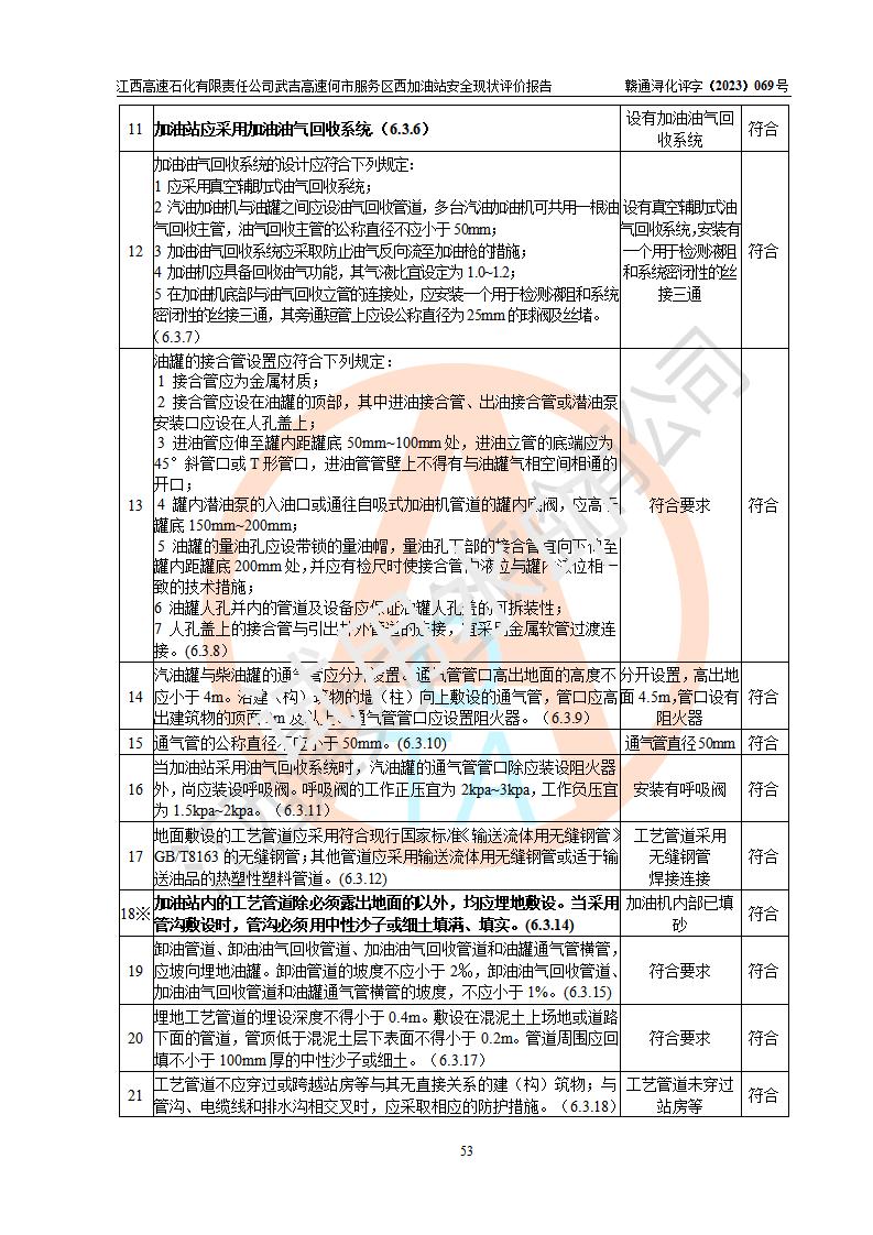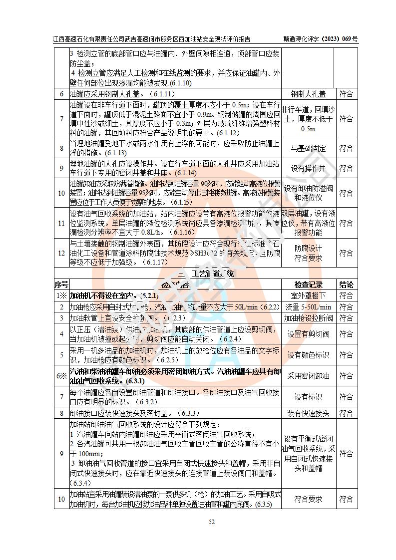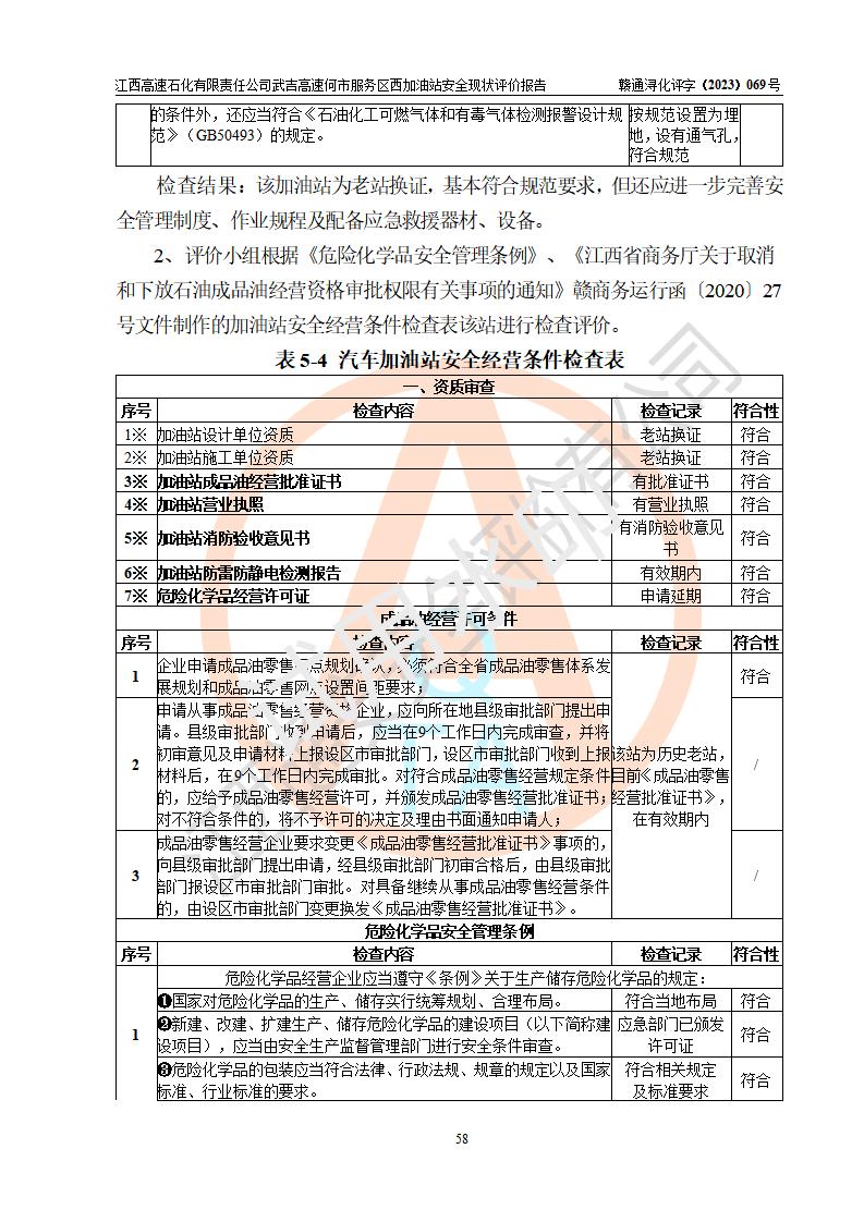 評(píng)價(jià)結(jié)論 | 江西高速石化有限責(zé)任公司武吉高速何市服務(wù)區(qū)西加油站涉及的安全條件、安全經(jīng)營(yíng)條件、安全生產(chǎn)管理符合《危險(xiǎn)化學(xué)品經(jīng)營(yíng)許可證管理辦法》、《汽車加油加氣加氫站技術(shù)標(biāo)準(zhǔn)》等**有關(guān)法規(guī)、標(biāo)準(zhǔn)、規(guī)范要求,能滿足危險(xiǎn)化學(xué)品經(jīng)營(yíng)安全條件。 | |||