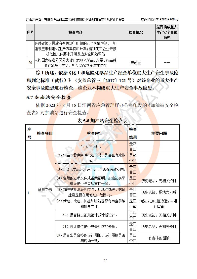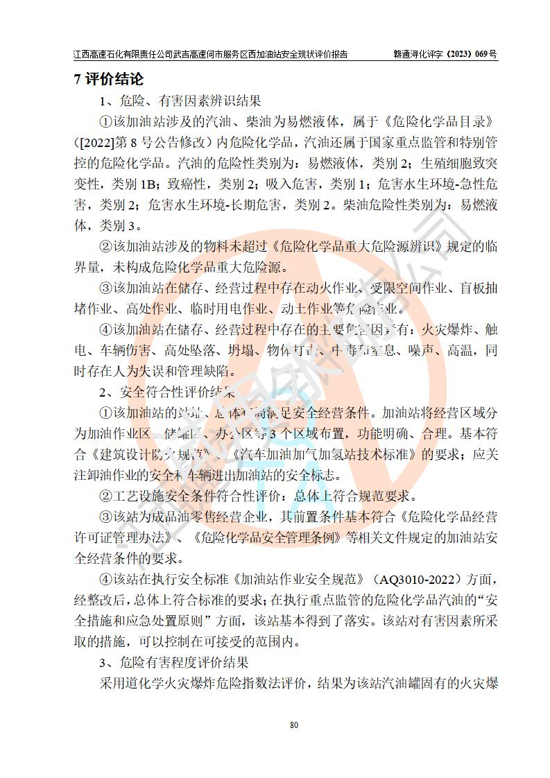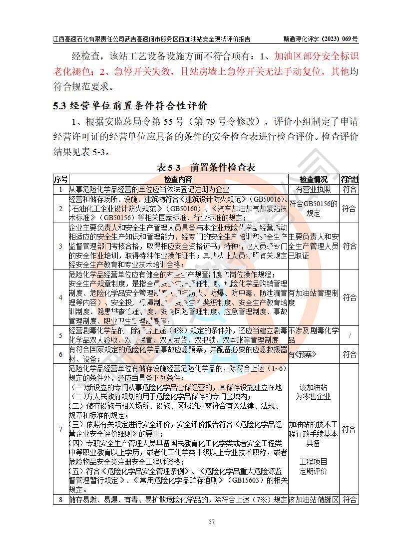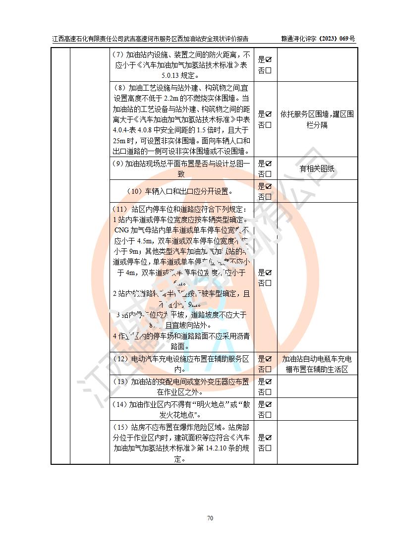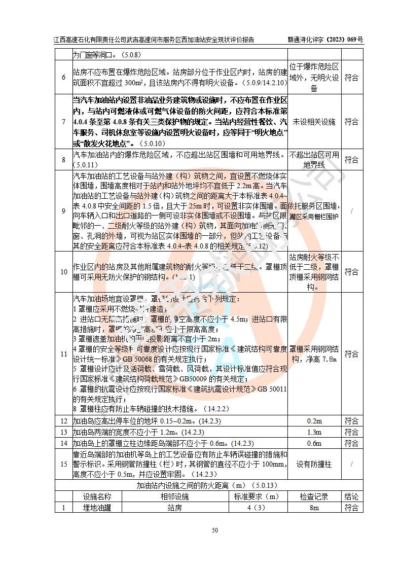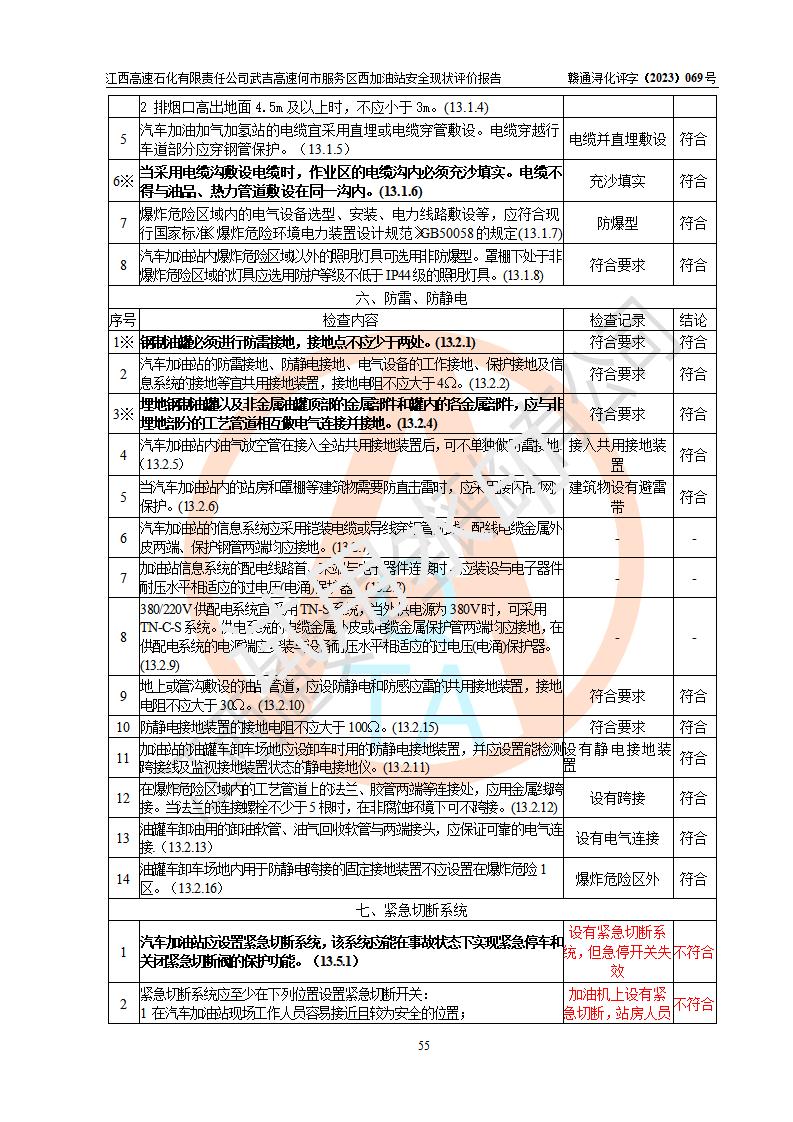 評(píng)價(jià)結(jié)論 | 江西高速石化有限責(zé)任公司武吉高速何市服務(wù)區(qū)西加油站涉及的安全條件、安全經(jīng)營(yíng)條件、安全生產(chǎn)管理符合《危險(xiǎn)化學(xué)品經(jīng)營(yíng)許可證管理辦法》、《汽車加油加氣加氫站技術(shù)標(biāo)準(zhǔn)》等**有關(guān)法規(guī)、標(biāo)準(zhǔn)、規(guī)范要求,能滿足危險(xiǎn)化學(xué)品經(jīng)營(yíng)安全條件。 | |||
