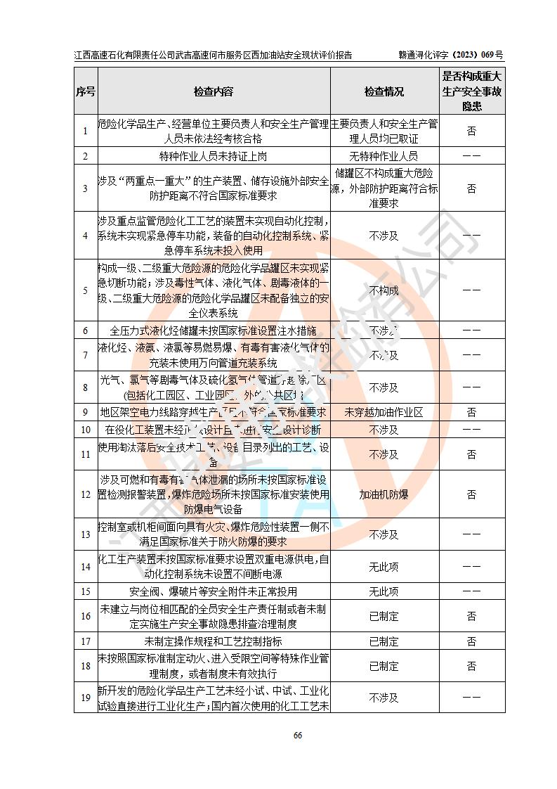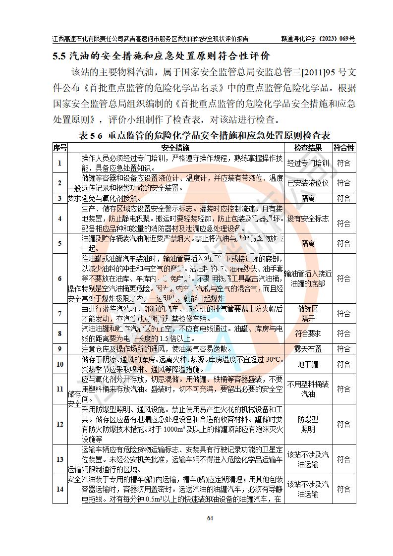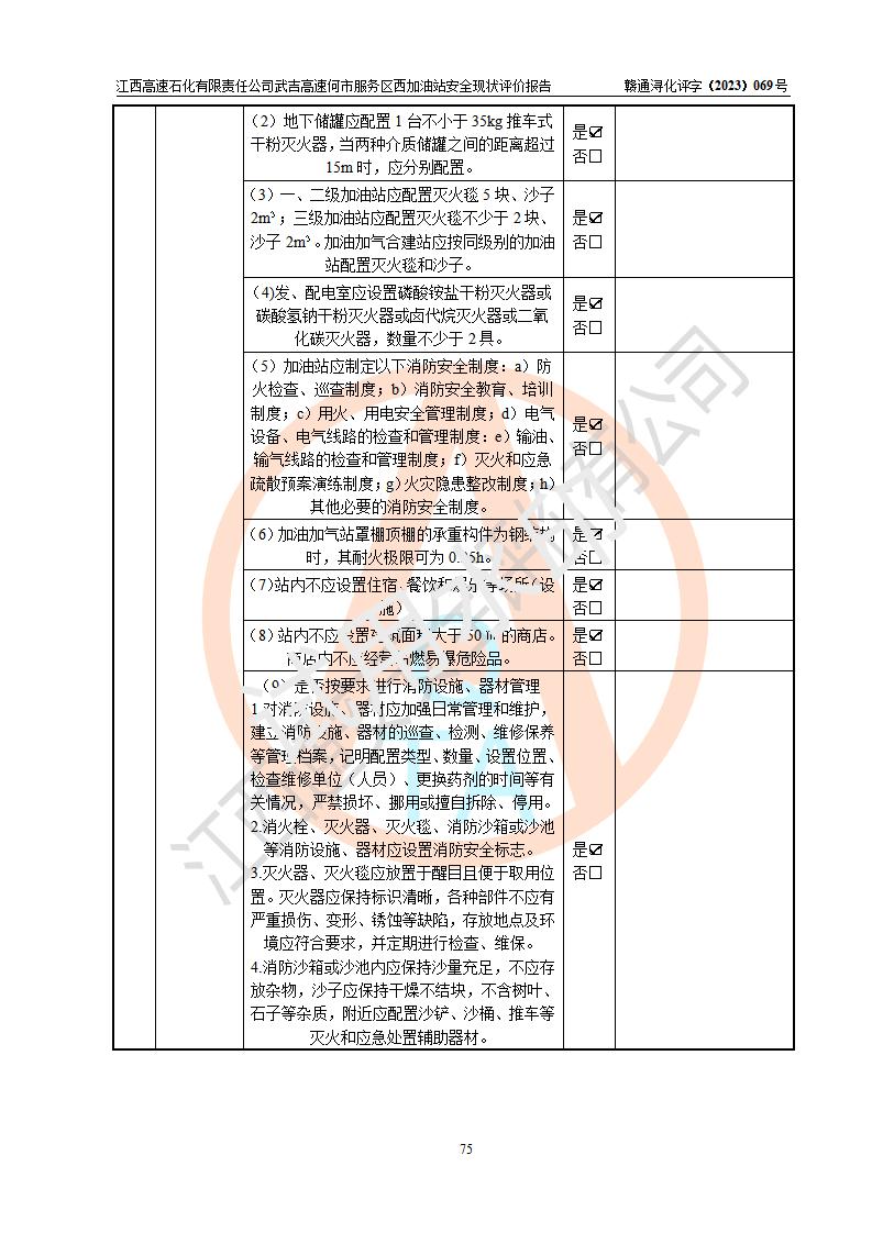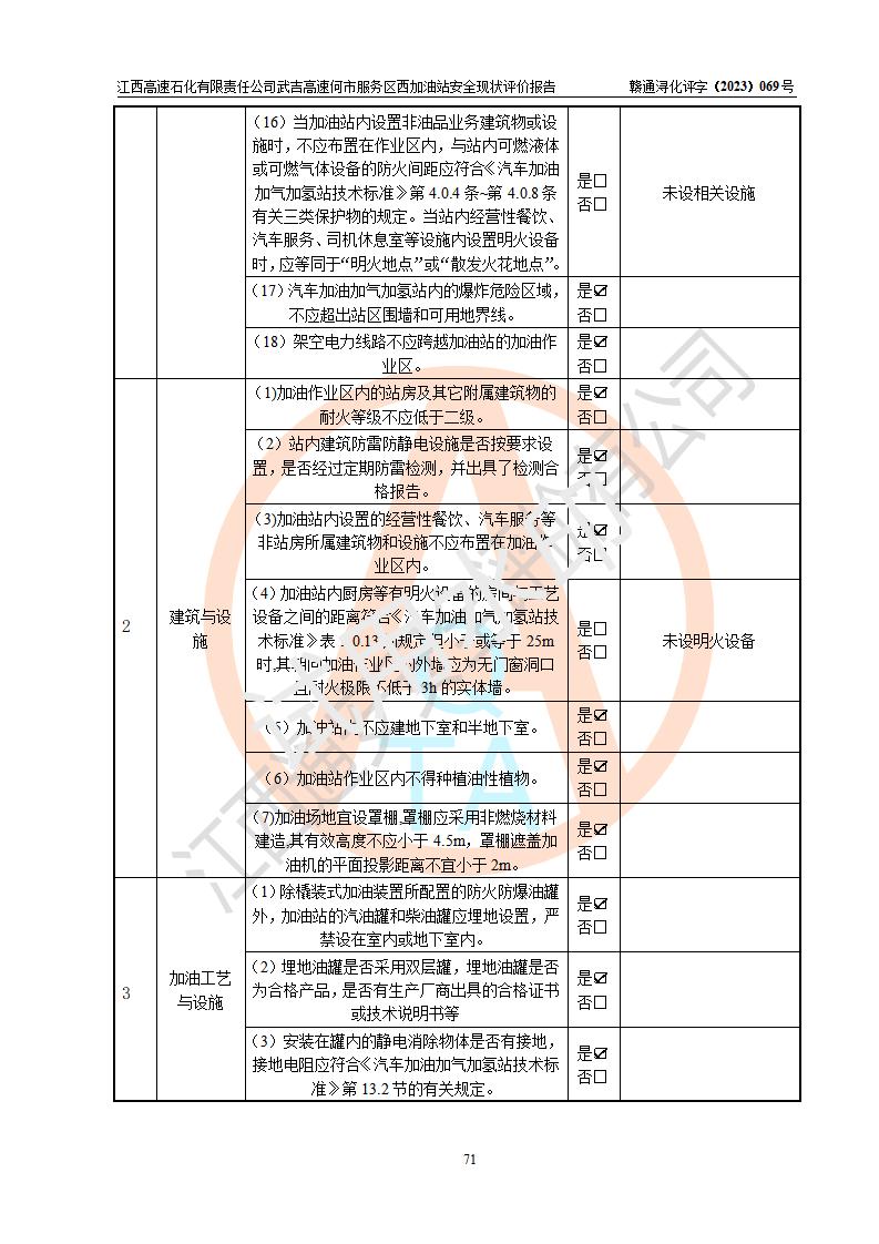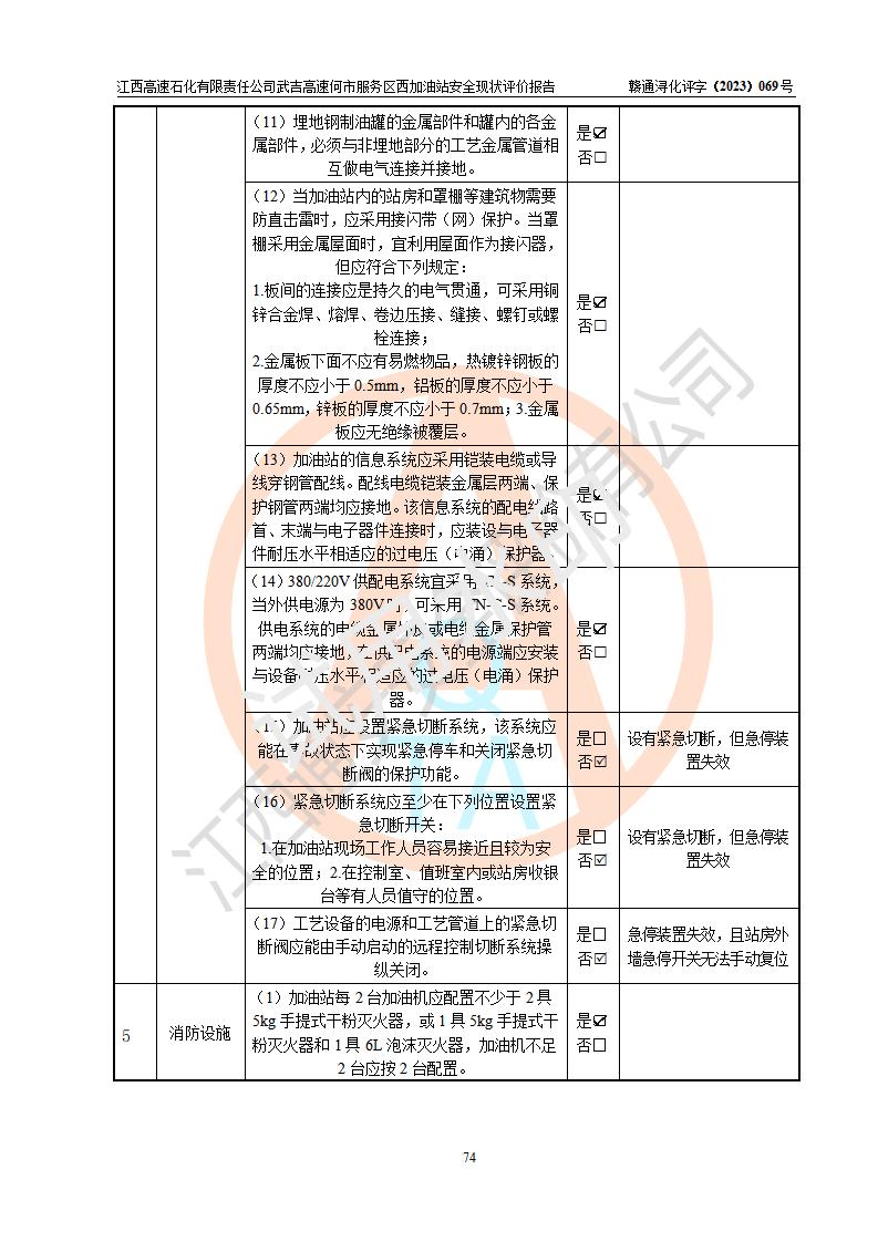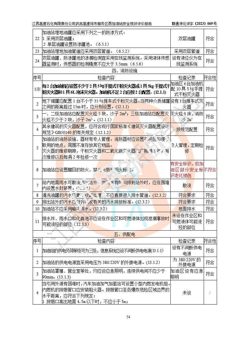 評(píng)價(jià)結(jié)論 | 江西高速石化有限責(zé)任公司武吉高速何市服務(wù)區(qū)西加油站涉及的安全條件、安全經(jīng)營(yíng)條件、安全生產(chǎn)管理符合《危險(xiǎn)化學(xué)品經(jīng)營(yíng)許可證管理辦法》、《汽車加油加氣加氫站技術(shù)標(biāo)準(zhǔn)》等**有關(guān)法規(guī)、標(biāo)準(zhǔn)、規(guī)范要求,能滿足危險(xiǎn)化學(xué)品經(jīng)營(yíng)安全條件。 | |||