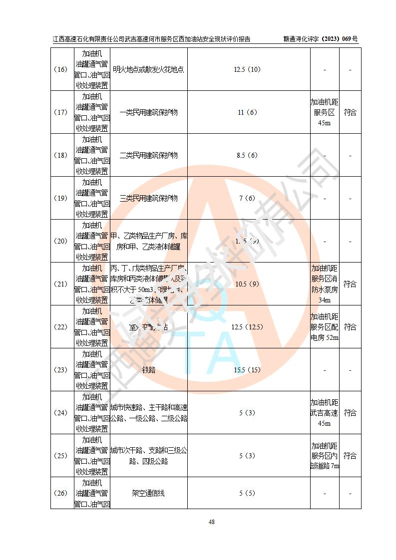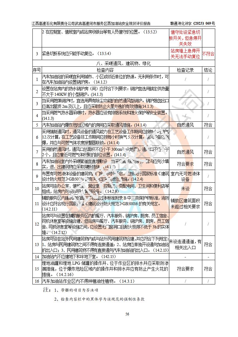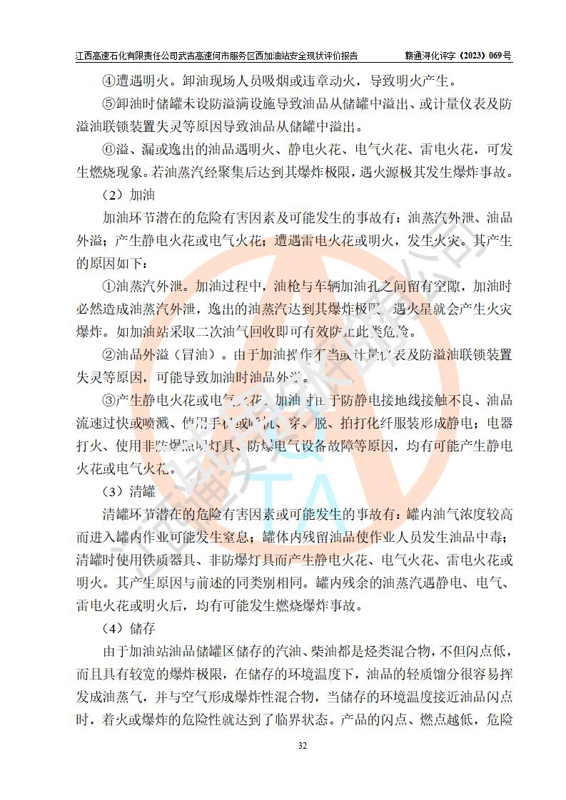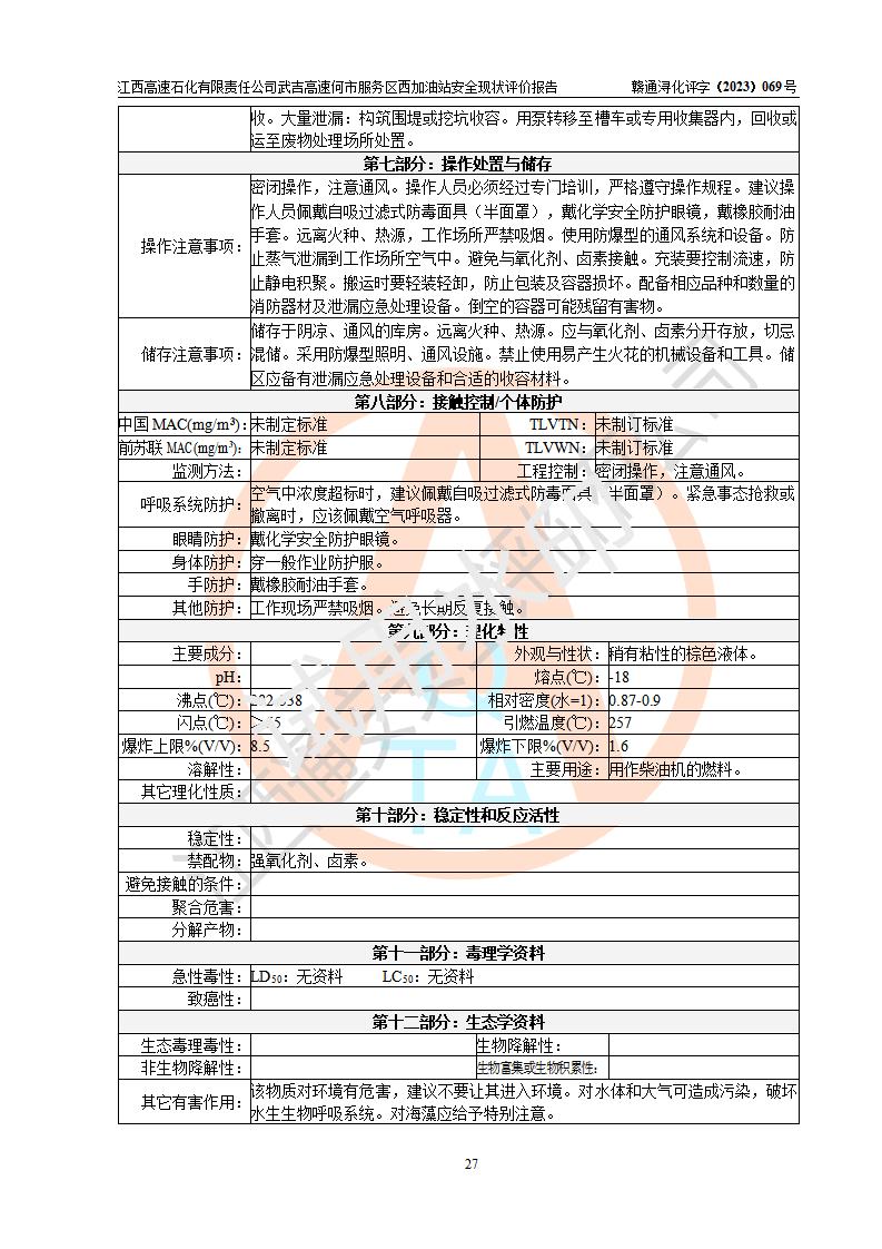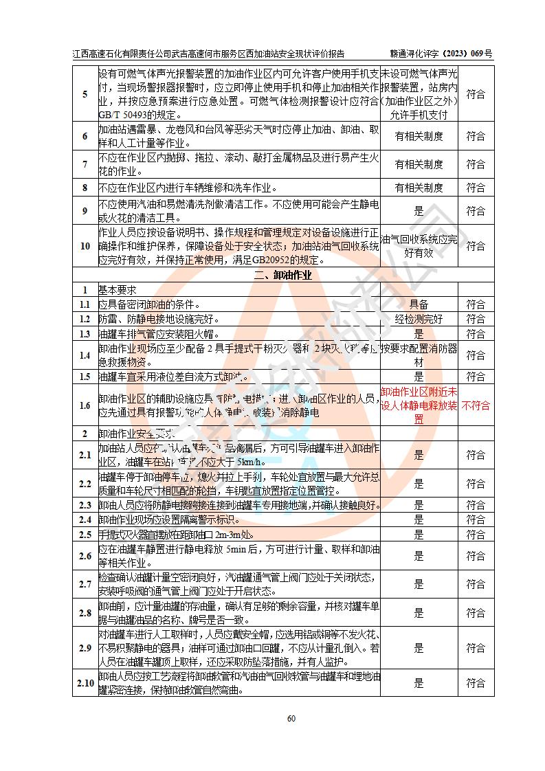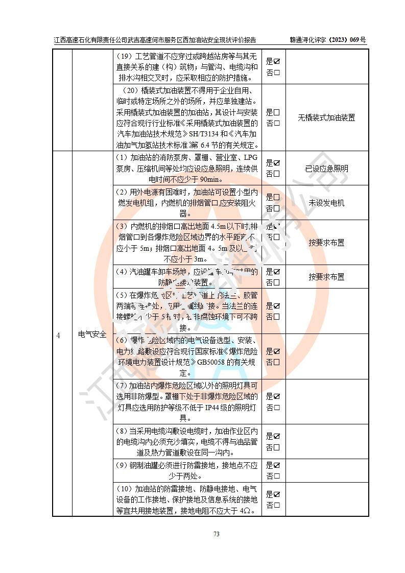 評(píng)價(jià)結(jié)論 | 江西高速石化有限責(zé)任公司武吉高速何市服務(wù)區(qū)西加油站涉及的安全條件、安全經(jīng)營(yíng)條件、安全生產(chǎn)管理符合《危險(xiǎn)化學(xué)品經(jīng)營(yíng)許可證管理辦法》、《汽車加油加氣加氫站技術(shù)標(biāo)準(zhǔn)》等**有關(guān)法規(guī)、標(biāo)準(zhǔn)、規(guī)范要求,能滿足危險(xiǎn)化學(xué)品經(jīng)營(yíng)安全條件。 | |||