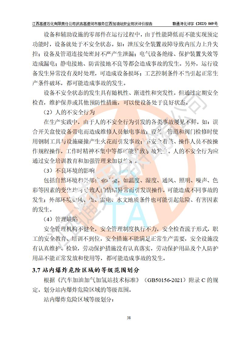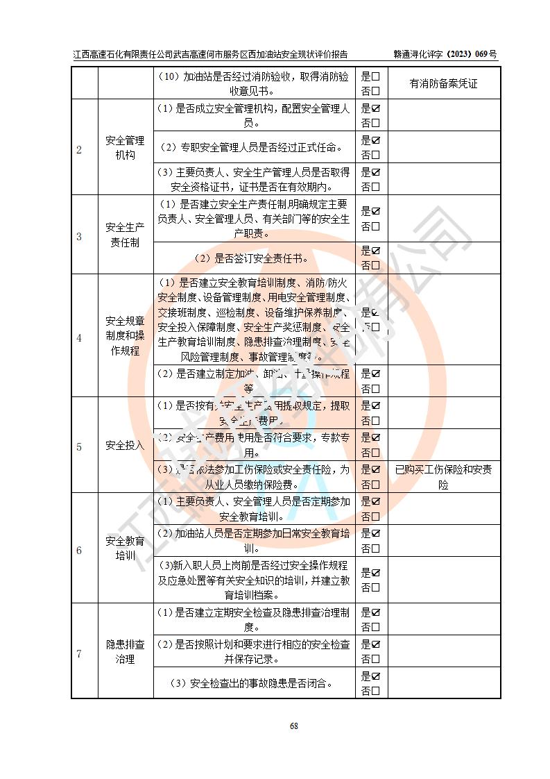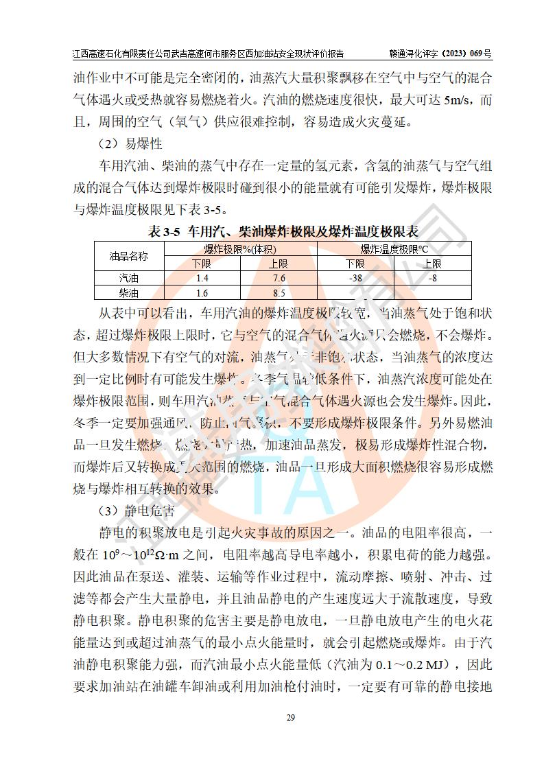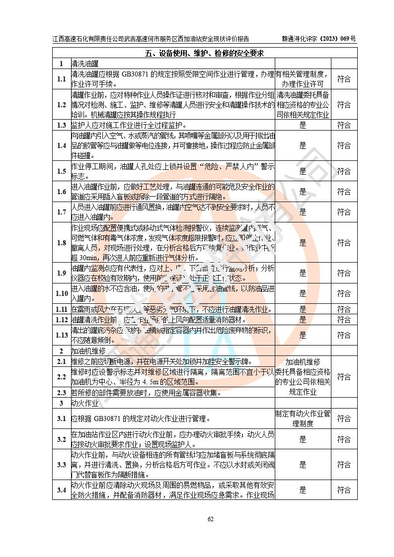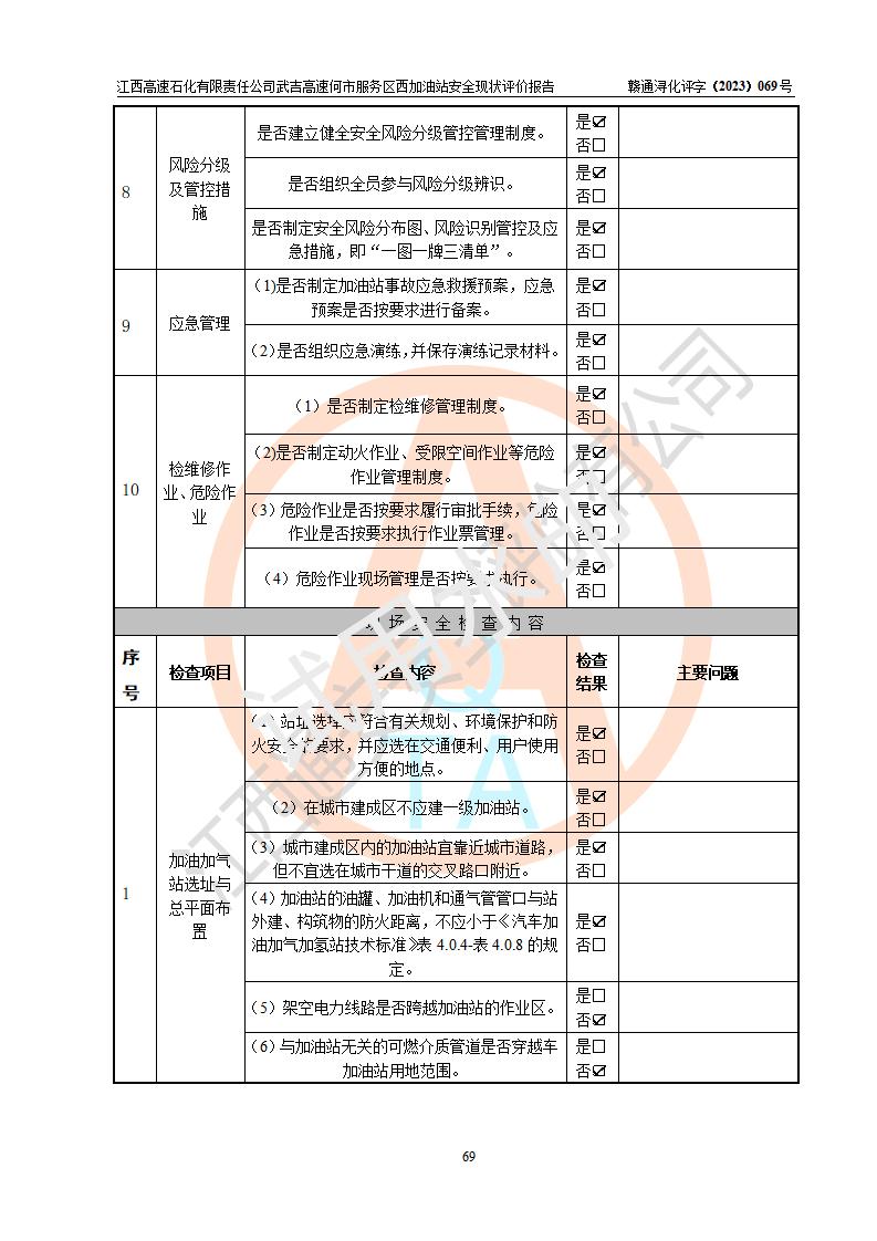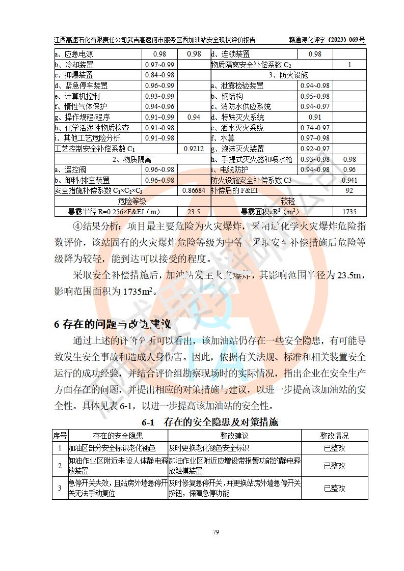 評(píng)價(jià)結(jié)論 | 江西高速石化有限責(zé)任公司武吉高速何市服務(wù)區(qū)西加油站涉及的安全條件、安全經(jīng)營(yíng)條件、安全生產(chǎn)管理符合《危險(xiǎn)化學(xué)品經(jīng)營(yíng)許可證管理辦法》、《汽車加油加氣加氫站技術(shù)標(biāo)準(zhǔn)》等**有關(guān)法規(guī)、標(biāo)準(zhǔn)、規(guī)范要求,能滿足危險(xiǎn)化學(xué)品經(jīng)營(yíng)安全條件。 | |||