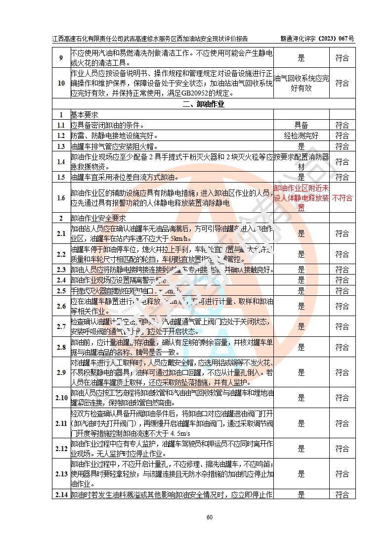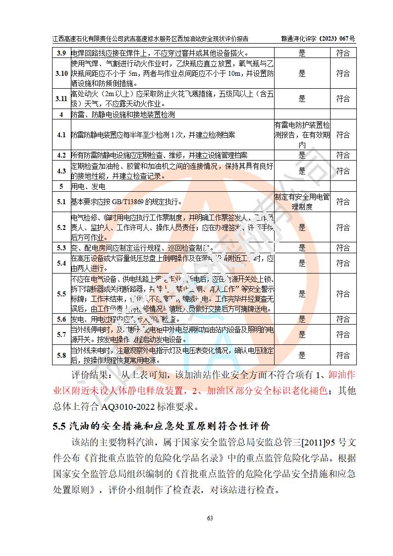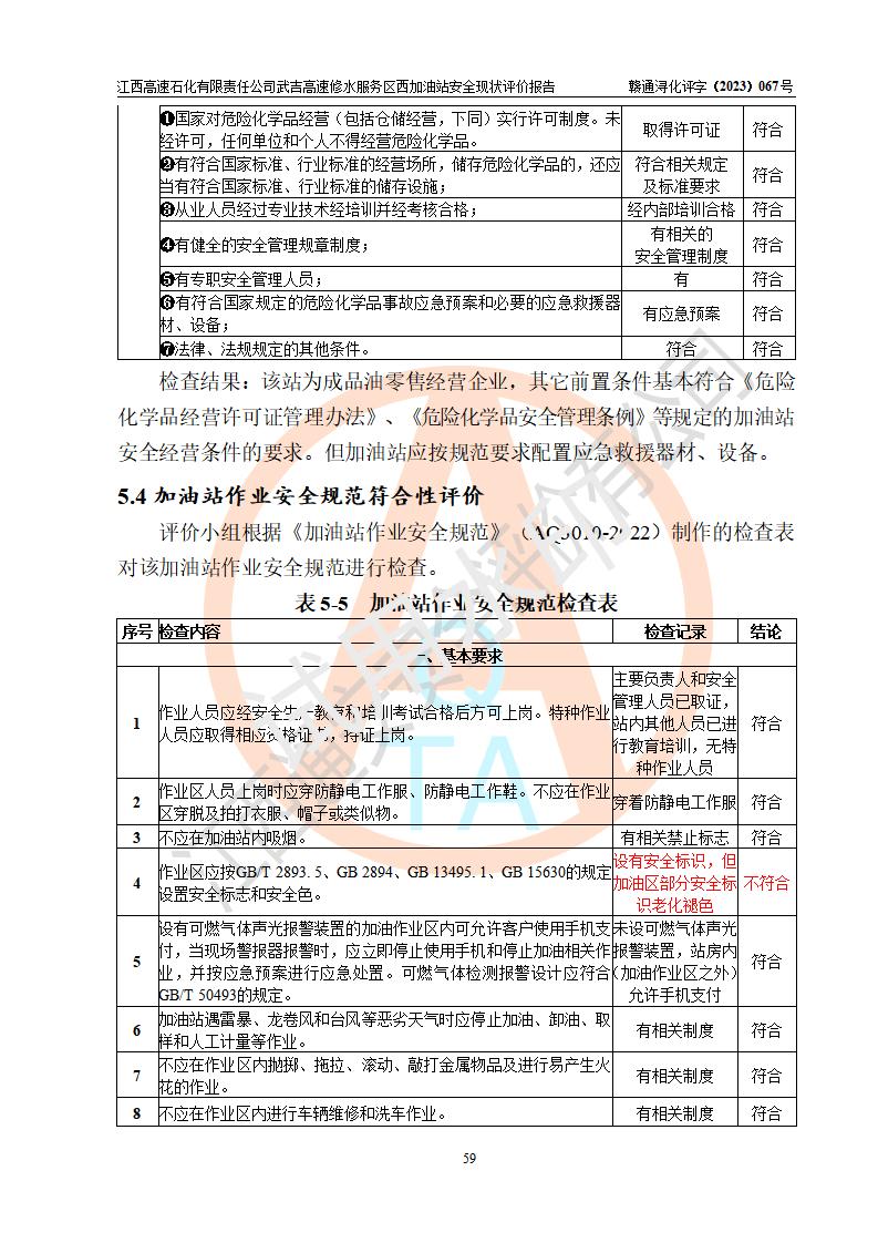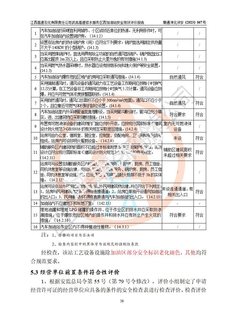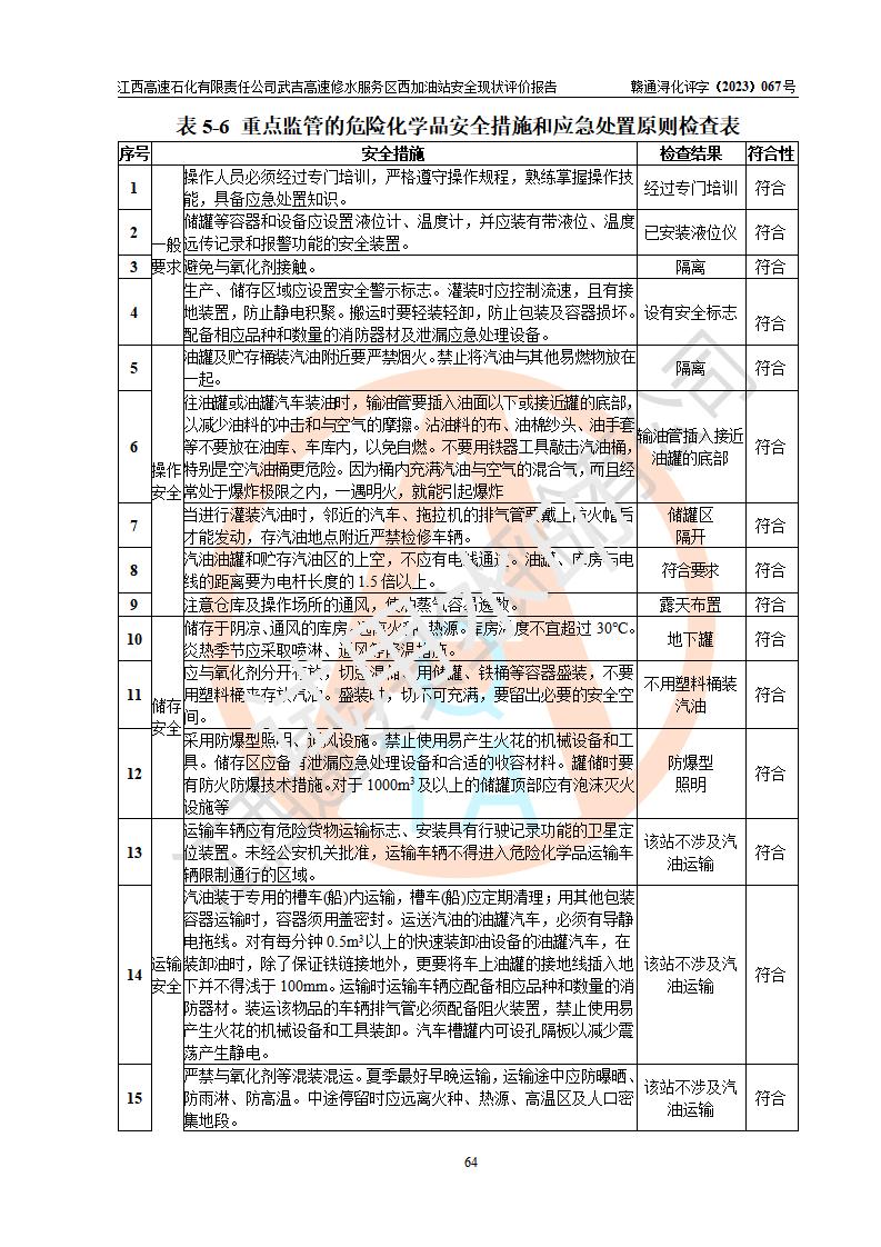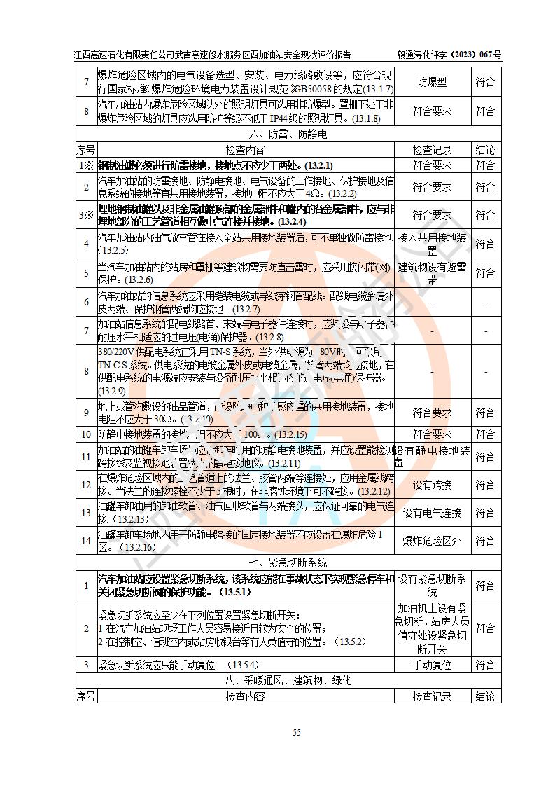 評價結(jié)論 | 江西高速石化有限責任公司武吉高速修水服務區(qū)西加油站涉及的安全條件、安全經(jīng)營條件、安全生產(chǎn)管理符合《危險化學品經(jīng)營許可證管理辦法》、《汽車加油加氣加氫站技術(shù)標準》等**有關法規(guī)、標準、規(guī)范要求,能滿足危險化學品經(jīng)營安全條件。 | |||
