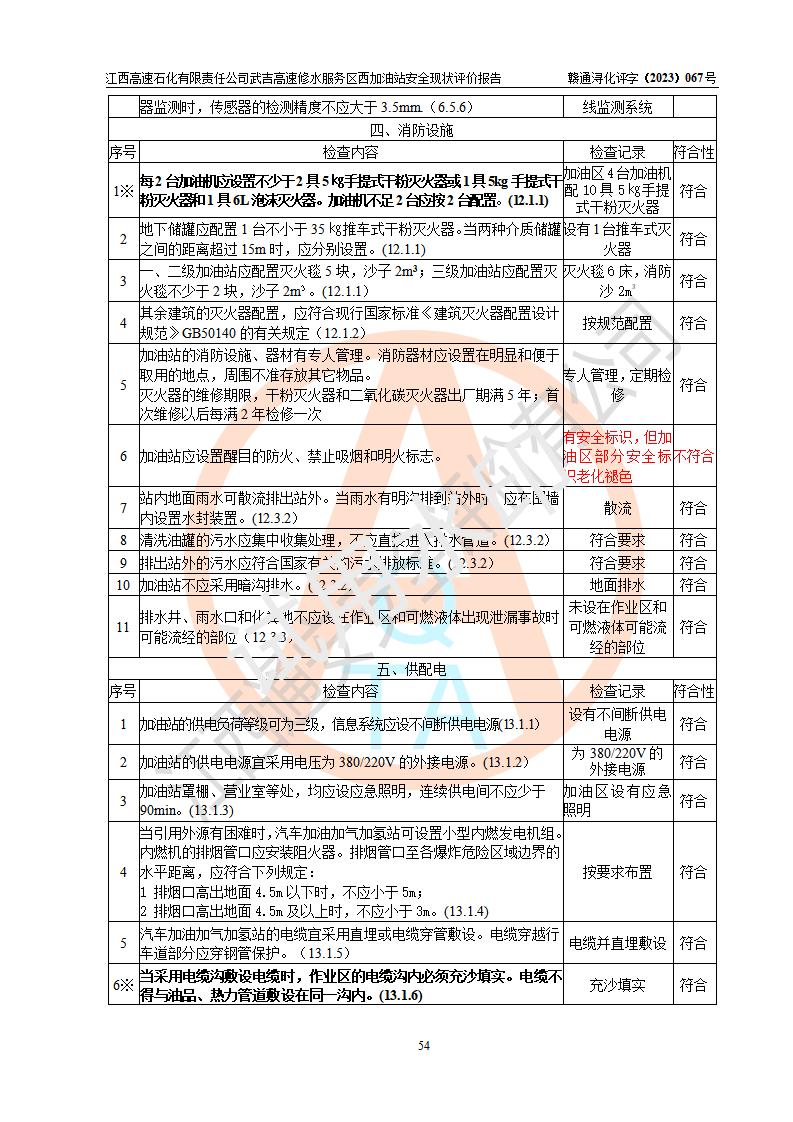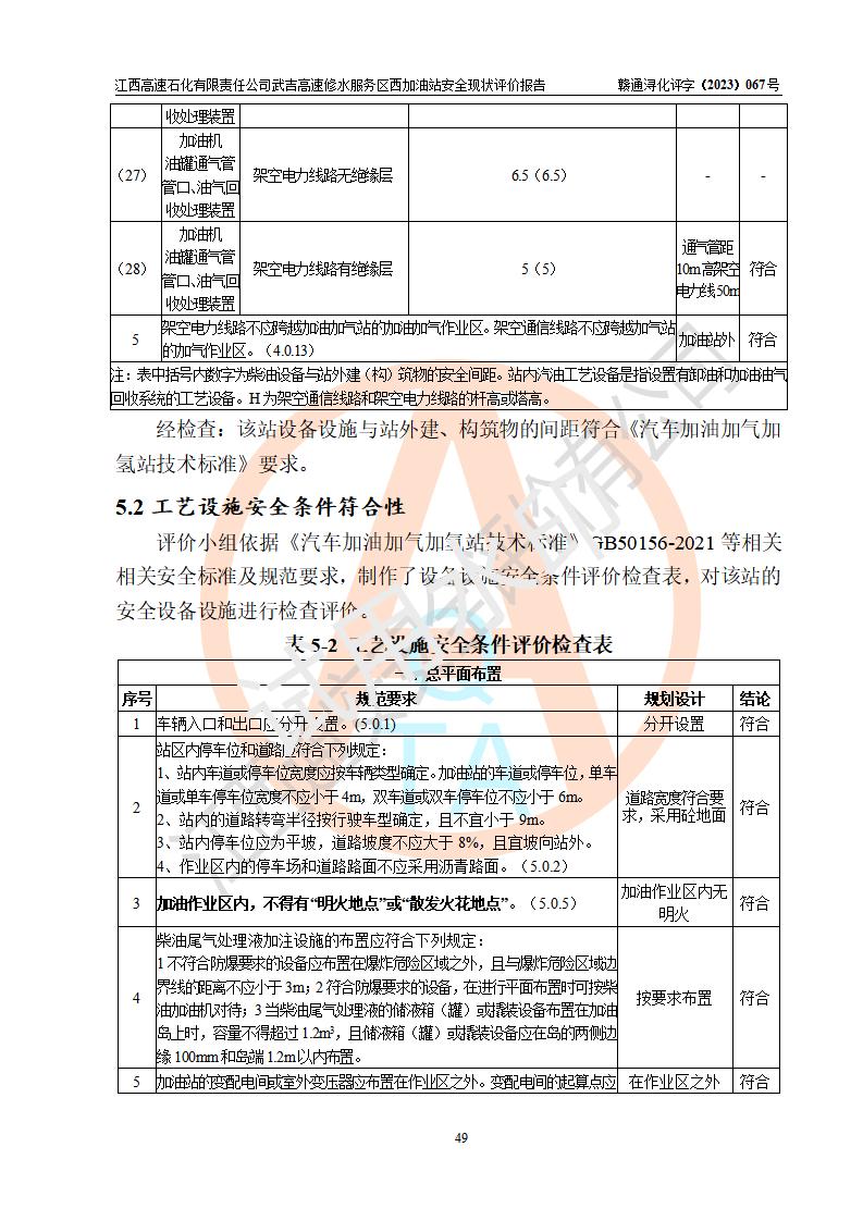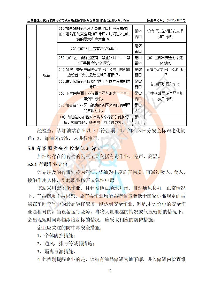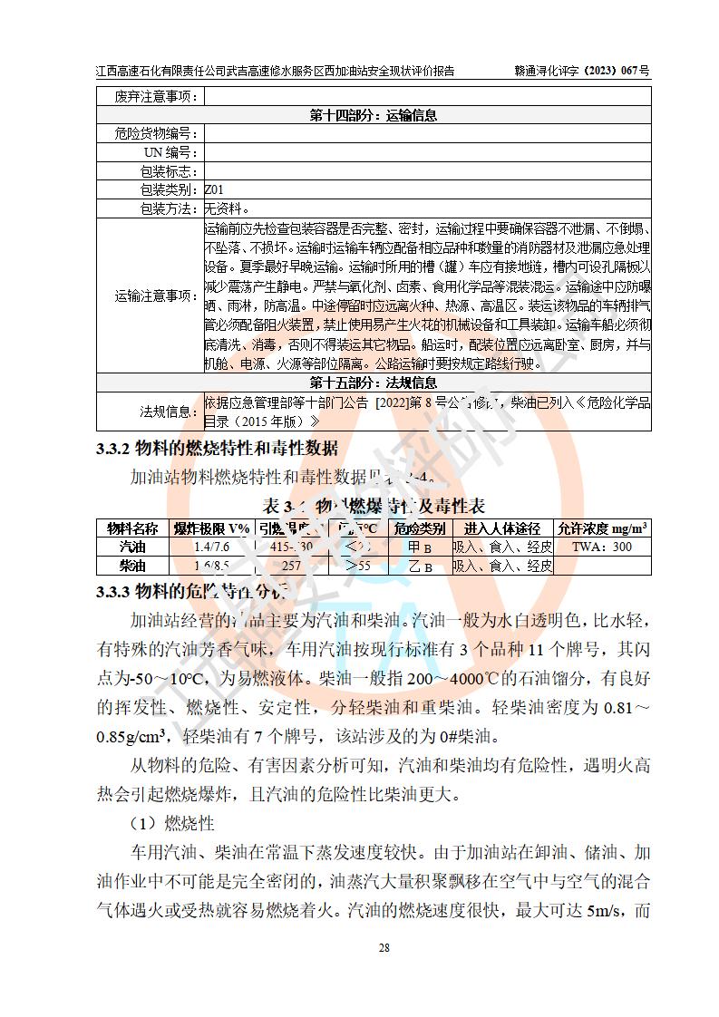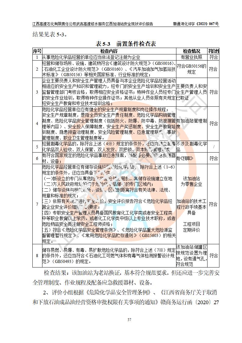 評價結(jié)論 | 江西高速石化有限責任公司武吉高速修水服務區(qū)西加油站涉及的安全條件、安全經(jīng)營條件、安全生產(chǎn)管理符合《危險化學品經(jīng)營許可證管理辦法》、《汽車加油加氣加氫站技術(shù)標準》等**有關法規(guī)、標準、規(guī)范要求,能滿足危險化學品經(jīng)營安全條件。 | |||