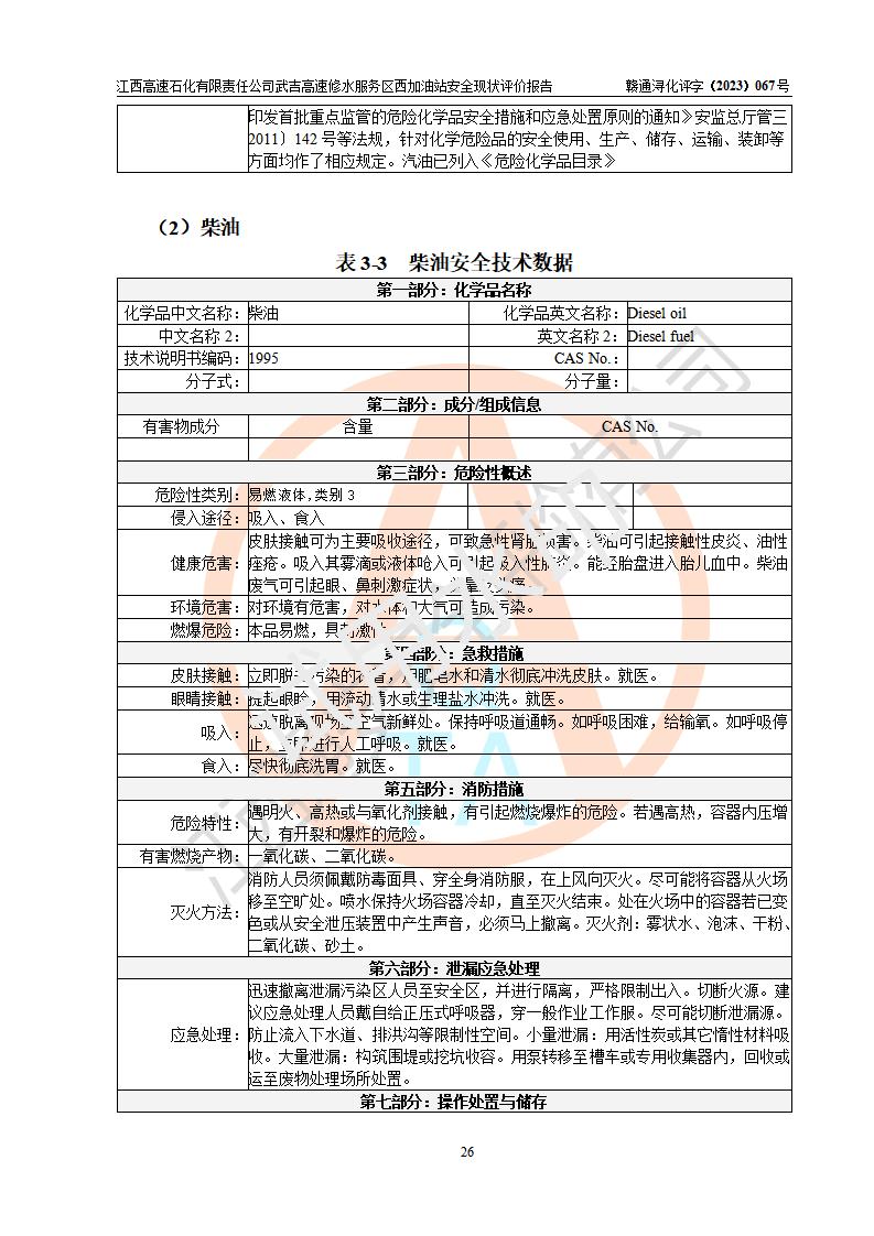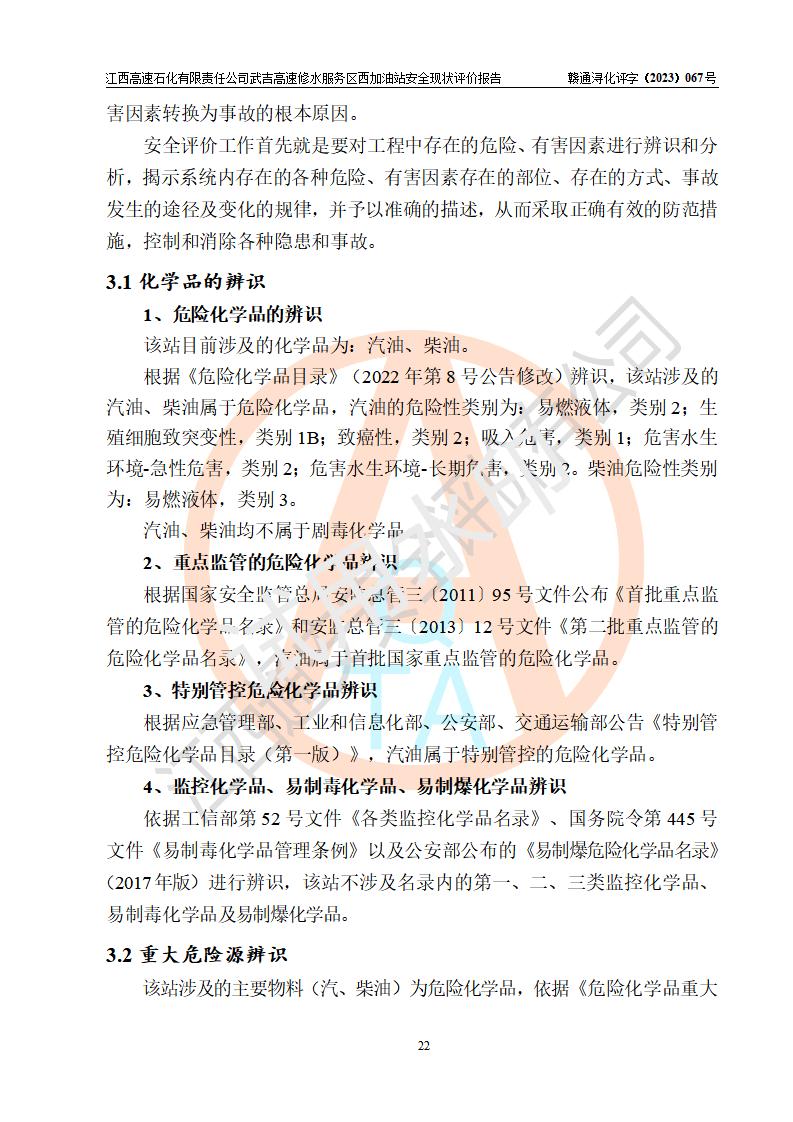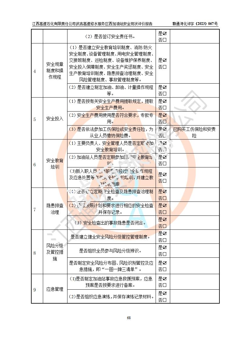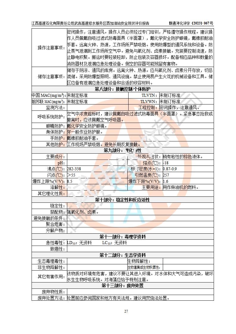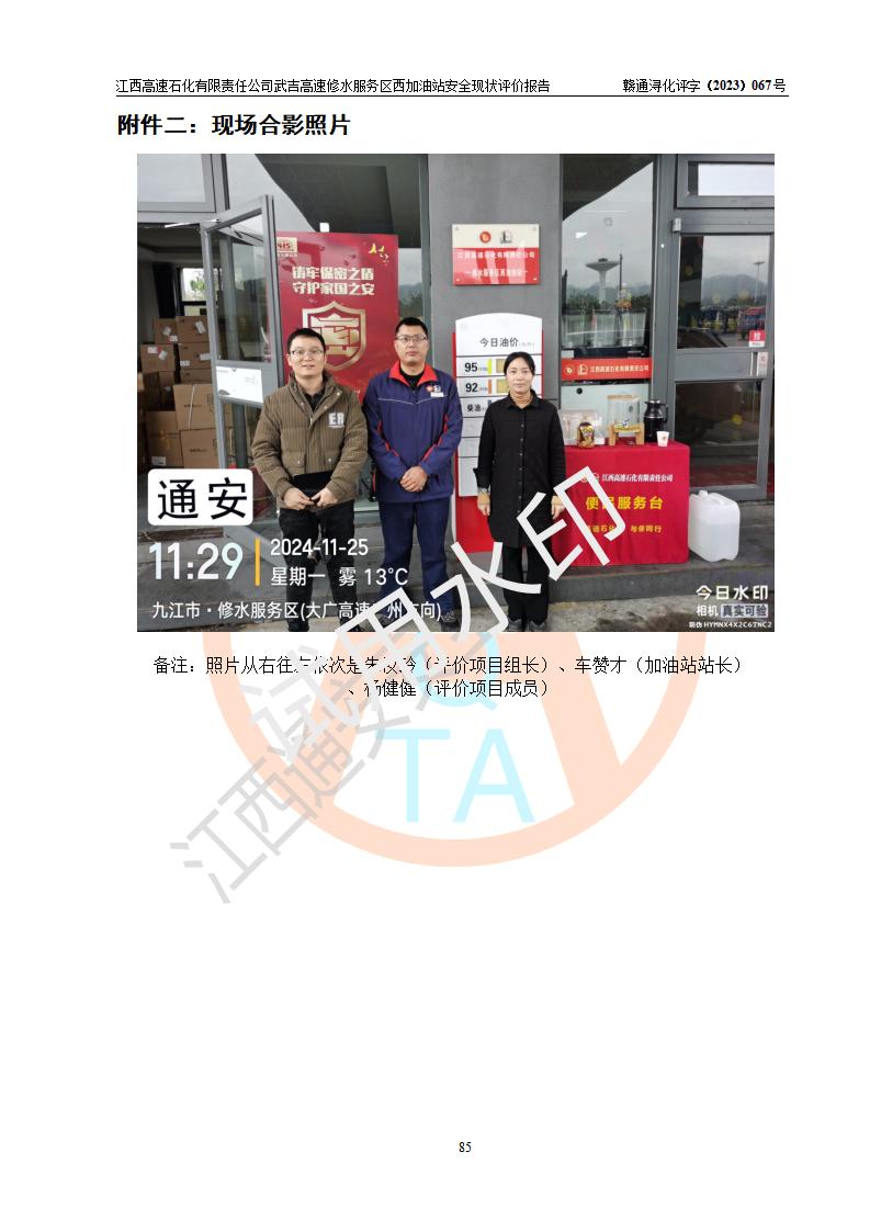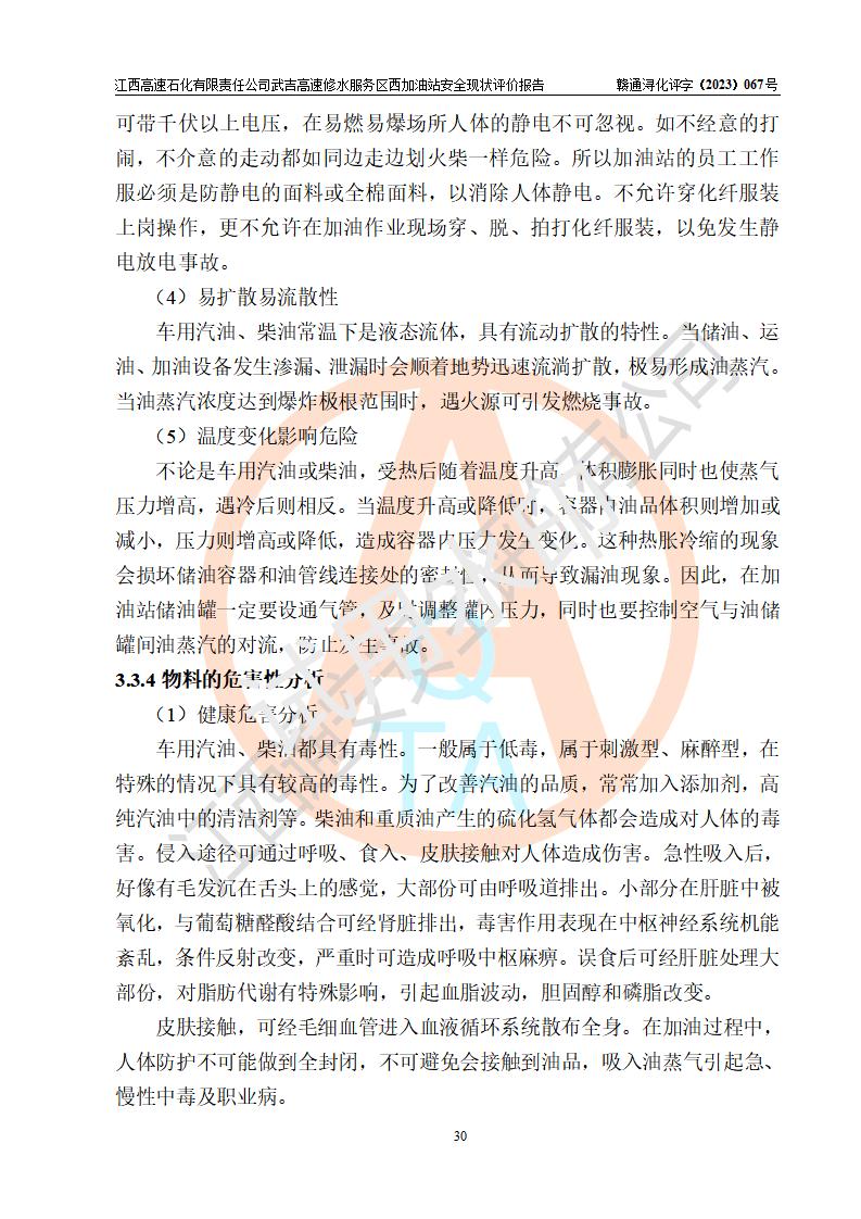 評價結(jié)論 | 江西高速石化有限責任公司武吉高速修水服務區(qū)西加油站涉及的安全條件、安全經(jīng)營條件、安全生產(chǎn)管理符合《危險化學品經(jīng)營許可證管理辦法》、《汽車加油加氣加氫站技術(shù)標準》等**有關法規(guī)、標準、規(guī)范要求,能滿足危險化學品經(jīng)營安全條件。 | |||
