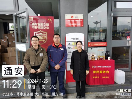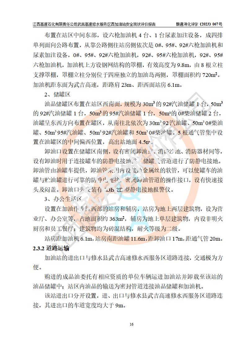 項目簡介 | 江西高速石化有限責任公司武吉高速修水服務區(qū)西加油站是一家專門從事成品油零售經(jīng)營的其他有限責任公司分公司,經(jīng)營場所位于江西省九江市修水縣武吉高速修水西服務區(qū),該站現(xiàn)有員工8人,主要負責人車贊才。 該加油站占地面積約1543.4m2,站內(nèi)設有地下直埋臥式雙層油罐5臺,分別50m3汽油罐2臺、30m3汽油罐1臺,50m3柴油罐2臺,儲罐總?cè)莘e230m3,柴油罐容積折半計入油罐總?cè)莘e則為180m3,按現(xiàn)行《汽車加油加氣加氫站技術(shù)標準》對加油站的等級劃分原則,該站屬**加油站。 該站由九江市行政審批局換發(fā)《危險化學品經(jīng)營許可證》(證號:贛九?;?jīng)字[2023]000091號),**期限2022年02月26日至2025年02月25日。 | |||