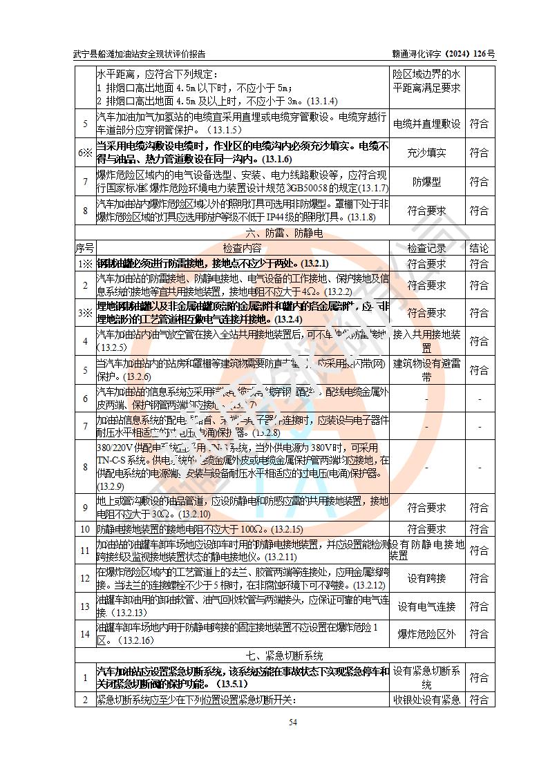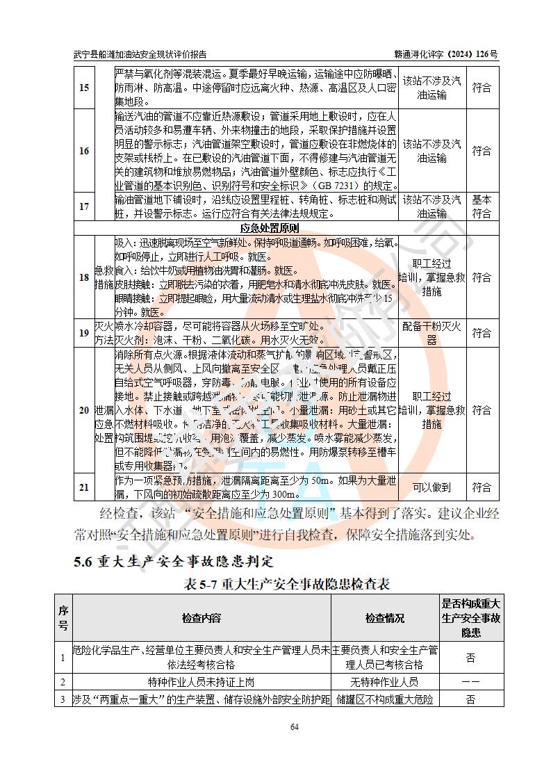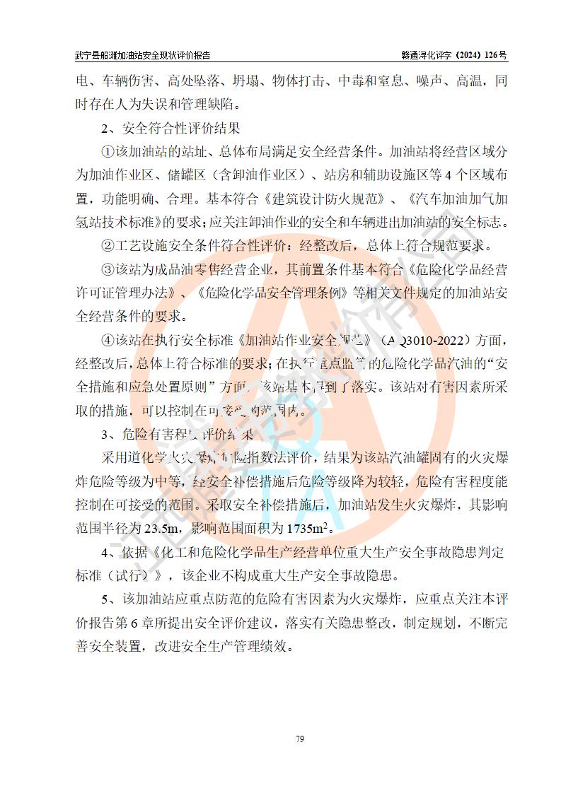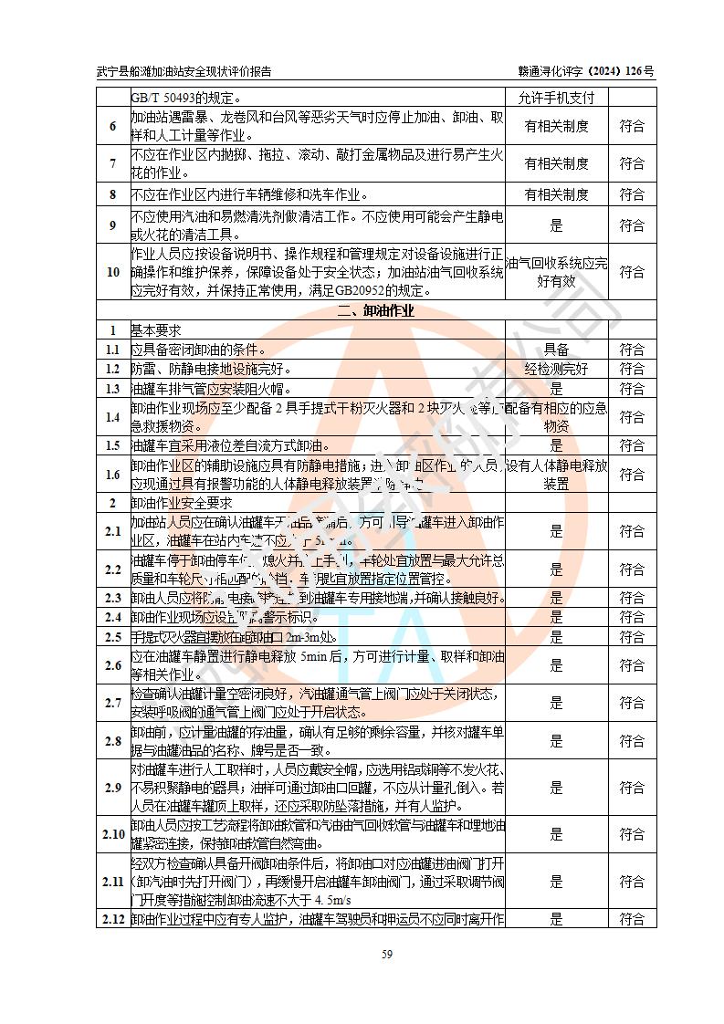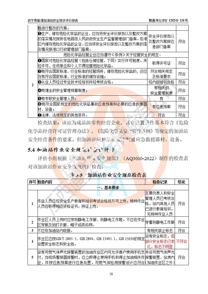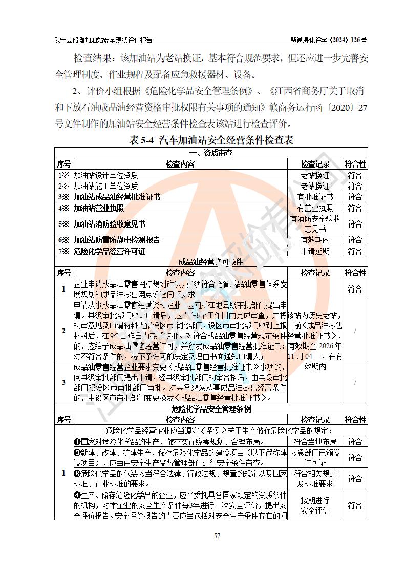 評價(jià)結(jié)論 | 武寧縣船灘加油站涉及的安全條件、安全經(jīng)營條件、安全生產(chǎn)管理符合《危險(xiǎn)化學(xué)品經(jīng)營許可證管理辦法》、《汽車加油加氣加氫站技術(shù)標(biāo)準(zhǔn)》等**有關(guān)法規(guī)、標(biāo)準(zhǔn)、規(guī)范要求,能滿足危險(xiǎn)化學(xué)品經(jīng)營安全條件。 | |||