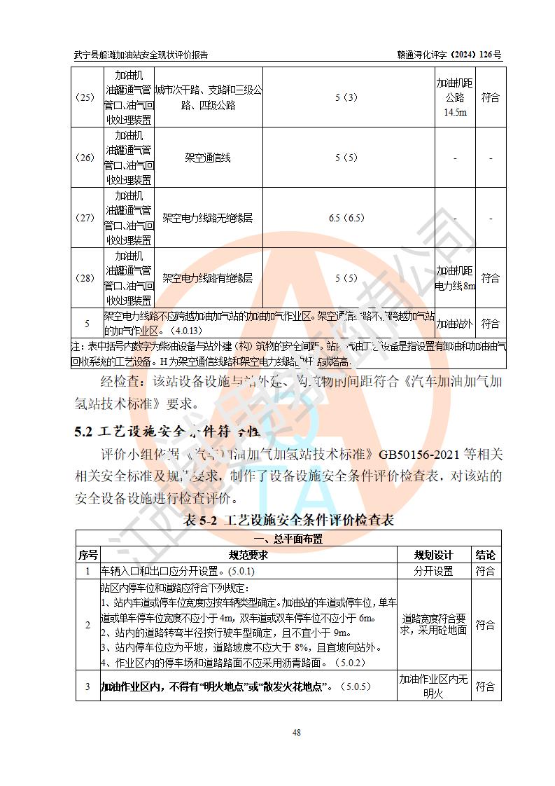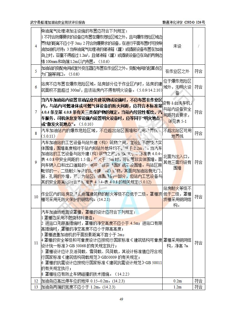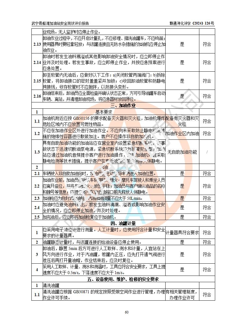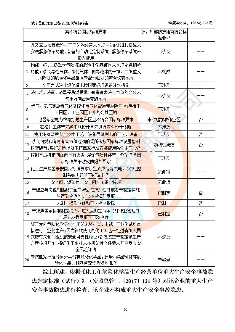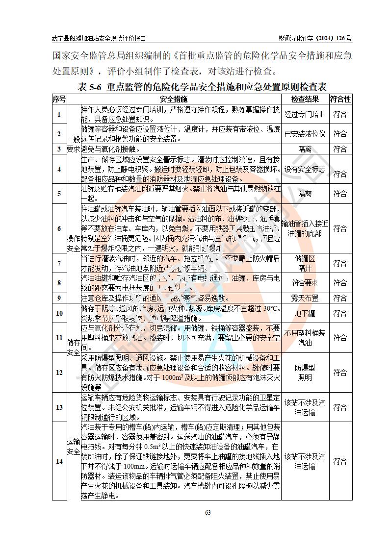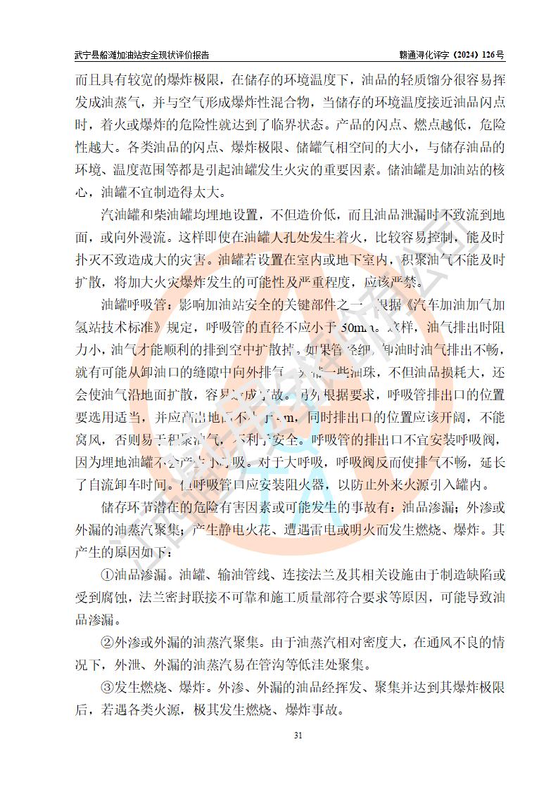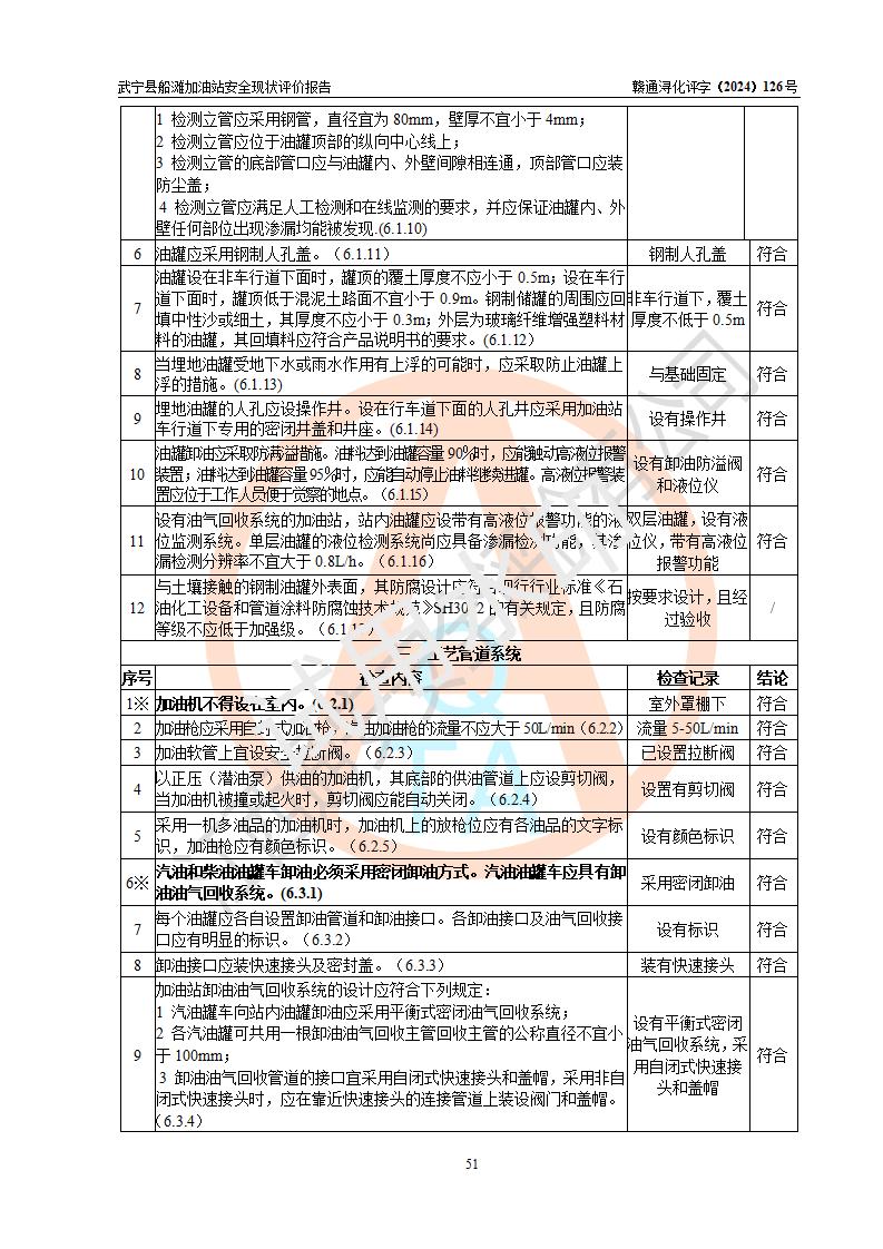 評價(jià)結(jié)論 | 武寧縣船灘加油站涉及的安全條件、安全經(jīng)營條件、安全生產(chǎn)管理符合《危險(xiǎn)化學(xué)品經(jīng)營許可證管理辦法》、《汽車加油加氣加氫站技術(shù)標(biāo)準(zhǔn)》等**有關(guān)法規(guī)、標(biāo)準(zhǔn)、規(guī)范要求,能滿足危險(xiǎn)化學(xué)品經(jīng)營安全條件。 | |||