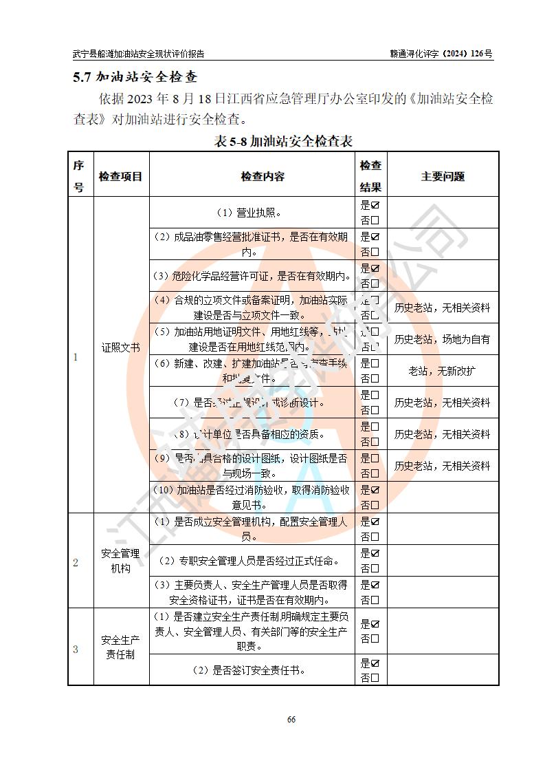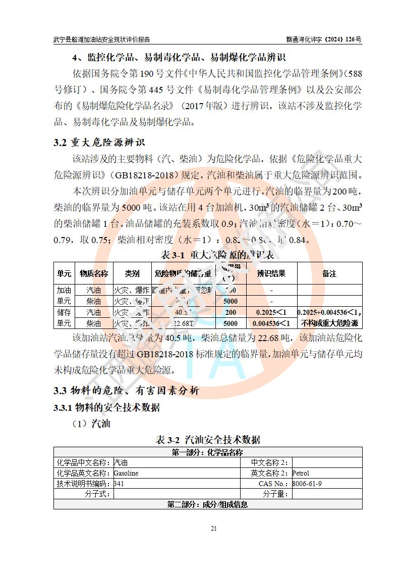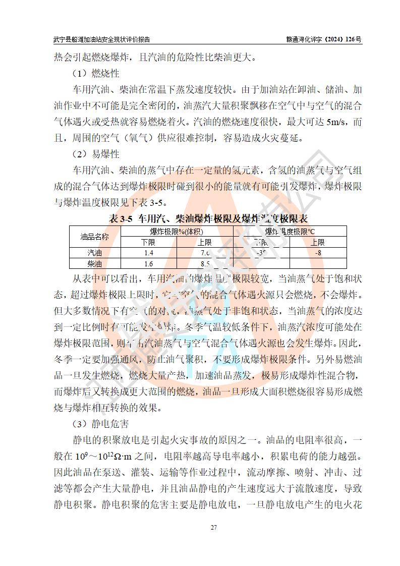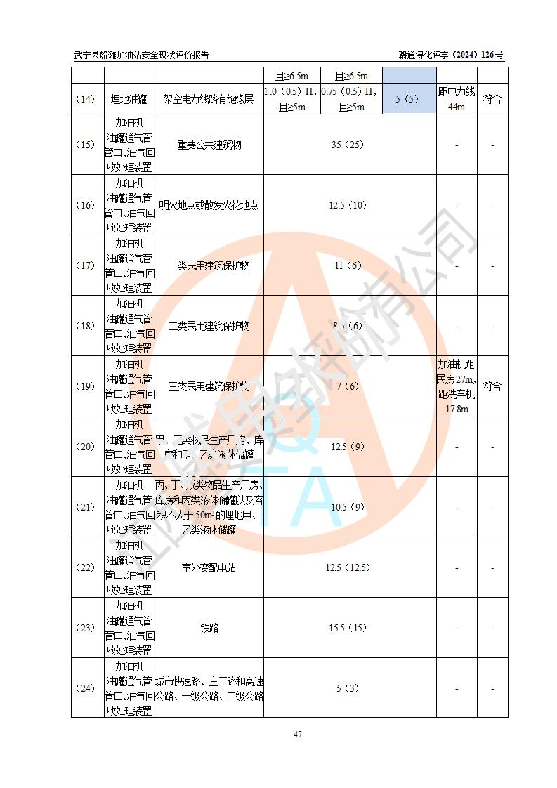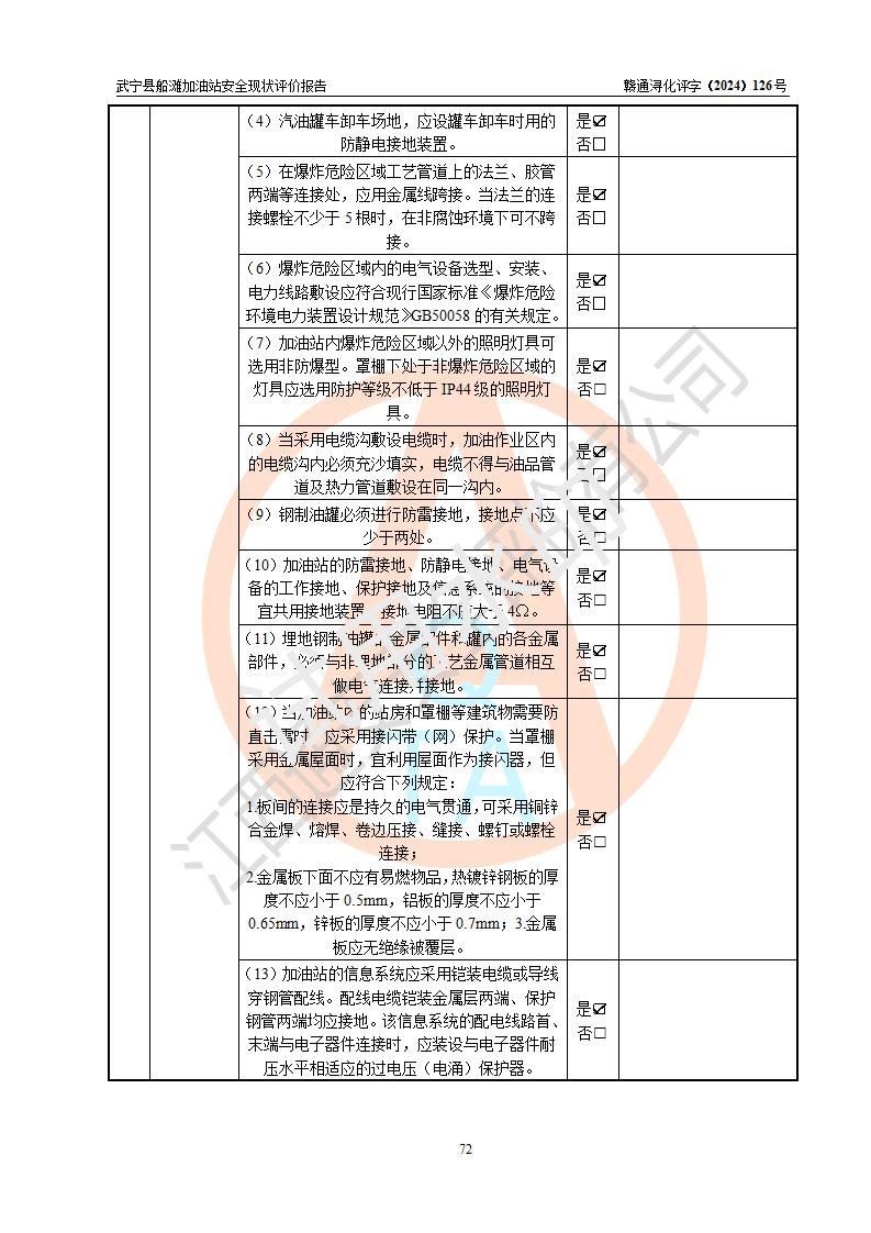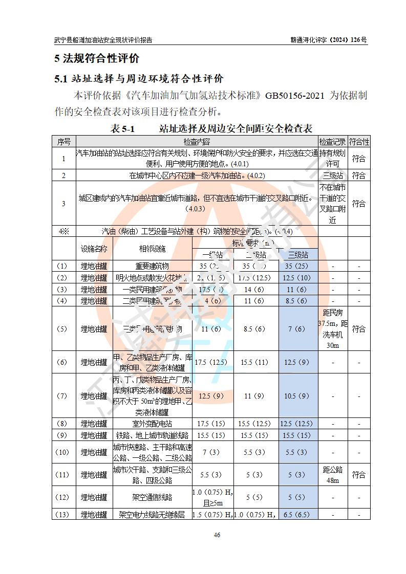 評價(jià)結(jié)論 | 武寧縣船灘加油站涉及的安全條件、安全經(jīng)營條件、安全生產(chǎn)管理符合《危險(xiǎn)化學(xué)品經(jīng)營許可證管理辦法》、《汽車加油加氣加氫站技術(shù)標(biāo)準(zhǔn)》等**有關(guān)法規(guī)、標(biāo)準(zhǔn)、規(guī)范要求,能滿足危險(xiǎn)化學(xué)品經(jīng)營安全條件。 | |||