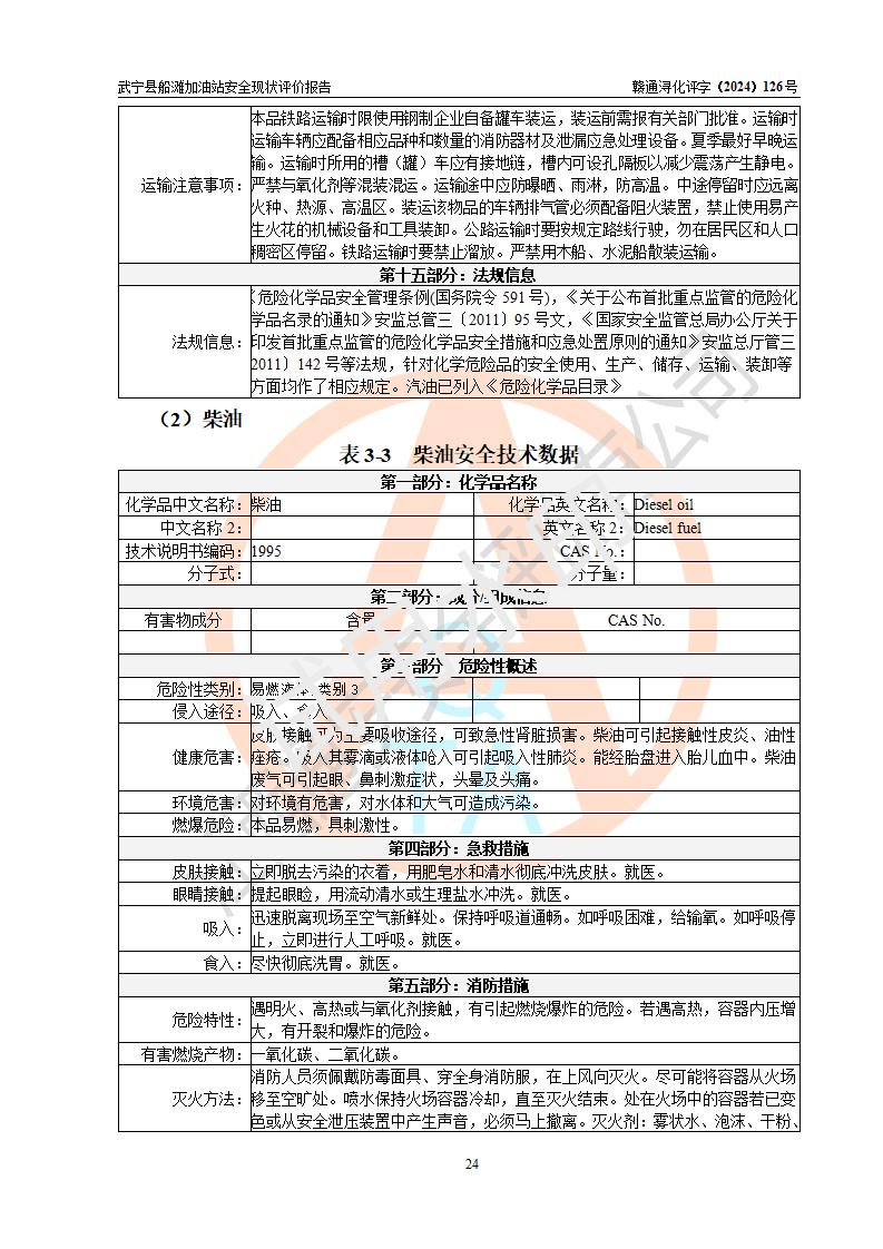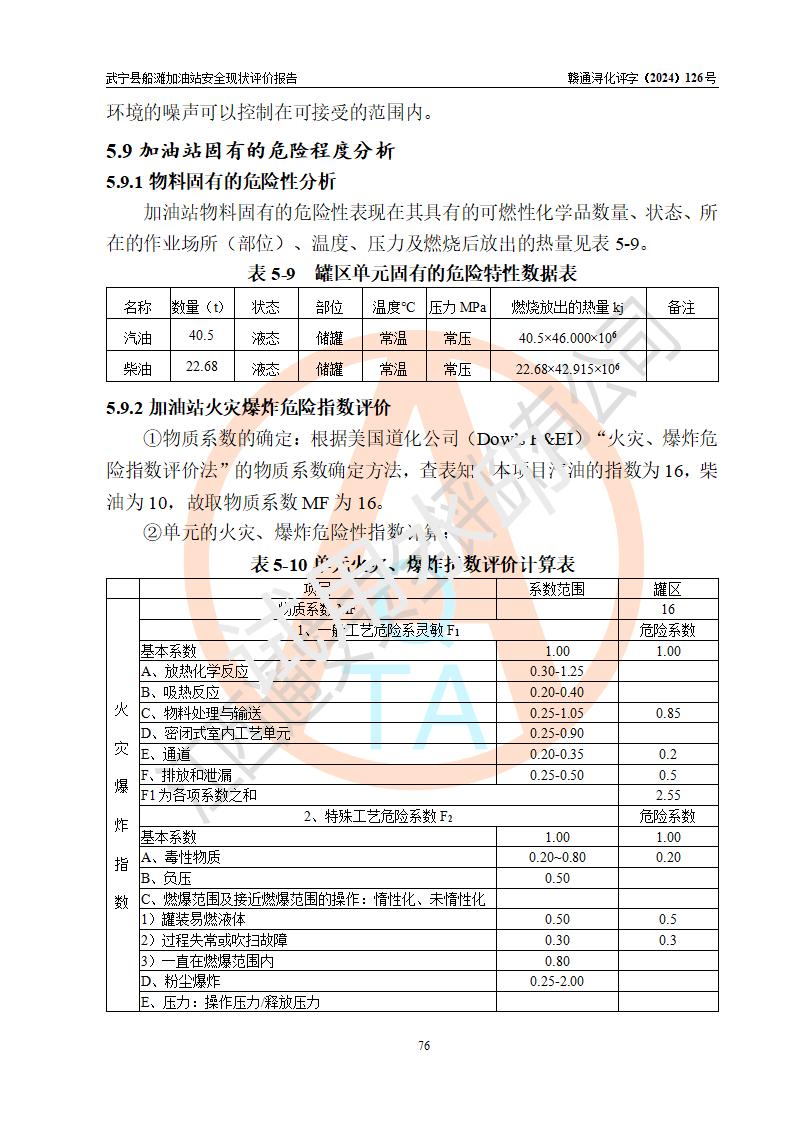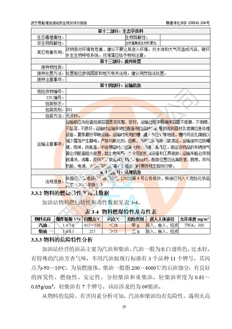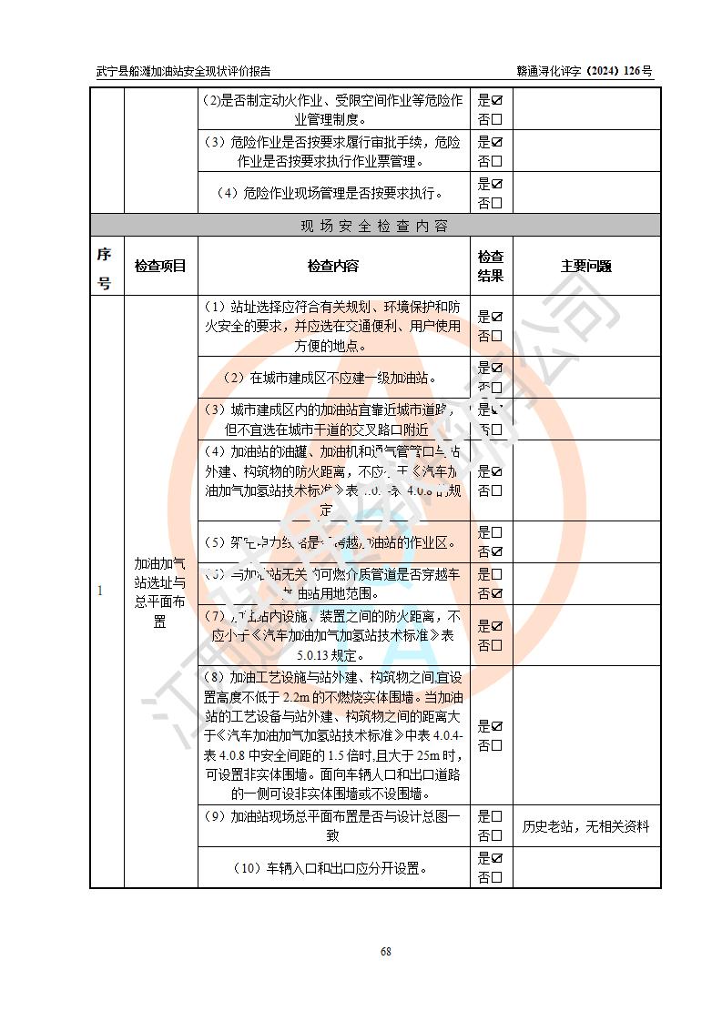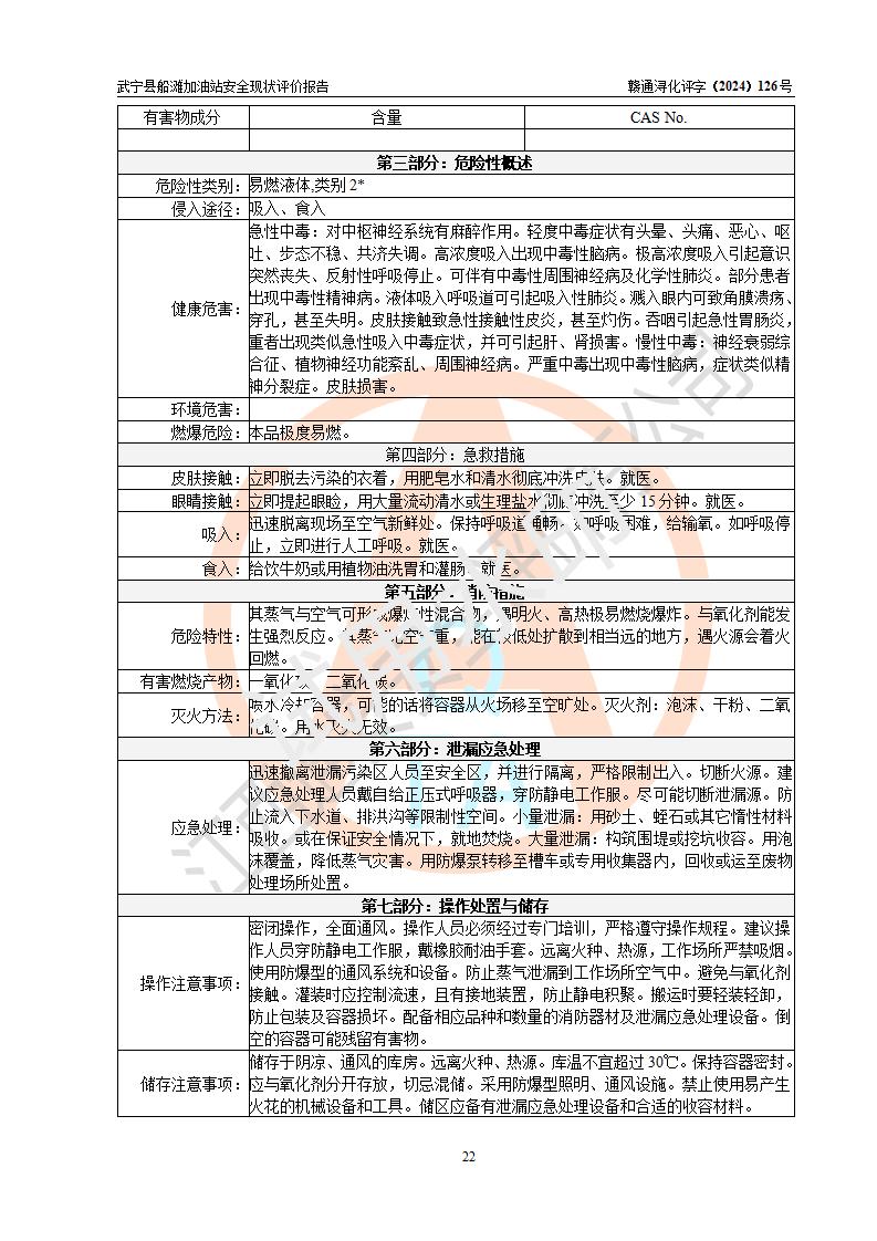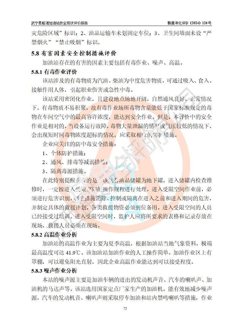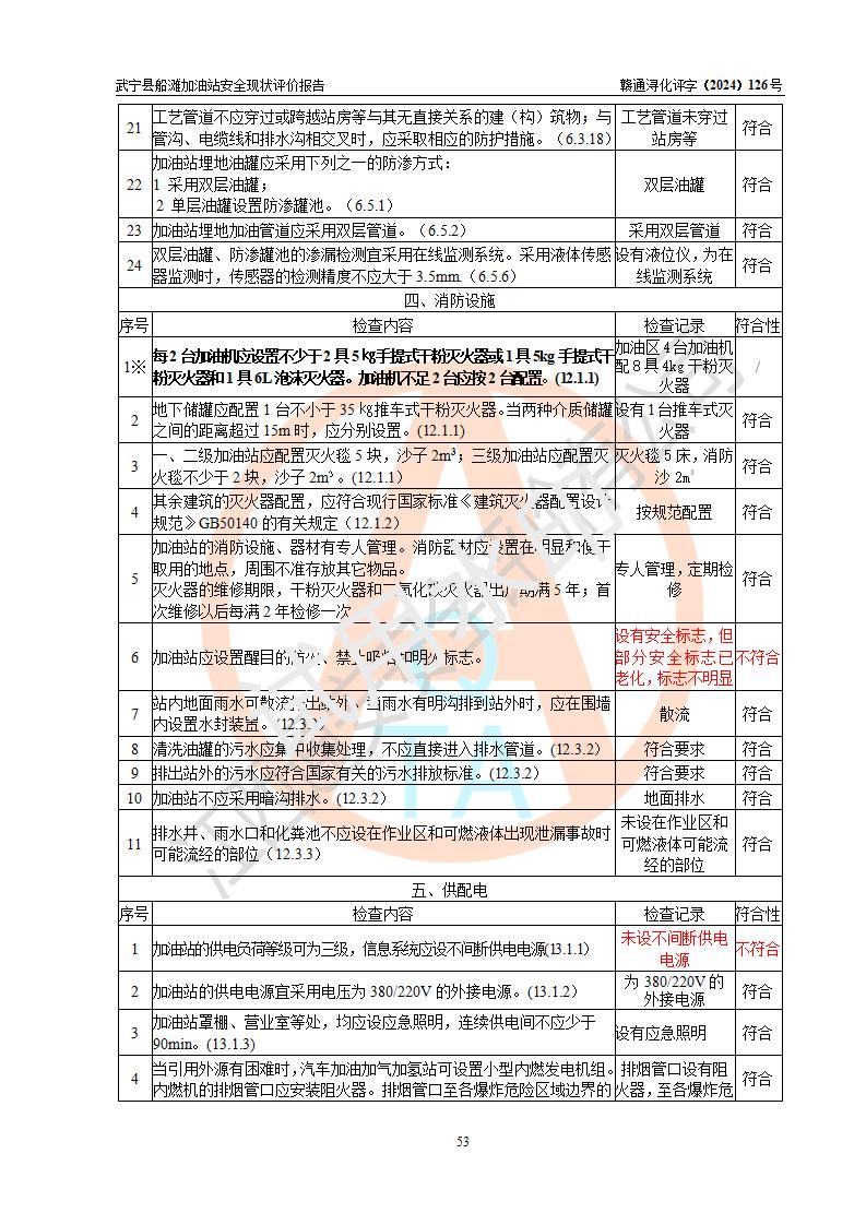 評價(jià)結(jié)論 | 武寧縣船灘加油站涉及的安全條件、安全經(jīng)營條件、安全生產(chǎn)管理符合《危險(xiǎn)化學(xué)品經(jīng)營許可證管理辦法》、《汽車加油加氣加氫站技術(shù)標(biāo)準(zhǔn)》等**有關(guān)法規(guī)、標(biāo)準(zhǔn)、規(guī)范要求,能滿足危險(xiǎn)化學(xué)品經(jīng)營安全條件。 | |||