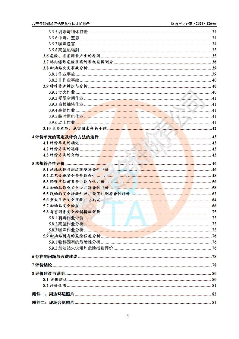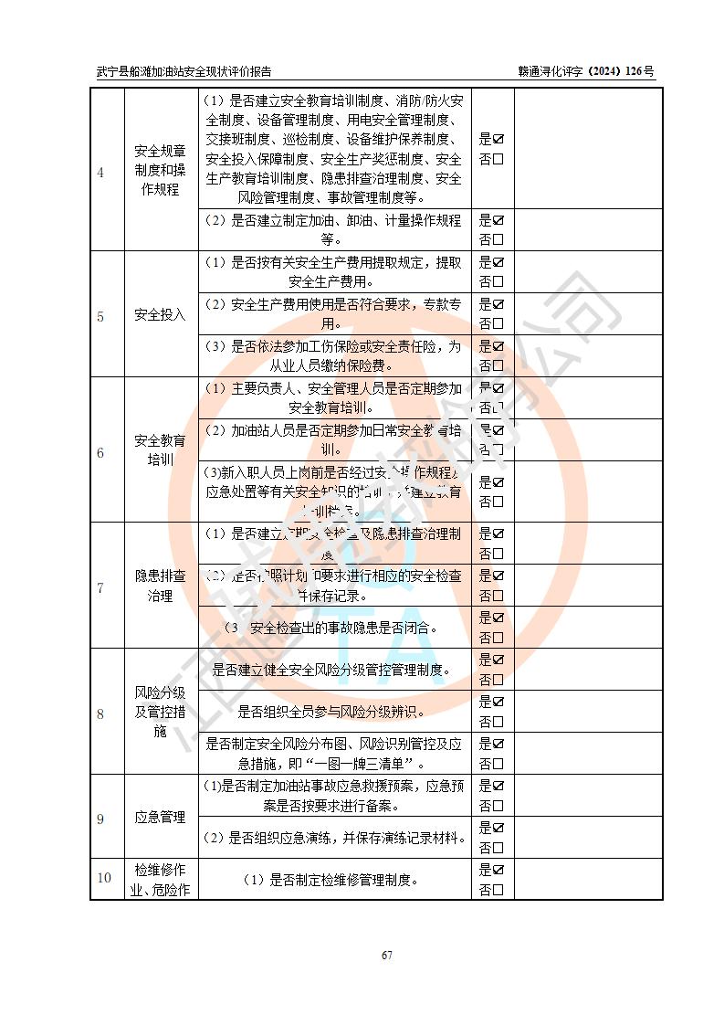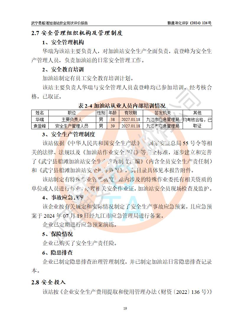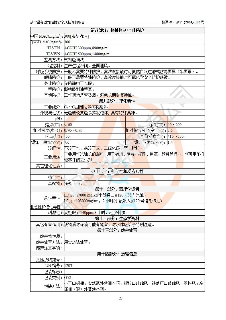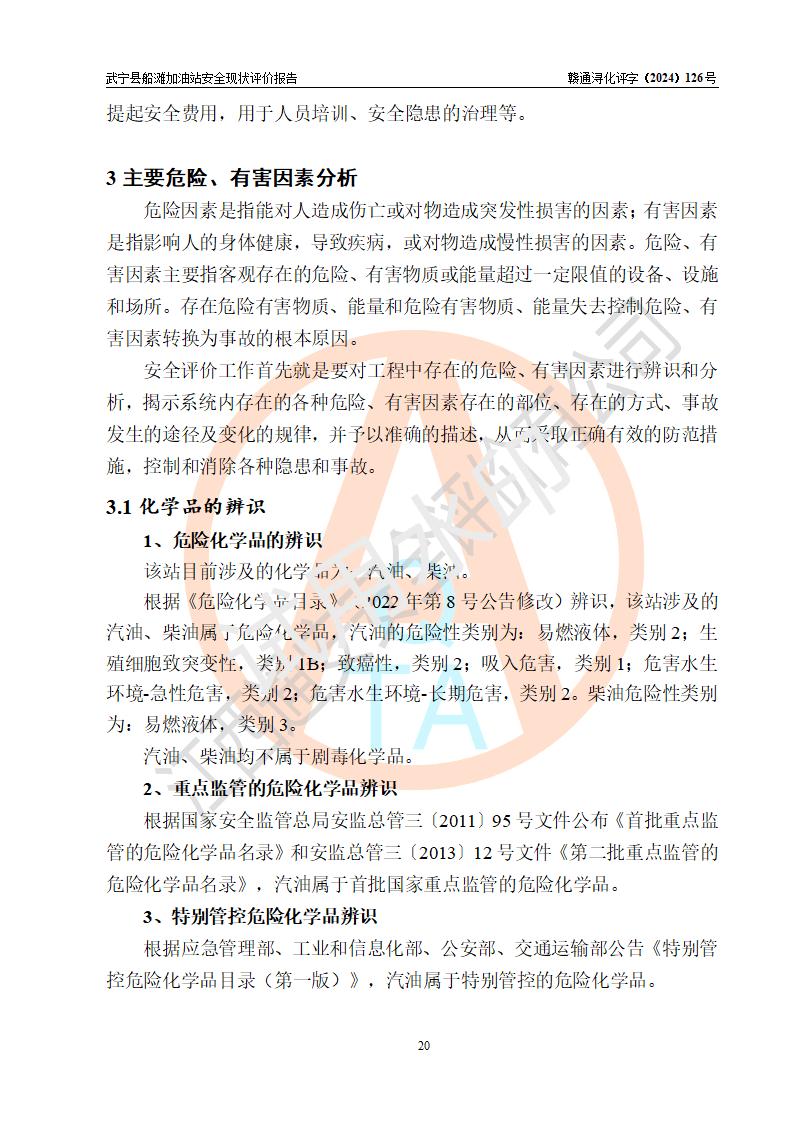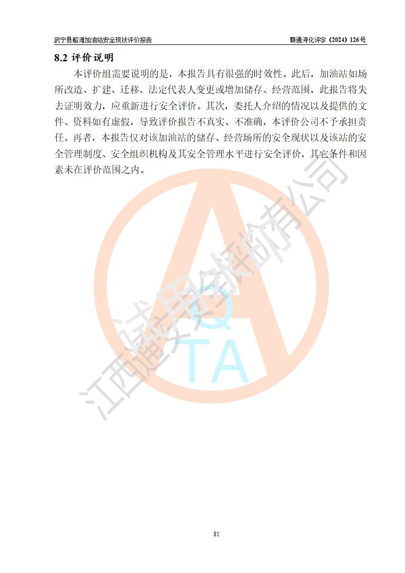 評價(jià)結(jié)論 | 武寧縣船灘加油站涉及的安全條件、安全經(jīng)營條件、安全生產(chǎn)管理符合《危險(xiǎn)化學(xué)品經(jīng)營許可證管理辦法》、《汽車加油加氣加氫站技術(shù)標(biāo)準(zhǔn)》等**有關(guān)法規(guī)、標(biāo)準(zhǔn)、規(guī)范要求,能滿足危險(xiǎn)化學(xué)品經(jīng)營安全條件。 | |||
