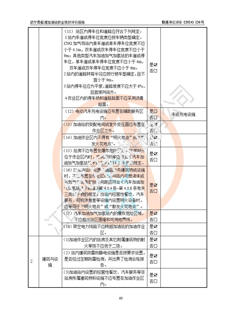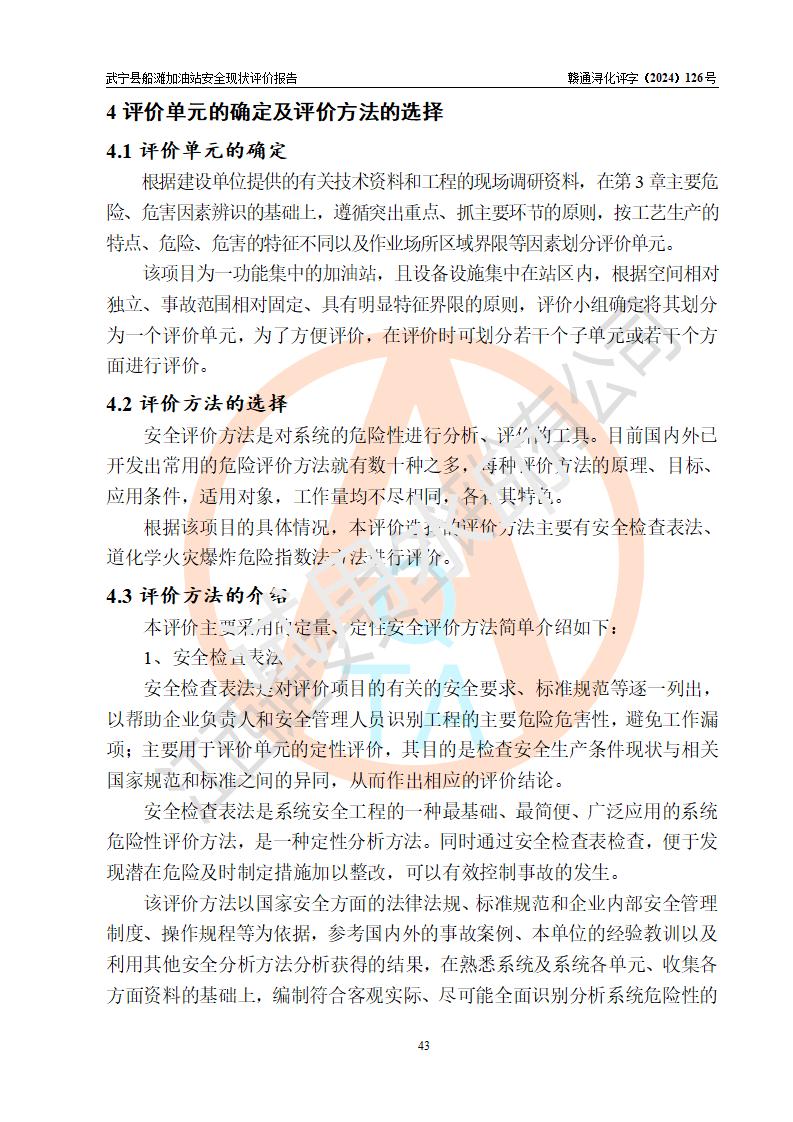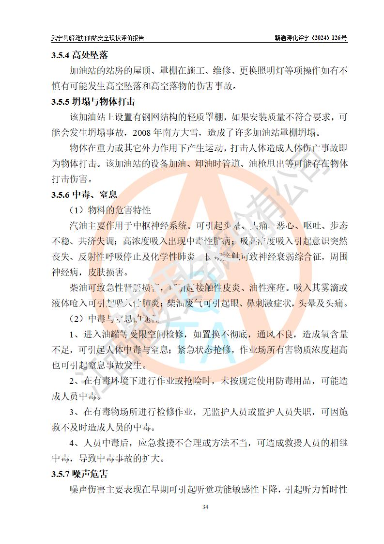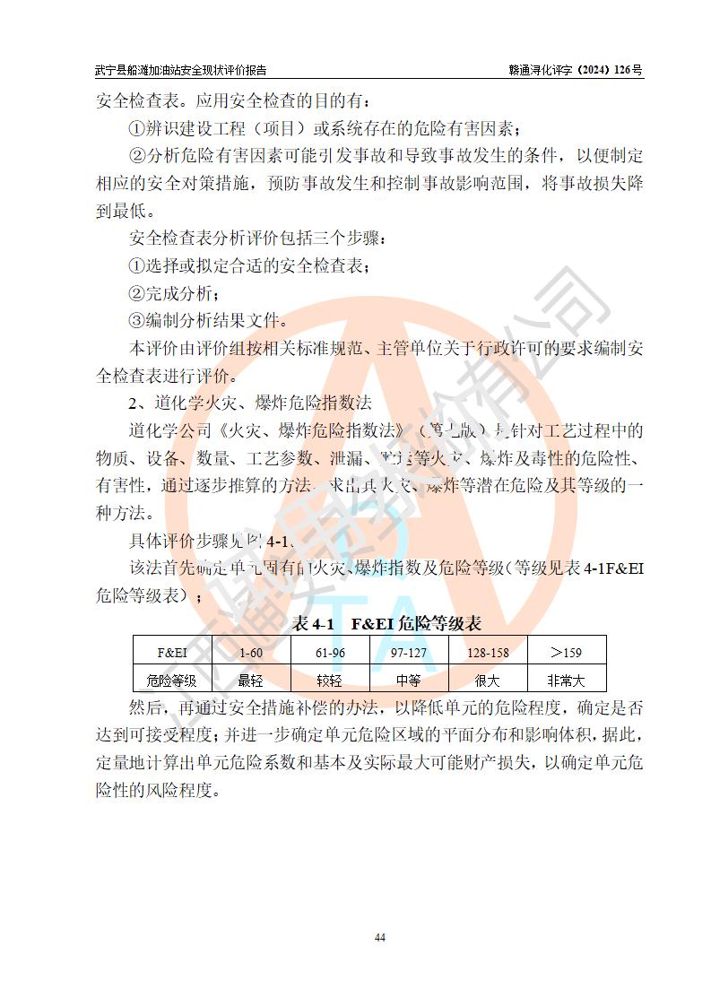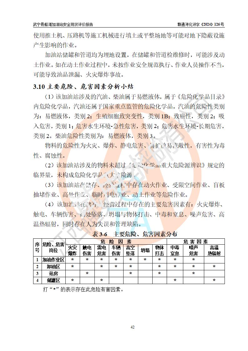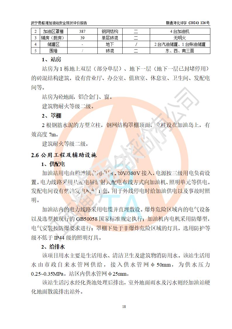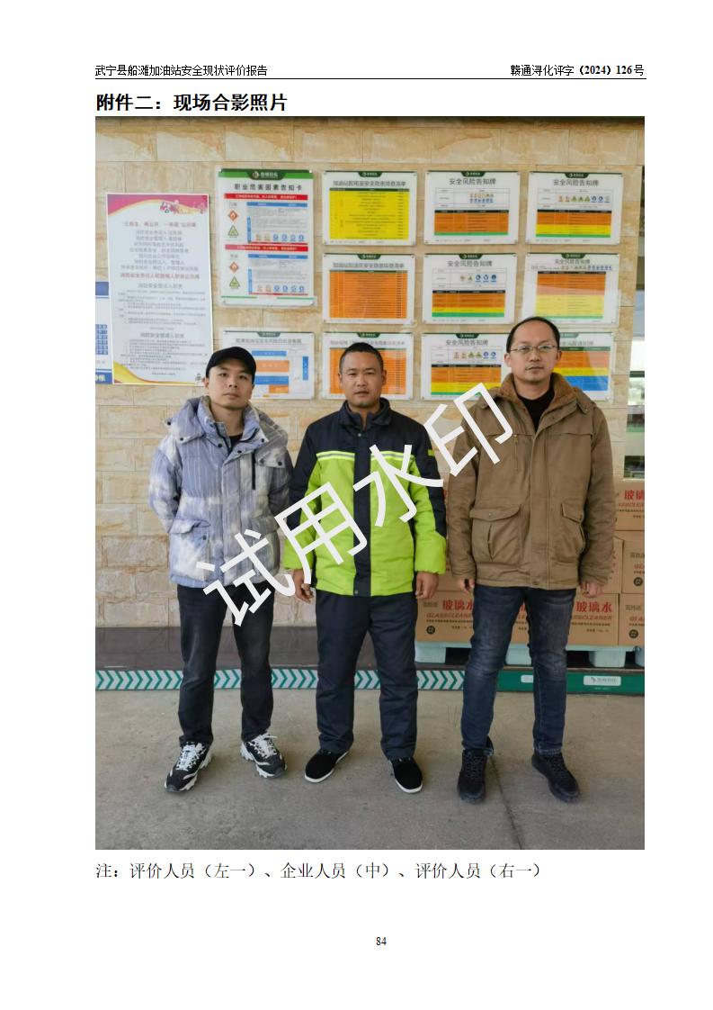 評價(jià)結(jié)論 | 武寧縣船灘加油站涉及的安全條件、安全經(jīng)營條件、安全生產(chǎn)管理符合《危險(xiǎn)化學(xué)品經(jīng)營許可證管理辦法》、《汽車加油加氣加氫站技術(shù)標(biāo)準(zhǔn)》等**有關(guān)法規(guī)、標(biāo)準(zhǔn)、規(guī)范要求,能滿足危險(xiǎn)化學(xué)品經(jīng)營安全條件。 | |||