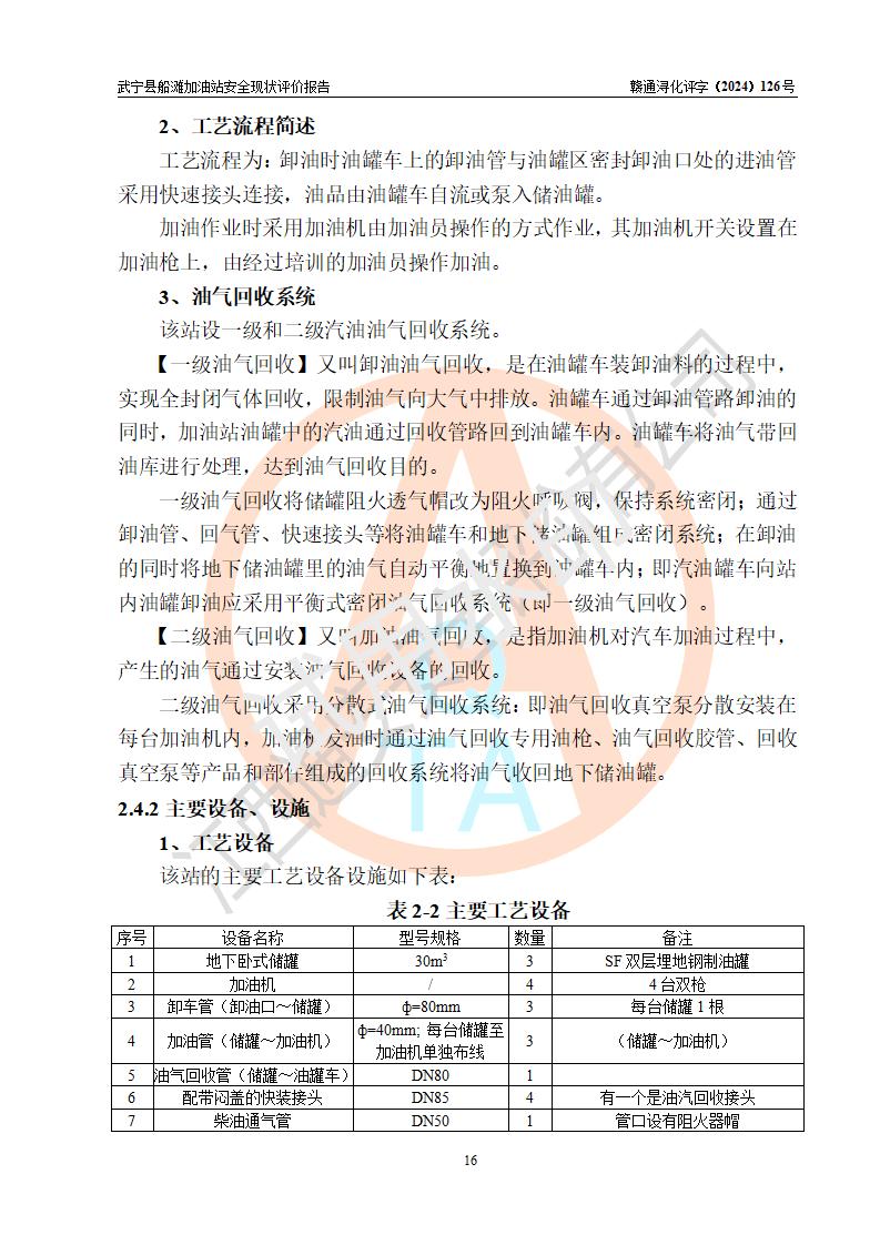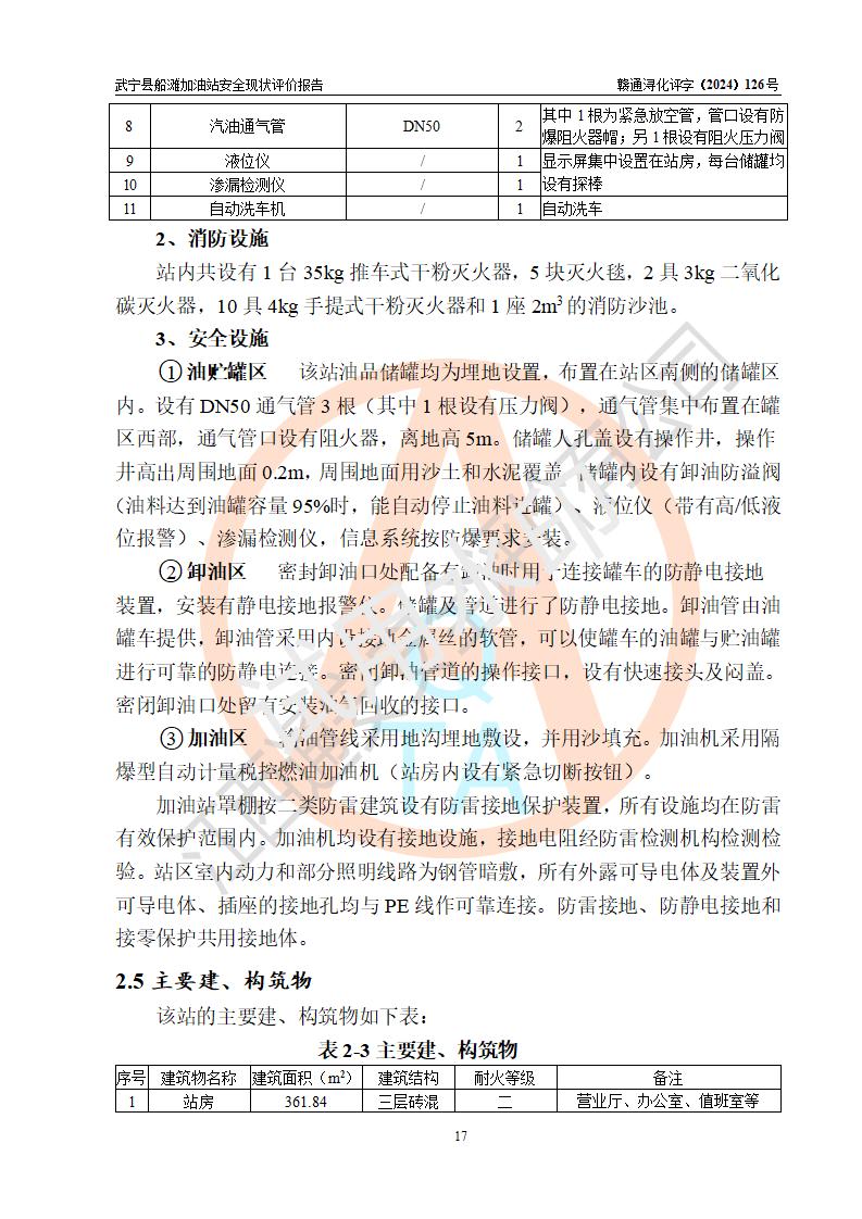 項(xiàng)目簡介 | 武寧縣船灘加油站是一家專門從事成品油零售經(jīng)營的個(gè)體工商戶,經(jīng)營場所位于江西省九江市武寧縣船灘集鎮(zhèn)?,F(xiàn)有從業(yè)人員7名,其中安全管理人員1人,加油站負(fù)責(zé)人華瑞。 該加油站占地面積約2000m2,站區(qū)內(nèi)設(shè)置有4臺雙槍程控燃油加油機(jī)及配套的工藝管線,設(shè)有SF雙層儲罐3臺,其中30m3的92#汽油儲罐1臺、30m3的0#柴油儲罐1臺、30m3的95#汽油儲罐1臺,油品儲罐總?cè)莘e為90m3(折算成汽油為75m3),按現(xiàn)行《汽車加油加氣加氫站技術(shù)標(biāo)準(zhǔn)》對加油站的等級劃分原則,屬三級加油站。 該站由九江市行政審批局換發(fā)《危險(xiǎn)化學(xué)品經(jīng)營許可證》(證號:贛九行審經(jīng)(甲)字[2022]000025號),**期限2022年02月23日至2025年02月22日。 | |||