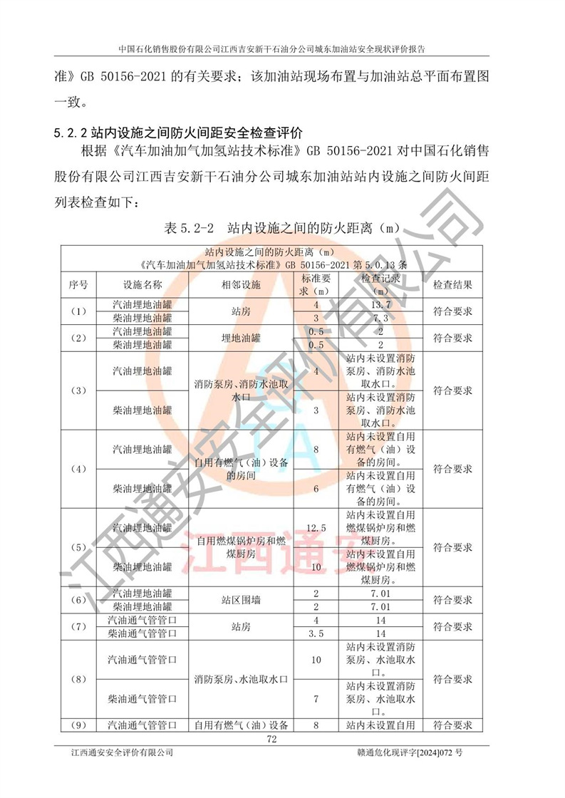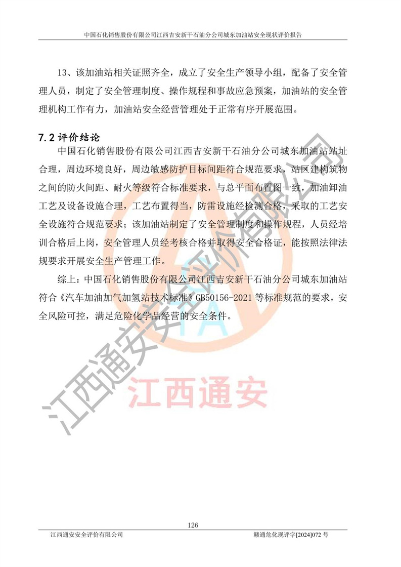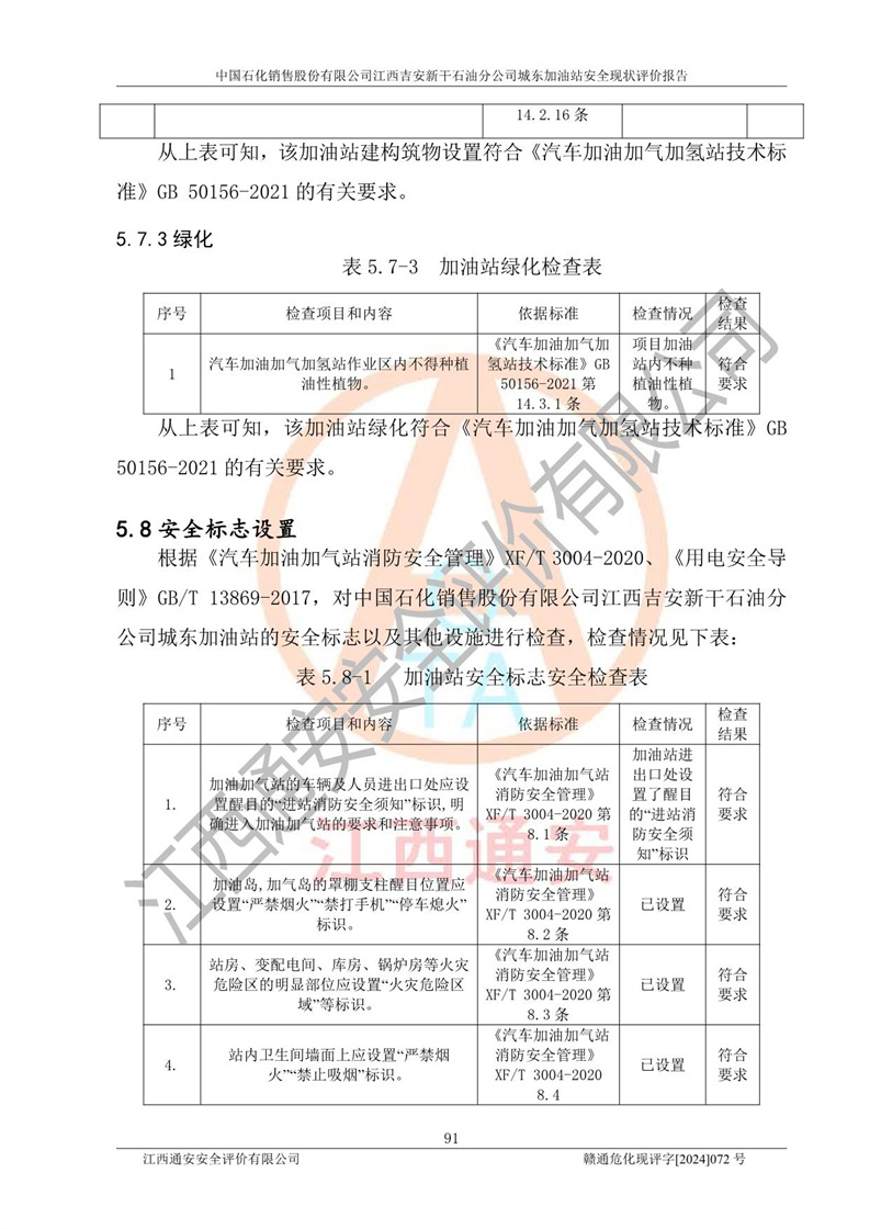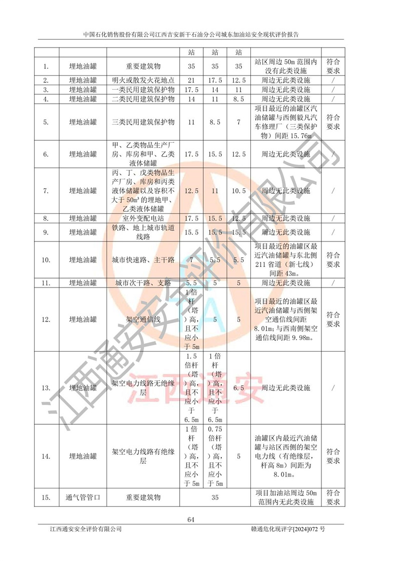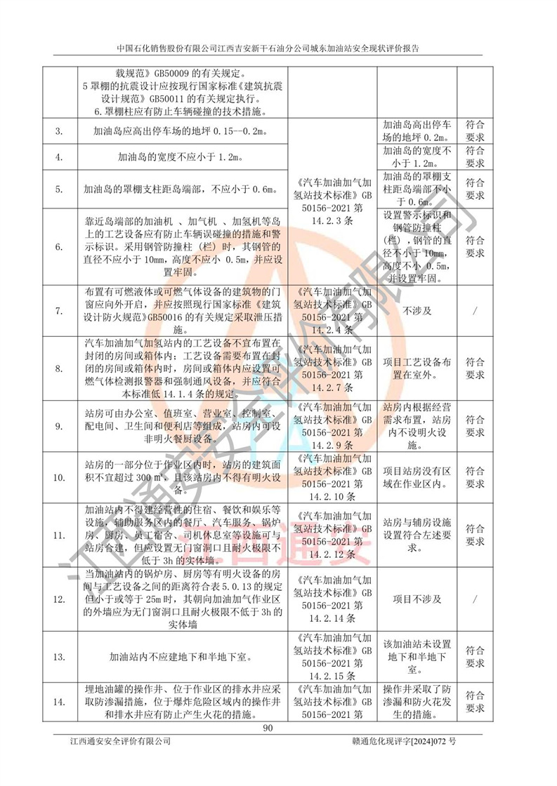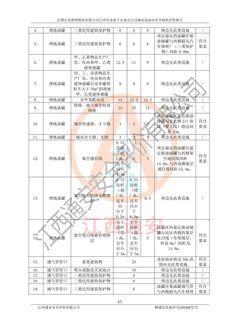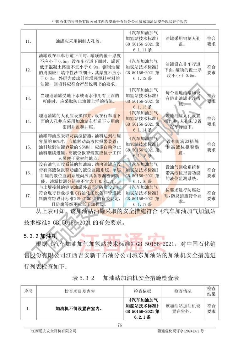 評(píng)價(jià)結(jié)論 | 中國石化銷售股份有限公司江西吉安新干石油分公司城東加油站符合《汽車加油加氣加氫站技術(shù)標(biāo)準(zhǔn)》GB50156-2021等標(biāo)準(zhǔn)規(guī)范的要求,安全風(fēng)險(xiǎn)可控,滿足危險(xiǎn)化學(xué)品經(jīng)營的安全條件。 | |||