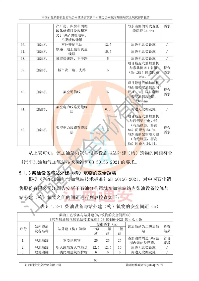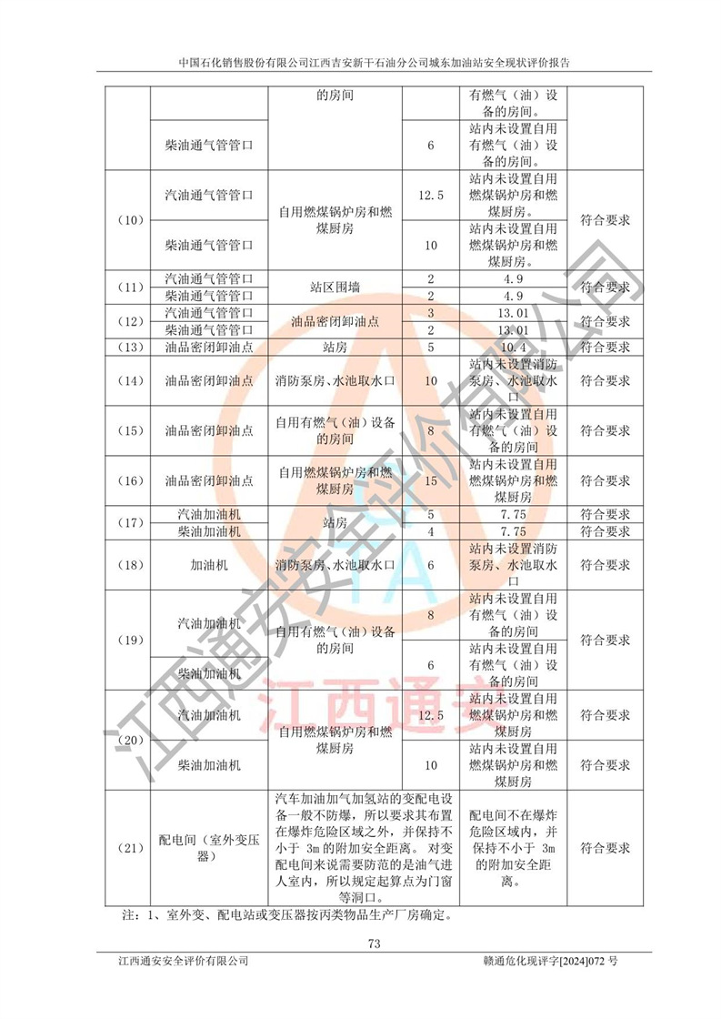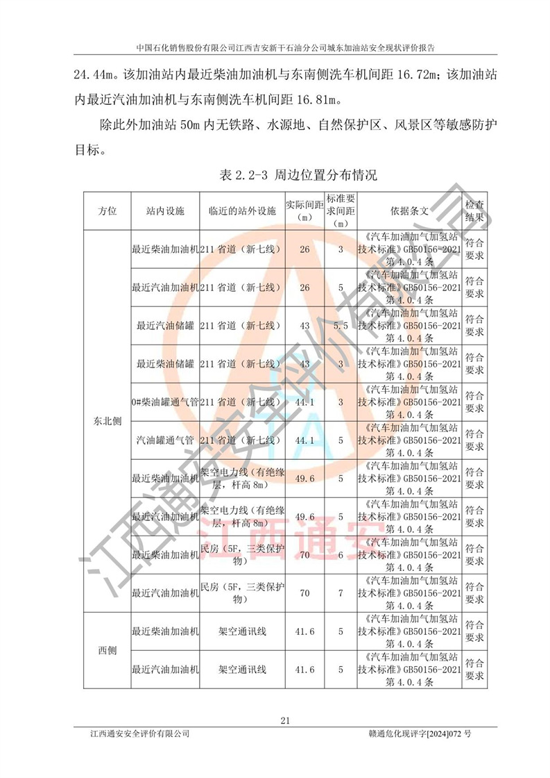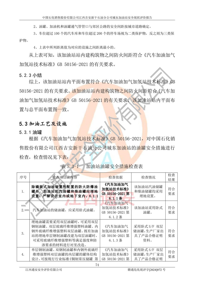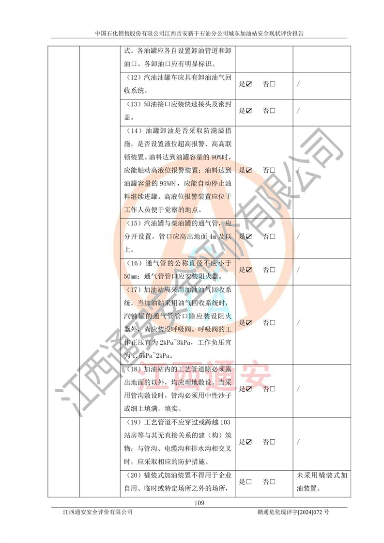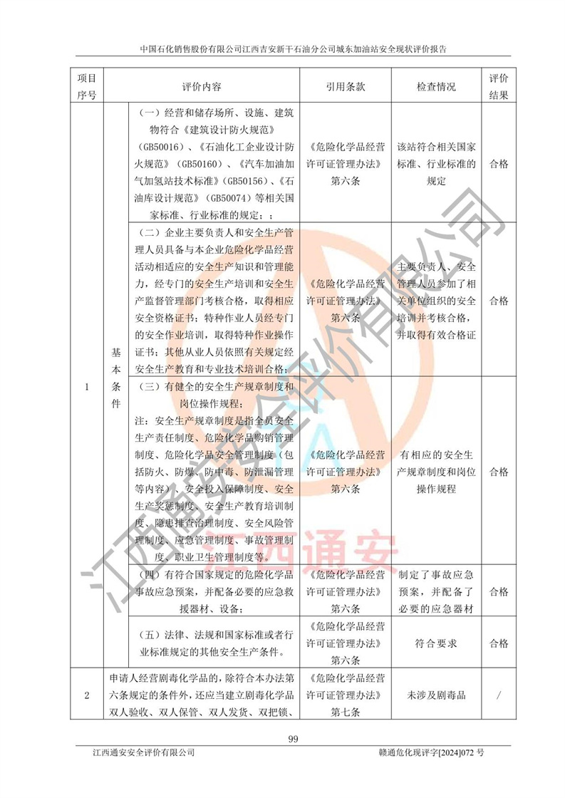評(píng)價(jià)結(jié)論 | 中國石化銷售股份有限公司江西吉安新干石油分公司城東加油站符合《汽車加油加氣加氫站技術(shù)標(biāo)準(zhǔn)》GB50156-2021等標(biāo)準(zhǔn)規(guī)范的要求,安全風(fēng)險(xiǎn)可控,滿足危險(xiǎn)化學(xué)品經(jīng)營的安全條件。 | |||