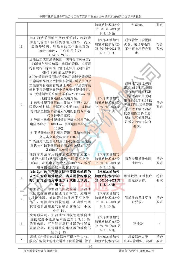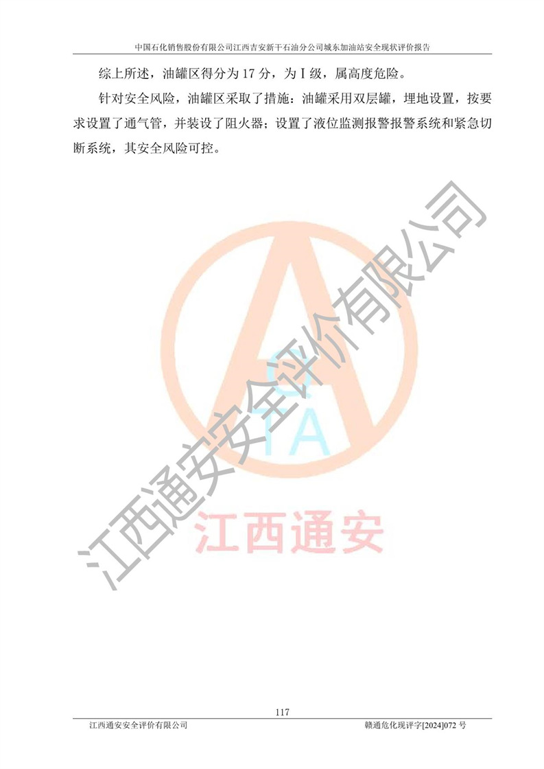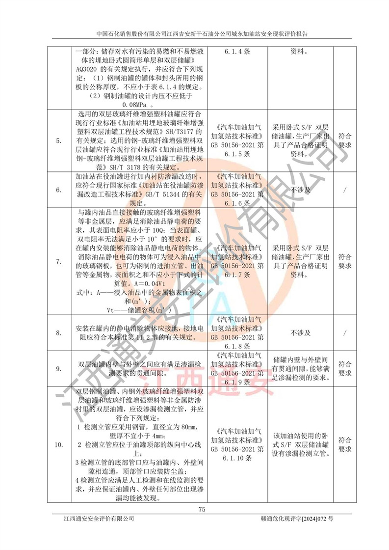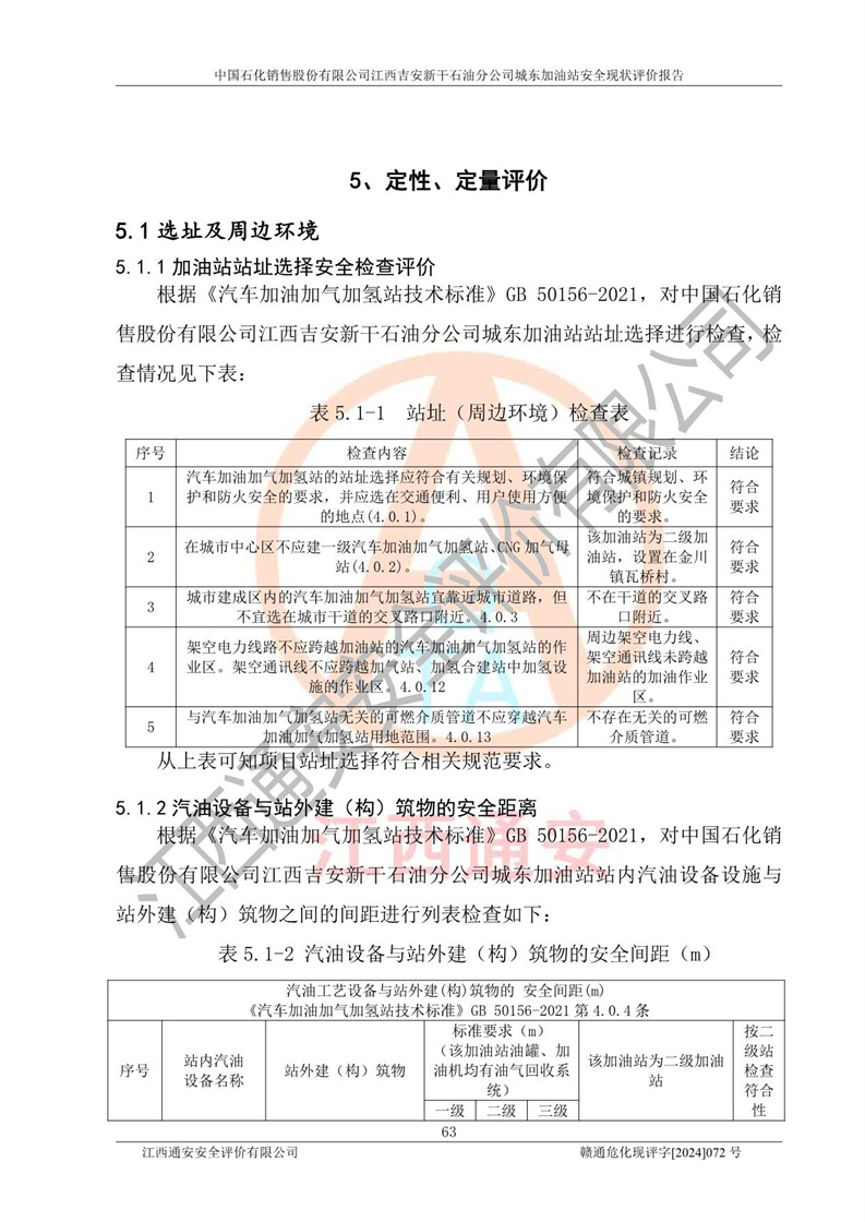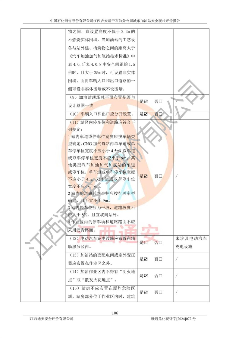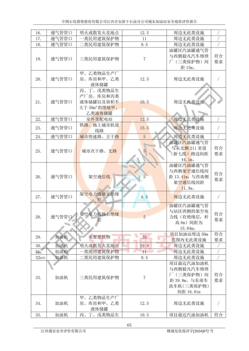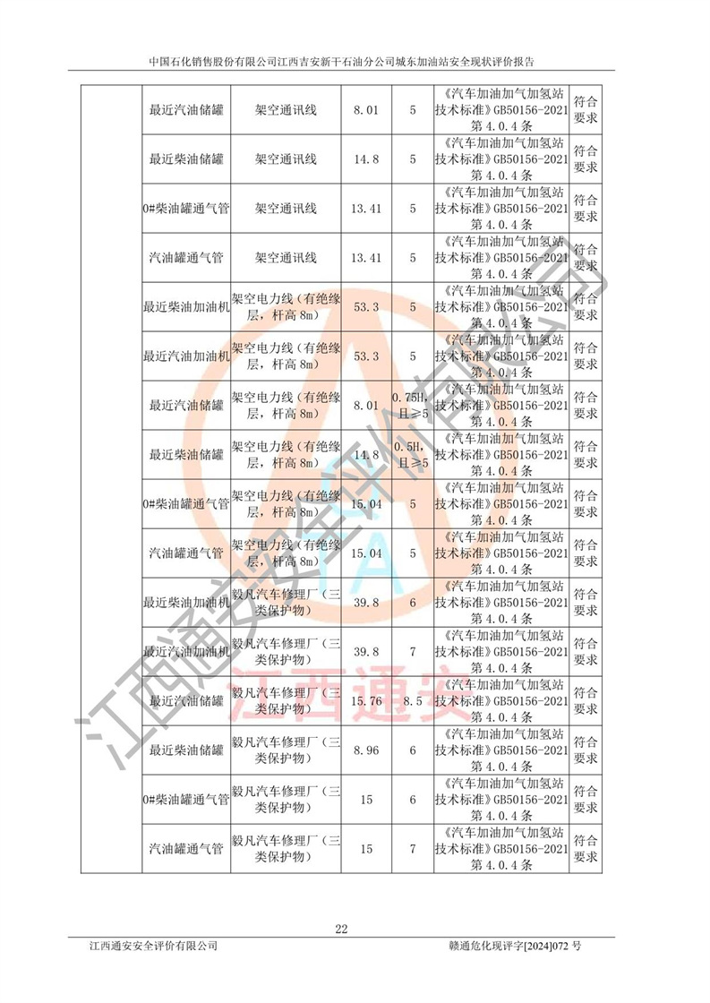 評(píng)價(jià)結(jié)論 | 中國石化銷售股份有限公司江西吉安新干石油分公司城東加油站符合《汽車加油加氣加氫站技術(shù)標(biāo)準(zhǔn)》GB50156-2021等標(biāo)準(zhǔn)規(guī)范的要求,安全風(fēng)險(xiǎn)可控,滿足危險(xiǎn)化學(xué)品經(jīng)營的安全條件。 | |||