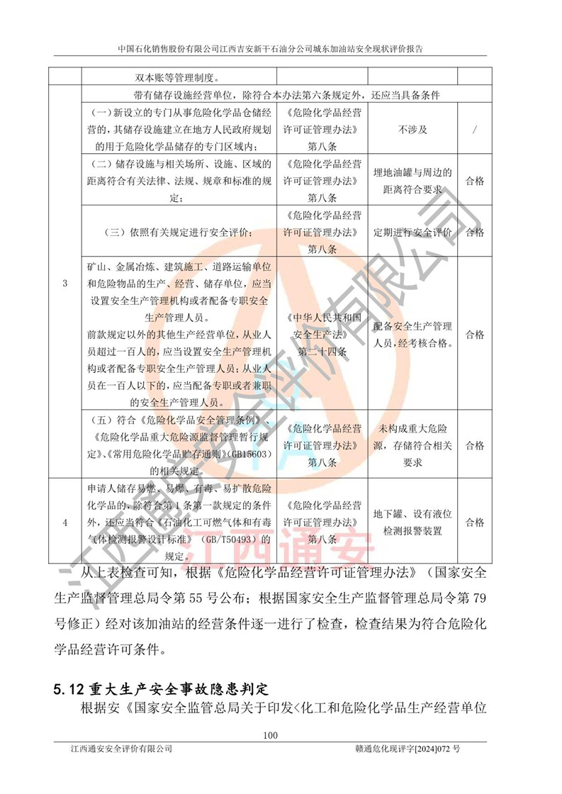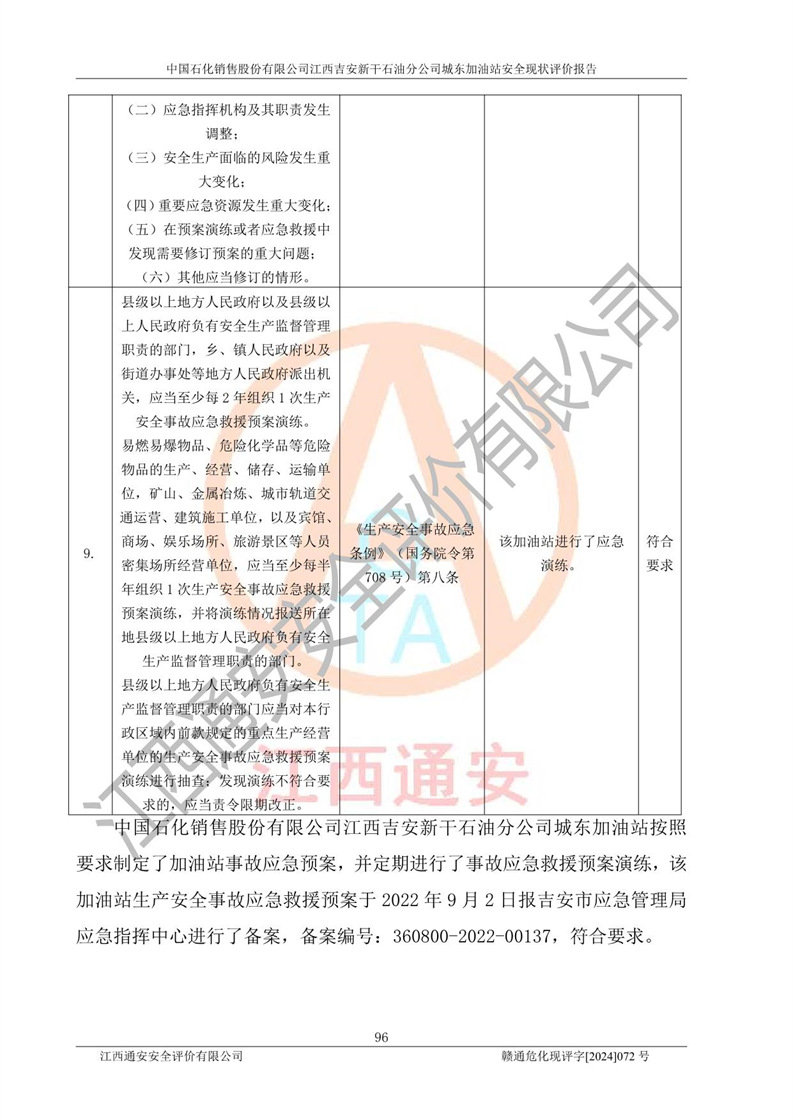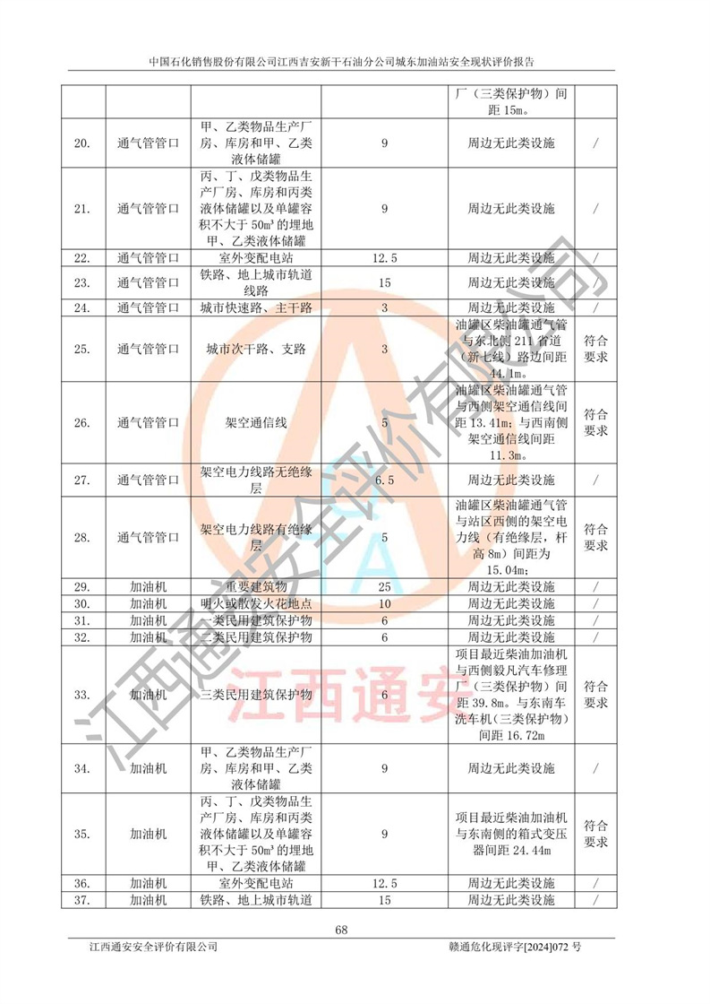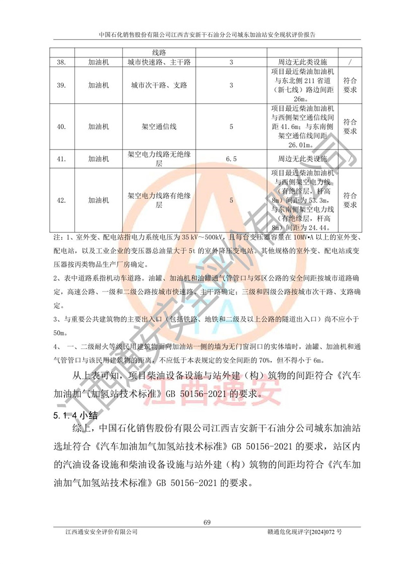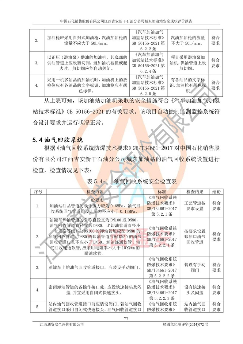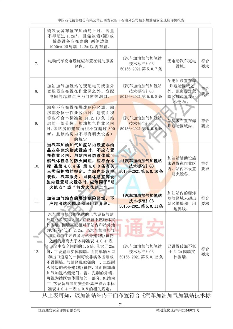 評(píng)價(jià)結(jié)論 | 中國石化銷售股份有限公司江西吉安新干石油分公司城東加油站符合《汽車加油加氣加氫站技術(shù)標(biāo)準(zhǔn)》GB50156-2021等標(biāo)準(zhǔn)規(guī)范的要求,安全風(fēng)險(xiǎn)可控,滿足危險(xiǎn)化學(xué)品經(jīng)營的安全條件。 | |||