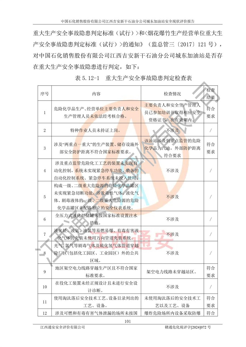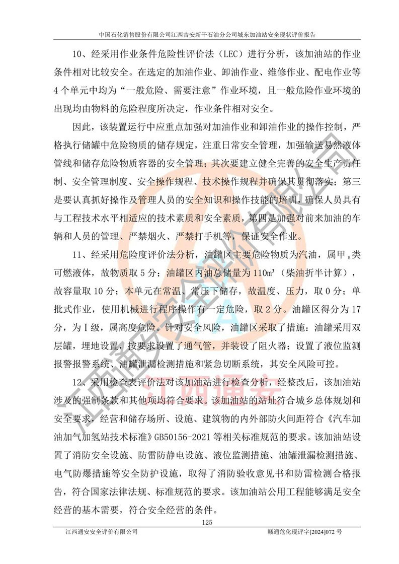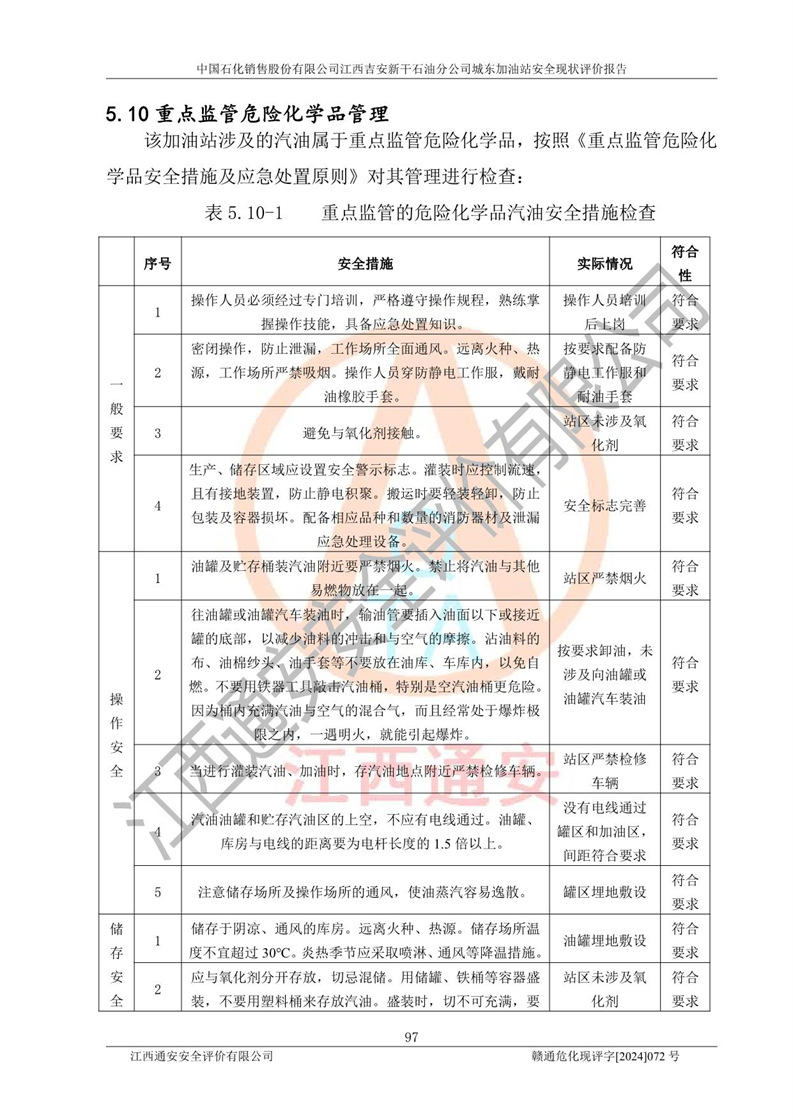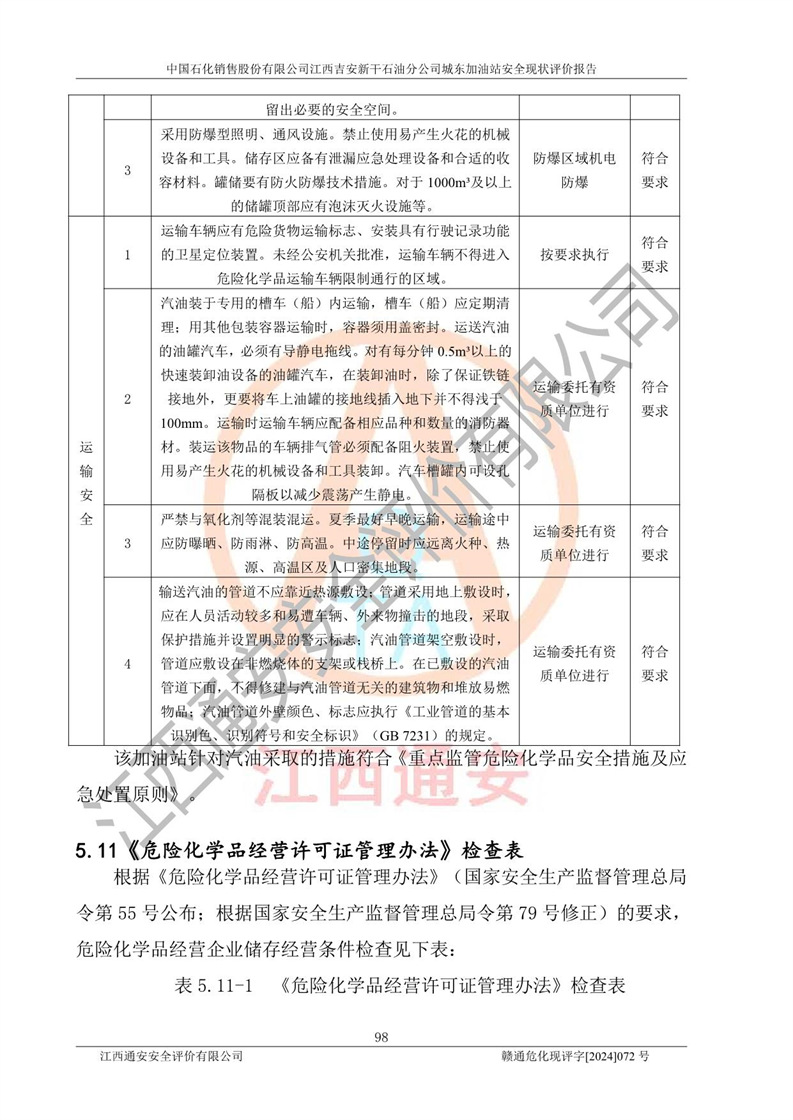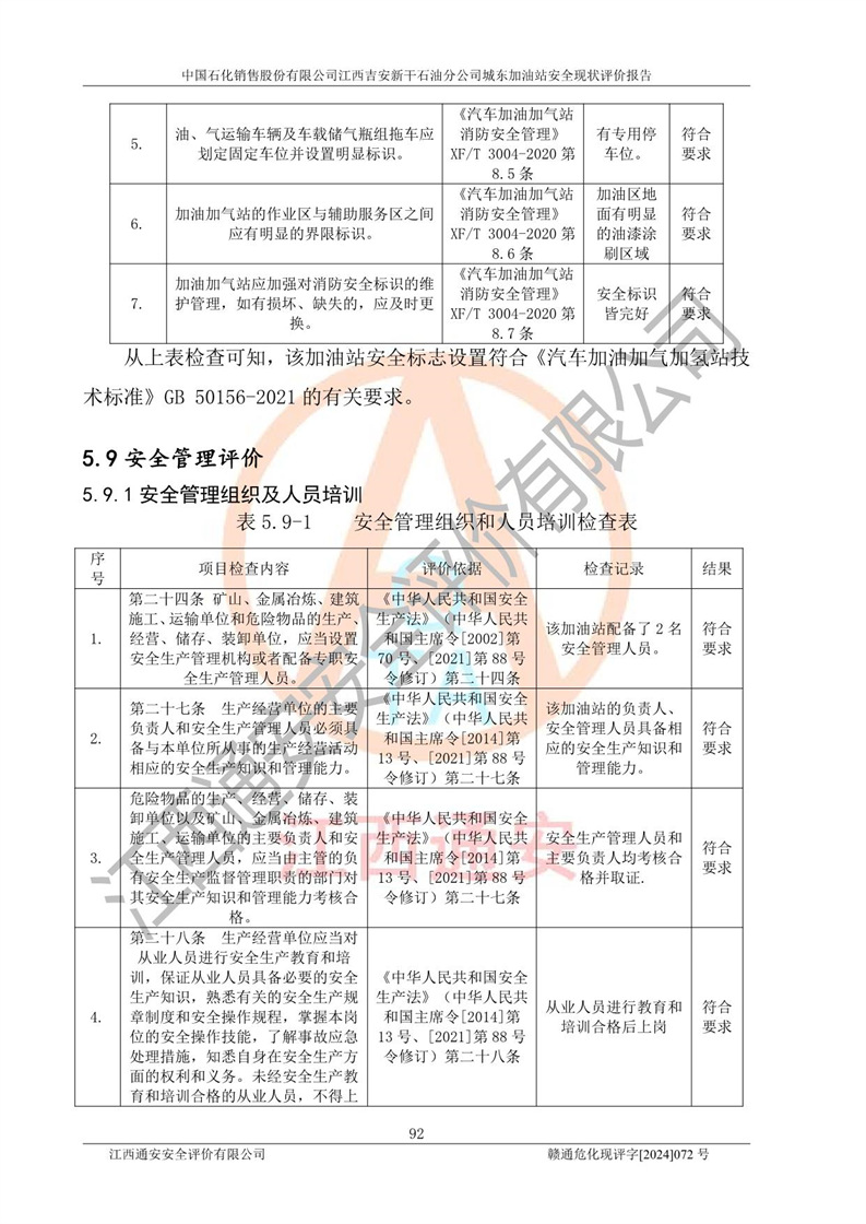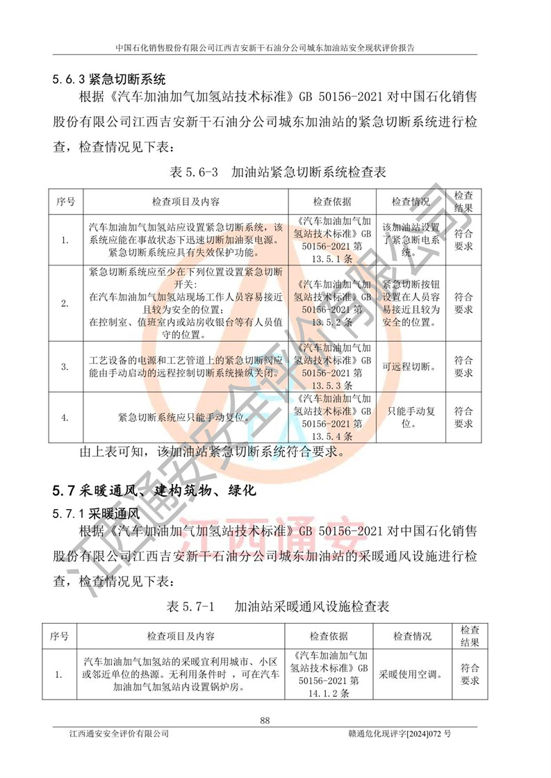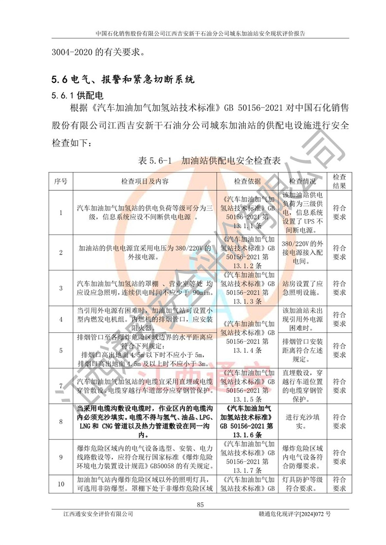評(píng)價(jià)結(jié)論 | 中國石化銷售股份有限公司江西吉安新干石油分公司城東加油站符合《汽車加油加氣加氫站技術(shù)標(biāo)準(zhǔn)》GB50156-2021等標(biāo)準(zhǔn)規(guī)范的要求,安全風(fēng)險(xiǎn)可控,滿足危險(xiǎn)化學(xué)品經(jīng)營的安全條件。 | |||