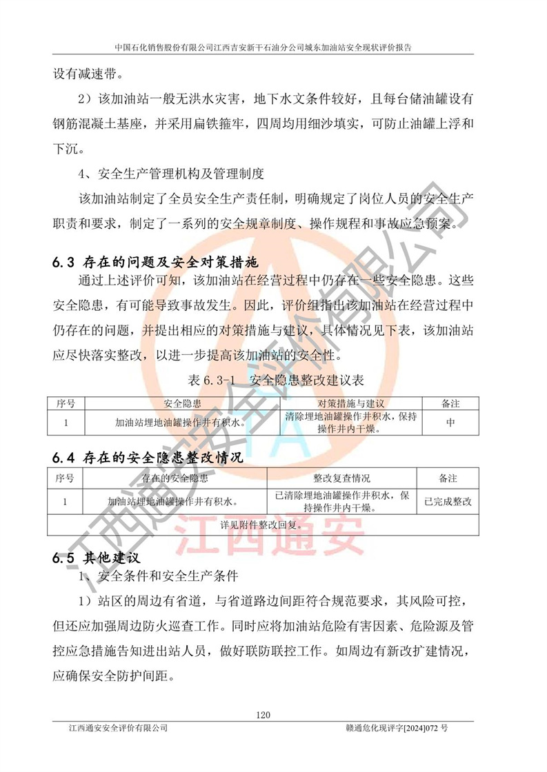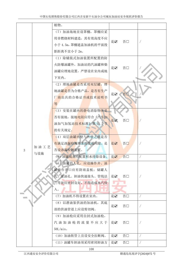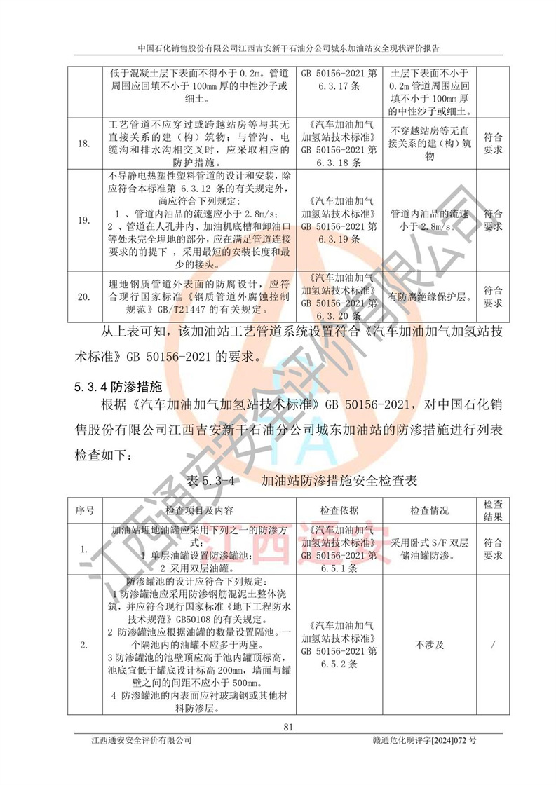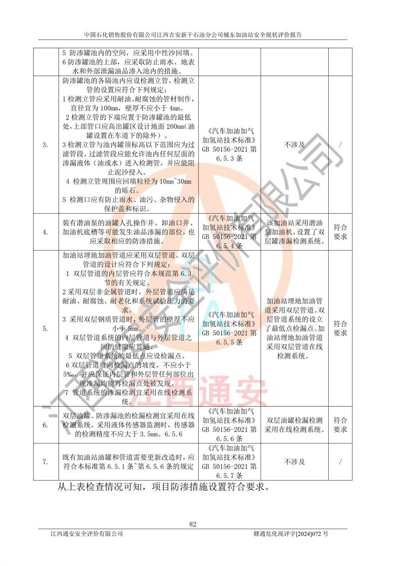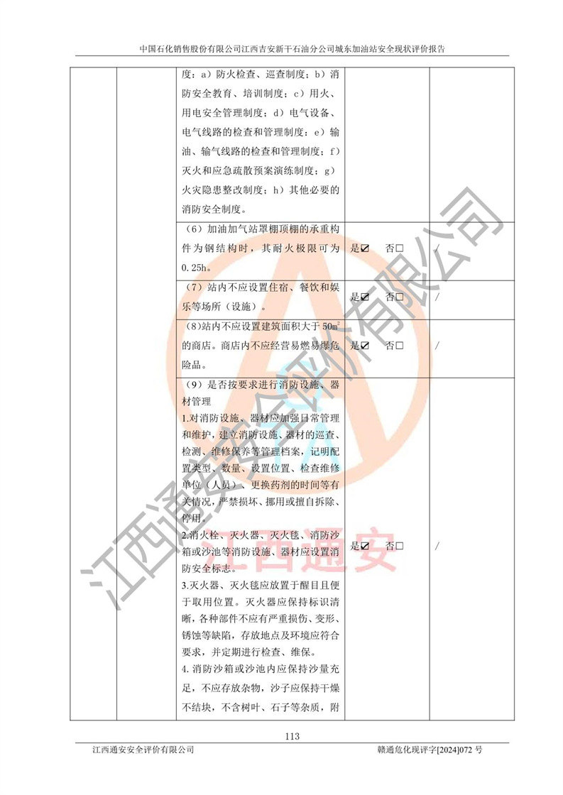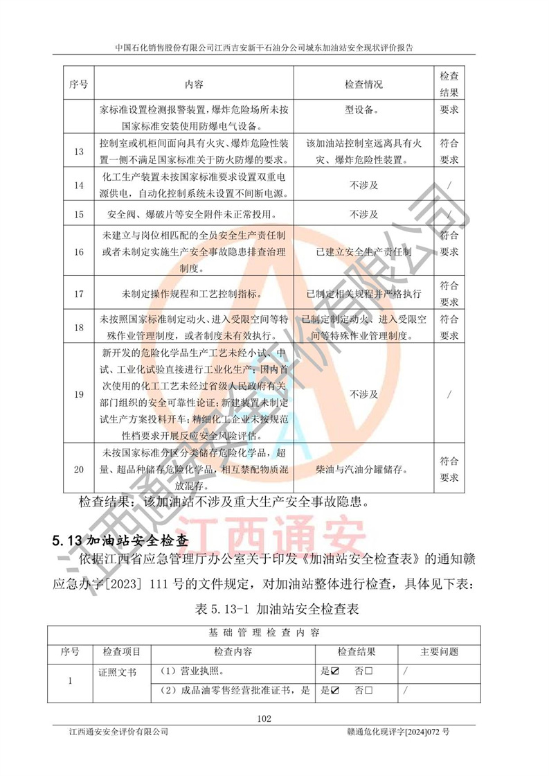 評(píng)價(jià)結(jié)論 | 中國石化銷售股份有限公司江西吉安新干石油分公司城東加油站符合《汽車加油加氣加氫站技術(shù)標(biāo)準(zhǔn)》GB50156-2021等標(biāo)準(zhǔn)規(guī)范的要求,安全風(fēng)險(xiǎn)可控,滿足危險(xiǎn)化學(xué)品經(jīng)營的安全條件。 | |||