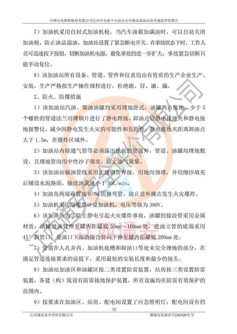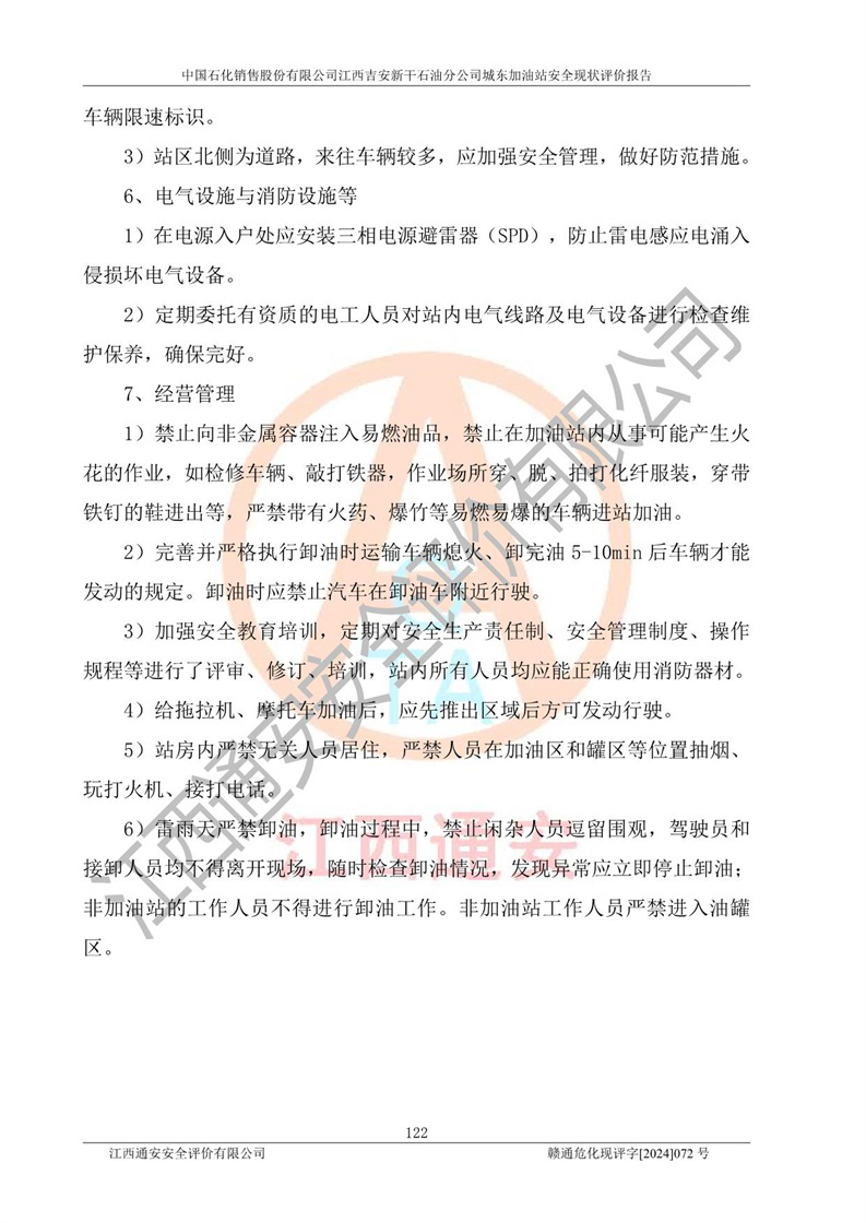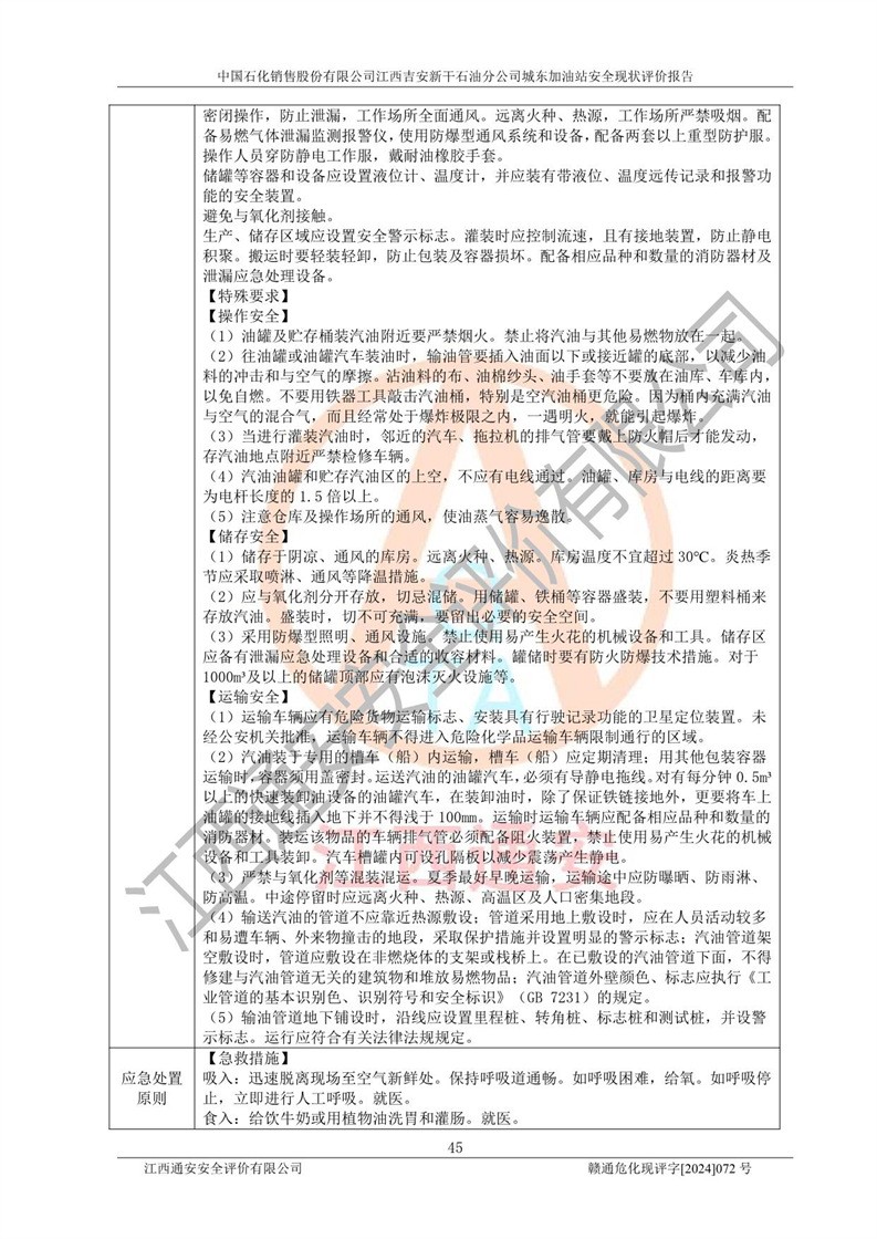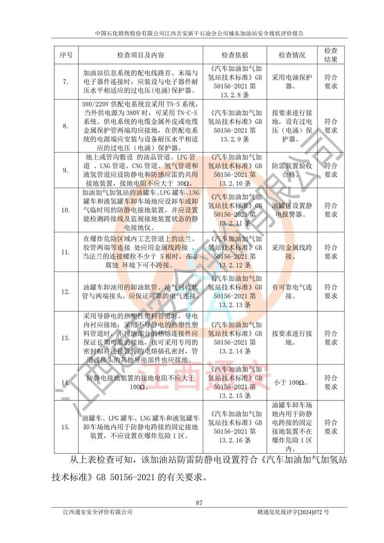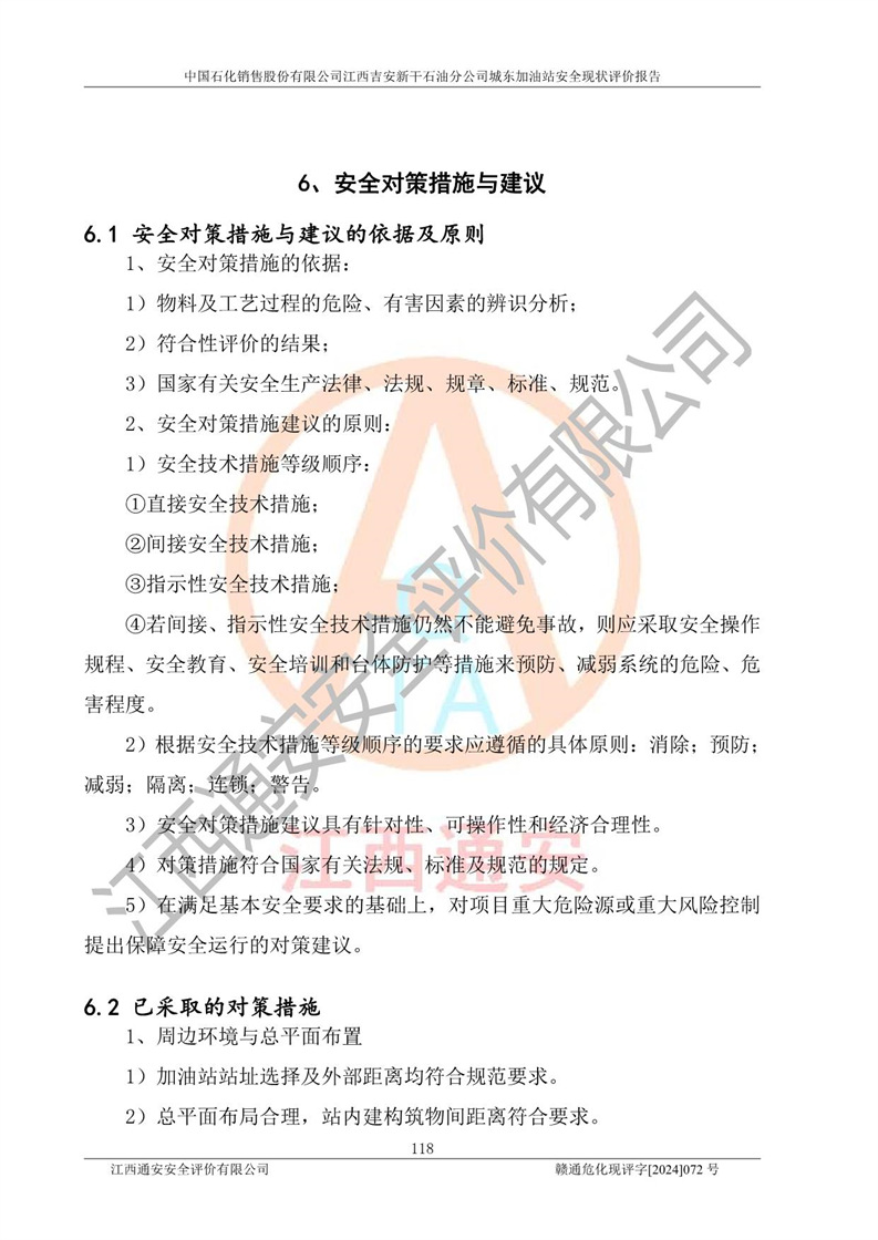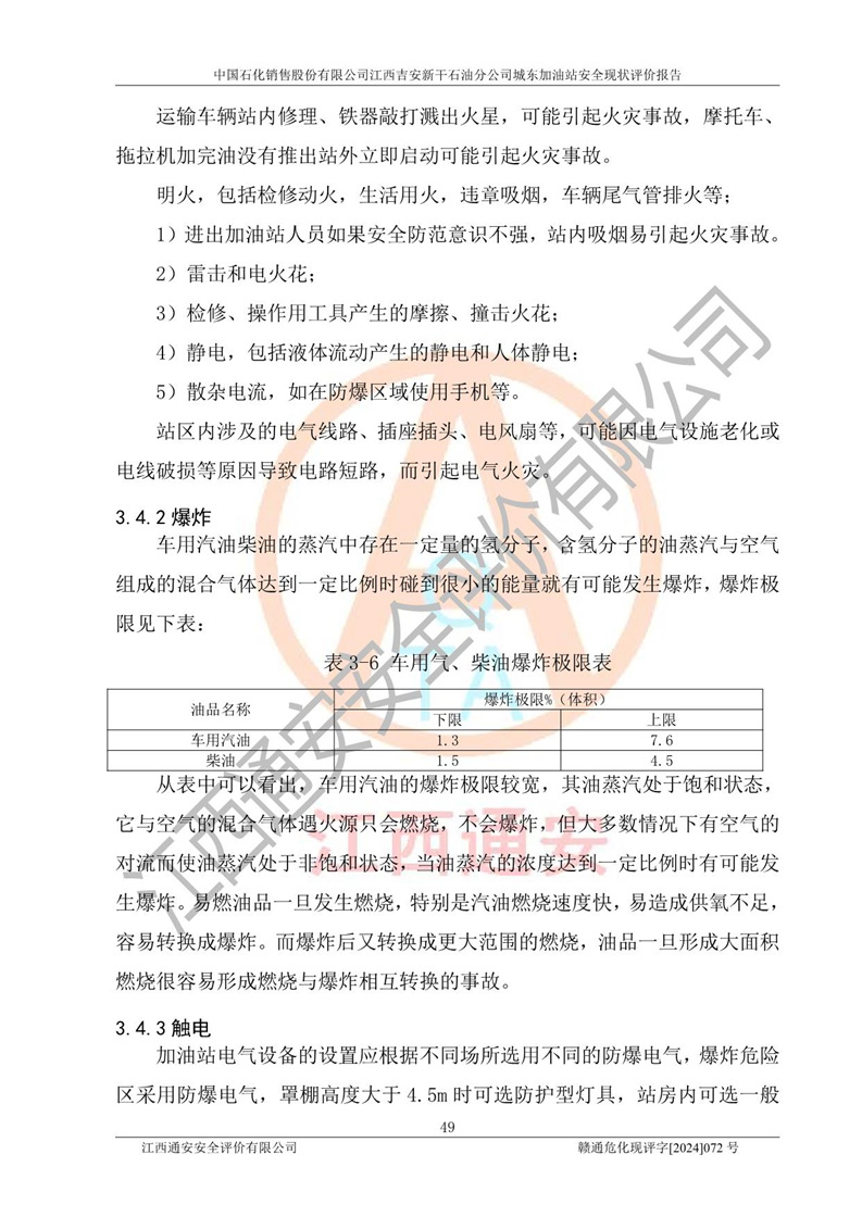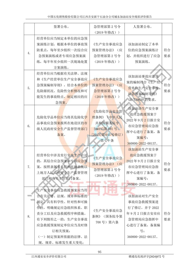 評(píng)價(jià)結(jié)論 | 中國石化銷售股份有限公司江西吉安新干石油分公司城東加油站符合《汽車加油加氣加氫站技術(shù)標(biāo)準(zhǔn)》GB50156-2021等標(biāo)準(zhǔn)規(guī)范的要求,安全風(fēng)險(xiǎn)可控,滿足危險(xiǎn)化學(xué)品經(jīng)營的安全條件。 | |||