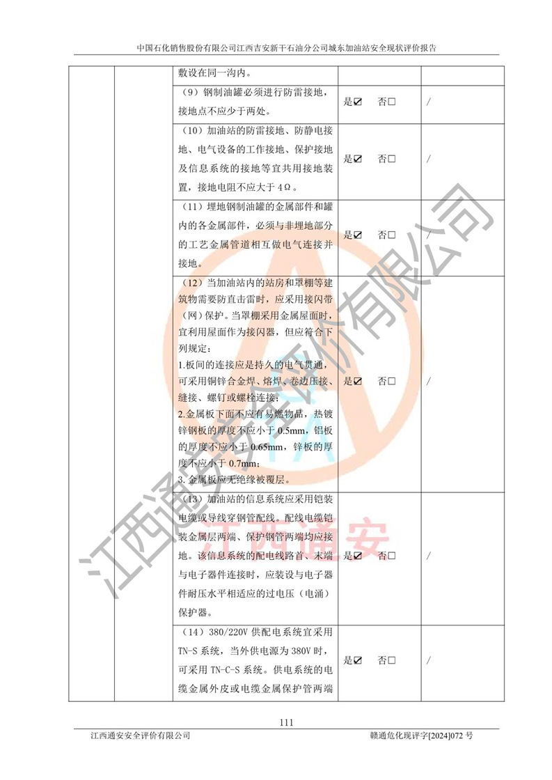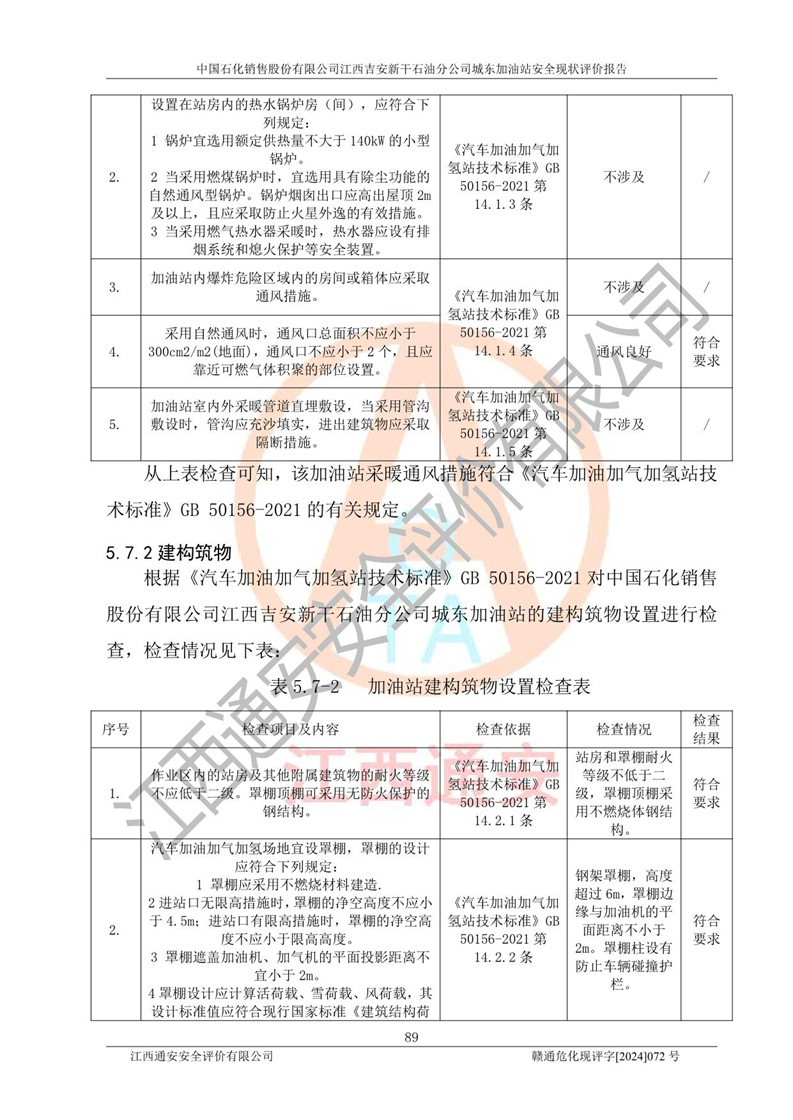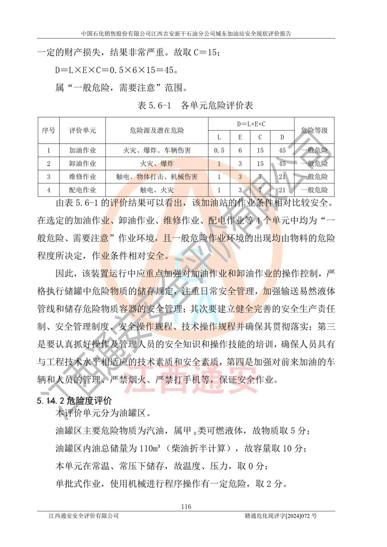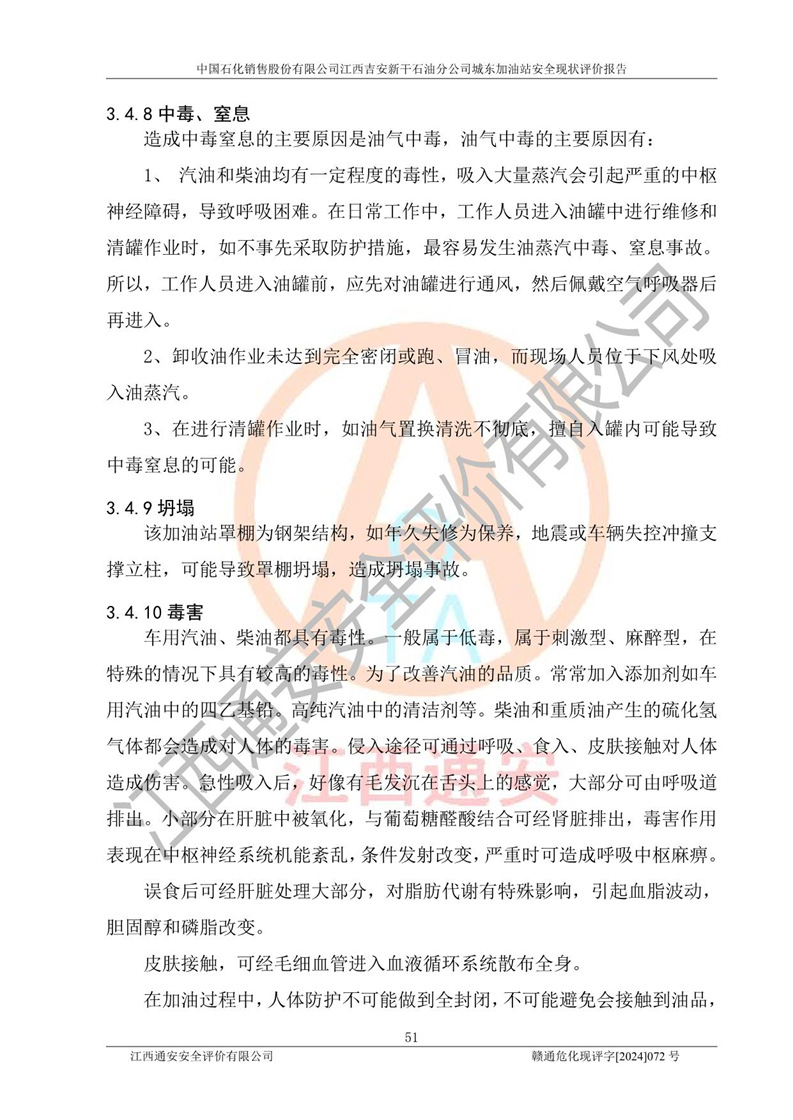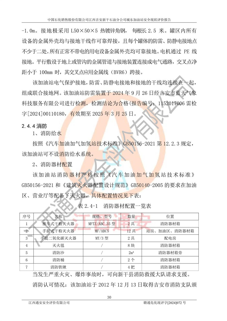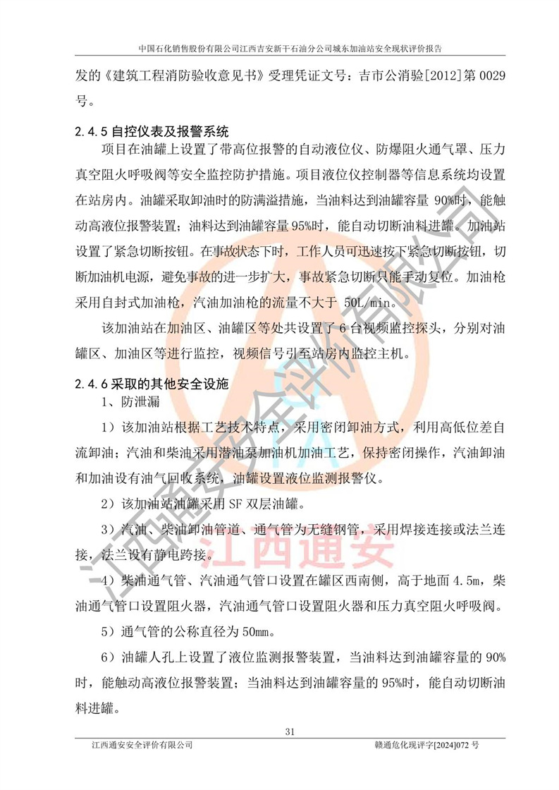 評(píng)價(jià)結(jié)論 | 中國石化銷售股份有限公司江西吉安新干石油分公司城東加油站符合《汽車加油加氣加氫站技術(shù)標(biāo)準(zhǔn)》GB50156-2021等標(biāo)準(zhǔn)規(guī)范的要求,安全風(fēng)險(xiǎn)可控,滿足危險(xiǎn)化學(xué)品經(jīng)營的安全條件。 | |||