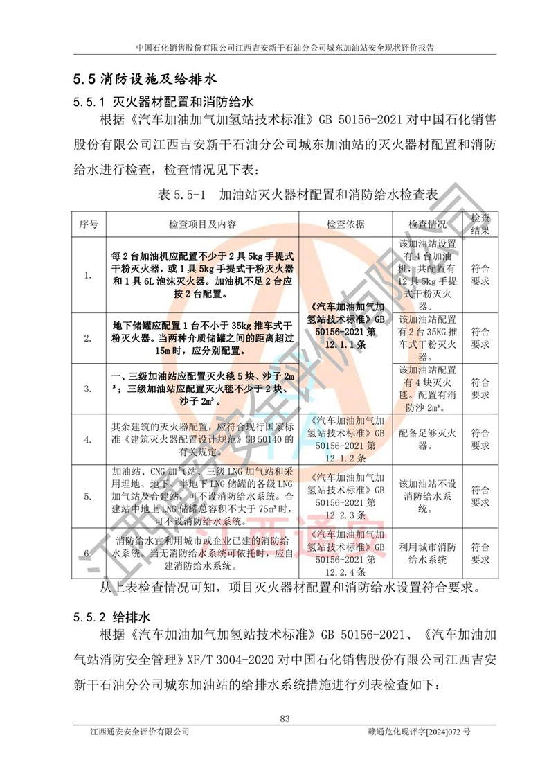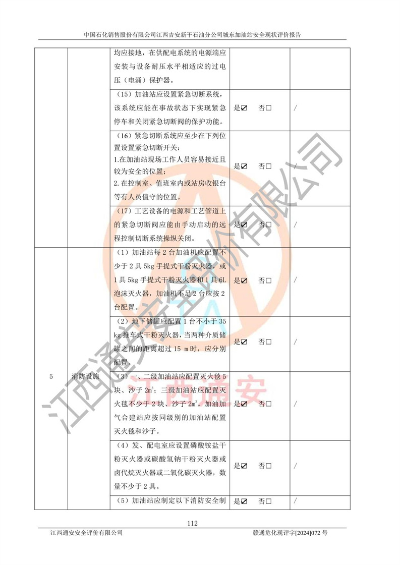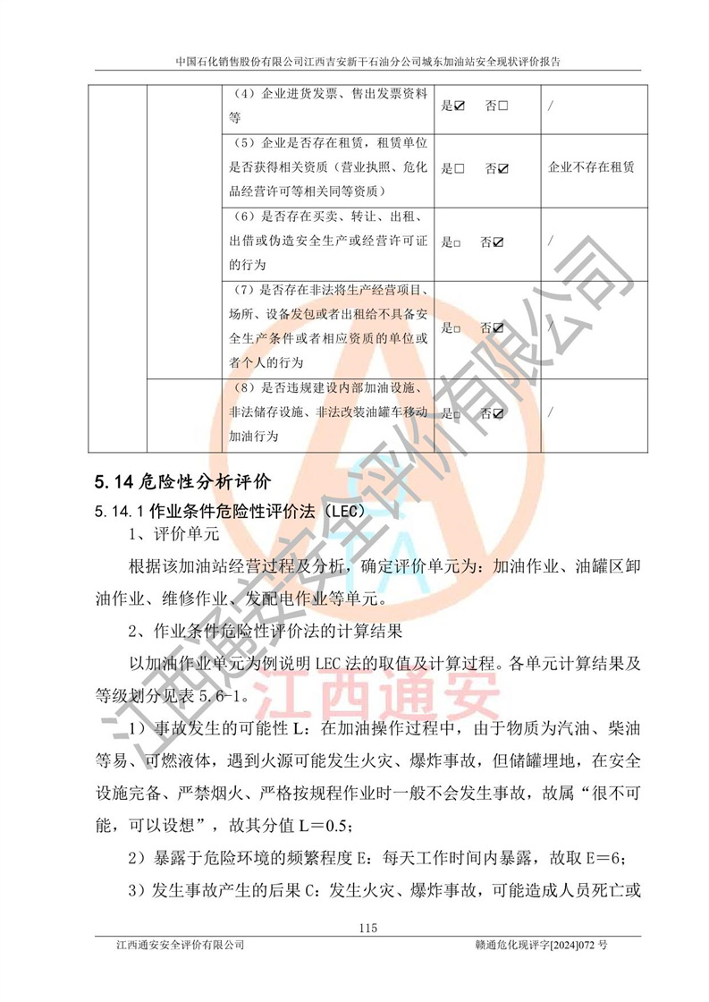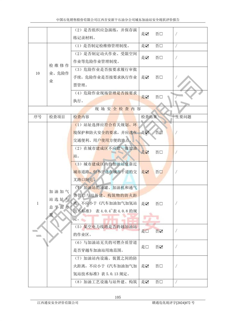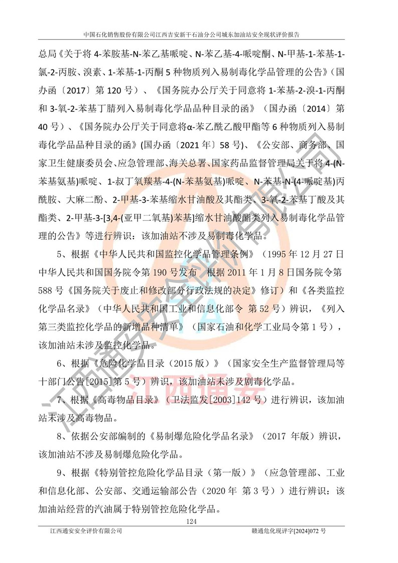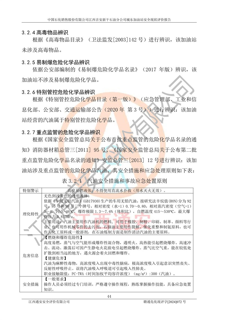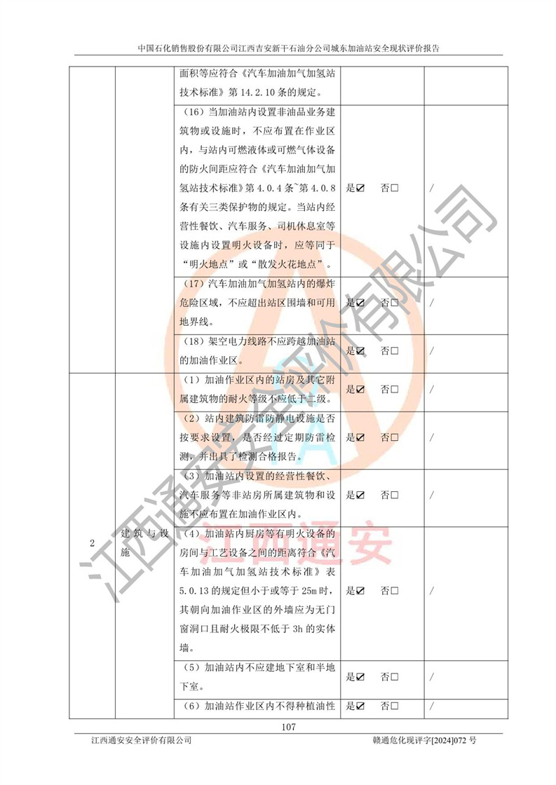 評(píng)價(jià)結(jié)論 | 中國石化銷售股份有限公司江西吉安新干石油分公司城東加油站符合《汽車加油加氣加氫站技術(shù)標(biāo)準(zhǔn)》GB50156-2021等標(biāo)準(zhǔn)規(guī)范的要求,安全風(fēng)險(xiǎn)可控,滿足危險(xiǎn)化學(xué)品經(jīng)營的安全條件。 | |||