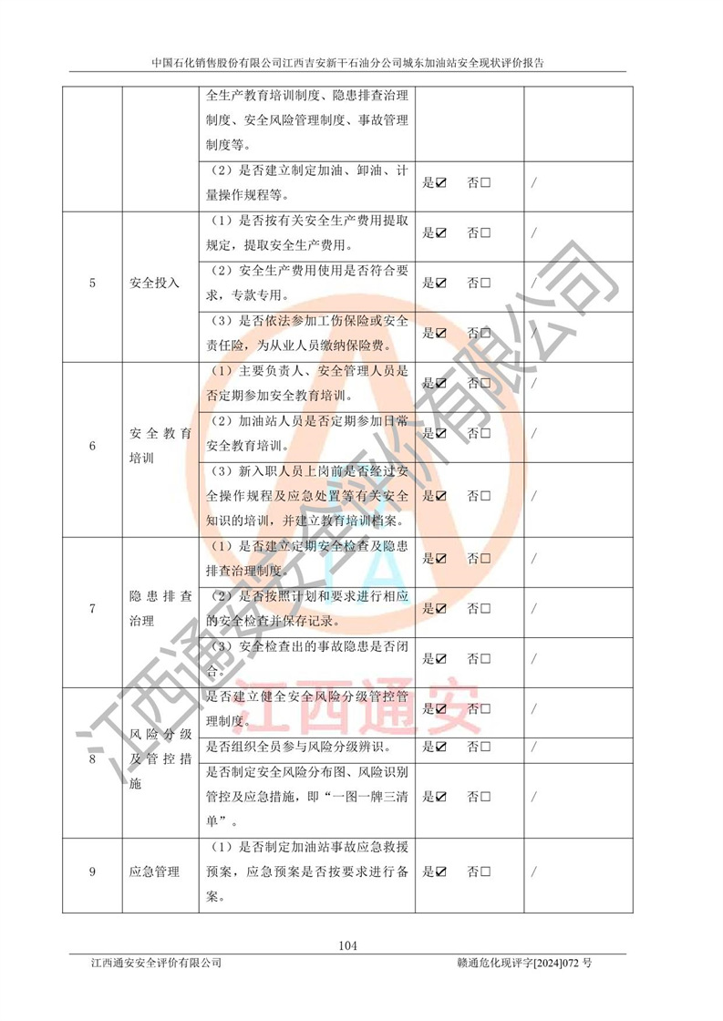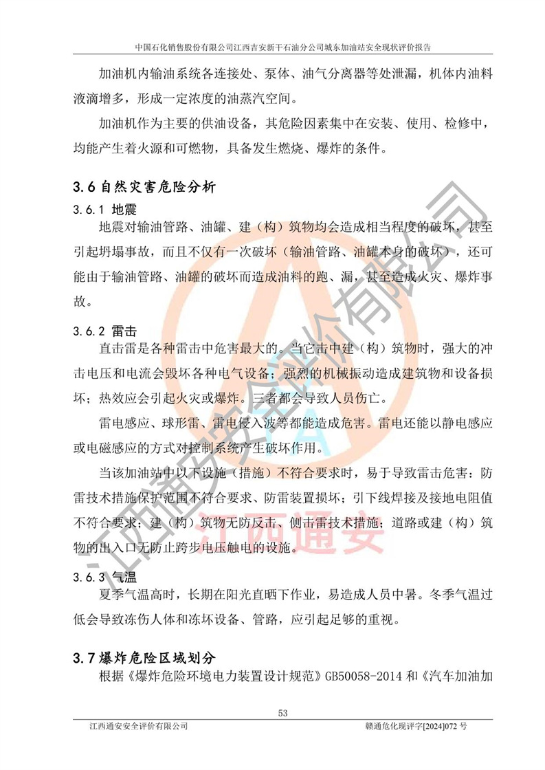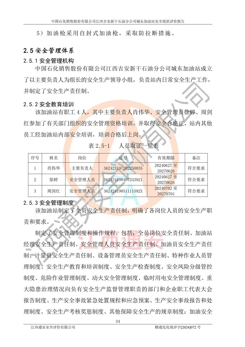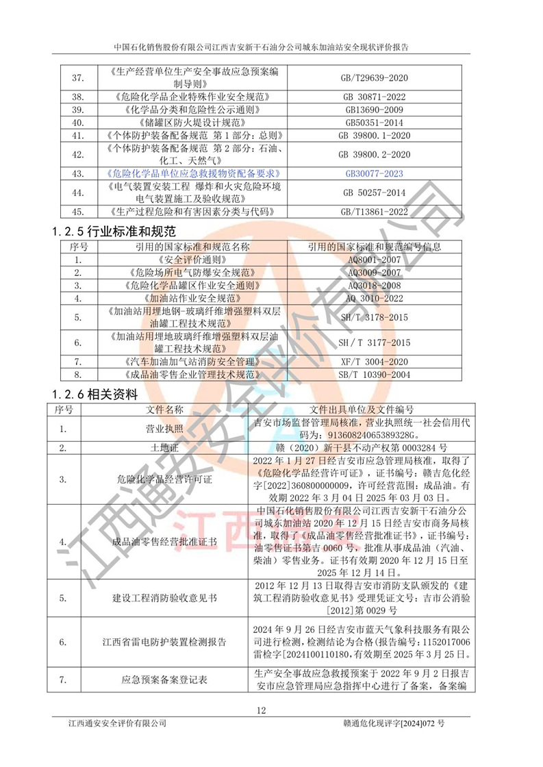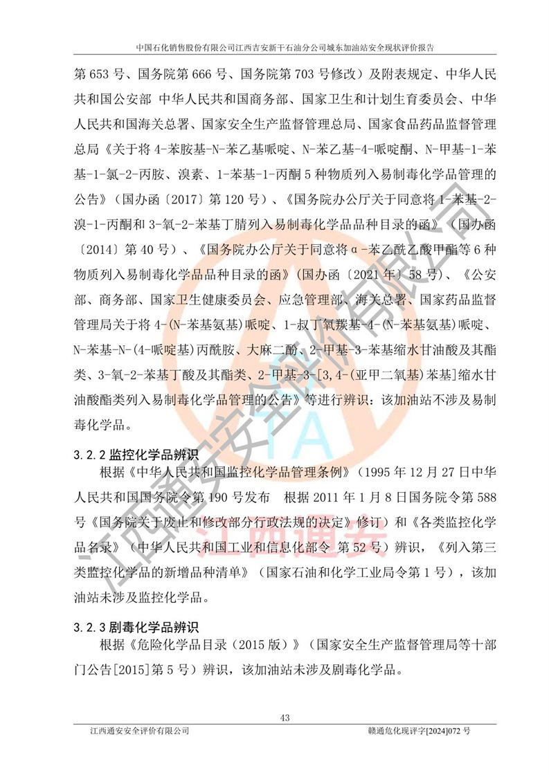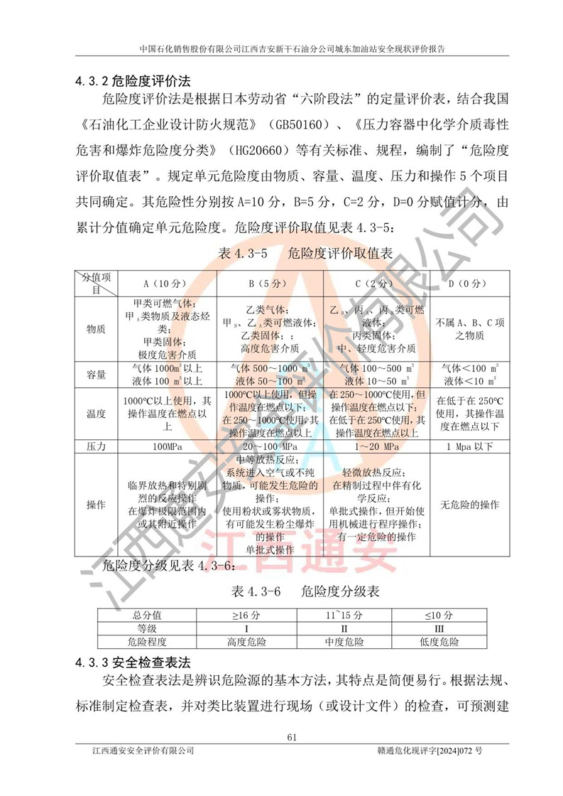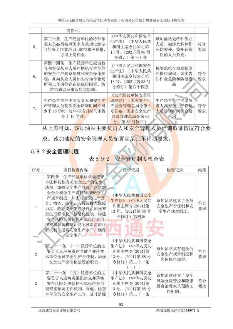 評(píng)價(jià)結(jié)論 | 中國石化銷售股份有限公司江西吉安新干石油分公司城東加油站符合《汽車加油加氣加氫站技術(shù)標(biāo)準(zhǔn)》GB50156-2021等標(biāo)準(zhǔn)規(guī)范的要求,安全風(fēng)險(xiǎn)可控,滿足危險(xiǎn)化學(xué)品經(jīng)營的安全條件。 | |||
