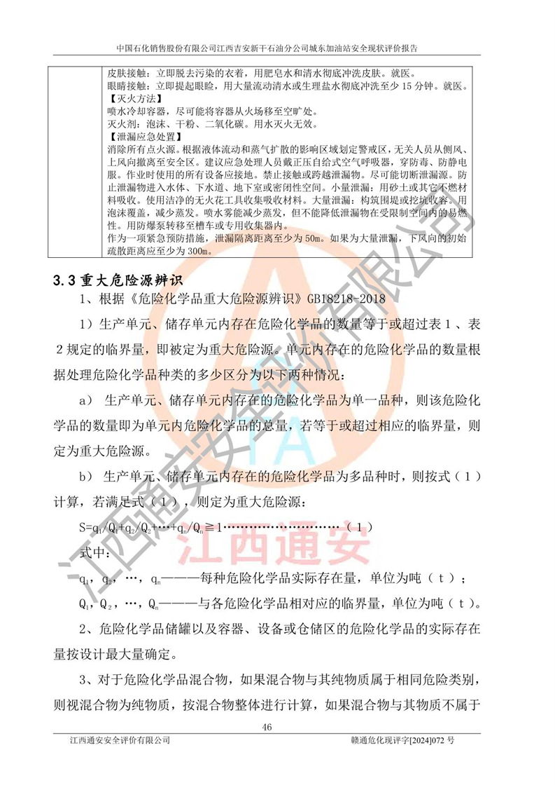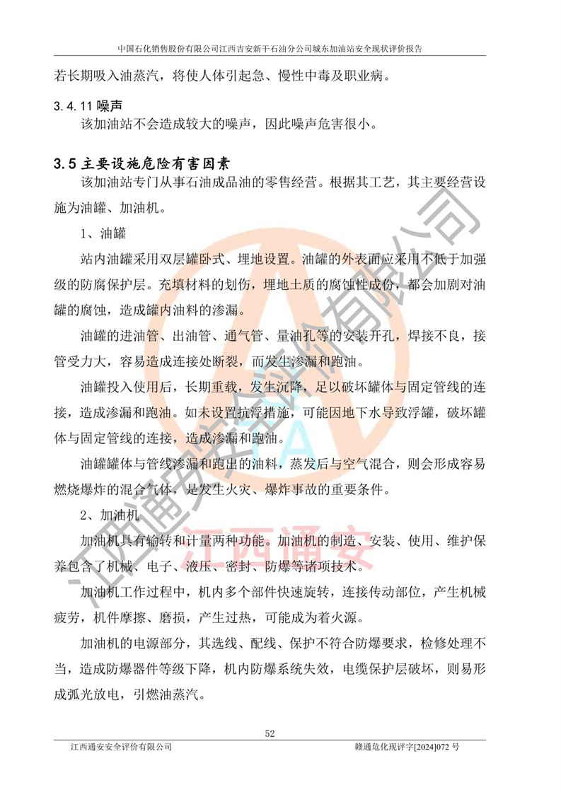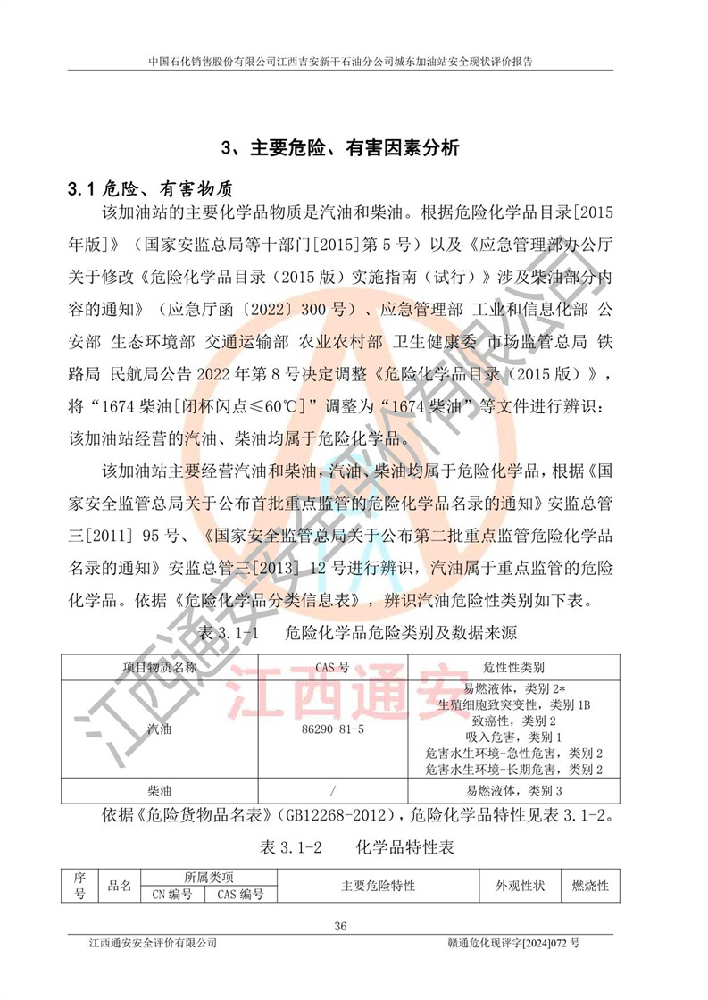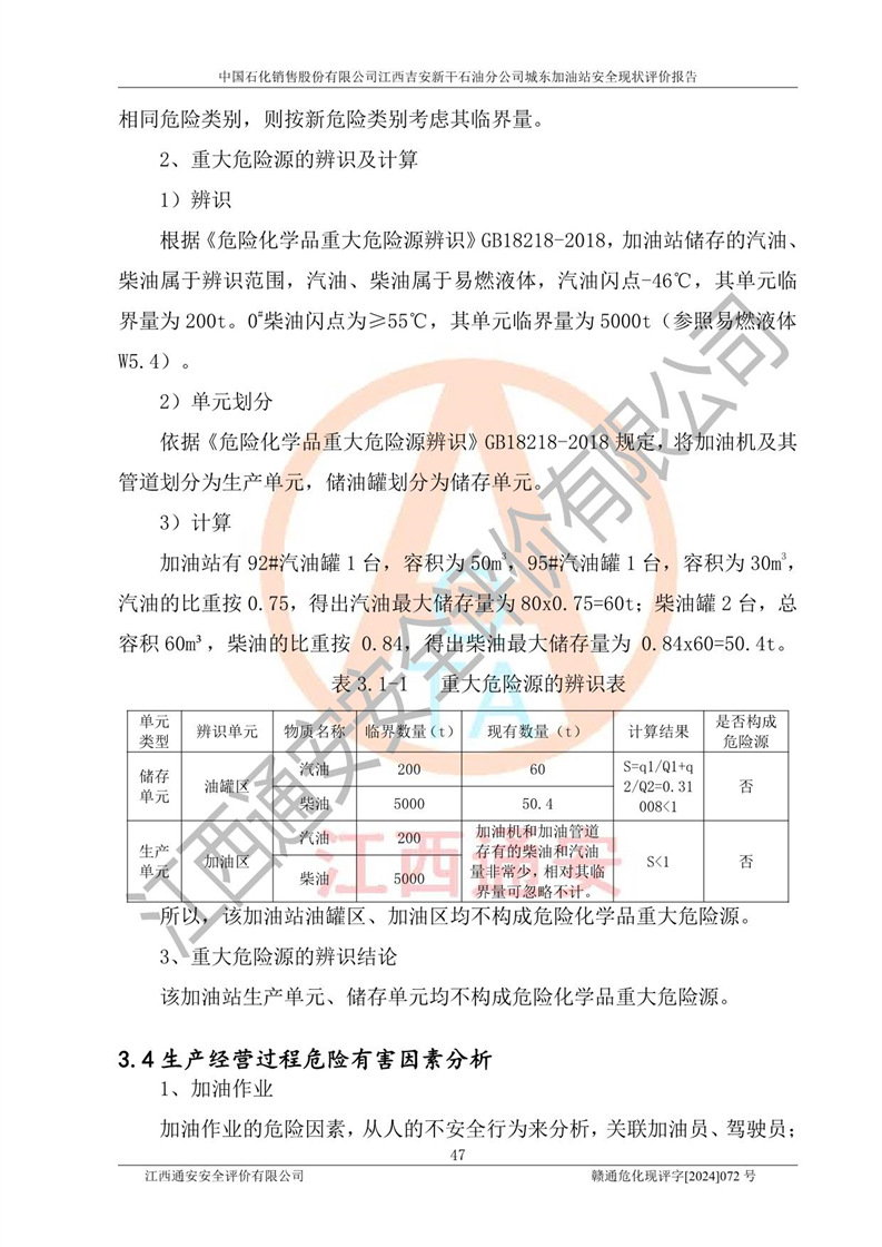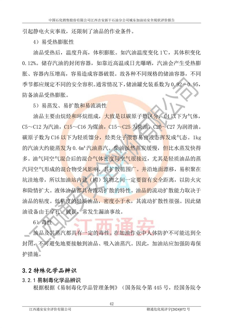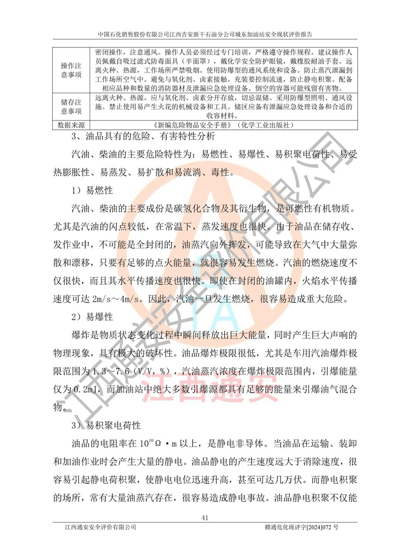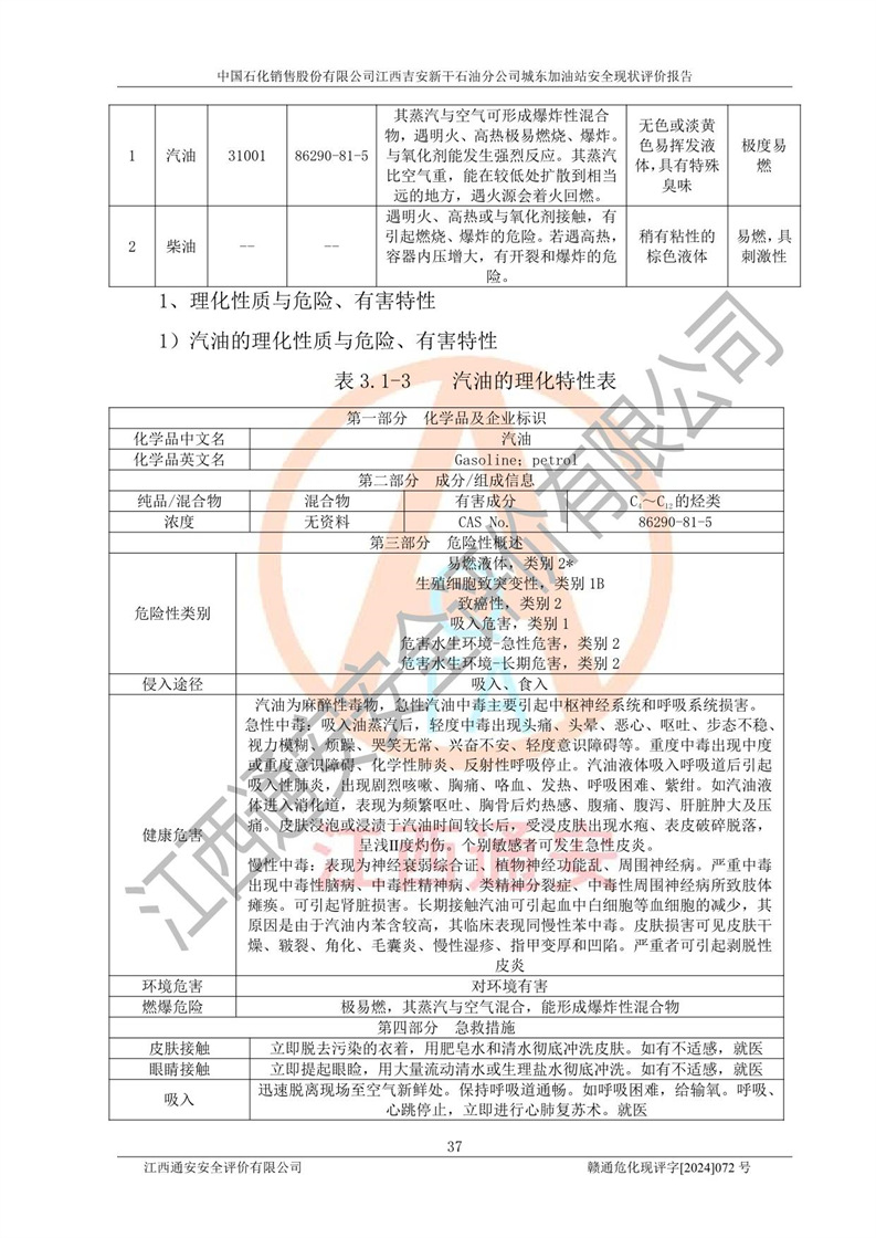 項(xiàng)目簡介 | 中國石化銷售股份有限公司江西吉安新干石油分公司城東加油站是一家從事成品油零售經(jīng)營的企業(yè)。該加油站于2014年4月16日經(jīng)吉安市市場監(jiān)督管理局核準(zhǔn)注冊成立,營業(yè)場所位于江西省吉安市新干縣金川鎮(zhèn)瓦橋村新七公路。該加油站屬于外商投資企業(yè)分公司,負(fù)責(zé)人為肖偉華,營業(yè)執(zhí)照統(tǒng)一社會(huì)信用代碼為:91360824065389328G。營業(yè)執(zhí)照核準(zhǔn)經(jīng)營范圍:許可項(xiàng)目:危險(xiǎn)化學(xué)品經(jīng)營,成品油零售(不含危險(xiǎn)化學(xué)品),成品油倉儲(chǔ),成品油零售,**類增值電信業(yè)務(wù),第二類增值電信業(yè)務(wù),第三類醫(yī)療器械經(jīng)營,出版物零售,**代理業(yè)務(wù),***零售,發(fā)電業(yè)務(wù)、輸電業(yè)務(wù)、供(配)電業(yè)務(wù),互聯(lián)網(wǎng)直播技術(shù)服務(wù),酒類經(jīng)營,食品銷售,小食雜,網(wǎng)絡(luò)文化經(jīng)營,藥品零售,燃?xì)饨?jīng)營,煙草制品零售,出版物批發(fā),旅游業(yè)務(wù),住宿服務(wù),餐飲服務(wù),港口經(jīng)營,保稅倉庫經(jīng)營,保稅物流中心經(jīng)營(依法須經(jīng)批準(zhǔn)的項(xiàng)目,經(jīng)相關(guān)部門批準(zhǔn)后在許可**期內(nèi)方可開展經(jīng)營活動(dòng),具體經(jīng)營項(xiàng)目和許可期限以相關(guān)部門批準(zhǔn)文件或許可證件為準(zhǔn))一般項(xiàng)目:成品油批發(fā)(不含危險(xiǎn)化學(xué)品),辦公設(shè)備銷售,電池銷售,成品油倉儲(chǔ)(不含危險(xiǎn)化學(xué)品),**類醫(yī)療器械銷售,第二類醫(yī)療器械銷售,輪胎銷售,低溫倉儲(chǔ)(不含危險(xiǎn)化學(xué)品等需許可審批的項(xiàng)目),電動(dòng)自行車銷售,電動(dòng)汽車充電基礎(chǔ)設(shè)施運(yùn)營,寵物食品及用品批發(fā),非電力家用器具銷售,化妝品批發(fā),化妝品零售,個(gè)人衛(wèi)生用品銷售,會(huì)議及展覽服務(wù),金銀制品銷售,集中式**充電站,普通貨物倉儲(chǔ)服務(wù)(不含危險(xiǎn)化學(xué)品等需許可審批的項(xiàng)目),人力資源服務(wù)(不含職業(yè)中介活動(dòng)、勞務(wù)派遣服務(wù)),食品互聯(lián)網(wǎng)銷售(僅銷售預(yù)包裝食品),食用農(nóng)產(chǎn)品零售,外賣遞送服務(wù),消毒劑銷售(不含危險(xiǎn)化學(xué)品),新能源汽車換電設(shè)施銷售,站用加氫及儲(chǔ)氫設(shè)施銷售,鐘表銷售,**化學(xué)產(chǎn)品銷售(不含危險(xiǎn)化學(xué)品),保健食品(預(yù)包裝)銷售,針紡織品銷售,服裝服飾零售,日用品銷售,五金產(chǎn)品零售,家用電器銷售,單用途商業(yè)預(yù)付卡代理銷售,電子產(chǎn)品銷售,潤滑油銷售,石油制品銷售(不含危險(xiǎn)化學(xué)品),戶外用品銷售,汽車銷售,摩托車及零配件批發(fā),摩托車及零配件零售,農(nóng)副產(chǎn)品銷售,化肥銷售,農(nóng)用薄膜銷售,安防設(shè)備銷售,禮品花卉銷售,計(jì)算機(jī)軟硬件及輔助設(shè)備零售,橡膠制品銷售,機(jī)械設(shè)備銷售,珠寶首飾零售,珠寶首飾批發(fā),玩具銷售,樂器批發(fā),樂器零售,家具銷售,建筑材料銷售,機(jī)動(dòng)車充電銷售,技術(shù)服務(wù)、技術(shù)開發(fā)、技術(shù)咨詢、技術(shù)交流、技術(shù)**、技術(shù)推廣,機(jī)動(dòng)車修理和維護(hù),物業(yè)管理,停車場服務(wù),居民日常生活服務(wù),票務(wù)代理服務(wù),廣告發(fā)布,廣告制作,廣告設(shè)計(jì)、代理,洗車服務(wù),信息咨詢服務(wù)(不含許可類信息咨詢服務(wù)),軟件開發(fā),貨物進(jìn)出口,食品進(jìn)出口,技術(shù)進(jìn)出口,進(jìn)出口代理,汽車裝飾用品銷售,租賃服務(wù)(不含許可類租賃服務(wù)),小微型客車租賃經(jīng)營服務(wù)(除依法須經(jīng)批準(zhǔn)的項(xiàng)目外,憑營業(yè)執(zhí)照依法自主開展經(jīng)營活動(dòng)) 中國石化銷售股份有限公司江西吉安新干石油分公司城東加油站占地面積1373.13㎡,加油站中設(shè)有1臺(tái)0#柴油/0#柴油潛油泵型雙槍加油機(jī),1臺(tái)92#汽油/95#汽油潛油泵型雙槍加油機(jī),1臺(tái)0#柴油/0#柴油/92#汽油/95#汽油潛油泵型四槍加油機(jī),1臺(tái)0#柴油/92#汽油/92#汽油/95#汽油潛油泵型四槍加油機(jī),設(shè)2臺(tái)SF雙層30m3埋地臥式0#柴油罐、1臺(tái)SF雙層50m3埋地臥式92#汽油儲(chǔ)罐,1臺(tái)SF雙層30m3埋地臥式95#汽油儲(chǔ)罐,總罐容為140m3,折合油罐容積為110m3(柴油罐容積折半計(jì)入油罐總?cè)莘e),屬二級(jí)加油站,汽油卸油、加油設(shè)置了油氣回收系統(tǒng)。 中國石化銷售股份有限公司江西吉安新干石油分公司城東加油站于2022年1月27日經(jīng)吉安市應(yīng)急管理局核準(zhǔn),取得了《危險(xiǎn)化學(xué)品經(jīng)營許可證》,證書編號(hào):贛吉?;?jīng)字[2022]360800000009,許可經(jīng)營范圍:成品油。**期2022年3月04日2025年03月03日。 中國石化銷售股份有限公司江西吉安新干石油分公司城東加油站2020年12月15日經(jīng)吉安市商務(wù)局核準(zhǔn),取得了《成品油零售經(jīng)營批準(zhǔn)證書》,證書編號(hào):油零售證書第吉0060號(hào),批準(zhǔn)從事成品油(汽油、柴油)零售業(yè)務(wù)。證書**期2020年12月15日至2025年12月14日。 項(xiàng)目生產(chǎn)過程中涉及的危險(xiǎn)化學(xué)品有:汽油、柴油等。 項(xiàng)目各生產(chǎn)和儲(chǔ)存單元均未構(gòu)成
