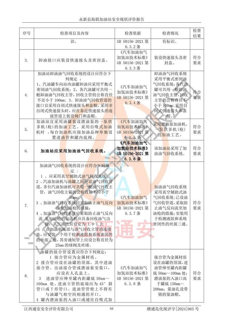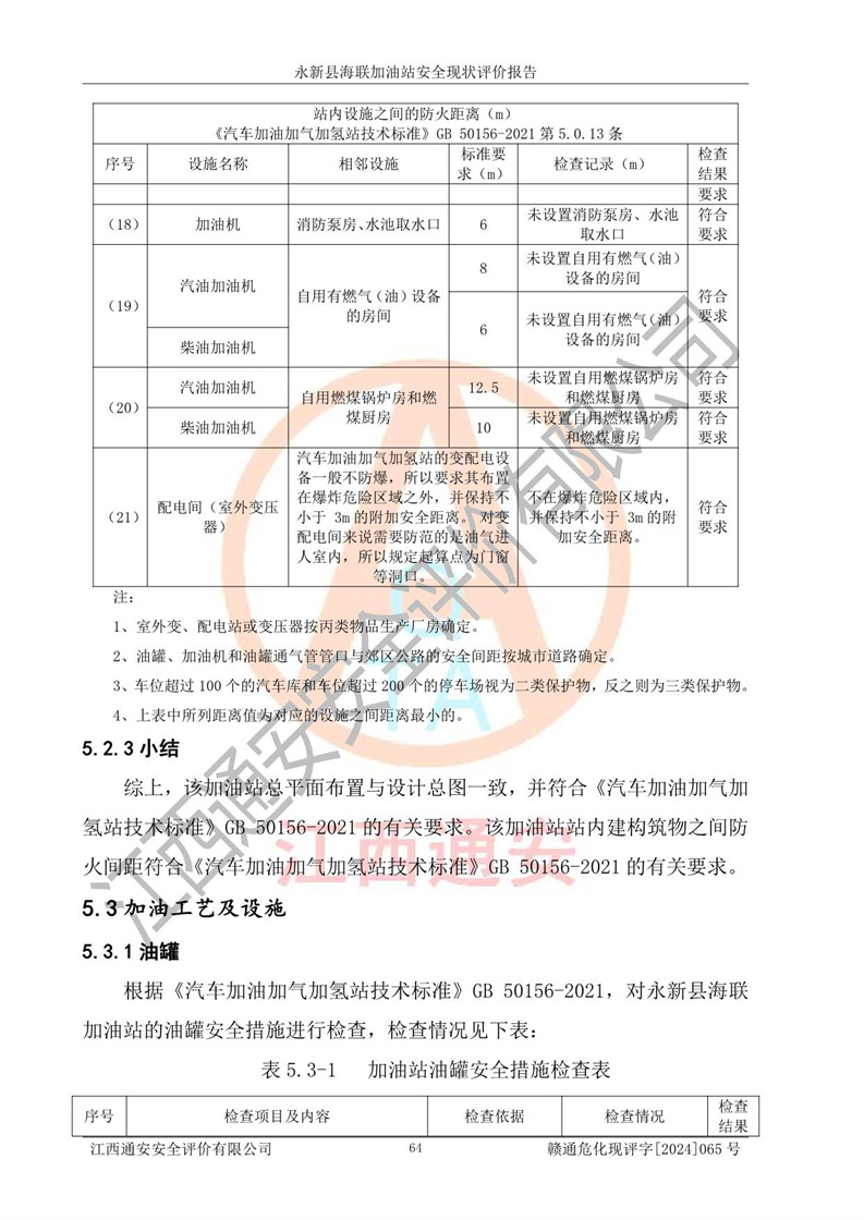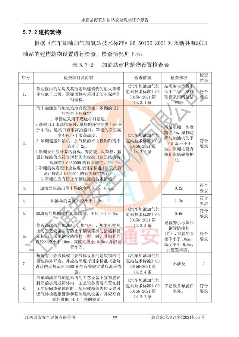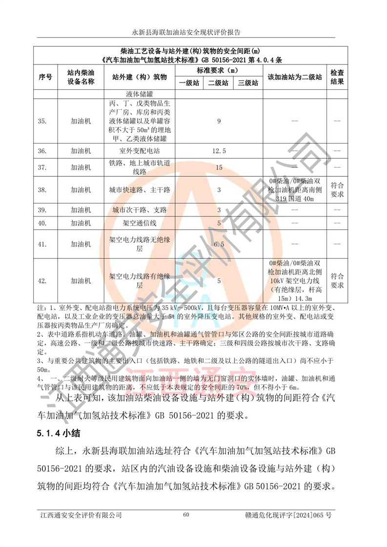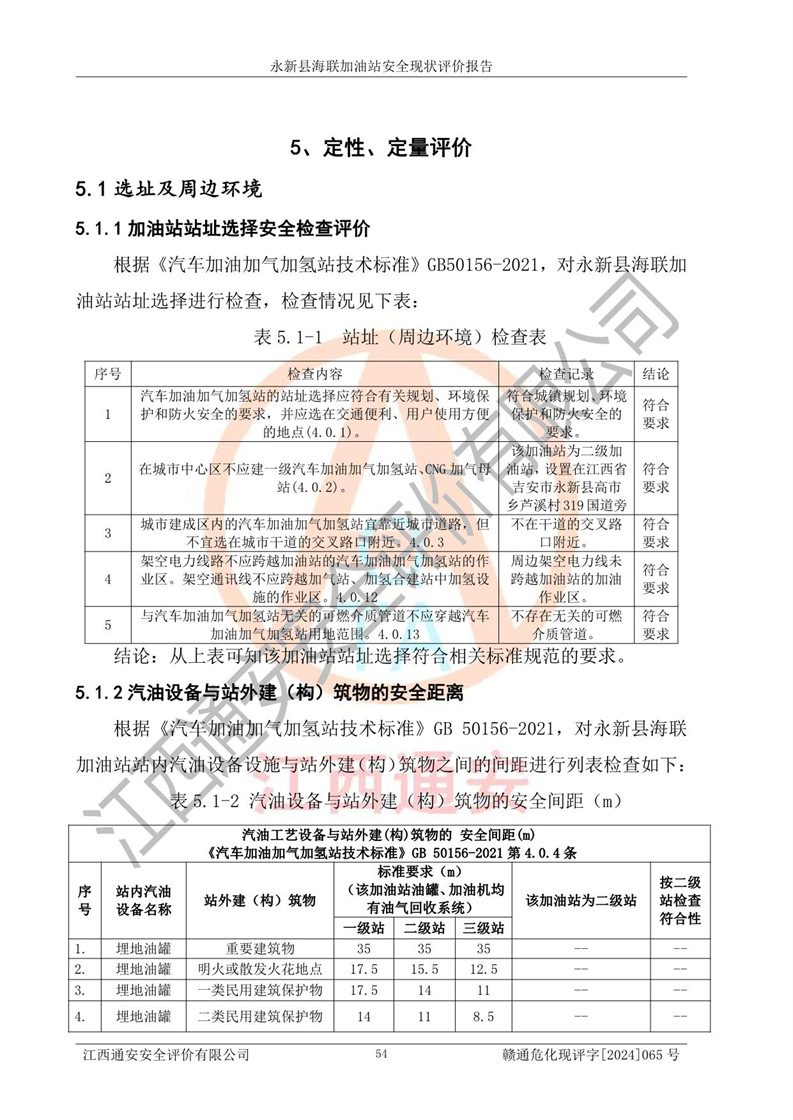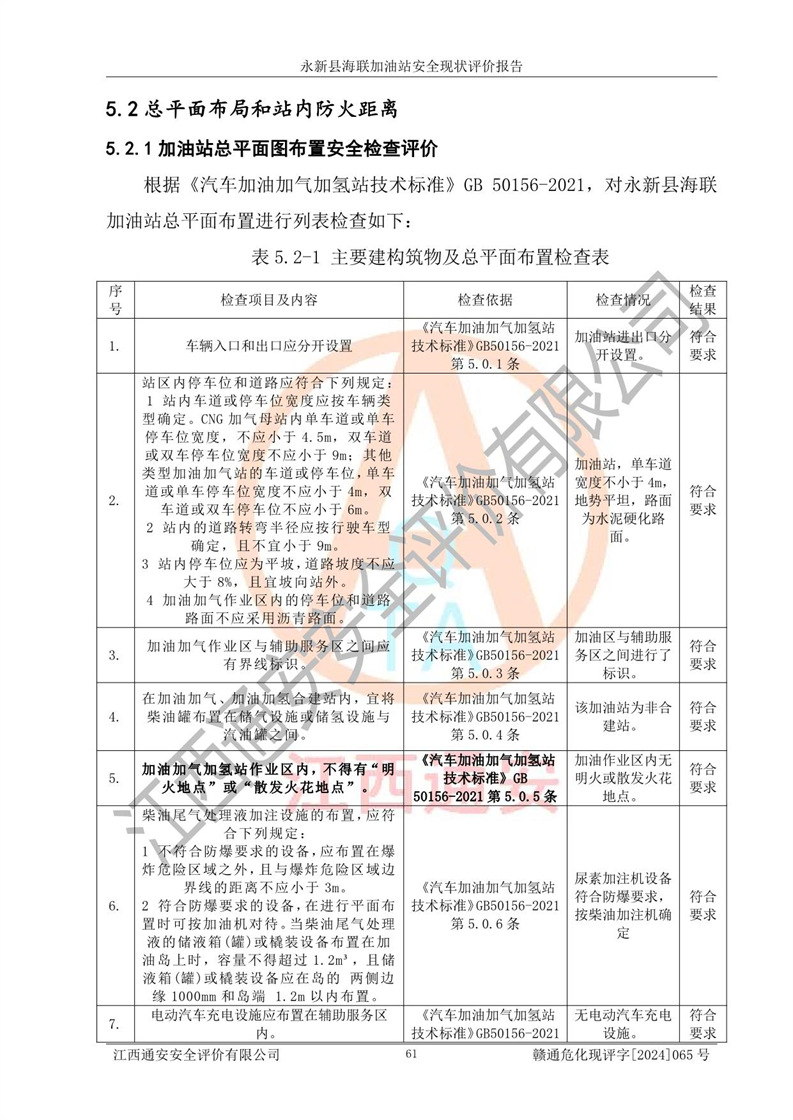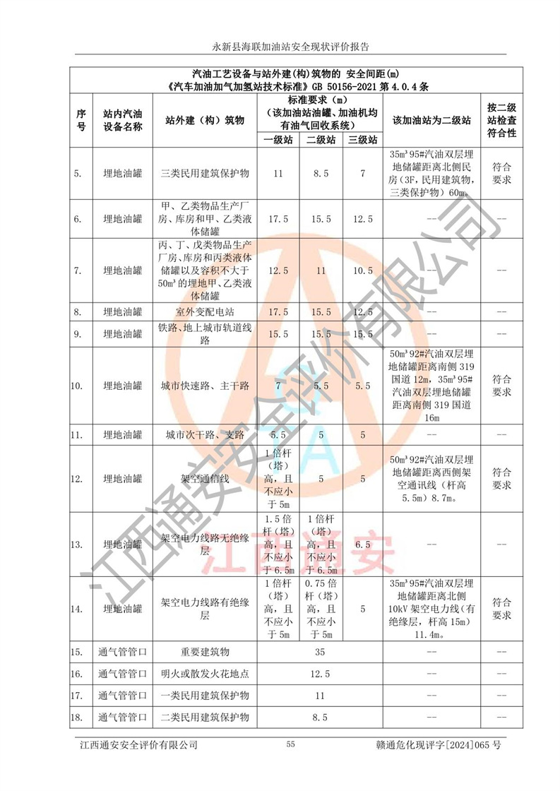 評(píng)價(jià)結(jié)論 | 永新縣海聯(lián)加油站站址合理,周邊環(huán)境良好,與敏感防護(hù)目標(biāo)間距符合規(guī)范要求,站區(qū)建構(gòu)筑物之間的防火間距、耐火等級(jí)符合標(biāo)準(zhǔn)要求,與總平面布置圖一致,加油卸油工藝及設(shè)備設(shè)施合理,工藝布置得當(dāng),防雷設(shè)施經(jīng)檢測(cè)合格,采取的工藝安全設(shè)施符合規(guī)范要求;該加油站制定了安全管理制度和操作規(guī)程,人員經(jīng)培訓(xùn)合格后上崗,安全管理人員經(jīng)考核合格并取得安全合格證,能按照法律法規(guī)要求開(kāi)展安全生產(chǎn)管理工作。 綜上:永新縣海聯(lián)加油站符合《汽車加油加氣加氫站技術(shù)標(biāo)準(zhǔn)》GB50156-2021等標(biāo)準(zhǔn)規(guī)范的要求,安全風(fēng)險(xiǎn)可控,滿足危險(xiǎn)化學(xué)品經(jīng)營(yíng)的安全條件。 | |||
