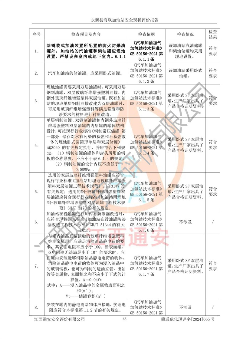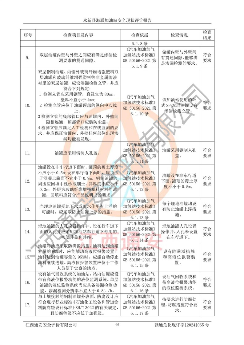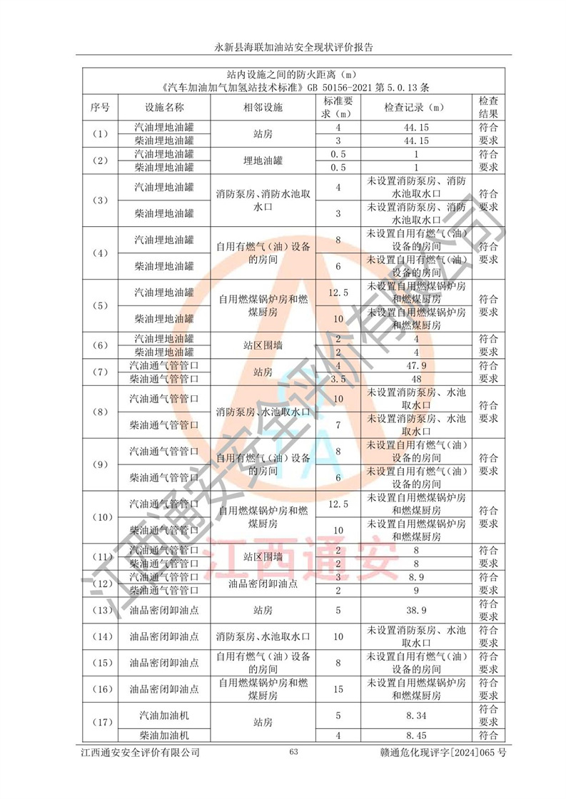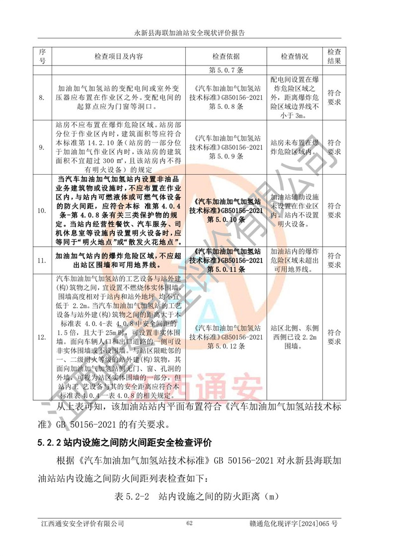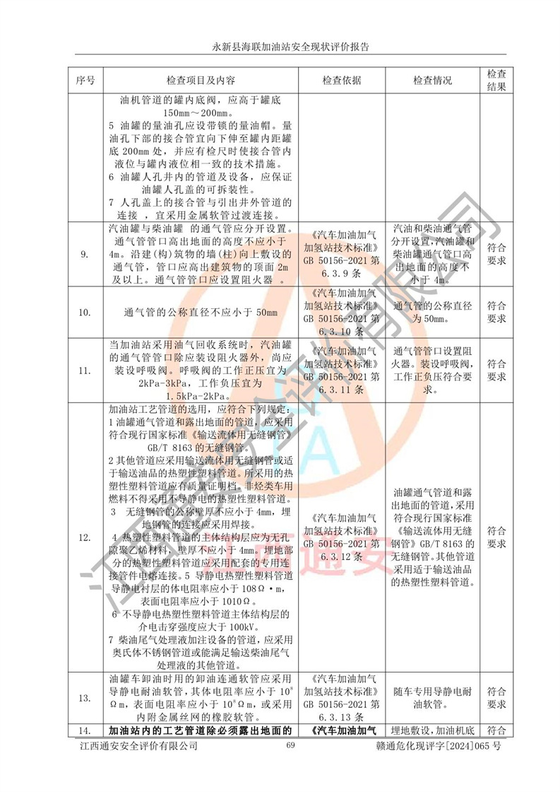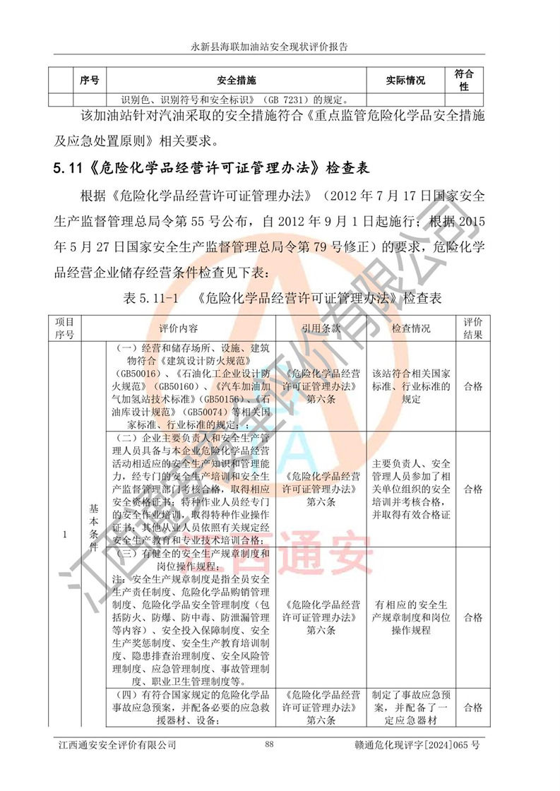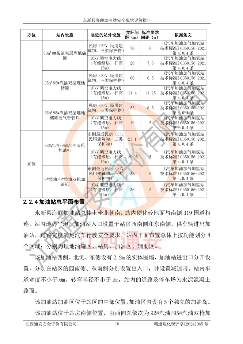 評(píng)價(jià)結(jié)論 | 永新縣海聯(lián)加油站站址合理,周邊環(huán)境良好,與敏感防護(hù)目標(biāo)間距符合規(guī)范要求,站區(qū)建構(gòu)筑物之間的防火間距、耐火等級(jí)符合標(biāo)準(zhǔn)要求,與總平面布置圖一致,加油卸油工藝及設(shè)備設(shè)施合理,工藝布置得當(dāng),防雷設(shè)施經(jīng)檢測(cè)合格,采取的工藝安全設(shè)施符合規(guī)范要求;該加油站制定了安全管理制度和操作規(guī)程,人員經(jīng)培訓(xùn)合格后上崗,安全管理人員經(jīng)考核合格并取得安全合格證,能按照法律法規(guī)要求開(kāi)展安全生產(chǎn)管理工作。 綜上:永新縣海聯(lián)加油站符合《汽車加油加氣加氫站技術(shù)標(biāo)準(zhǔn)》GB50156-2021等標(biāo)準(zhǔn)規(guī)范的要求,安全風(fēng)險(xiǎn)可控,滿足危險(xiǎn)化學(xué)品經(jīng)營(yíng)的安全條件。 | |||