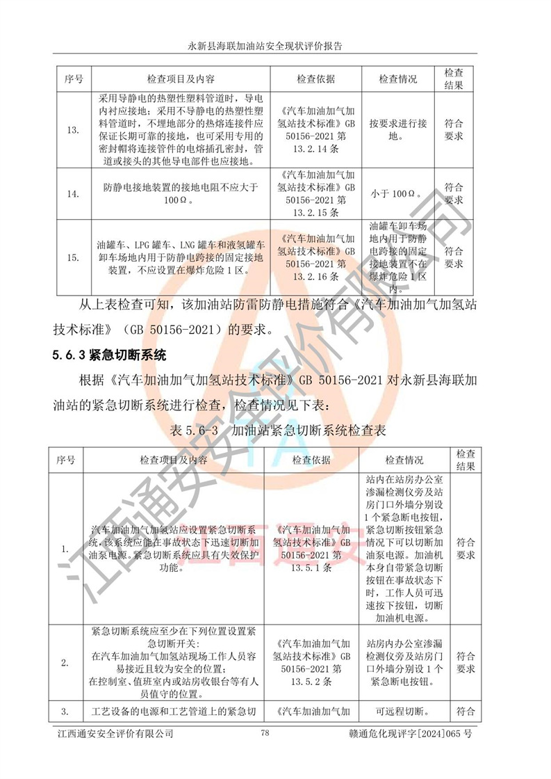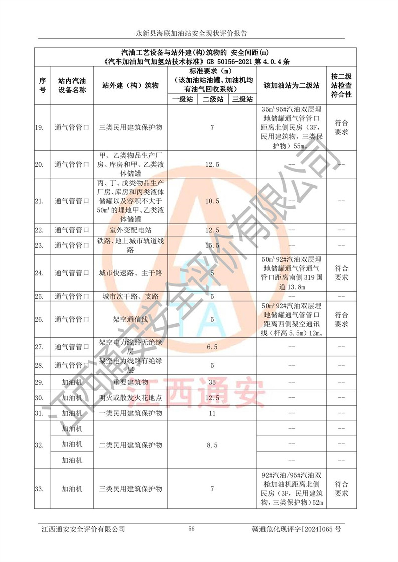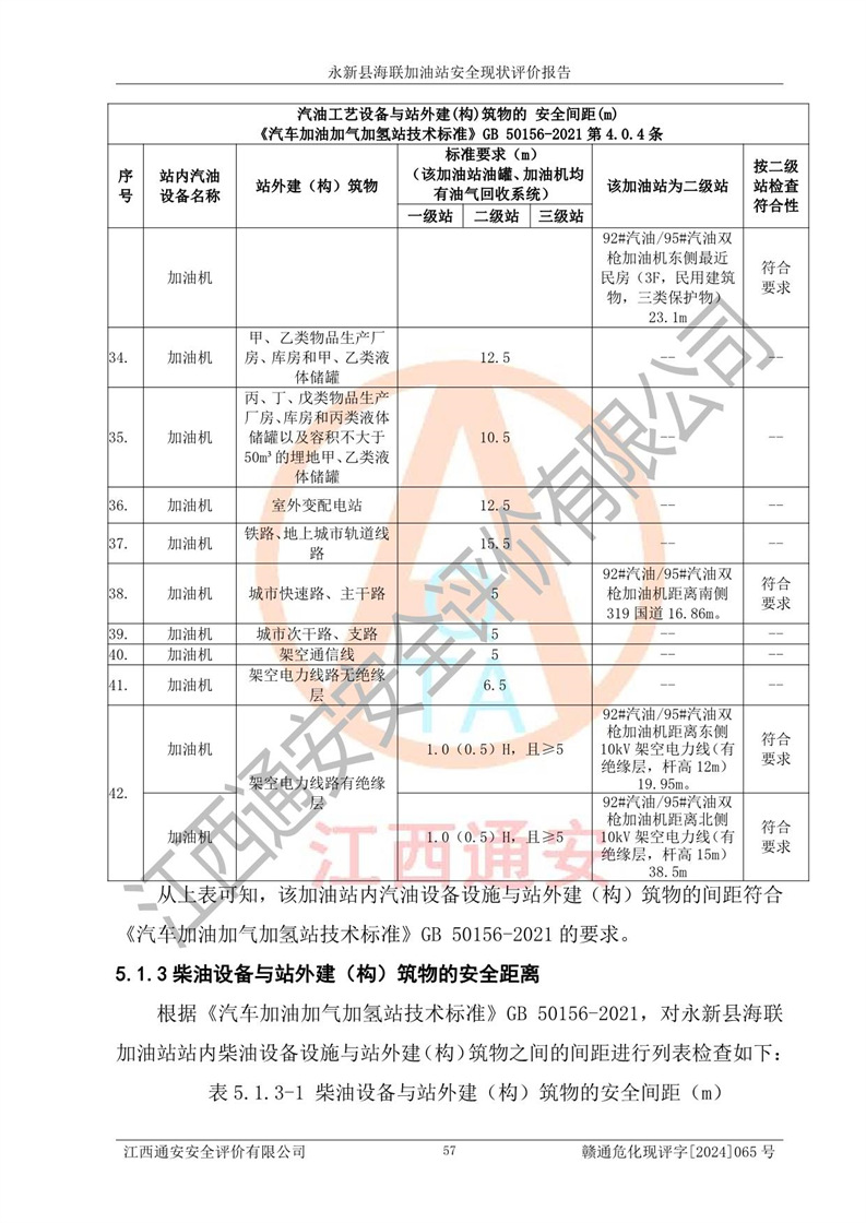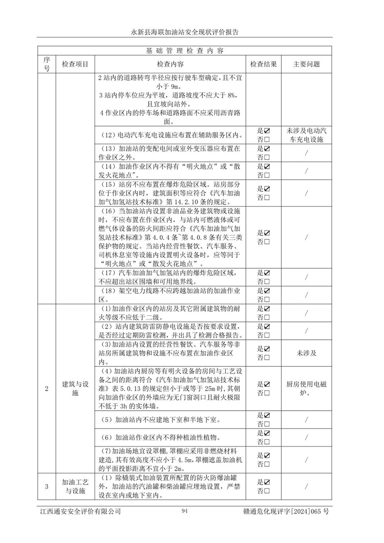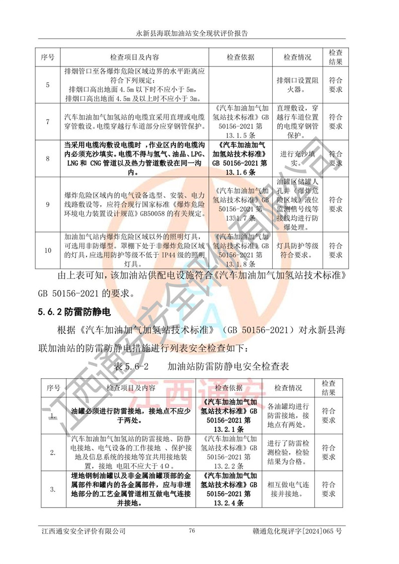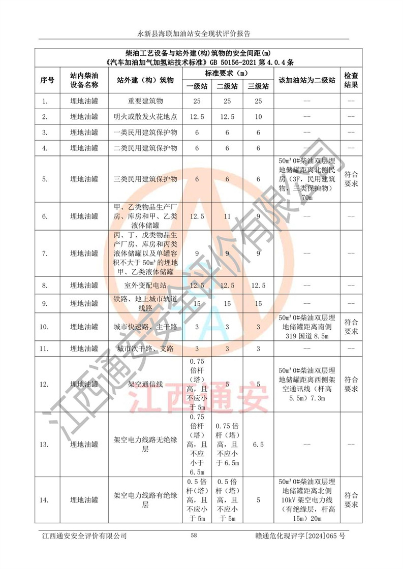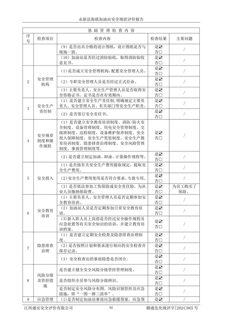 評(píng)價(jià)結(jié)論 | 永新縣海聯(lián)加油站站址合理,周邊環(huán)境良好,與敏感防護(hù)目標(biāo)間距符合規(guī)范要求,站區(qū)建構(gòu)筑物之間的防火間距、耐火等級(jí)符合標(biāo)準(zhǔn)要求,與總平面布置圖一致,加油卸油工藝及設(shè)備設(shè)施合理,工藝布置得當(dāng),防雷設(shè)施經(jīng)檢測(cè)合格,采取的工藝安全設(shè)施符合規(guī)范要求;該加油站制定了安全管理制度和操作規(guī)程,人員經(jīng)培訓(xùn)合格后上崗,安全管理人員經(jīng)考核合格并取得安全合格證,能按照法律法規(guī)要求開(kāi)展安全生產(chǎn)管理工作。 綜上:永新縣海聯(lián)加油站符合《汽車加油加氣加氫站技術(shù)標(biāo)準(zhǔn)》GB50156-2021等標(biāo)準(zhǔn)規(guī)范的要求,安全風(fēng)險(xiǎn)可控,滿足危險(xiǎn)化學(xué)品經(jīng)營(yíng)的安全條件。 | |||