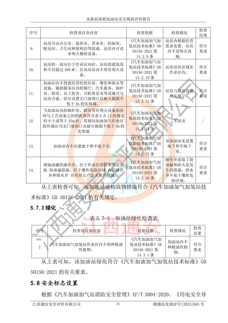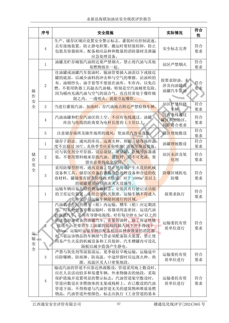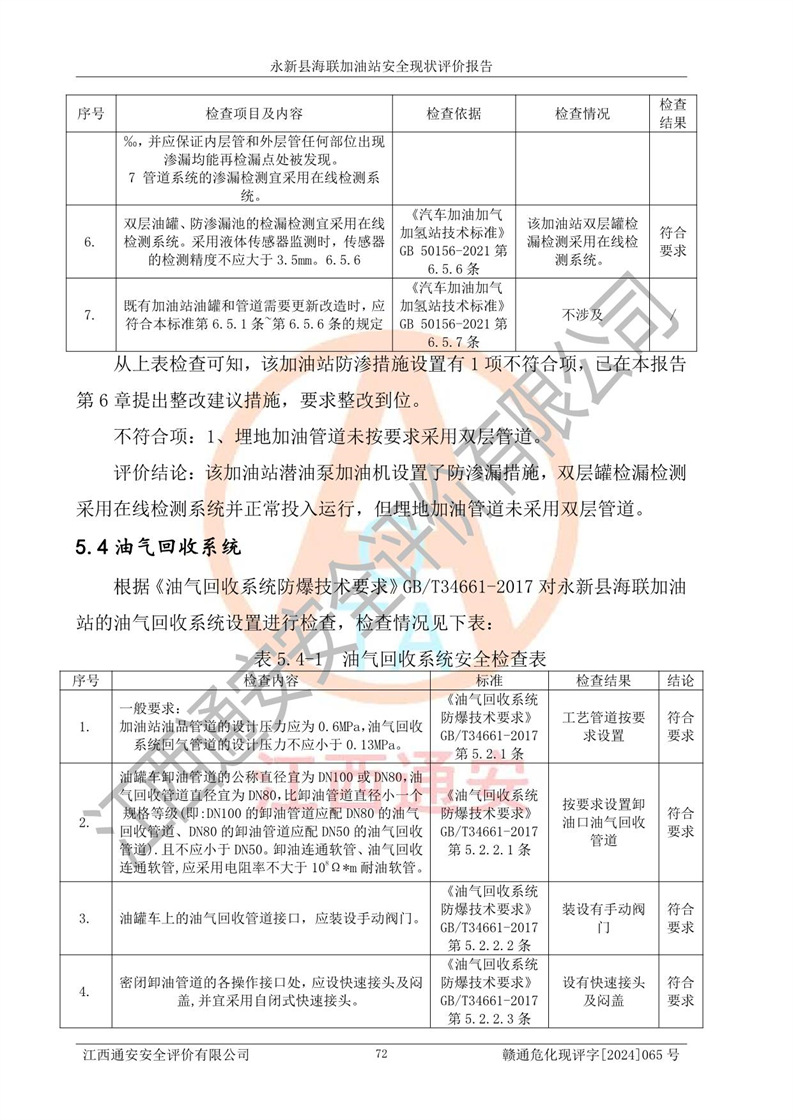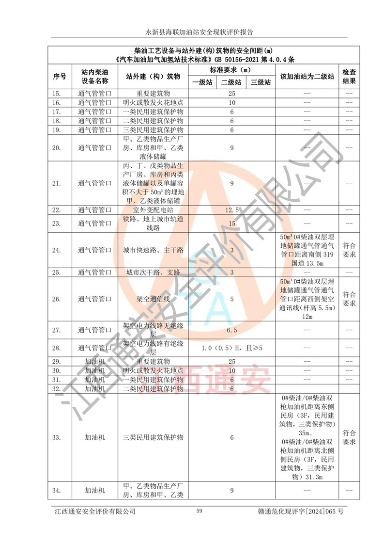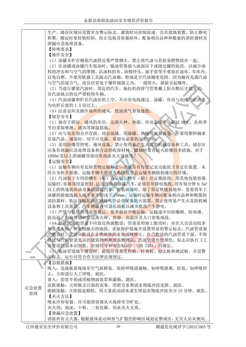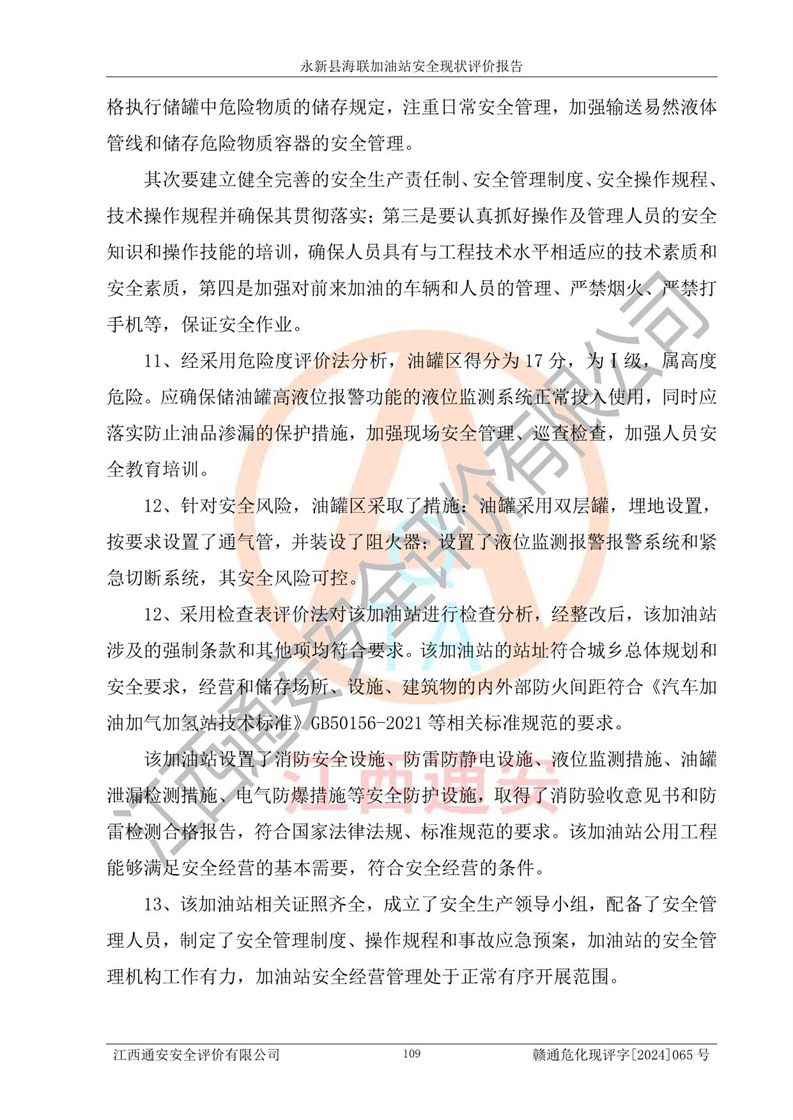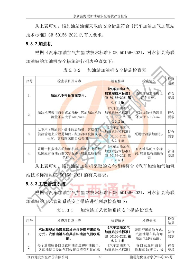 評(píng)價(jià)結(jié)論 | 永新縣海聯(lián)加油站站址合理,周邊環(huán)境良好,與敏感防護(hù)目標(biāo)間距符合規(guī)范要求,站區(qū)建構(gòu)筑物之間的防火間距、耐火等級(jí)符合標(biāo)準(zhǔn)要求,與總平面布置圖一致,加油卸油工藝及設(shè)備設(shè)施合理,工藝布置得當(dāng),防雷設(shè)施經(jīng)檢測(cè)合格,采取的工藝安全設(shè)施符合規(guī)范要求;該加油站制定了安全管理制度和操作規(guī)程,人員經(jīng)培訓(xùn)合格后上崗,安全管理人員經(jīng)考核合格并取得安全合格證,能按照法律法規(guī)要求開(kāi)展安全生產(chǎn)管理工作。 綜上:永新縣海聯(lián)加油站符合《汽車加油加氣加氫站技術(shù)標(biāo)準(zhǔn)》GB50156-2021等標(biāo)準(zhǔn)規(guī)范的要求,安全風(fēng)險(xiǎn)可控,滿足危險(xiǎn)化學(xué)品經(jīng)營(yíng)的安全條件。 | |||