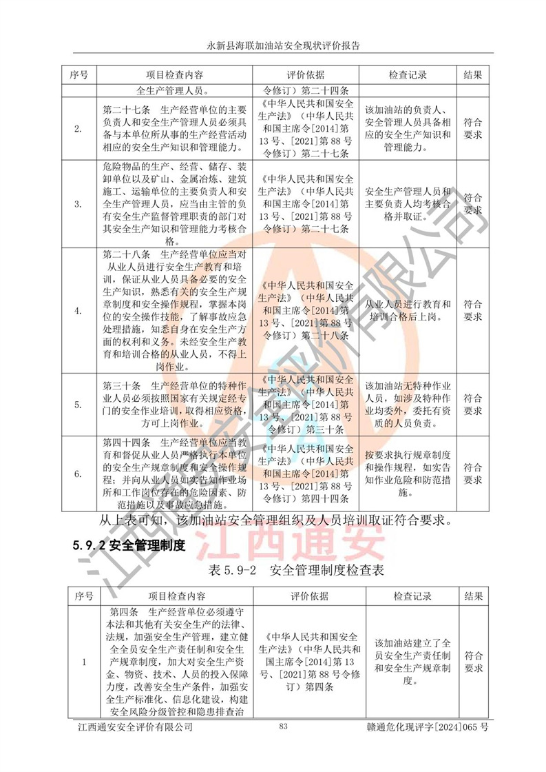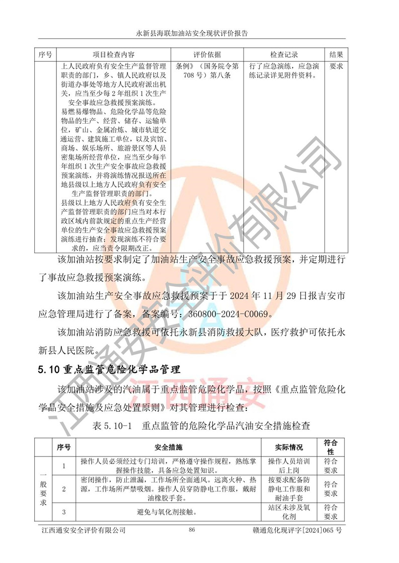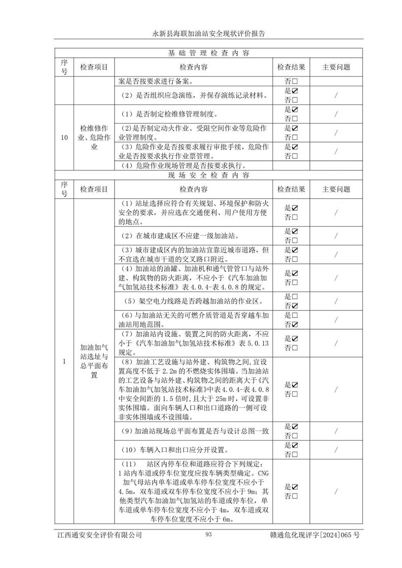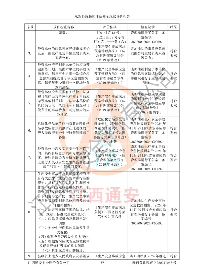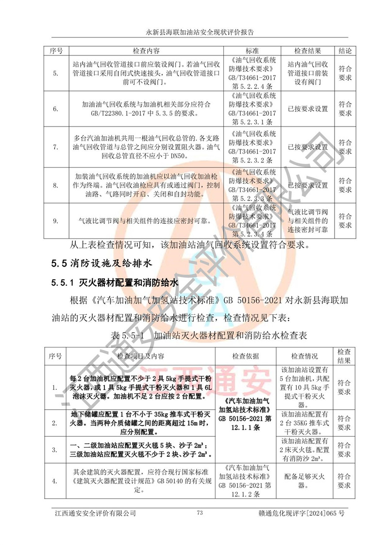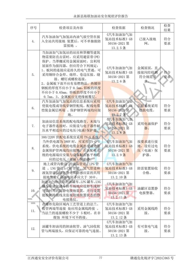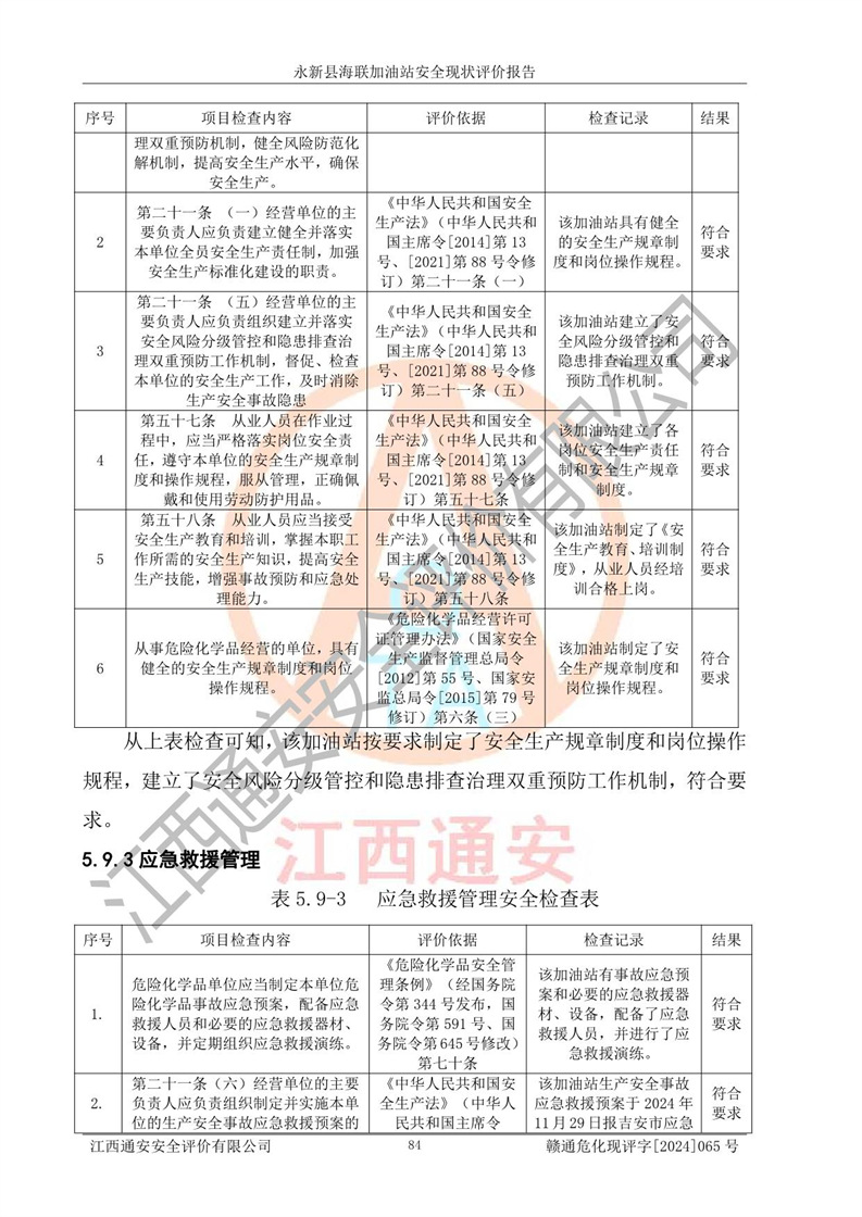 評(píng)價(jià)結(jié)論 | 永新縣海聯(lián)加油站站址合理,周邊環(huán)境良好,與敏感防護(hù)目標(biāo)間距符合規(guī)范要求,站區(qū)建構(gòu)筑物之間的防火間距、耐火等級(jí)符合標(biāo)準(zhǔn)要求,與總平面布置圖一致,加油卸油工藝及設(shè)備設(shè)施合理,工藝布置得當(dāng),防雷設(shè)施經(jīng)檢測(cè)合格,采取的工藝安全設(shè)施符合規(guī)范要求;該加油站制定了安全管理制度和操作規(guī)程,人員經(jīng)培訓(xùn)合格后上崗,安全管理人員經(jīng)考核合格并取得安全合格證,能按照法律法規(guī)要求開(kāi)展安全生產(chǎn)管理工作。 綜上:永新縣海聯(lián)加油站符合《汽車加油加氣加氫站技術(shù)標(biāo)準(zhǔn)》GB50156-2021等標(biāo)準(zhǔn)規(guī)范的要求,安全風(fēng)險(xiǎn)可控,滿足危險(xiǎn)化學(xué)品經(jīng)營(yíng)的安全條件。 | |||
