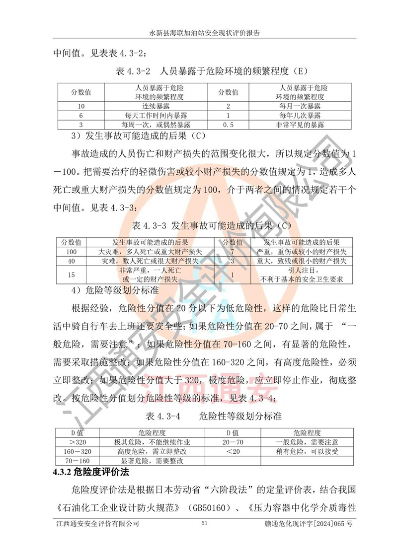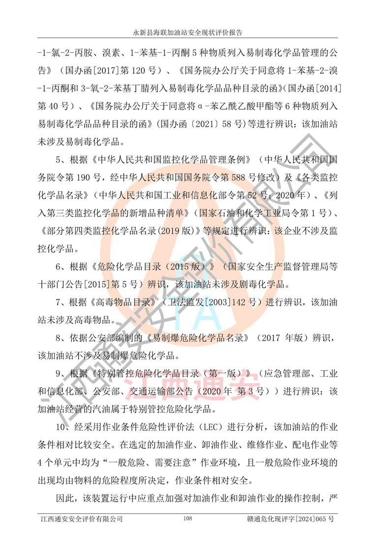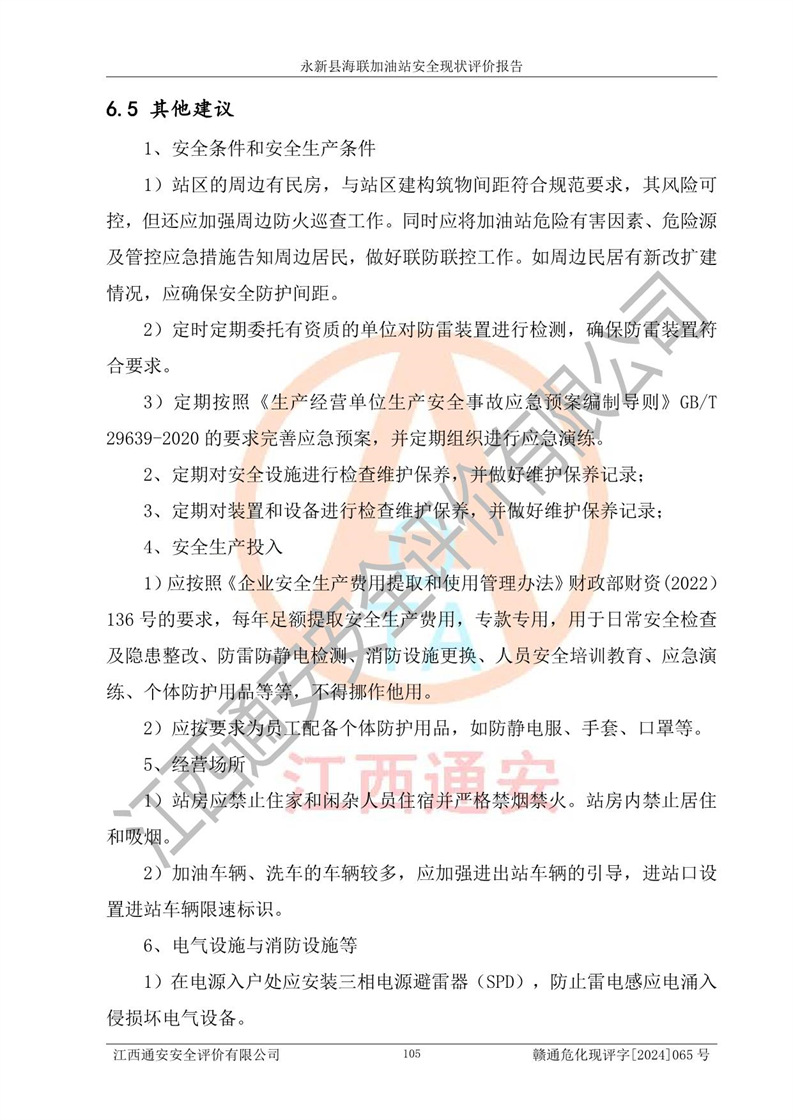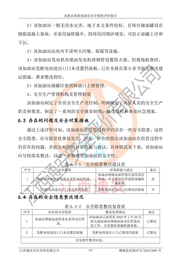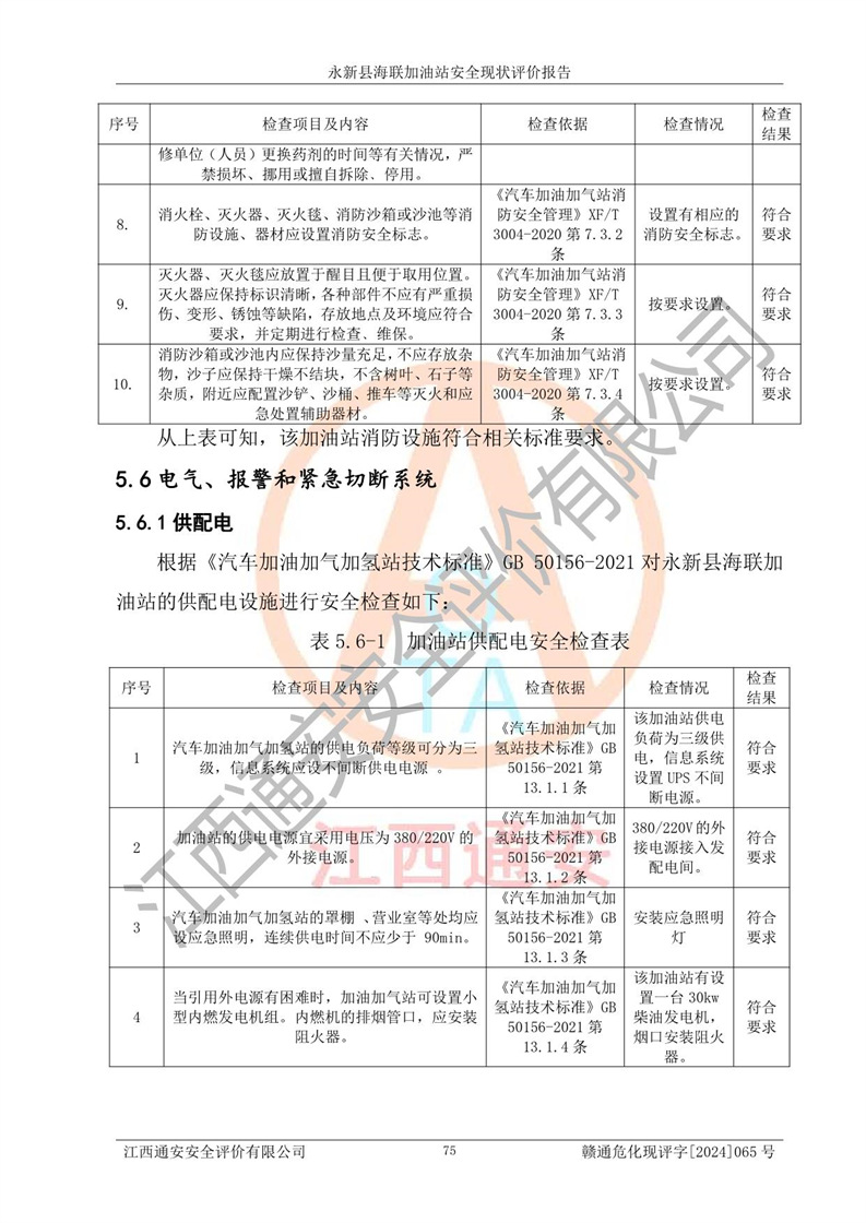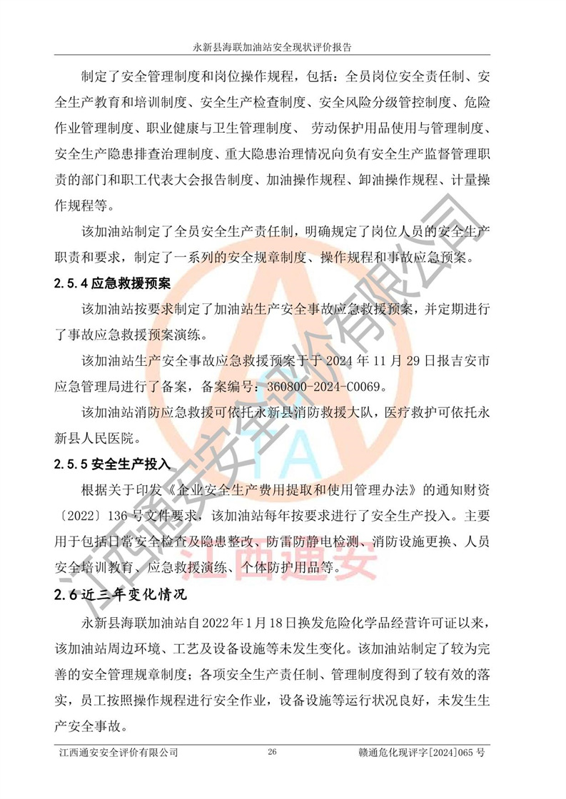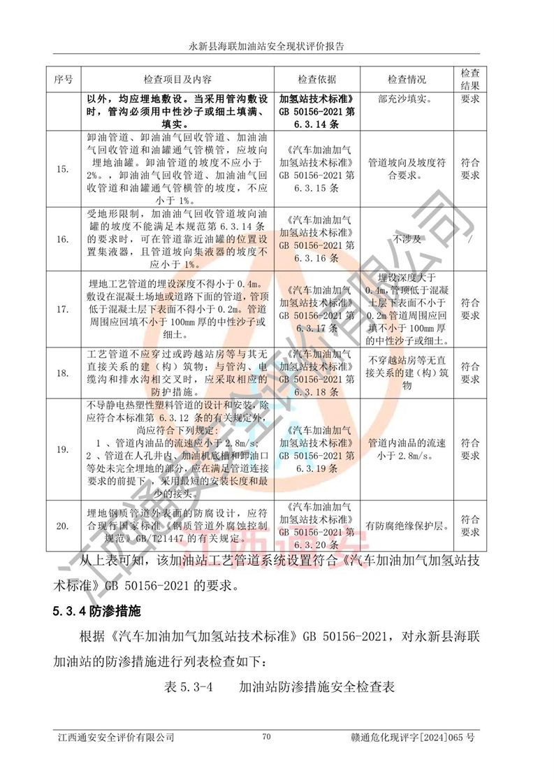 評(píng)價(jià)結(jié)論 | 永新縣海聯(lián)加油站站址合理,周邊環(huán)境良好,與敏感防護(hù)目標(biāo)間距符合規(guī)范要求,站區(qū)建構(gòu)筑物之間的防火間距、耐火等級(jí)符合標(biāo)準(zhǔn)要求,與總平面布置圖一致,加油卸油工藝及設(shè)備設(shè)施合理,工藝布置得當(dāng),防雷設(shè)施經(jīng)檢測(cè)合格,采取的工藝安全設(shè)施符合規(guī)范要求;該加油站制定了安全管理制度和操作規(guī)程,人員經(jīng)培訓(xùn)合格后上崗,安全管理人員經(jīng)考核合格并取得安全合格證,能按照法律法規(guī)要求開(kāi)展安全生產(chǎn)管理工作。 綜上:永新縣海聯(lián)加油站符合《汽車加油加氣加氫站技術(shù)標(biāo)準(zhǔn)》GB50156-2021等標(biāo)準(zhǔn)規(guī)范的要求,安全風(fēng)險(xiǎn)可控,滿足危險(xiǎn)化學(xué)品經(jīng)營(yíng)的安全條件。 | |||